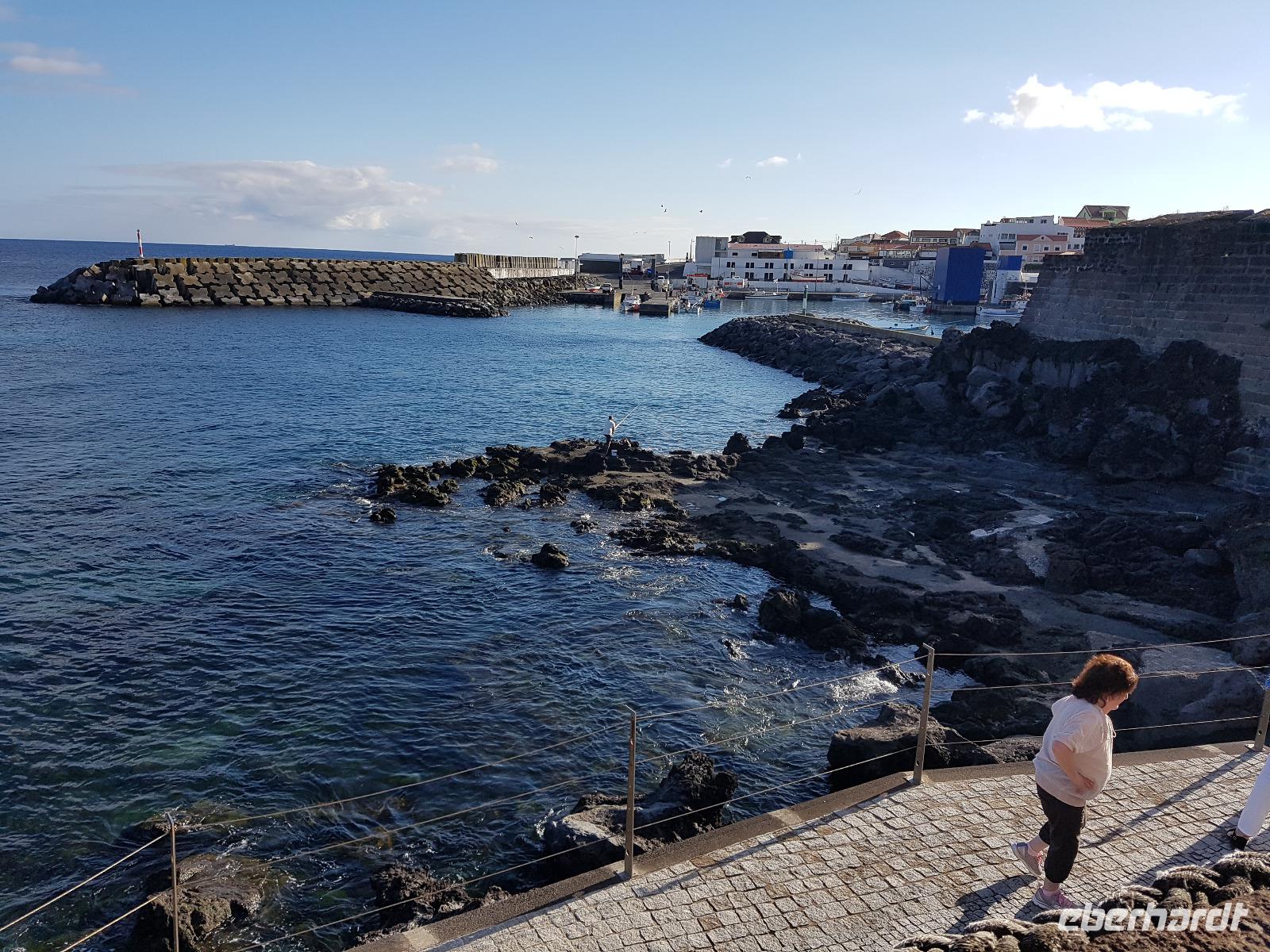 Nach einem guten Frühstück holten uns Joaquim und Paolo am Hotel wieder ab und nachdem jeder seinen Platz im Kleinbus eingenommen hatte, fuhren wir entlang der Südküste bis zur alten Festung von Sao Roque zum ersten Fotostopp. Bei Sonnenschein und einem leichten Wind genossen wir die Aussicht und lernten schon die ersten Nutzpflanzen kennen. Es folgte der Besuch einer kleinen Keramik Fabrik und wir durften bei der Herstellung und Bemalung der verschiedenen Gefäße zusehen. Nun fuhren wir hinauf zum Kraterrand und schauten hinunter zum Feuersee- Lagoa de Fogo und zur anderen Seite auf die Küste. Auf der Fahrt hinunter an die Nordküste besuchten wir den Naturpark Caldera Velha und machten dort einen schönen Spaziergang zu den Pools und zum Wasserfall. In Ribeira Grande an der Nordküste entführte uns Joaquim zu einer alten Dame und wir durften ihr privates Haus anschauen. Dann ging sie mit unserer Gruppe zum Museum der Akana, weiter zum Mittagessen und in 2 Kirchen. Am Meer endete unser Rundgang und wir verabschiedeten uns herzlich von ihr. Wieder in Ponta Delgado verliessen wir unseren Bus am Eingang zum Antonio Borges Park und liefen quer durch den Park zu unserem Hotel zurück. 19 Uhr trafen wir uns wieder und gingen zu Fuss durch die Stadt zum Hafen. Unterwegs sahen wir schon einige wichtige Bauwerke und am Meer dann kehrte wir ein im "Amphitheater " zu unserem Begrüssungsabendessen. Wir sassen an einer langen Tafel mit Blick aufs Meer und wurden von Schülern einer Gastronomie Fachschule bedient. Das Menue war ganz ausgezeichnet und danach spazierten wir wieder zu Fuss durch die stimmungsvoll beleuchtete Stadt hinauf in unser Hotel.