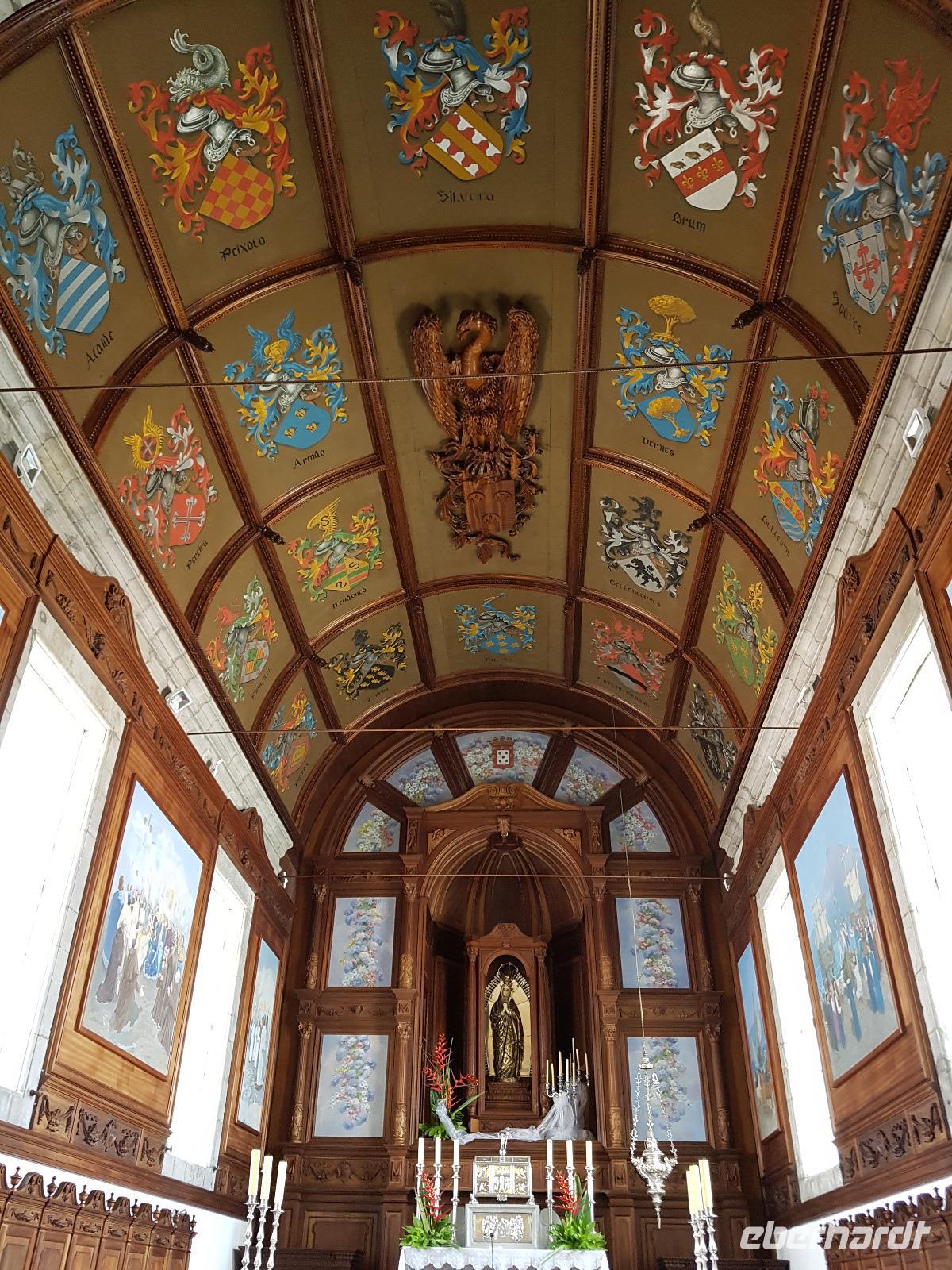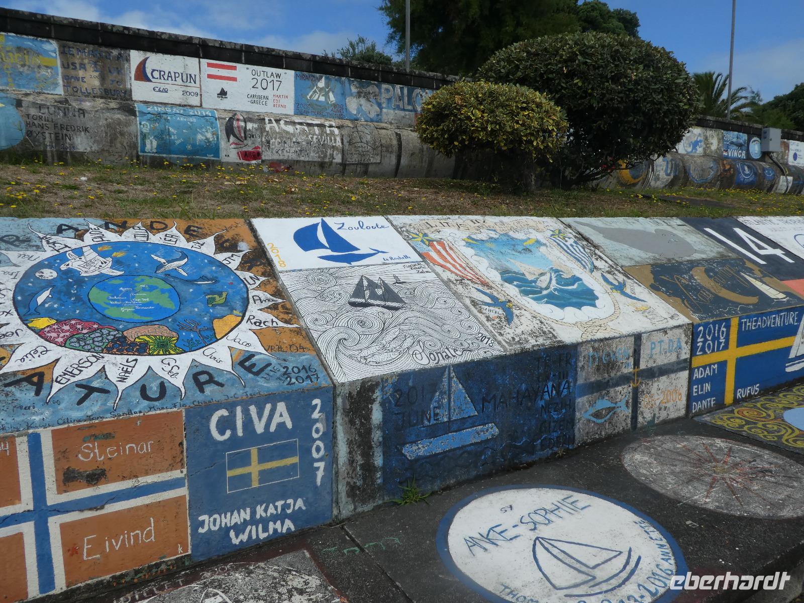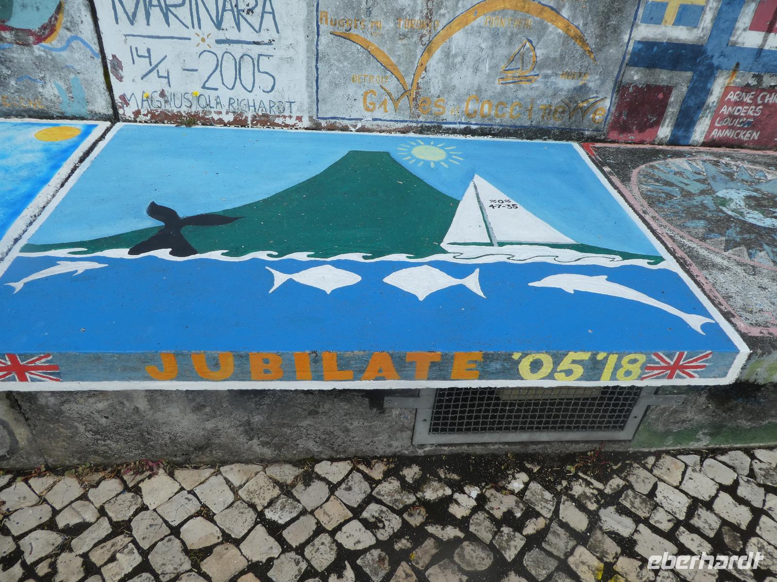 Heute endlich durften wir einmal ausschlafen und ausgiebig und in Ruhe frühstücken. 9.30 bis 12 Uhr machten wir dann einen ausgiebigen Rundgang durch Horta. Unser Hotel Horta lag unweit des azorianischen Parlaments und der deutschen Siedlung. In der Siedlung wohnten die Verantwortlichen für die Transatlantik Kabel. Die DAT betrieb die Siedlung ab 1904 und erst 1976 wurden die letzten Kabel abgeschaltet. Im Haus mit der Uhr durften wir die herrlichen Glasfenster bestaunen. Dann gingen wir hinunter zum Hafen und sahen die Franziskanerkirche von aussen und die Jesuitenkirche von Innen. Am Seglerhafen legten wir eine Pause ein und bestaunten dann die Gemälde der Segler an der Kaimauer. Am Hafen vorbei kamen wir zur Walfangbucht und von dort zur Kirche mit den Wappen der wichtigsten Familien der Insel.