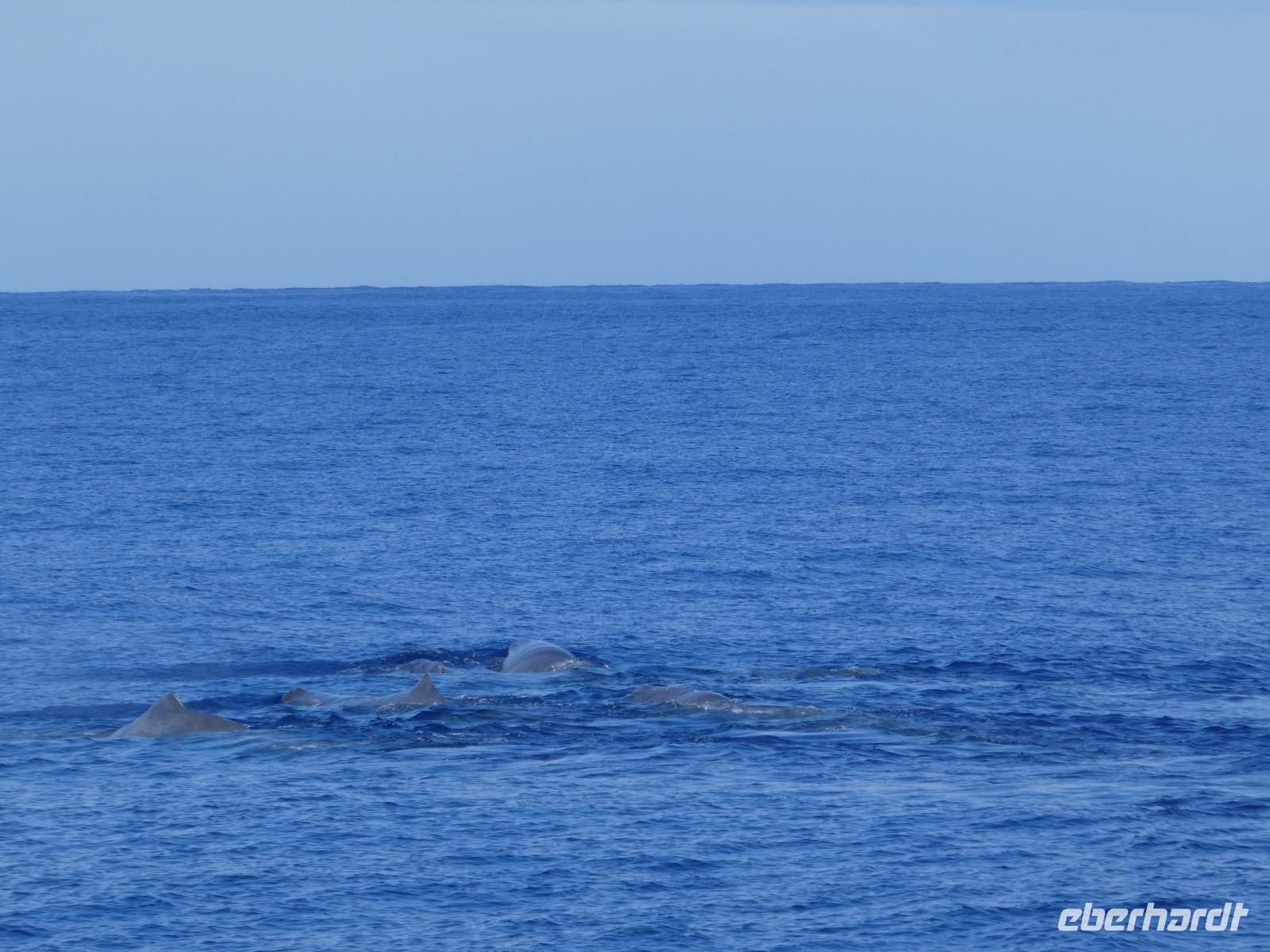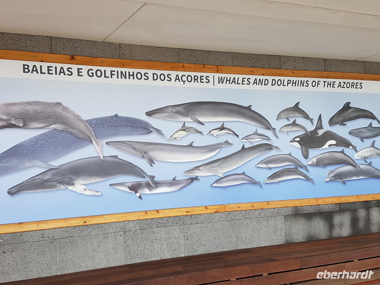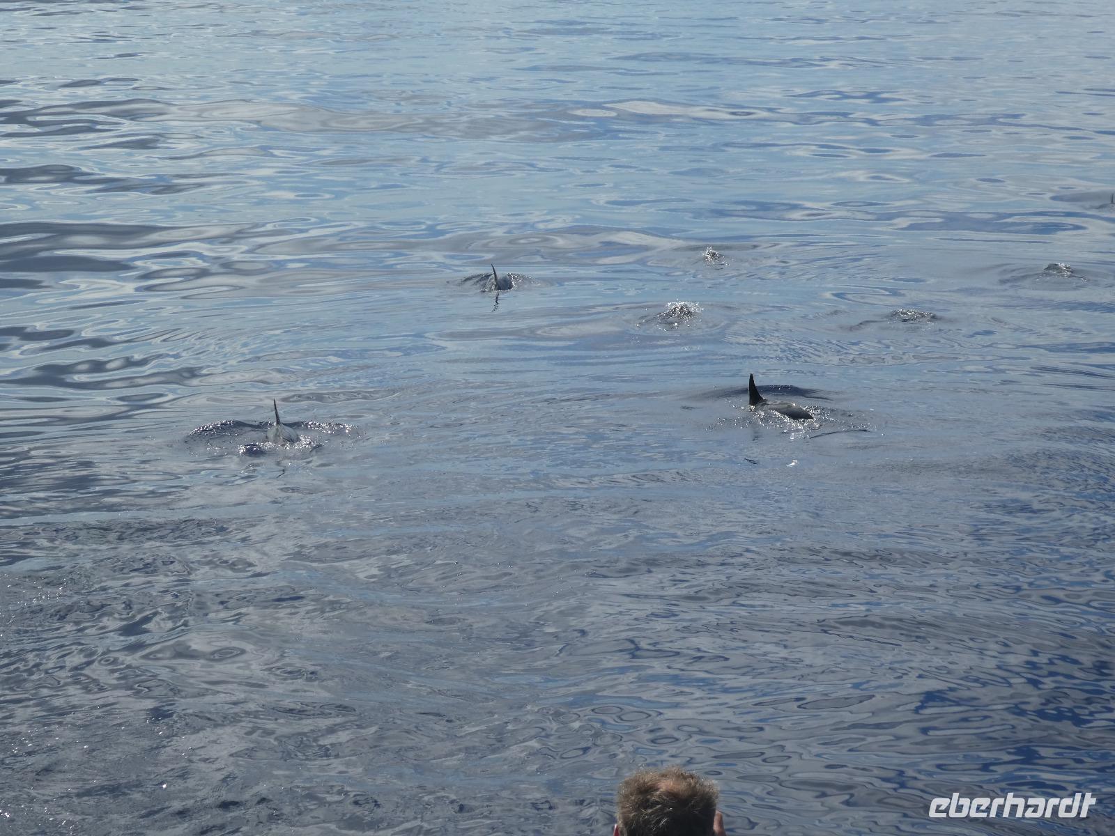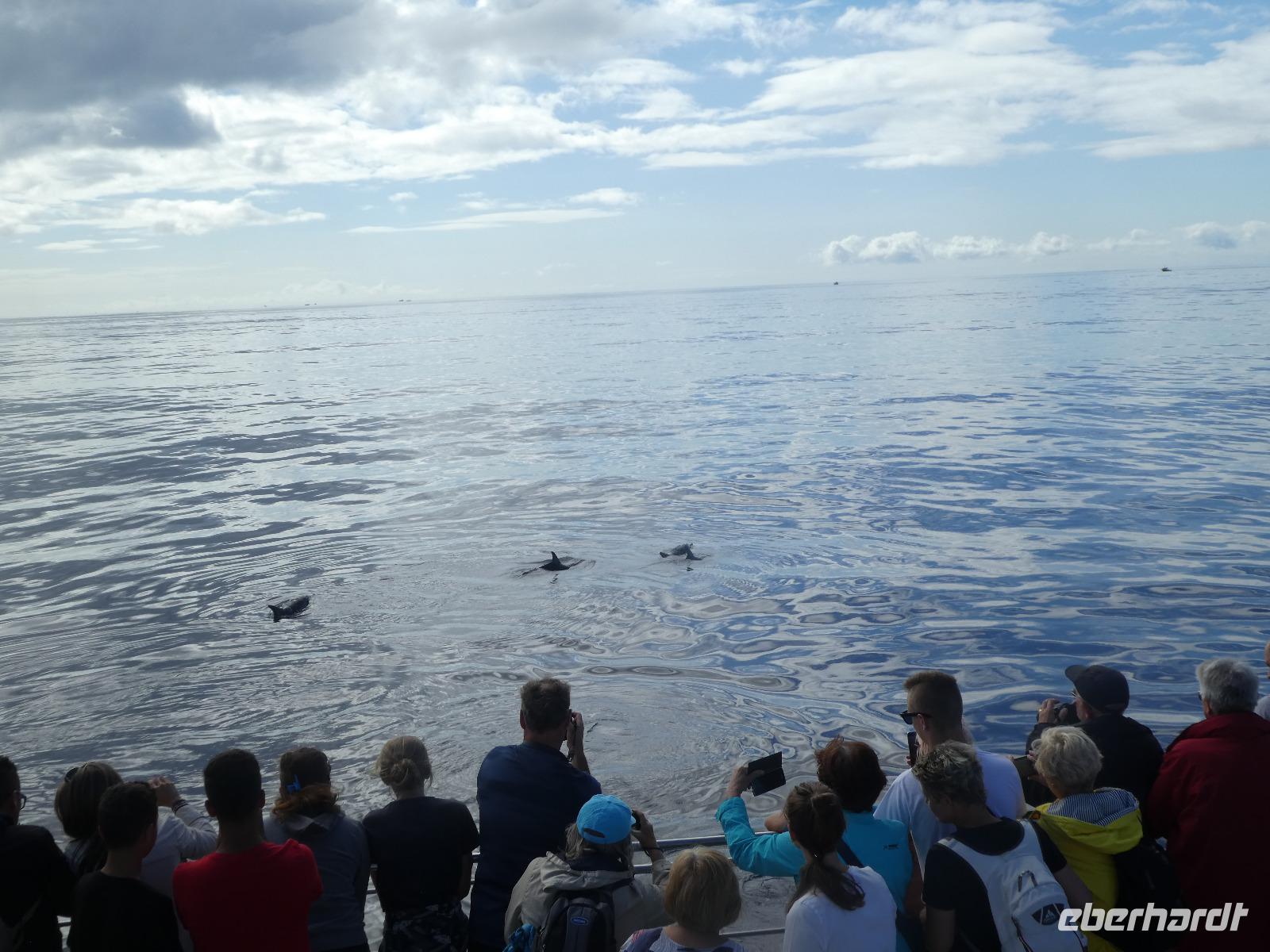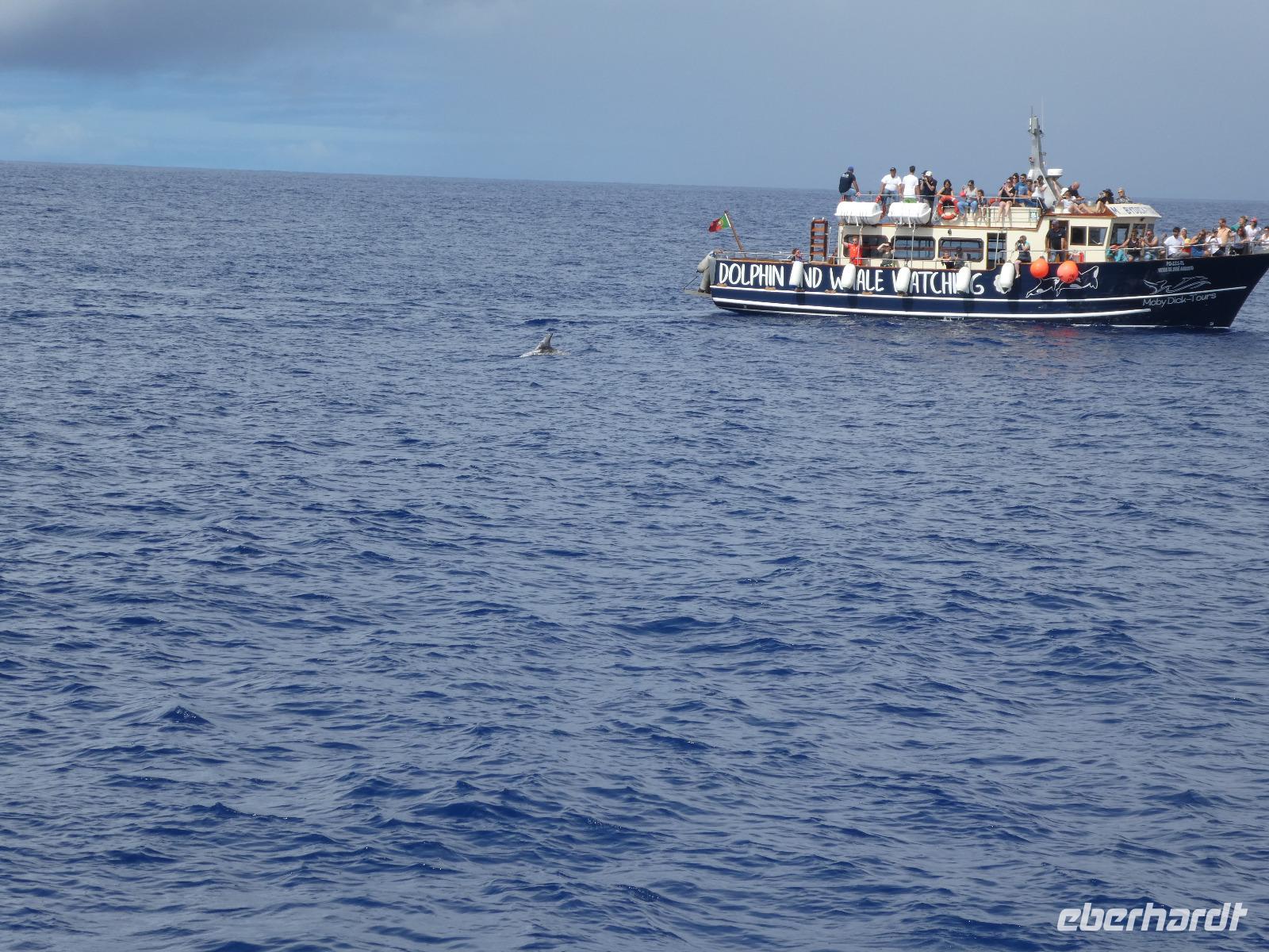 Nach dem Frühstück gingen wir zusammen zum Hafen. Bei Futurismo war unsere Walbeobachtung gebucht und dort warteten schon viele Ausflügler. Auf dem Katamaran gab es dann eine Einweisung für uns in deutsch durch die Schweizerin Karin. Wir verliessen den Hafen und sahen schon bald eine grosse Gruppe von gewöhnlichen Delphinen. Sie schwammen um unser Boot, so dass wir sie ganz nah sehen und fotografierten konnten. Dann fuhren wir weiter hinaus und trafen auf eine Gruppe von Pottwalen mit einem Kalb. Auch dieser Gruppe konnte sich unser Boot nähern. Und zu guter Letzt sahen wir viele Rundkopfdelphine. Die Jungtiere sind dunkelgrau und mit den Jahren werden sie immer heller bis weiss. So waren die erwachsenen Tiere im Wasser gut auszumachen. Wieder an Land gab es Tee und danach verbrachte jeder die Mittagspause individuell. Die meisten Singles kehrten wieder im Cafe Central ein auf eine Fischsuppe.