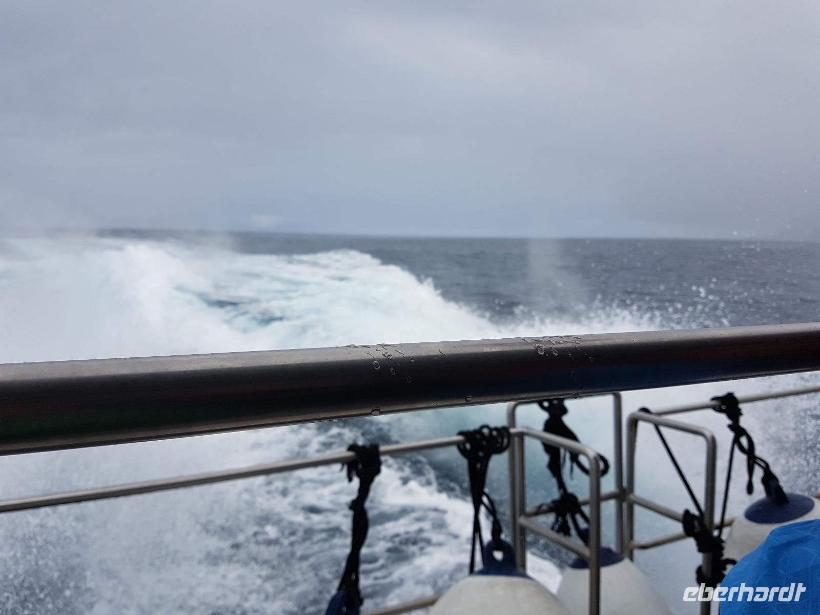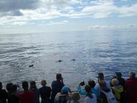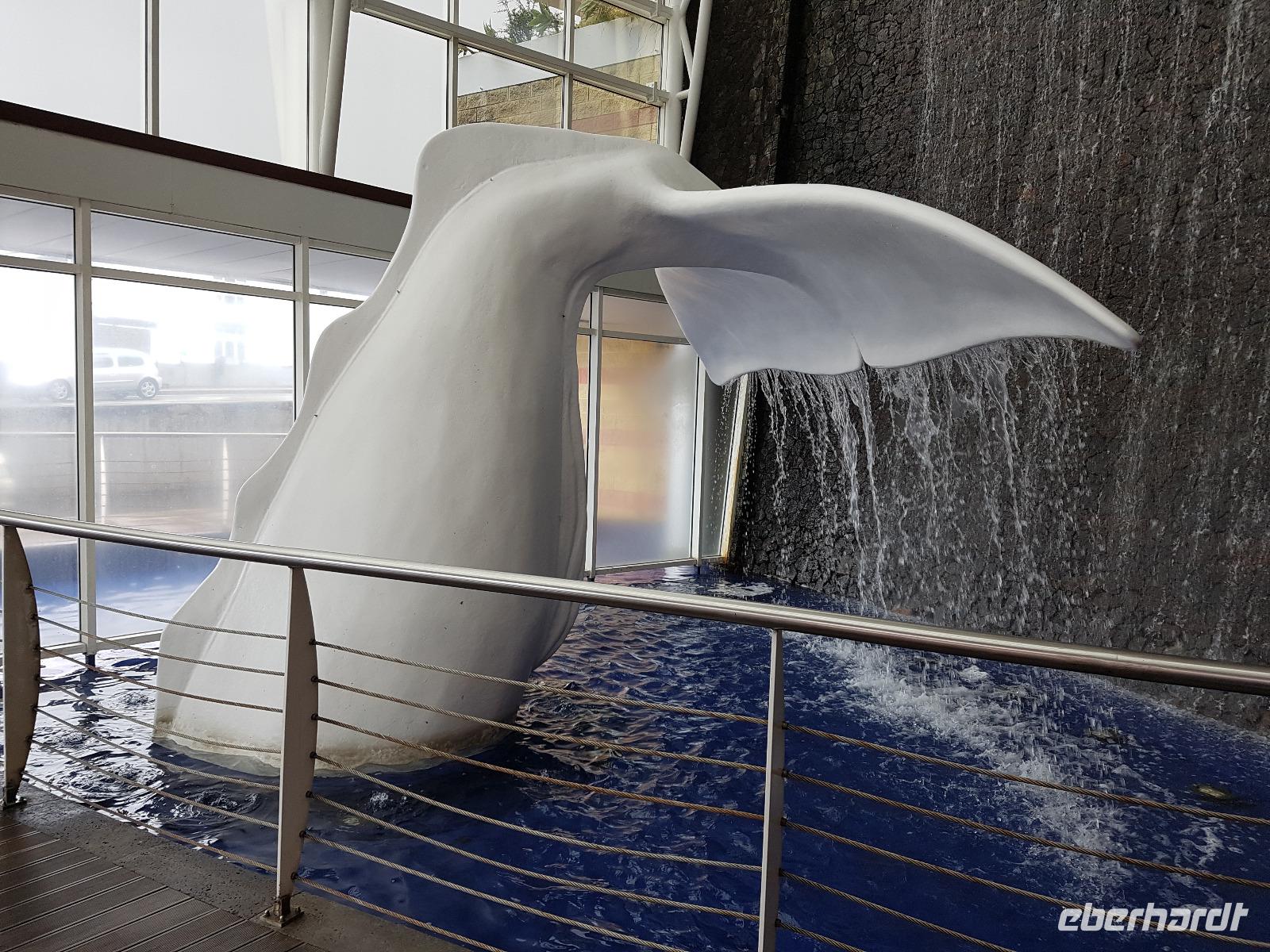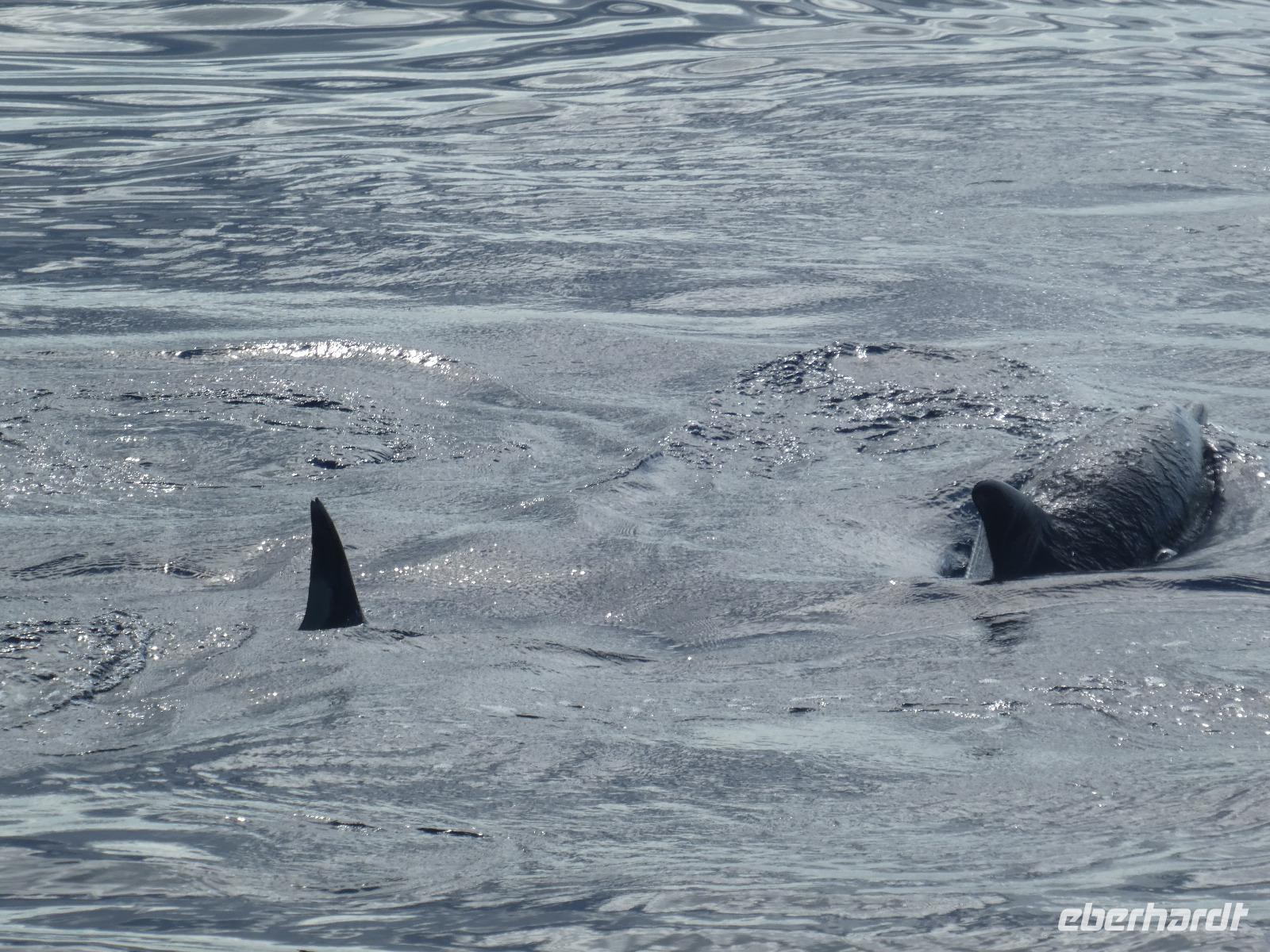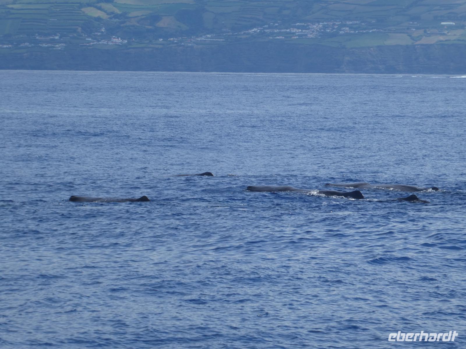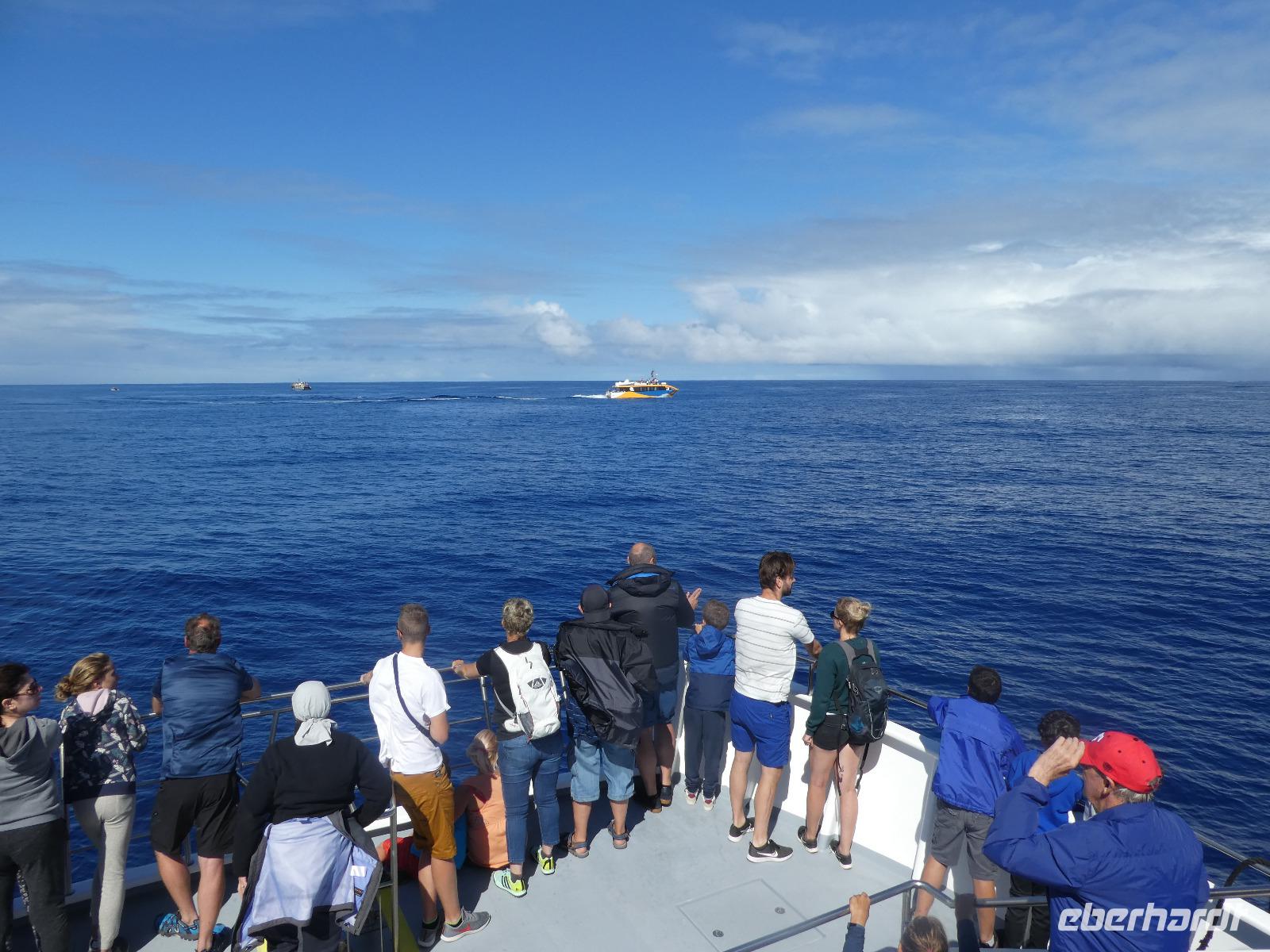 Nach dem Frühstück gingen wir zusammen zum Hafen. Bei Futurismo war unsere Walbeobachtung gebucht und dort warteten schon viele Ausflügler. Auf dem Katamaran gab es dann eine Einweisung für uns in deutsch durch die Schweizerin Karin. Wir verliessen den Hafen und sahen schon bald eine grosse Gruppe von gewöhnlichen Delphinen. Sie schwammen um unser Boot, so dass wir sie ganz nah sehen und fotografierten konnten. Dann fuhren wir weiter hinaus und trafen auf eine Gruppe von Pottwalen mit einem Kalb. Auch dieser Gruppe konnte sich unser Boot nähern. Und zu guter Letzt sahen wir viele Rundkopfdelphine. Die Jungtiere sind dunkelgrau und mit den Jahren werden sie immer heller bis weiss. So waren die erwachsenen Tiere im Wasser gut auszumachen. Wieder an Land gab es Tee und danach verbrachte jeder die Mittagspause individuell. Die meisten Singles kehrten wieder im Cafe Central ein auf eine Fischsuppe.