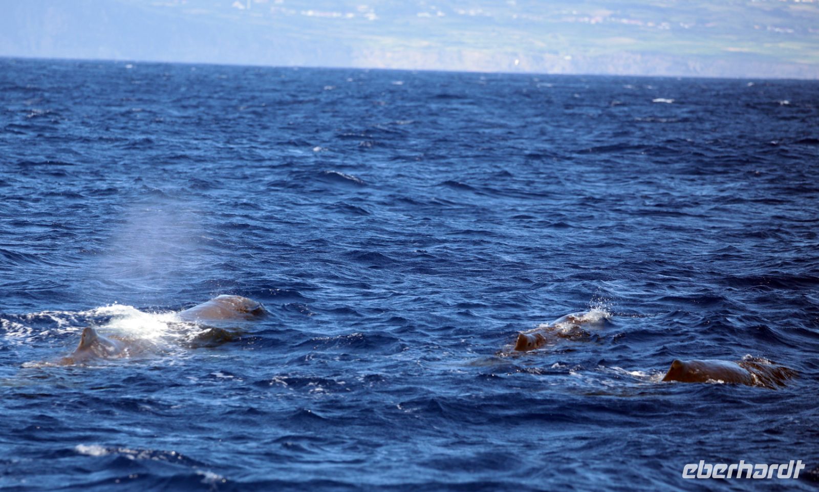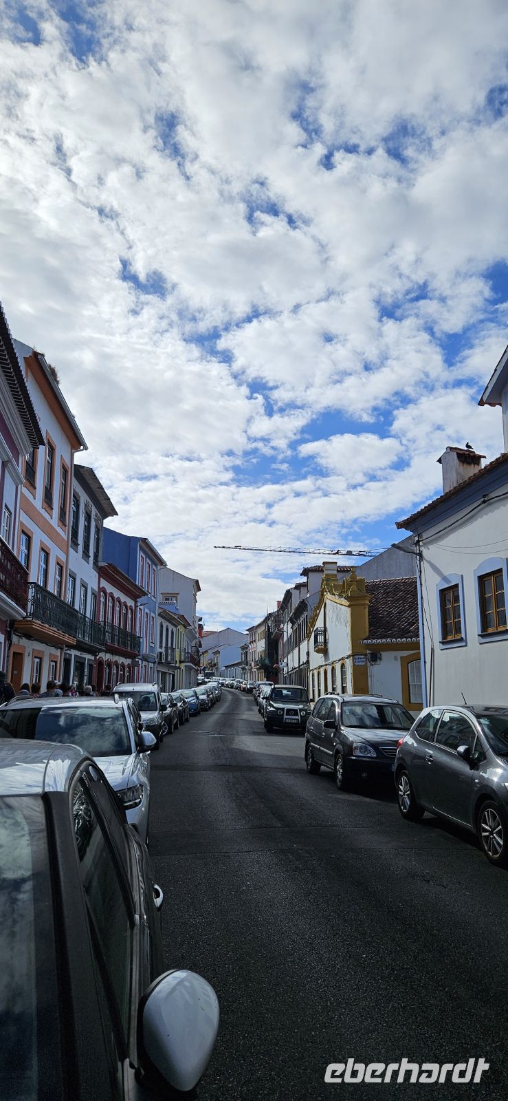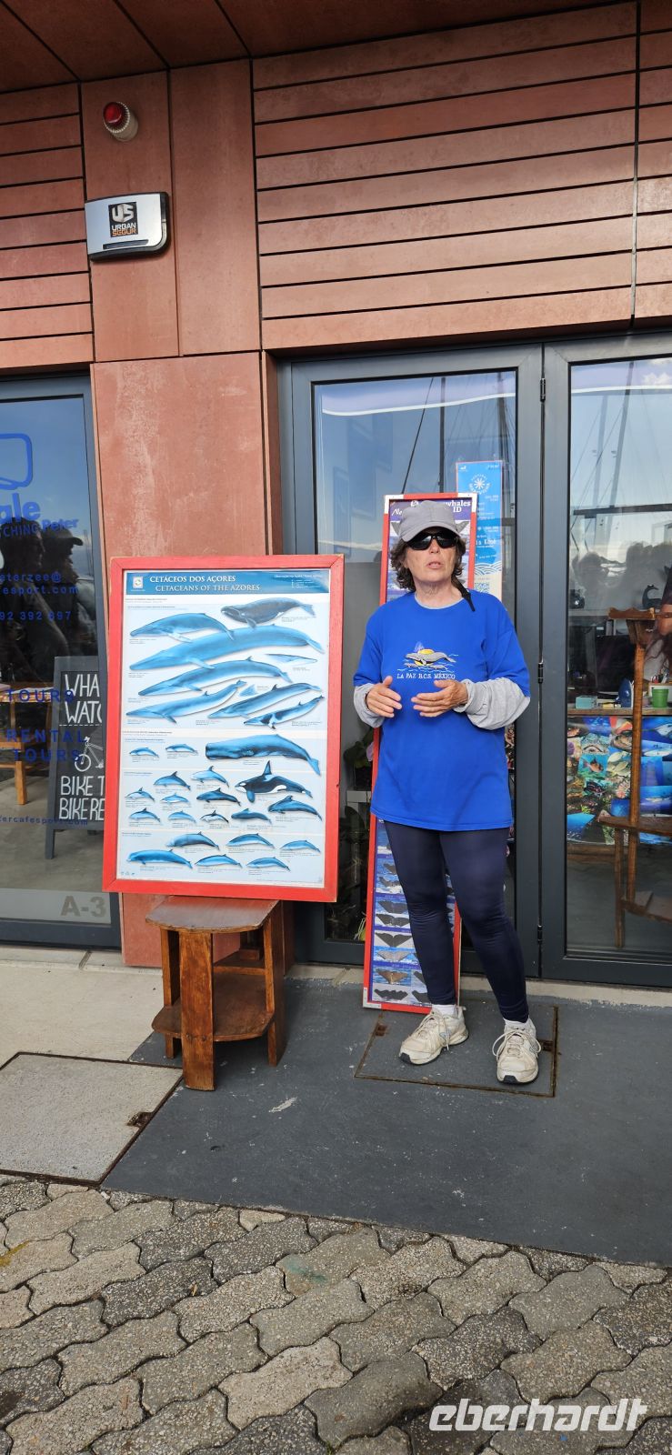Die Koffer waren gepackt und wurden im Hotel deponiert. 10 Damen gingen mit mir und Eva hinunter zur Whale Watching Agentur Norberto und dort gab es eine Einweisung durch Lisa auf englisch. Anschließend wurden die Teilnehmer auf die Boote verteilt und wir hatten das Glück, mit einem kleinen Katamaran mit Lisa und Alessandro hinaus zu fahren. Am Morgen waren Pottwale zwischen den Inseln Faial, Pico und Sao Jorge gesichtet worden und dorthin fuhren wir nun mit unserem Boot. Es war mäßiger Wellengang und wir mussten uns gut festhalten. Dann endlich stoppte der Motor und Lisa öffnete die Tür zum Bug des Schiffes. Wir konnten dort unten stehen oder oben sitzen, um die Pottwale zu beobachten. Es waren zahlreiche Tiere an der Wasseroberfläche auch zweimal Mütter mit ihrem Nachwuchs konnten wir gut erkennen. Lisa hatte eine professionelle Kamera dabei und konnte so deutlich bessere Fotos machen als wir mit unseren Handys. Wir wechselten noch zweimal unseren Standort und sahen außer den Pottwalen, Delphine, fliegende Fische und eine Meeresschildkröte. Der Ausflug war ein voller Erfolg und so kehrten wir froh gestimmt zu Mittag zurück nach Horta. Lisa versprach uns, die Fotos zu schicken. Eva und die anderen Singles hatten bereits bei Peter auf der Terrasse Plätze gesichert und so stand einem letzten guten Mittagessen in Horta nichts mehr im Weg. Gut gestärkt gingen wir zum Hotel zurück, nahmen unsere Koffer auf und fuhren zum Flughafen. Dort verabschiedeten wir uns von Eva, die kurzfristig wegen der Krankheit von Frederik eingesprungen war. Unser Flug nach Terceira war ganz pünktlich und führte wieder vorbei am Pico, über die Insel Sao Jorge und dann kam auch schon die Insel Terceira in Sicht. Am Flughafen enpfing uns Paula und mit ihr fuhren wir über die Insel Terceira nach Angra zu unserem Hotel Terceira Mar. Das Einchecken ging wieder ganz flott und 19 Uhr gingen wir zusammen zum italienischen Restaurant Elio ´s im Sao Pedro Viertel, nicht weit von unserem Hotel entfernt. Der Chef stellte sofort Plätze für uns 18 Personen bereit und wir ließen uns die Pizza und andere italienische Spezialitäten schmecken. Nach dem Essen begab ich mich ins Stadtzentrum von Angra, um für den nächsten Abend zu reservieren. Leider war ich dabei nicht erfolgreich und so kehrte ich zu Elio zurück und der freute sich auf unsere Gruppe am nächsten Abend.