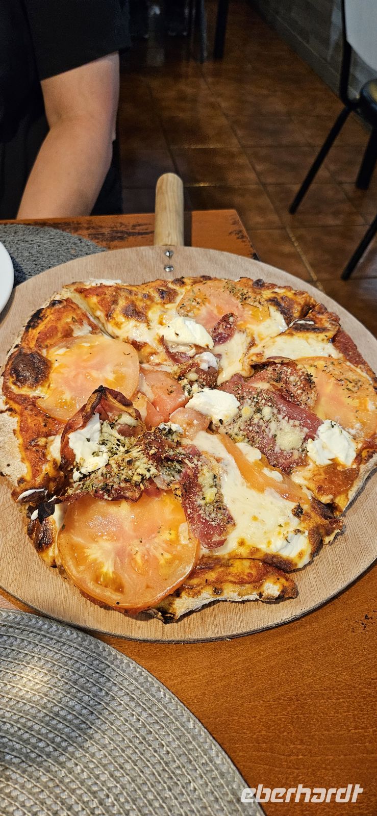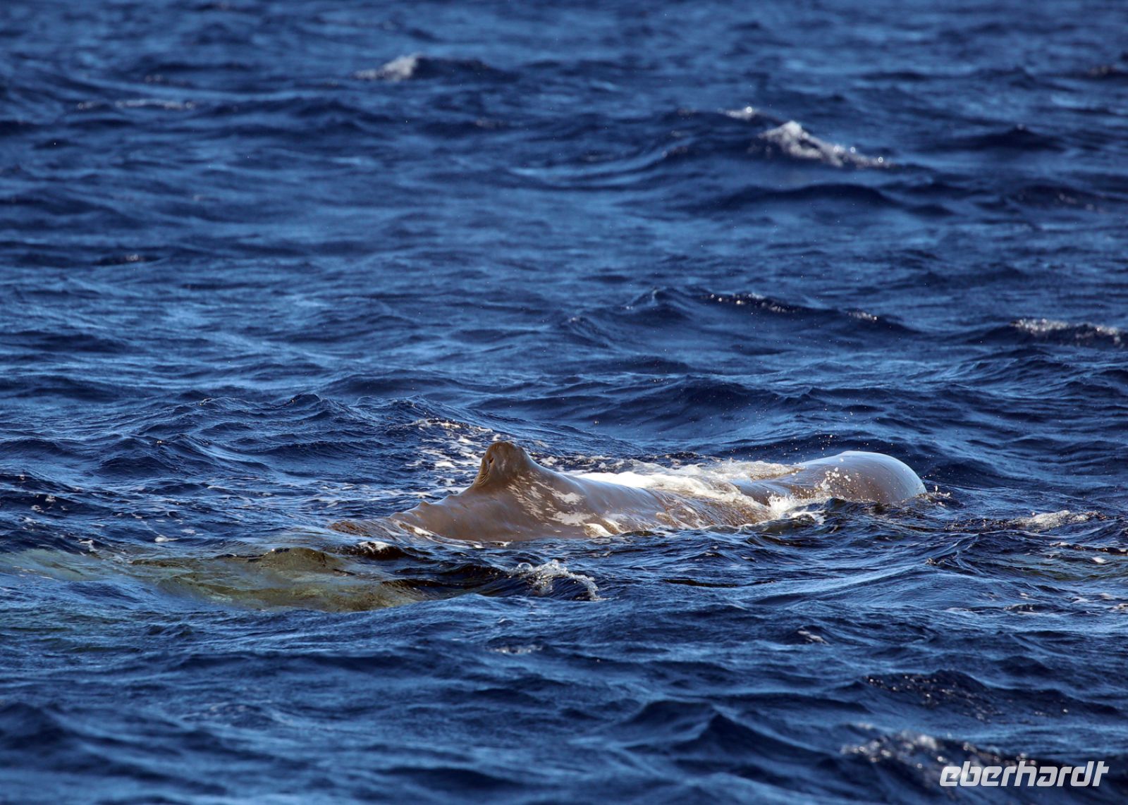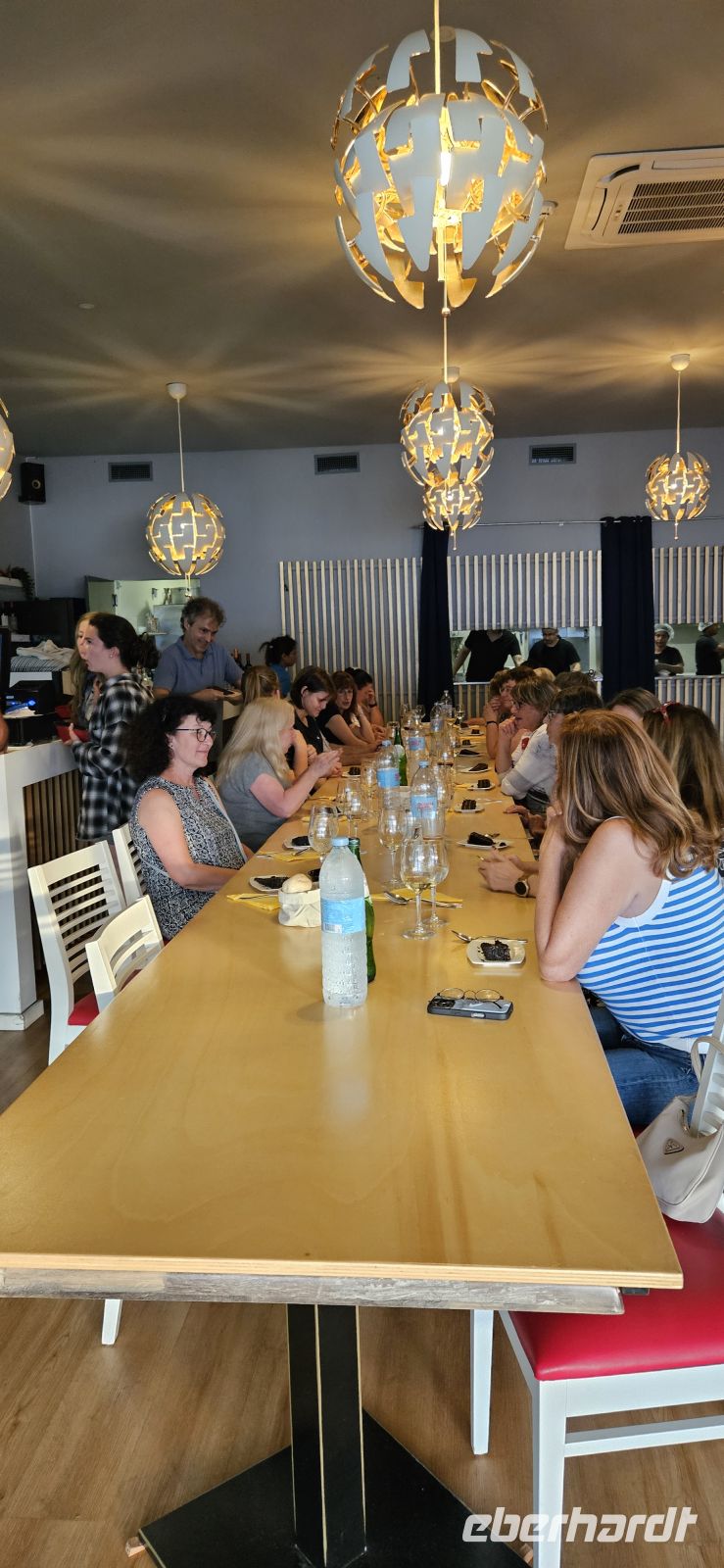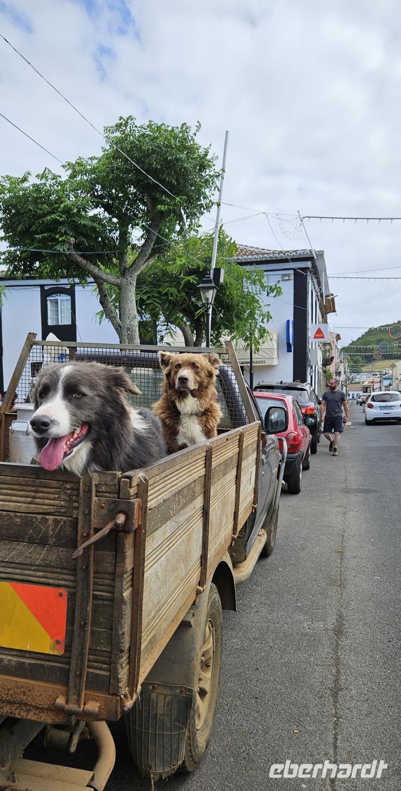 Die Koffer waren gepackt und wurden im Hotel deponiert. 10 Damen gingen mit mir und Eva hinunter zur Whale Watching Agentur Norberto und dort gab es eine Einweisung durch Lisa auf englisch. Anschließend wurden die Teilnehmer auf die Boote verteilt und wir hatten das Glück, mit einem kleinen Katamaran mit Lisa und Alessandro hinaus zu fahren. Am Morgen waren Pottwale zwischen den Inseln Faial, Pico und Sao Jorge gesichtet worden und dorthin fuhren wir nun mit unserem Boot. Es war mäßiger Wellengang und wir mussten uns gut festhalten. Dann endlich stoppte der Motor und Lisa öffnete die Tür zum Bug des Schiffes. Wir konnten dort unten stehen oder oben sitzen, um die Pottwale zu beobachten. Es waren zahlreiche Tiere an der Wasseroberfläche auch zweimal Mütter mit ihrem Nachwuchs konnten wir gut erkennen. Lisa hatte eine professionelle Kamera dabei und konnte so deutlich bessere Fotos machen als wir mit unseren Handys. Wir wechselten noch zweimal unseren Standort und sahen außer den Pottwalen, Delphine, fliegende Fische und eine Meeresschildkröte. Der Ausflug war ein voller Erfolg und so kehrten wir froh gestimmt zu Mittag zurück nach Horta. Lisa versprach uns, die Fotos zu schicken. Eva und die anderen Singles hatten bereits bei Peter auf der Terrasse Plätze gesichert und so stand einem letzten guten Mittagessen in Horta nichts mehr im Weg. Gut gestärkt gingen wir zum Hotel zurück, nahmen unsere Koffer auf und fuhren zum Flughafen. Dort verabschiedeten wir uns von Eva, die kurzfristig wegen der Krankheit von Frederik eingesprungen war. Unser Flug nach Terceira war ganz pünktlich und führte wieder vorbei am Pico, über die Insel Sao Jorge und dann kam auch schon die Insel Terceira in Sicht. Am Flughafen enpfing uns Paula und mit ihr fuhren wir über die Insel Terceira nach Angra zu unserem Hotel Terceira Mar. Das Einchecken ging wieder ganz flott und 19 Uhr gingen wir zusammen zum italienischen Restaurant Elio ´s im Sao Pedro Viertel, nicht weit von unserem Hotel entfernt. Der Chef stellte sofort Plätze für uns 18 Personen bereit und wir ließen uns die Pizza und andere italienische Spezialitäten schmecken. Nach dem Essen begab ich mich ins Stadtzentrum von Angra, um für den nächsten Abend zu reservieren. Leider war ich dabei nicht erfolgreich und so kehrte ich zu Elio zurück und der freute sich auf unsere Gruppe am nächsten Abend.