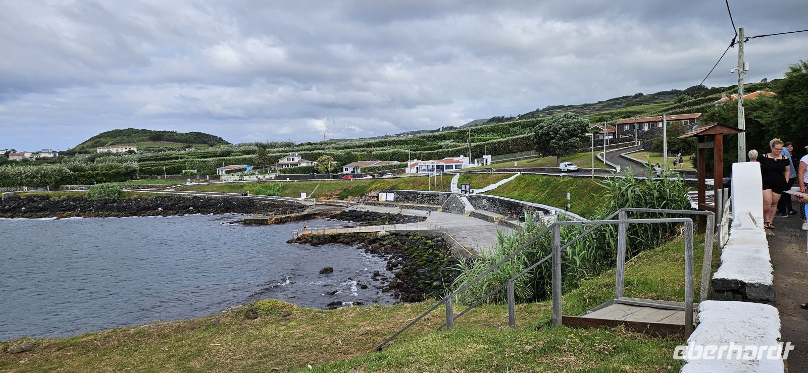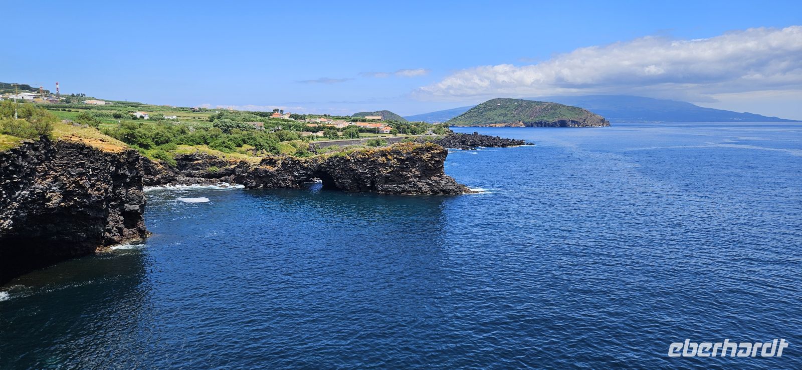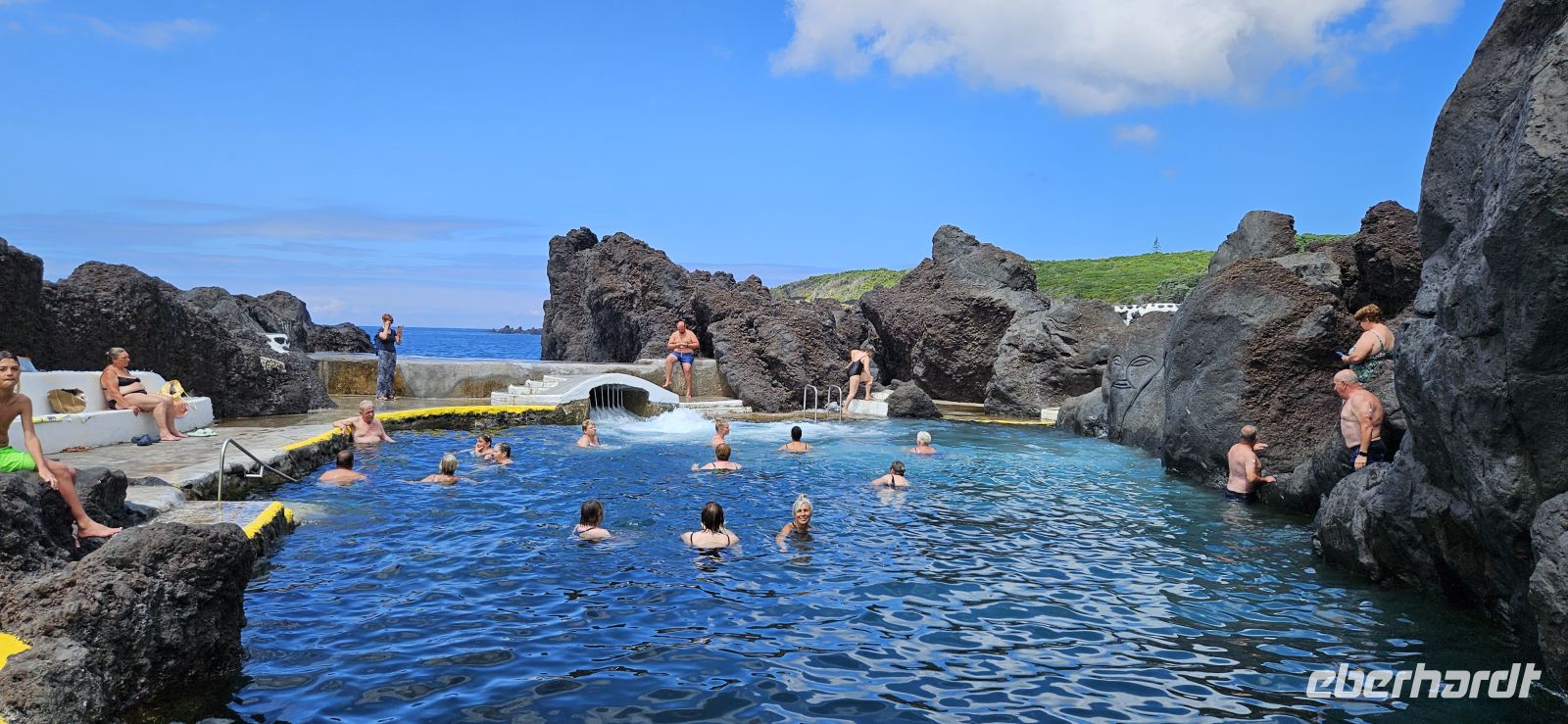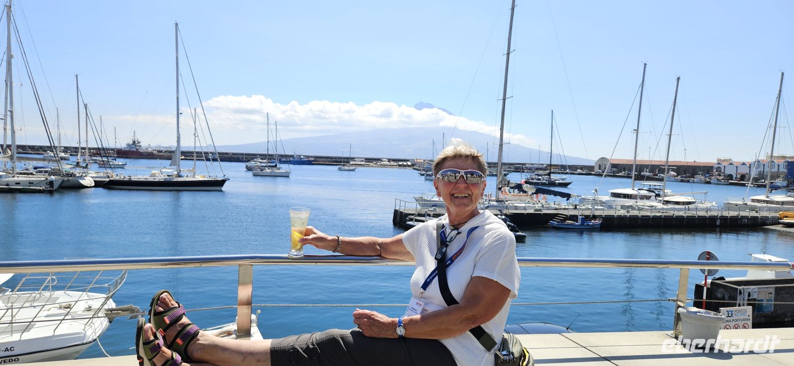 WIR fuhren entlang der Westküste zurück und machten den nächsten Stopp in Varadouro bei den Meerwasserschwimmbecken. Da gab es ein gemütliches Becken und eins, wo die mächtigen Wellen hinein schwappten. Zum Schwimmen war es grandios, denn es kam mit jeder Welle frisches Meerwasser in das Becken. Im nahegelegenen kleinen Bistro machten wir unsere Mittagspause und fuhren danach entlang der West- und Südküste zurück nach Horta. Ein letzter Fotostopp bei den Felsbögen erfolgte kurz vor der Stadt. Das Abendessen nahmen wir im Peter Cafe Sport auf der Terrasse ein. Wir hatten unsere Bestellung bereits telefonisch aufgegeben und so mussten wir auch nicht lange auf unser Essen warten.