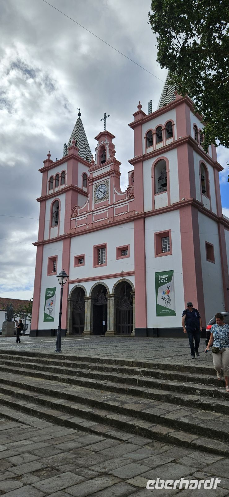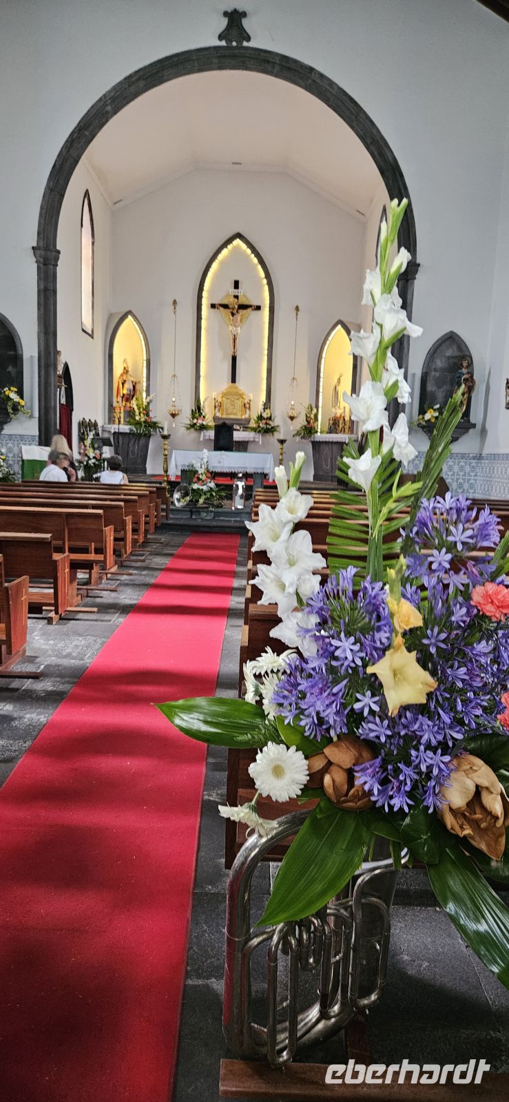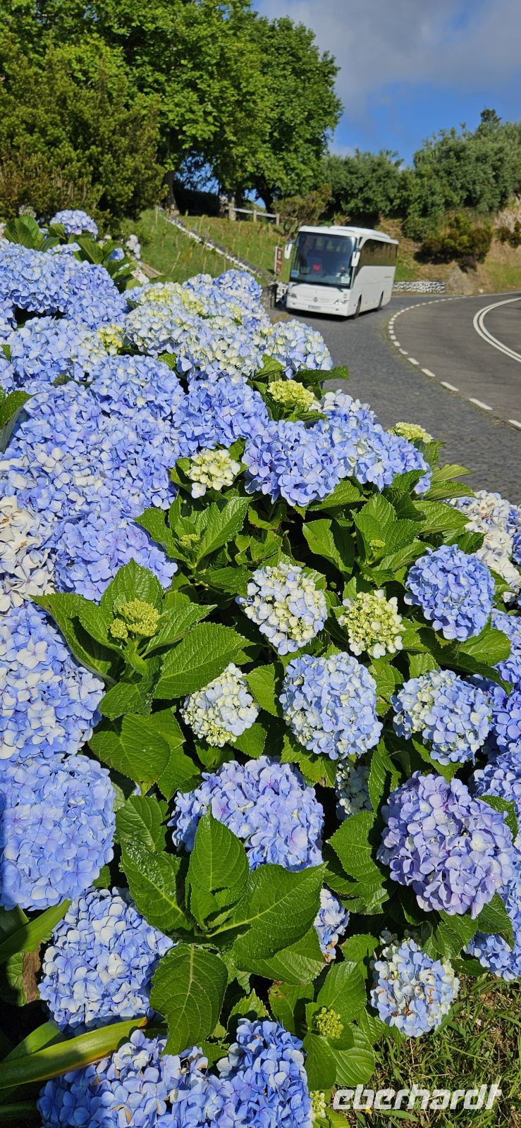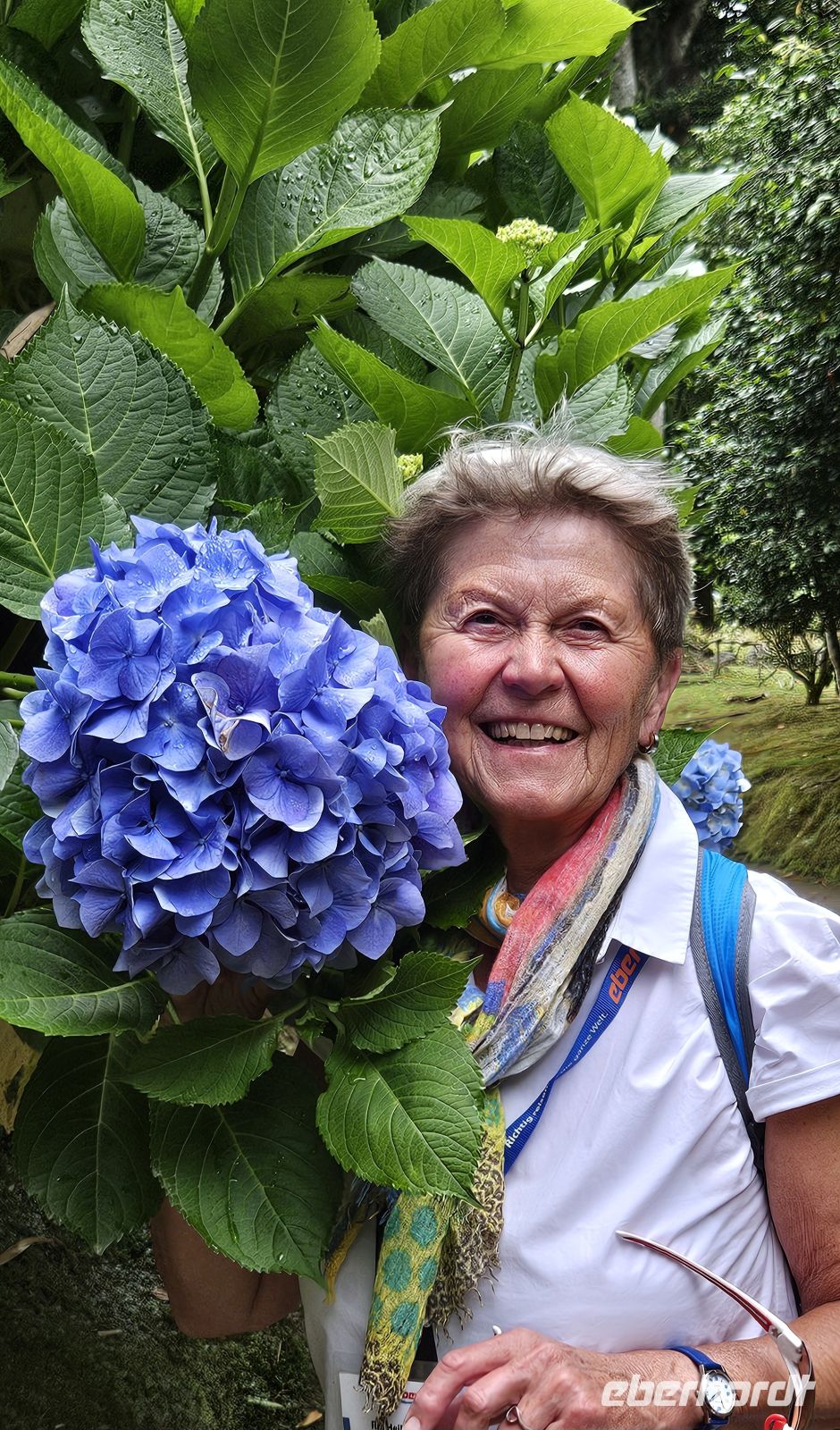 Nach einem reichhaltigen Frühstück starteten wir 9 Uhr zu unserem ersten Ausflug. Unterwegs gab Frederik die wichtigsten Informationen zu den Azoren. Am Aussichtspunkt Pisao bestaunten wir die üppige Vegetation und hatten einen wunderschönen Blick hinunter zum Kloster Caloura. Nur widerwillig stiegen die Gäste in den Bus ein, denn es gab ja die ersten Hortensien zu fotografieren !! Der nächste Stopp war am Meer mit Blick auf die vorgelagerte Insel Vila Franca do Campo, wo es alljährlich das Red Bull Cliff Diving World Series-Event gibt. Täglich dürfen die Insel 400 Gäste besuchen und den wunderschönen Badestrand genießen. In der Stadt Vila Franca do Campo machten wir einen Spaziergang zur Kirche, zum Rathaus und durch den Park zum kleinen Hafen. Im Ort werden die berühmten Queijadas produziert und so kaufte ich für jeden ein solcher kleines "Törtchen" zum Probieren. Wir fuhren immer weiter ostwärts und erreichten den Furnas See, wo bereits unser Mittagessen im Erdloch fertig gekocht war. Also fuhren wir hinunter nach Furnas und begaben uns ins Restaurant Tony´s, wo wir den leckeren Cozido zu Mittag bekamen. In einen großen Topf werden Kohl, Süßkartoffeln, Möhren, Kartoffeln, Yamswurzel, Hühnchen, Schweinefleisch, Rindfleisch, Blutwurst und Chorizo geschichtet und mit Kohlblättern abgedeckt. Der Topf wird in ein großes Tuch eingeschlagen und das ganze kocht dann für 6-8 Stunden im heissen Dampf im Erdloch. Es schmeckte fantastisch und der Milchreis Nachtisch war auch etwas ganz besonderes. Nun waren wir gestärkt und begaben uns zu Fuß in den Terra Nostra Park. Der damalige Konsul der USA auf den Azoren, Thomas Hikling, erbaute auf dem Gelände 1780 seine Sommerresidenz. Mitte des 19.Jahrhundert erweiterten die Viscondes da Praia das Gelände zu einem Botanischen Garten. 1930 erwarb Vasco Bensaude das Gelände und gestaltete es mit seinem schottischen Gärtner neu. Der alte Baumbestand und die Vielzahl an Pflanzen sind einfach grandios und das große Thermalbecken mit 38 Grad warmen Wasser lud auch einige Singles unserer Gruppe zum Baden ein. Mit unserem Bus fuhren wir anschließend zum Aussichtspunkt Pico da Ferro und von dort oben hatten wir einen wunderschönen Blick in den riesigen Krater mit dem Furnas See und den Ort Furnas. Weiter ging´s zur Teeplantage Gorreana. Im Bus hatte Frederik uns schon alles über die Teeherstellung berichtet und so schauten wir uns drinnen die alten, noch immer zur Produktion genutzten Maschinen an und probierten den Tee. Entlang der Nordküste fuhren wir zurück. Einige Singles unternahmen mit mir noch einen Spaziergang entlang der Marina bis zur Festung Sao Bras und zur Esperanca Kirche. Diese Kirche auch Santo Cristo Kirche genannt, ist die wichtigste der Insel unbd beherbergt die vergoldete Christus Statue, die beim wichtigsten Fest der Insel am 5.Sonntag nach Ostern bei einer Prozession durch die Strassen getragen wird.