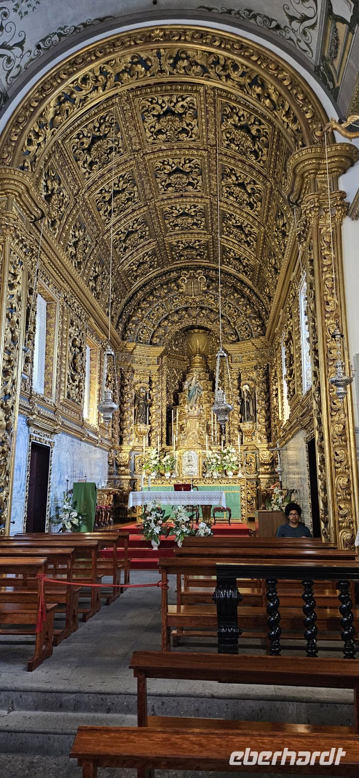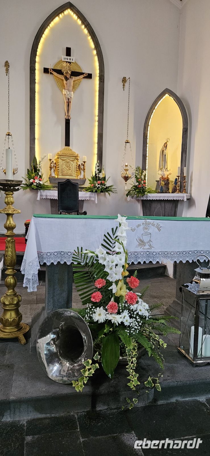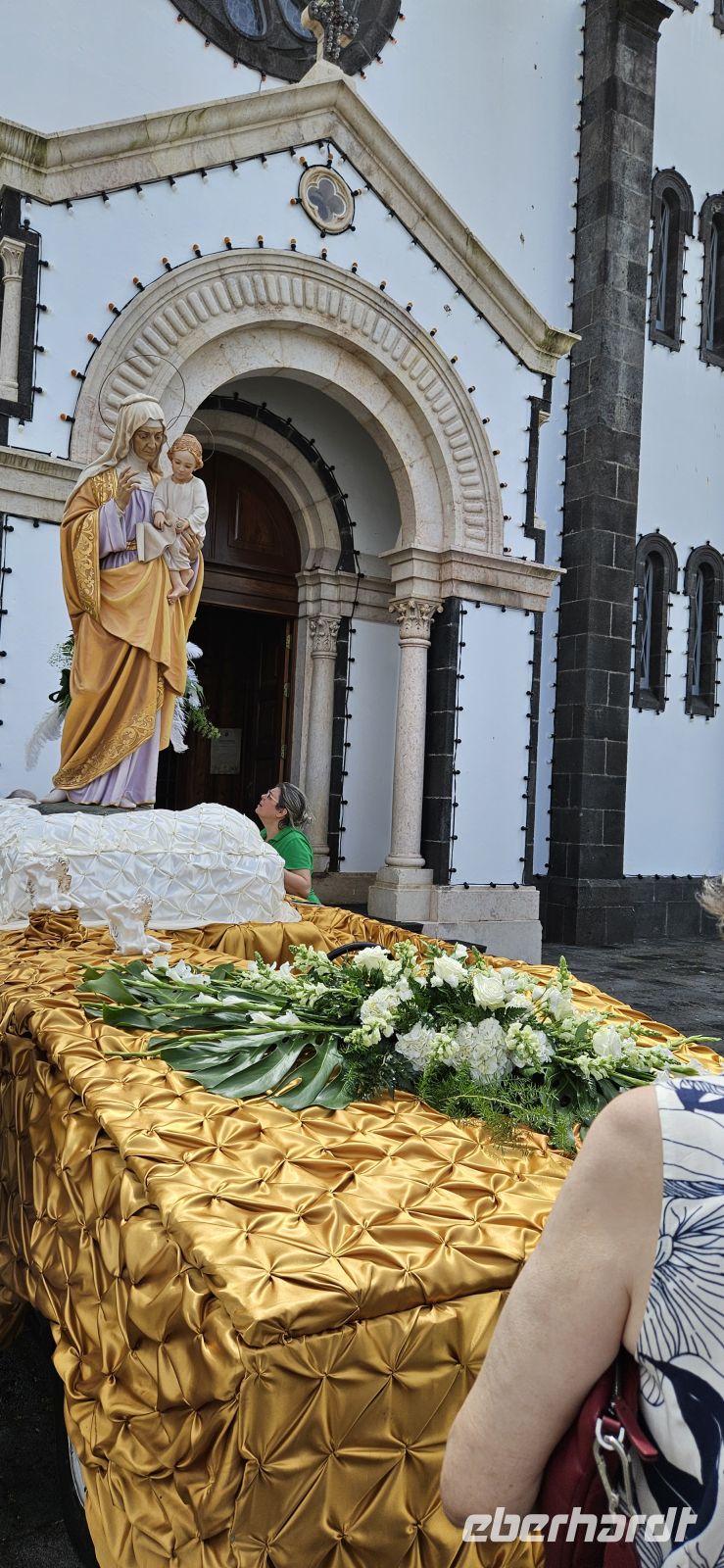 Nach einem reichhaltigen Frühstück starteten wir 9 Uhr zu unserem ersten Ausflug. Unterwegs gab Frederik die wichtigsten Informationen zu den Azoren. Am Aussichtspunkt Pisao bestaunten wir die üppige Vegetation und hatten einen wunderschönen Blick hinunter zum Kloster Caloura. Nur widerwillig stiegen die Gäste in den Bus ein, denn es gab ja die ersten Hortensien zu fotografieren !! Der nächste Stopp war am Meer mit Blick auf die vorgelagerte Insel Vila Franca do Campo, wo es alljährlich das Red Bull Cliff Diving World Series-Event gibt. Täglich dürfen die Insel 400 Gäste besuchen und den wunderschönen Badestrand genießen. In der Stadt Vila Franca do Campo machten wir einen Spaziergang zur Kirche, zum Rathaus und durch den Park zum kleinen Hafen. Im Ort werden die berühmten Queijadas produziert und so kaufte ich für jeden ein solcher kleines "Törtchen" zum Probieren. Wir fuhren immer weiter ostwärts und erreichten den Furnas See, wo bereits unser Mittagessen im Erdloch fertig gekocht war. Also fuhren wir hinunter nach Furnas und begaben uns ins Restaurant Tony´s, wo wir den leckeren Cozido zu Mittag bekamen. In einen großen Topf werden Kohl, Süßkartoffeln, Möhren, Kartoffeln, Yamswurzel, Hühnchen, Schweinefleisch, Rindfleisch, Blutwurst und Chorizo geschichtet und mit Kohlblättern abgedeckt. Der Topf wird in ein großes Tuch eingeschlagen und das ganze kocht dann für 6-8 Stunden im heissen Dampf im Erdloch. Es schmeckte fantastisch und der Milchreis Nachtisch war auch etwas ganz besonderes. Nun waren wir gestärkt und begaben uns zu Fuß in den Terra Nostra Park. Der damalige Konsul der USA auf den Azoren, Thomas Hikling, erbaute auf dem Gelände 1780 seine Sommerresidenz. Mitte des 19.Jahrhundert erweiterten die Viscondes da Praia das Gelände zu einem Botanischen Garten. 1930 erwarb Vasco Bensaude das Gelände und gestaltete es mit seinem schottischen Gärtner neu. Der alte Baumbestand und die Vielzahl an Pflanzen sind einfach grandios und das große Thermalbecken mit 38 Grad warmen Wasser lud auch einige Singles unserer Gruppe zum Baden ein. Mit unserem Bus fuhren wir anschließend zum Aussichtspunkt Pico da Ferro und von dort oben hatten wir einen wunderschönen Blick in den riesigen Krater mit dem Furnas See und den Ort Furnas. Weiter ging´s zur Teeplantage Gorreana. Im Bus hatte Frederik uns schon alles über die Teeherstellung berichtet und so schauten wir uns drinnen die alten, noch immer zur Produktion genutzten Maschinen an und probierten den Tee. Entlang der Nordküste fuhren wir zurück. Einige Singles unternahmen mit mir noch einen Spaziergang entlang der Marina bis zur Festung Sao Bras und zur Esperanca Kirche. Diese Kirche auch Santo Cristo Kirche genannt, ist die wichtigste der Insel unbd beherbergt die vergoldete Christus Statue, die beim wichtigsten Fest der Insel am 5.Sonntag nach Ostern bei einer Prozession durch die Strassen getragen wird.