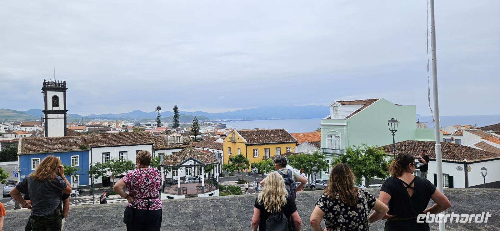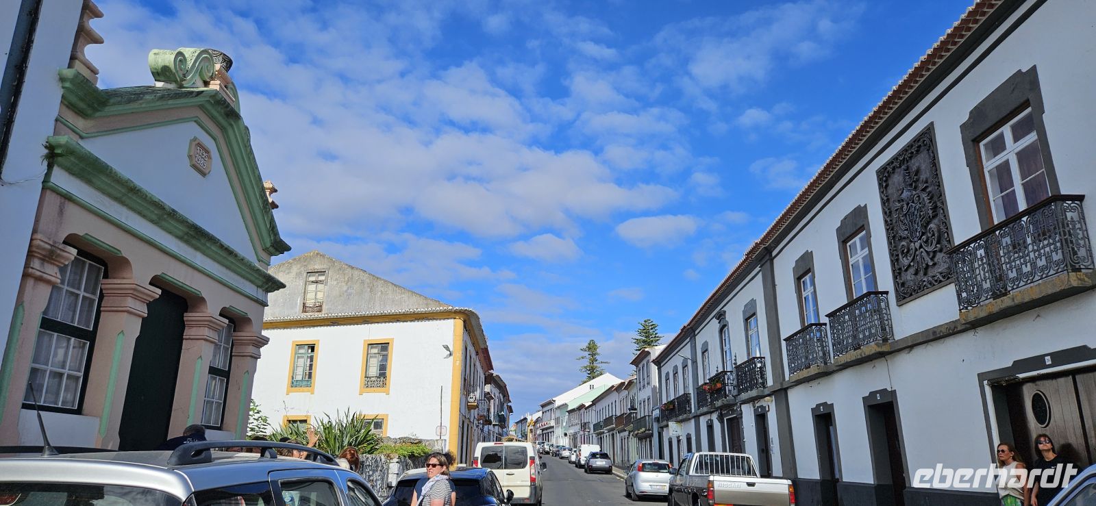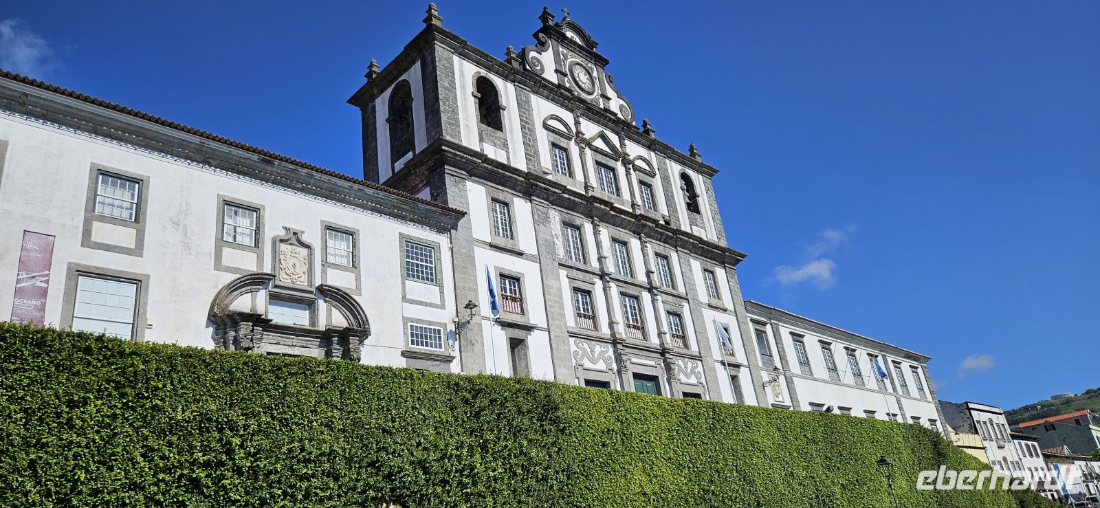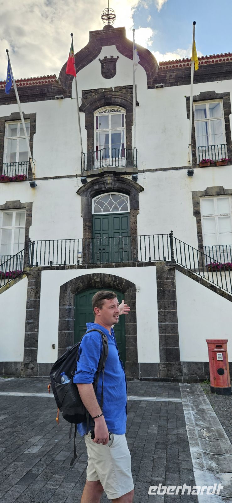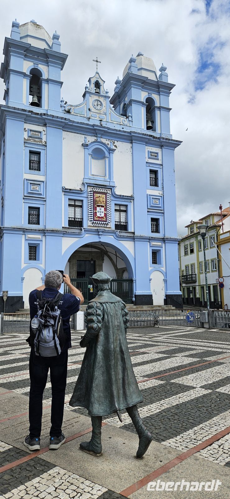 Von unserem Hotel spazierten wir mit Paula durch das Sao Pedro Viertel ins Stadtzentrum von Angra. Unterwegs gab es immer mal Pausen, wo uns Paula zur Geschichte der Stadt informierte. Wir sahen dann die Kathedrale von außen, besuchten das Theater auch innen und gingen weiter zum großen Komplex der Jesuitenkirche mit Kloster. Im Kloster gibt es heute ein Museum und die Präsident hat dort seinen Sitz, wenn er sich auf Terceira aufhält. Im Cafe Central zeigte uns Paula die süßen Leckereien und anschließend spazierten wir durch den Park der Stadt. Am Park steht das Gebäude des ehemaligen Franziskaner Klosters, wo heute das Museum der Insel untergebracht ist. Der Besuch des Rathaus folge dann. Im Ratssaal nahmen wir Platz und bekamen alles wichtige zur Geschichte der Stadt zu hören. Die Räumlichkeiten des Rathauses können besucht werden wenn nicht gerade Sitzungen stattfinden. Über den Rathaus Vorplatz gings dann weiter Richtung Hafen. Unterwegs besuchten wir einen traditionellen Laden, wo die Waren noch teilweise lose angeboten wurden. Am alten Hafentor, durch das wohl auch Vasco da Gama gegangen war, machten wir Halt und bestaunten die blaue Misericordia Kirche, einst das erste Krankenhaus der Stadt, in dem auch der kranke Bruder von Vasco da Gama behandelt wurde. Der Hafen von Angra hat eine sehr geschützte Lage und war deshalb bei den Seefahrern bekannt. Er lag geschützt und konnte von Piraten nicht angegriffen werden. Heute befindet sich dort die Marina und ein Lokal, in dem die eigenen regionalen Produkte verwertet werden. Aus der Milch gibt es ein leckeres Eis und das Fleisch wird im Restaurant zu leckeren Gerichten verarbeitet. Wir dankten Paula für die ausführliche Führung und begaben uns zum Mittagessen ins Cafe Central. Der Nachmittag wurde für Einkäufe und den Besuch der Poolanlage im Hotel genutzt. Und dann mussten ja noch die Koffer gepackt werden.