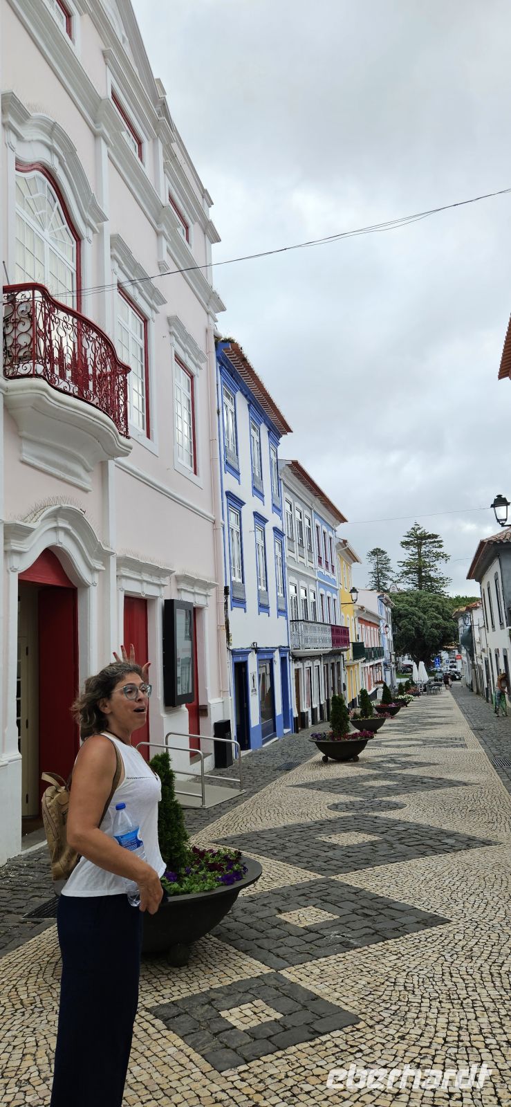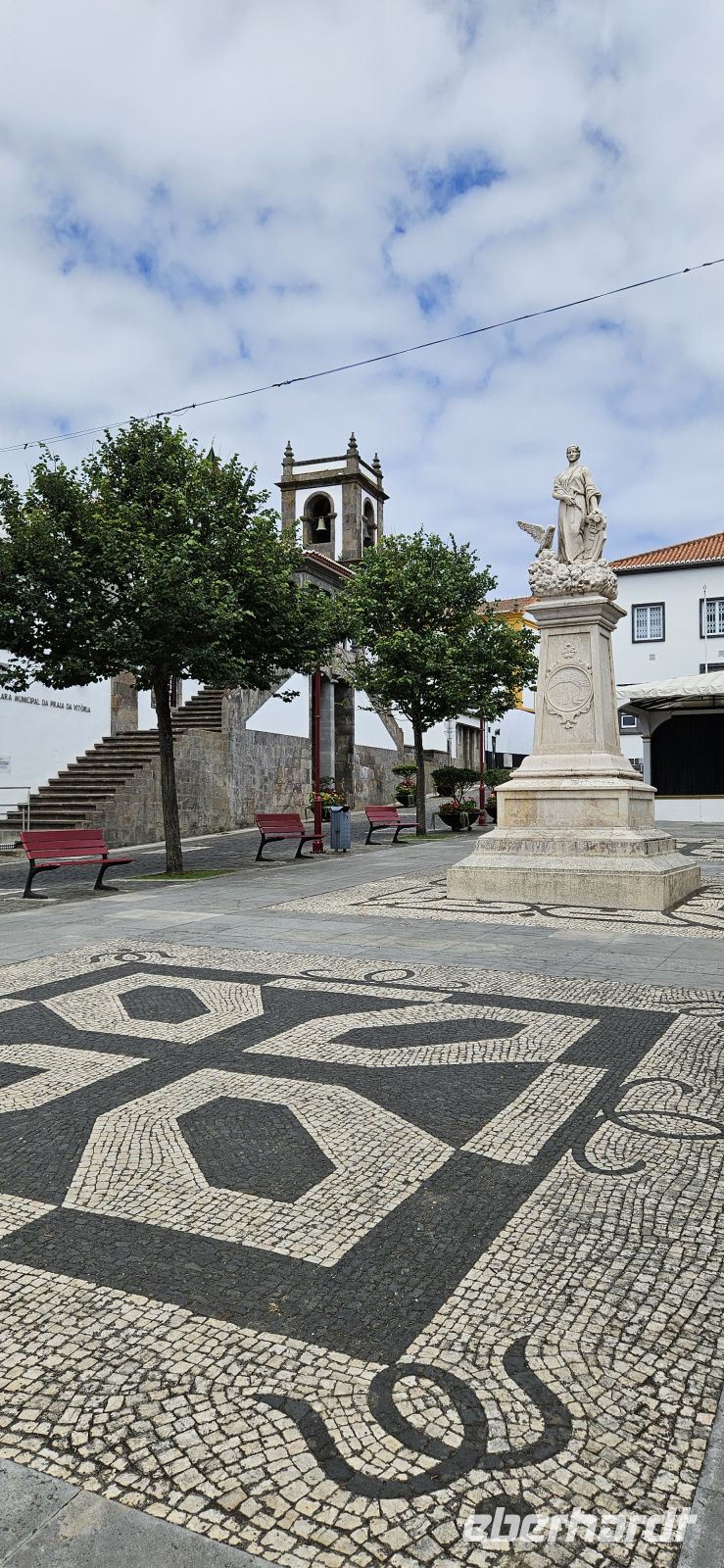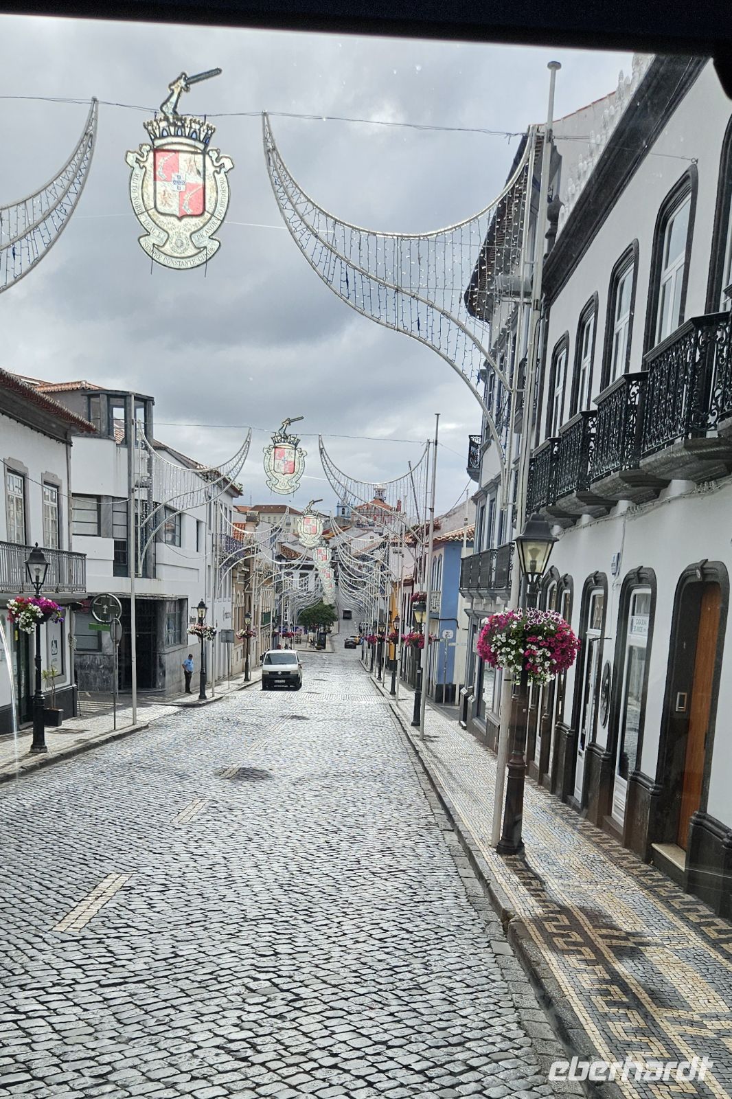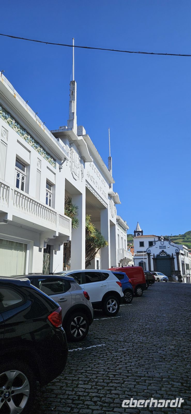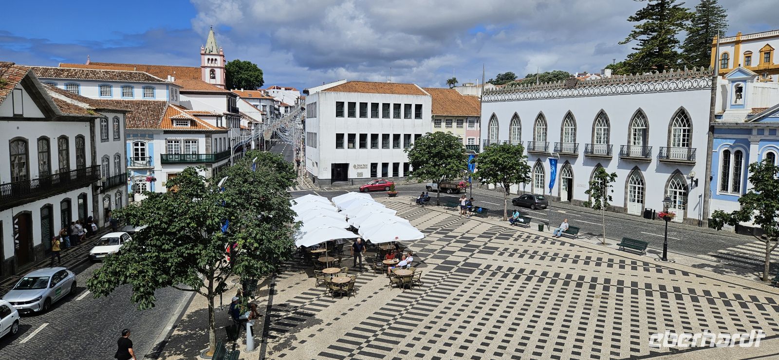 Von unserem Hotel spazierten wir mit Paula durch das Sao Pedro Viertel ins Stadtzentrum von Angra. Unterwegs gab es immer mal Pausen, wo uns Paula zur Geschichte der Stadt informierte. Wir sahen dann die Kathedrale von außen, besuchten das Theater auch innen und gingen weiter zum großen Komplex der Jesuitenkirche mit Kloster. Im Kloster gibt es heute ein Museum und die Präsident hat dort seinen Sitz, wenn er sich auf Terceira aufhält. Im Cafe Central zeigte uns Paula die süßen Leckereien und anschließend spazierten wir durch den Park der Stadt. Am Park steht das Gebäude des ehemaligen Franziskaner Klosters, wo heute das Museum der Insel untergebracht ist. Der Besuch des Rathaus folge dann. Im Ratssaal nahmen wir Platz und bekamen alles wichtige zur Geschichte der Stadt zu hören. Die Räumlichkeiten des Rathauses können besucht werden wenn nicht gerade Sitzungen stattfinden. Über den Rathaus Vorplatz gings dann weiter Richtung Hafen. Unterwegs besuchten wir einen traditionellen Laden, wo die Waren noch teilweise lose angeboten wurden. Am alten Hafentor, durch das wohl auch Vasco da Gama gegangen war, machten wir Halt und bestaunten die blaue Misericordia Kirche, einst das erste Krankenhaus der Stadt, in dem auch der kranke Bruder von Vasco da Gama behandelt wurde. Der Hafen von Angra hat eine sehr geschützte Lage und war deshalb bei den Seefahrern bekannt. Er lag geschützt und konnte von Piraten nicht angegriffen werden. Heute befindet sich dort die Marina und ein Lokal, in dem die eigenen regionalen Produkte verwertet werden. Aus der Milch gibt es ein leckeres Eis und das Fleisch wird im Restaurant zu leckeren Gerichten verarbeitet. Wir dankten Paula für die ausführliche Führung und begaben uns zum Mittagessen ins Cafe Central. Der Nachmittag wurde für Einkäufe und den Besuch der Poolanlage im Hotel genutzt. Und dann mussten ja noch die Koffer gepackt werden.
