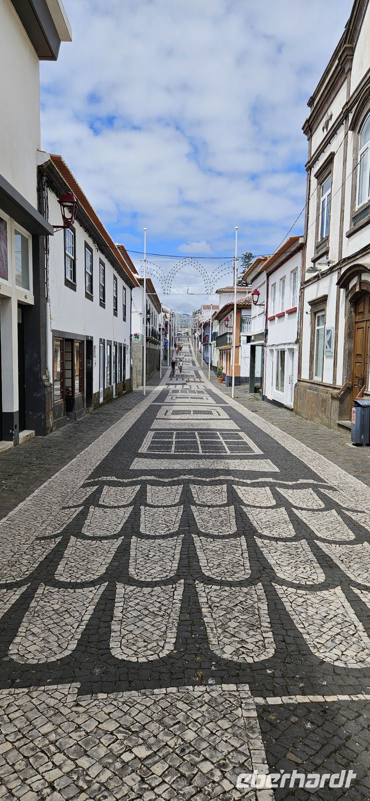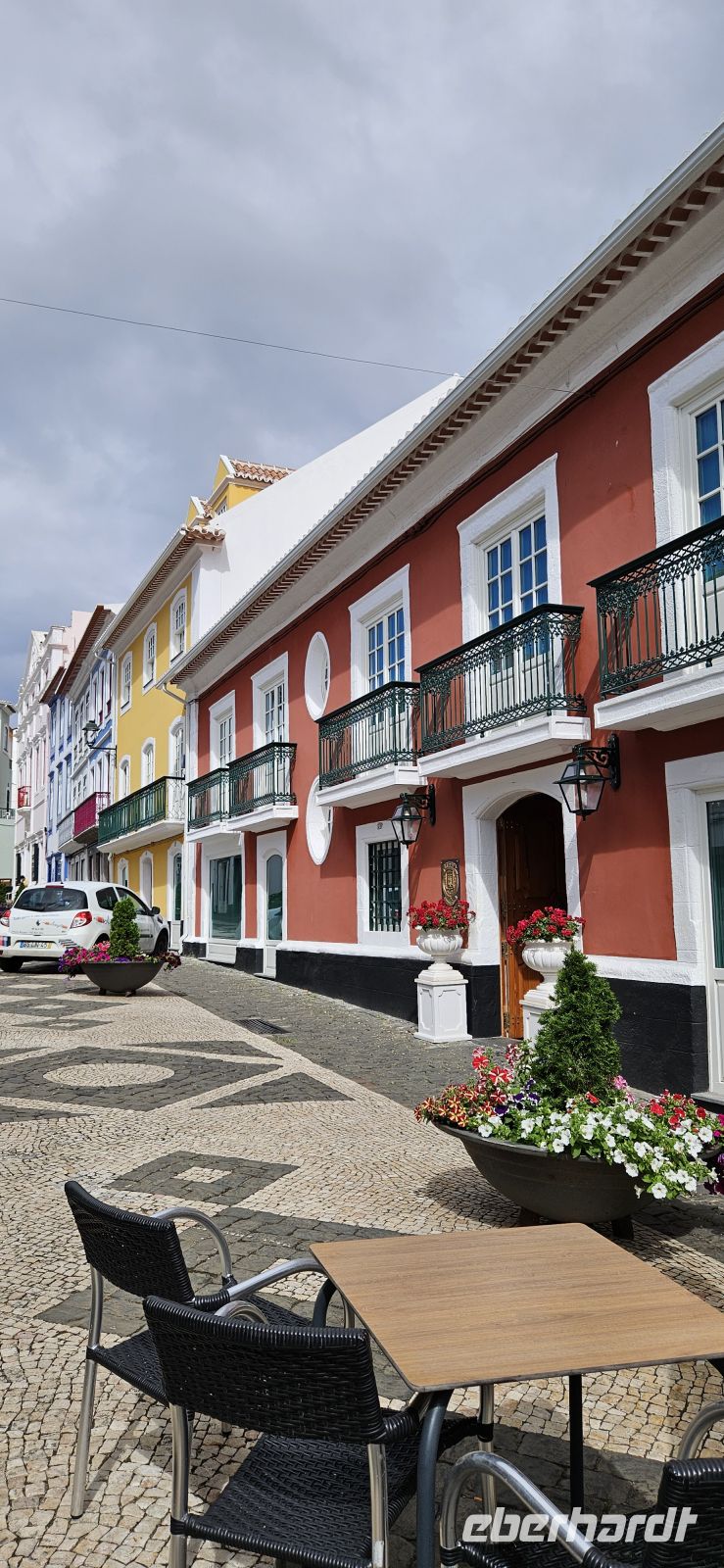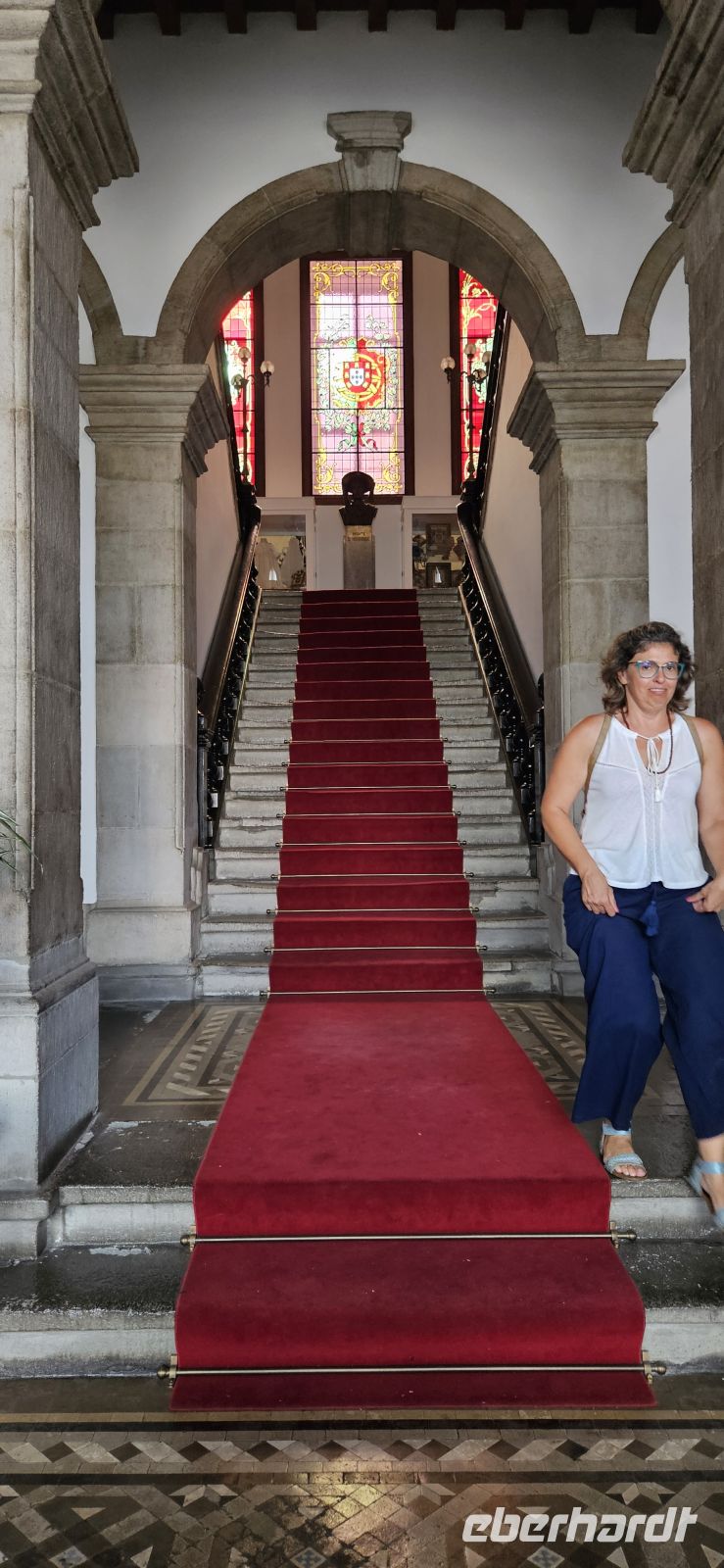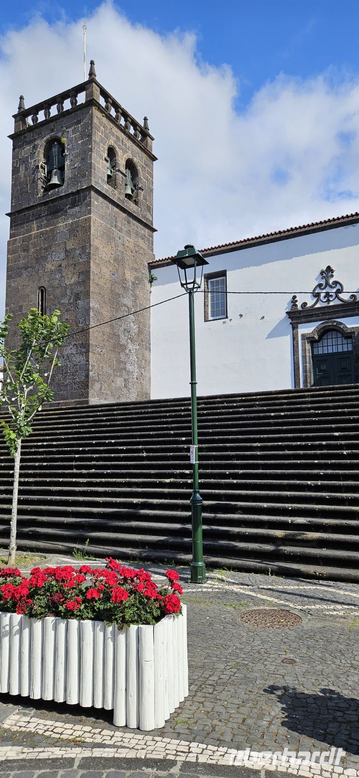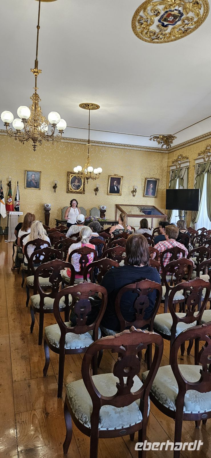 Von unserem Hotel spazierten wir mit Paula durch das Sao Pedro Viertel ins Stadtzentrum von Angra. Unterwegs gab es immer mal Pausen, wo uns Paula zur Geschichte der Stadt informierte. Wir sahen dann die Kathedrale von außen, besuchten das Theater auch innen und gingen weiter zum großen Komplex der Jesuitenkirche mit Kloster. Im Kloster gibt es heute ein Museum und die Präsident hat dort seinen Sitz, wenn er sich auf Terceira aufhält. Im Cafe Central zeigte uns Paula die süßen Leckereien und anschließend spazierten wir durch den Park der Stadt. Am Park steht das Gebäude des ehemaligen Franziskaner Klosters, wo heute das Museum der Insel untergebracht ist. Der Besuch des Rathaus folge dann. Im Ratssaal nahmen wir Platz und bekamen alles wichtige zur Geschichte der Stadt zu hören. Die Räumlichkeiten des Rathauses können besucht werden wenn nicht gerade Sitzungen stattfinden. Über den Rathaus Vorplatz gings dann weiter Richtung Hafen. Unterwegs besuchten wir einen traditionellen Laden, wo die Waren noch teilweise lose angeboten wurden. Am alten Hafentor, durch das wohl auch Vasco da Gama gegangen war, machten wir Halt und bestaunten die blaue Misericordia Kirche, einst das erste Krankenhaus der Stadt, in dem auch der kranke Bruder von Vasco da Gama behandelt wurde. Der Hafen von Angra hat eine sehr geschützte Lage und war deshalb bei den Seefahrern bekannt. Er lag geschützt und konnte von Piraten nicht angegriffen werden. Heute befindet sich dort die Marina und ein Lokal, in dem die eigenen regionalen Produkte verwertet werden. Aus der Milch gibt es ein leckeres Eis und das Fleisch wird im Restaurant zu leckeren Gerichten verarbeitet. Wir dankten Paula für die ausführliche Führung und begaben uns zum Mittagessen ins Cafe Central. Der Nachmittag wurde für Einkäufe und den Besuch der Poolanlage im Hotel genutzt. Und dann mussten ja noch die Koffer gepackt werden.