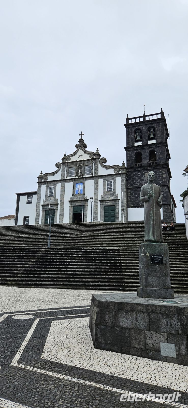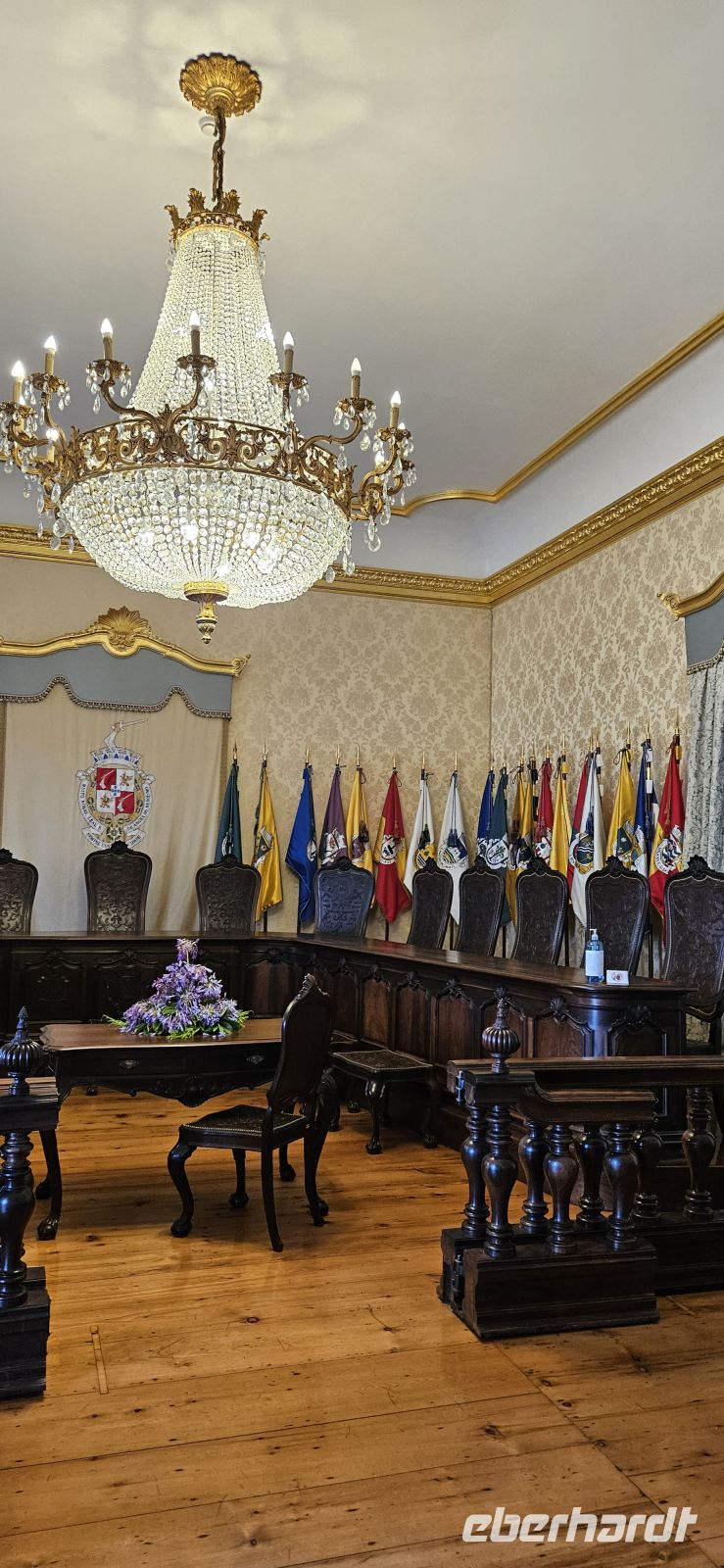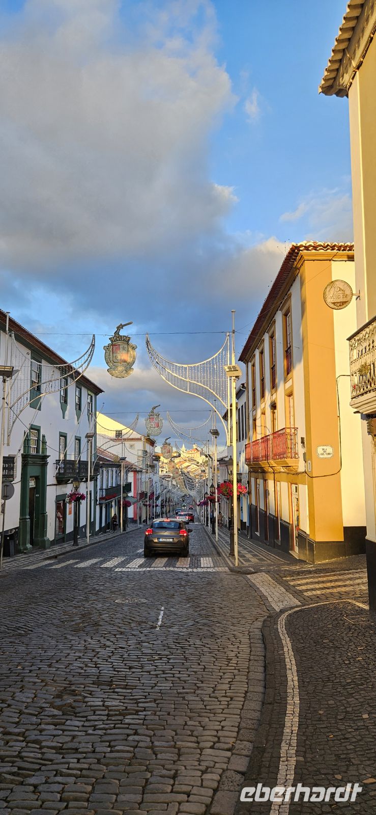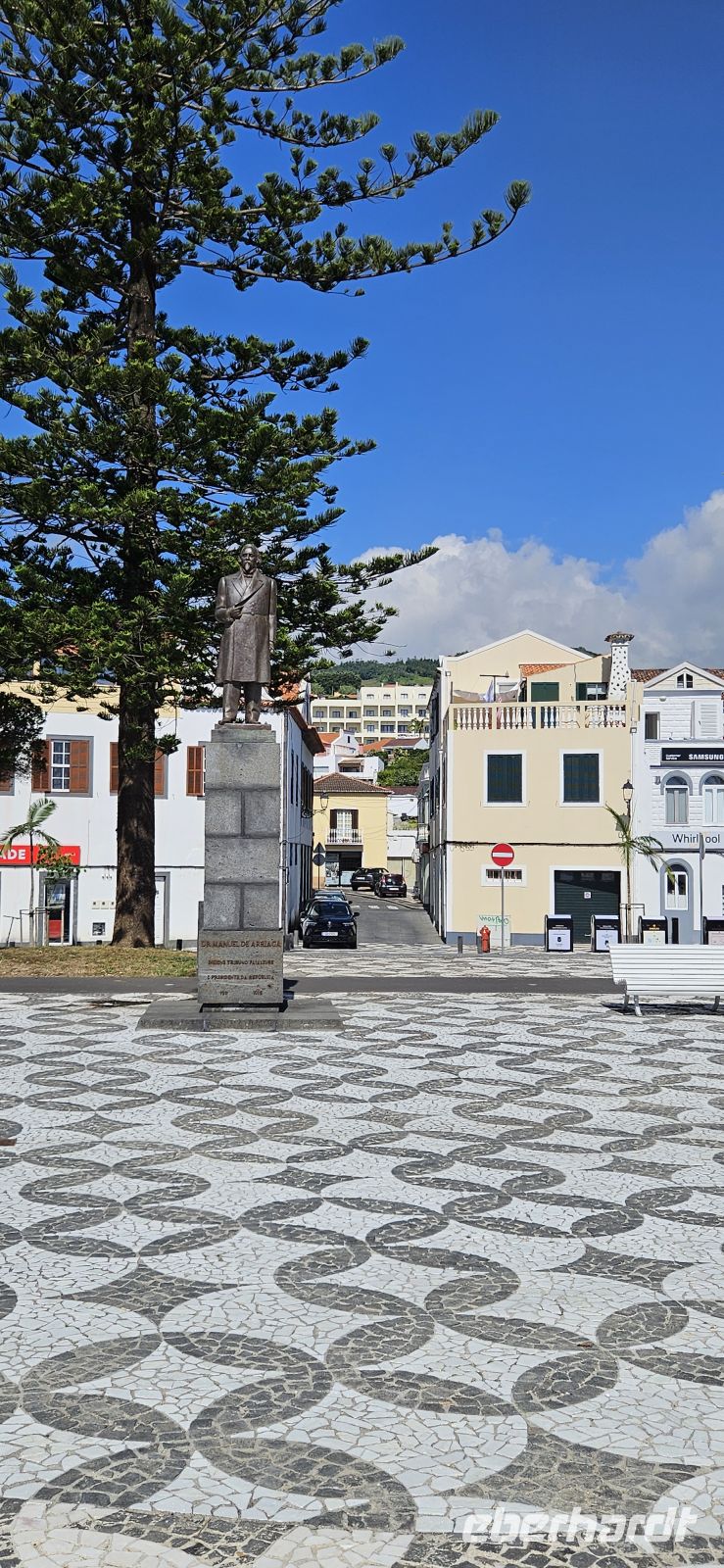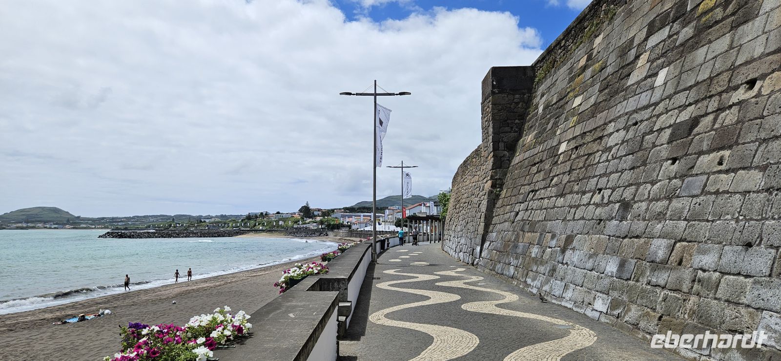 Von unserem Hotel spazierten wir mit Paula durch das Sao Pedro Viertel ins Stadtzentrum von Angra. Unterwegs gab es immer mal Pausen, wo uns Paula zur Geschichte der Stadt informierte. Wir sahen dann die Kathedrale von außen, besuchten das Theater auch innen und gingen weiter zum großen Komplex der Jesuitenkirche mit Kloster. Im Kloster gibt es heute ein Museum und die Präsident hat dort seinen Sitz, wenn er sich auf Terceira aufhält. Im Cafe Central zeigte uns Paula die süßen Leckereien und anschließend spazierten wir durch den Park der Stadt. Am Park steht das Gebäude des ehemaligen Franziskaner Klosters, wo heute das Museum der Insel untergebracht ist. Der Besuch des Rathaus folge dann. Im Ratssaal nahmen wir Platz und bekamen alles wichtige zur Geschichte der Stadt zu hören. Die Räumlichkeiten des Rathauses können besucht werden wenn nicht gerade Sitzungen stattfinden. Über den Rathaus Vorplatz gings dann weiter Richtung Hafen. Unterwegs besuchten wir einen traditionellen Laden, wo die Waren noch teilweise lose angeboten wurden. Am alten Hafentor, durch das wohl auch Vasco da Gama gegangen war, machten wir Halt und bestaunten die blaue Misericordia Kirche, einst das erste Krankenhaus der Stadt, in dem auch der kranke Bruder von Vasco da Gama behandelt wurde. Der Hafen von Angra hat eine sehr geschützte Lage und war deshalb bei den Seefahrern bekannt. Er lag geschützt und konnte von Piraten nicht angegriffen werden. Heute befindet sich dort die Marina und ein Lokal, in dem die eigenen regionalen Produkte verwertet werden. Aus der Milch gibt es ein leckeres Eis und das Fleisch wird im Restaurant zu leckeren Gerichten verarbeitet. Wir dankten Paula für die ausführliche Führung und begaben uns zum Mittagessen ins Cafe Central. Der Nachmittag wurde für Einkäufe und den Besuch der Poolanlage im Hotel genutzt. Und dann mussten ja noch die Koffer gepackt werden.
