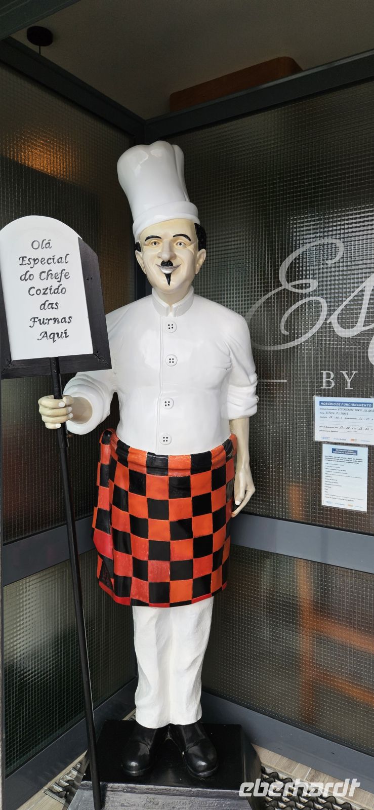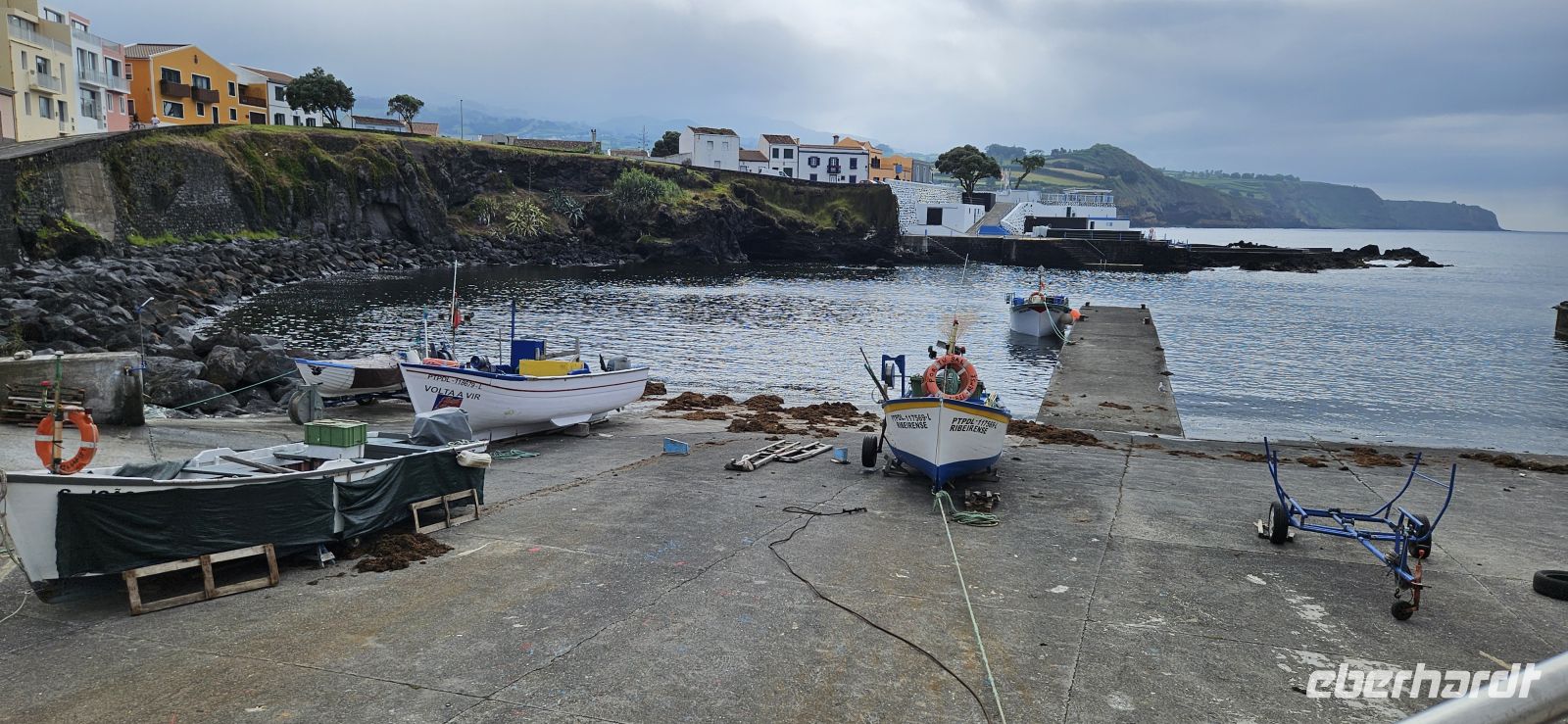 Unser heutiger Ausflug startete verspätet, da unser Reiseleiter Frederik krank war und kurzfristig Ersatz beschafft werden musste. Die örtliche Agentur schickte uns Tiago, der englisch sprach und ich übersetzte. Wir fuhren direkt an der Südküste entlang und machten dann einen schönen Spaziergang auf einem neu angelegten Küstenweg nach Lagoa. An der Stelle des heutigen Hafens brachte man zu Beginn des 15.Jahrhunderts Widderschafe an Land . Unser nächstes Ziel war die alte Keramik Fabrik, in der noch heute Handarbeit die Produktion bestimmt. Wir konnten den Frauen beim Modellieren an der Töpferscheibe zusehen und später wie die Gegenstände bemalt wurden mit pinkbrauner Farbe, die nach dem Brennen dann blau wird. Im Fabrik Verkauf gab es Gelegenheit, schon mal Mitbringsel für zu Hause zu erwerben. Bevor wir über die Insel zur Nordküste fuhren, legten wir am Strabd von Sao Roque eine Badepause ein. Der Strand sah recht friedlich aus und so trauten sich einige Singles zum Schwimmen oder nur mit den Füssen ins Wasser. Ich richtete derweilen eine Azoren Ananas her und die wurde dann von den Gästen probiert. Zwei große Wellen machten dem Badespass ein schnelles Ende und leider gab es auch eine Verletzte. Mit dem Bus fuhren wir dann nach Ribeira Grande an der Nordküste. Wir besuchten die Estrella Kirche und spazierten durch den Ort zum Rathaus, zur Likörverkostung und zu einer Schokoladen Manufaktur. Nach der Mittagspause fuhr ich mit der Verletzten nach Ponta Delgada zurück und die Gruppe setzte die Fahrt mit Tiago fort. Es ging mit dem Bus hinauf zum Aussichtspunkt auf den Fogo See und dann weiter zum Baroso Aussichtspunkt. Von dort schaut man zur Nordküste und zur Südküste. Wir hatten Glück und freie Sicht auf den Fogosee und die Küste. Am Ende des Ausfluges bedankten wir uns recht herzlich Tiago. Er war kurzfristig eingesprungen und hatte so unseren Ausflugstag "gerettet". Zum Abendesen trafen wir uns im STAGE direkt beim Hafen.