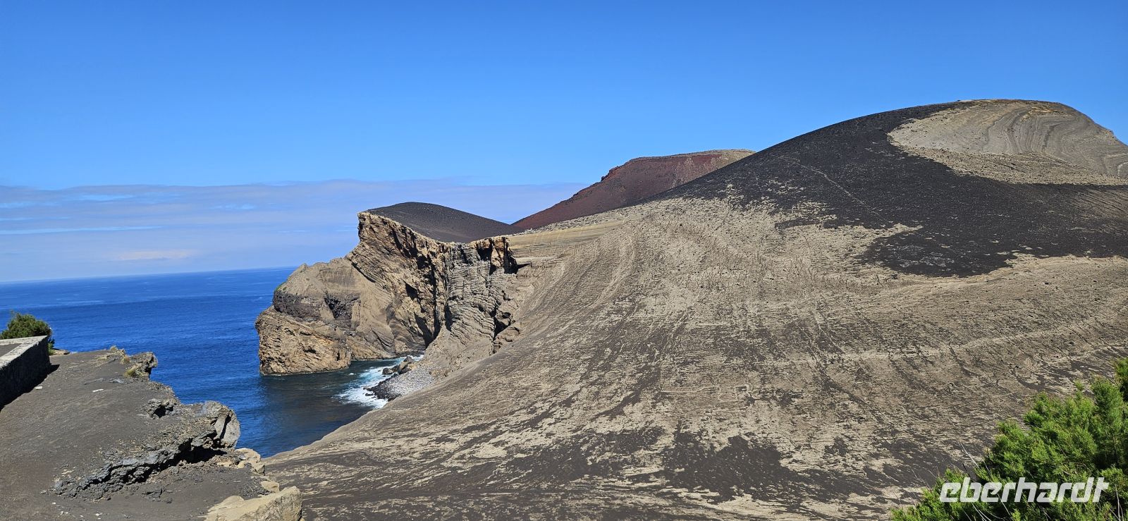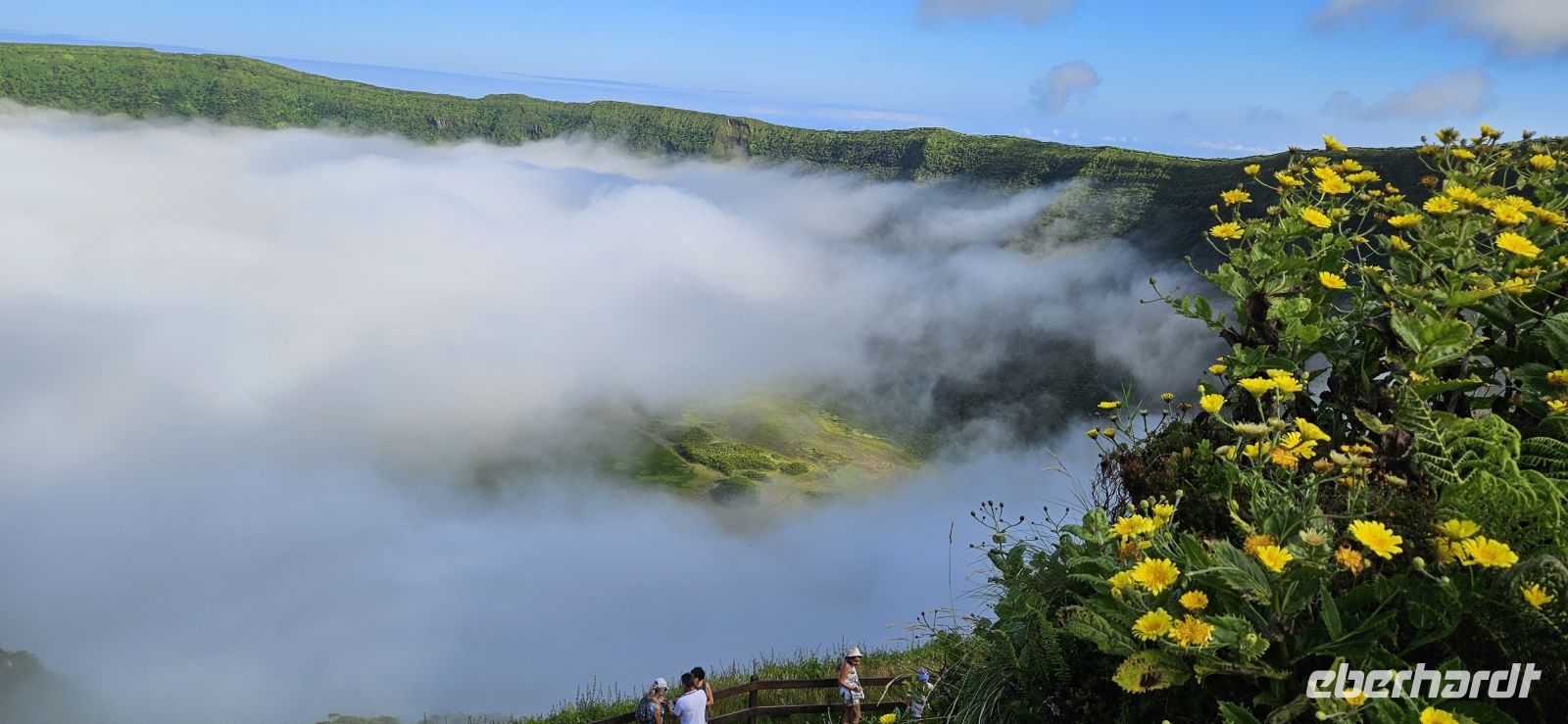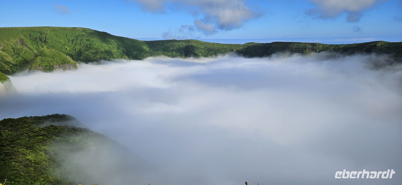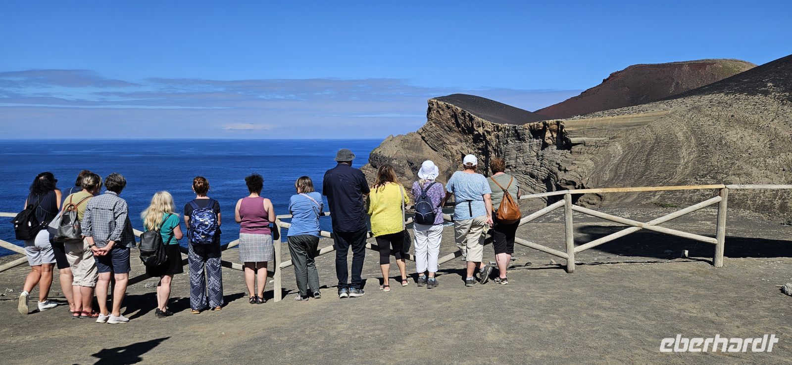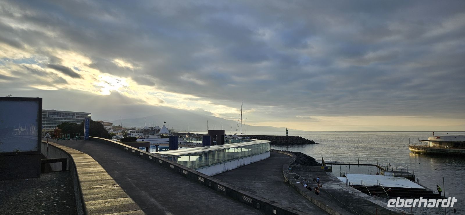 Das Frühstück im Hotel Horta war sehr gut und wenn man zeitig da war, konnte man auf der Terrasse mit Blick zum Pico frühstücken. 9 Uhr starteten wir zur Inselrundfahrt mit Eva. Zunächst fuhren wir hinauf auf einen Aussichtspunkt über der Stadt und genossen die Aussicht auf Horta, hinüber zum Pico, auf die Ostküste von Faial und bis hinauf zur Caldeira. Durch das Flamengos Tal führte die Strasse immer steil bergan bis zum Kraterrand der Caldeira. Der Kraterrand war völlig frei und lag in der Sonne. In der Caldeira hatten sich aber die Wolken gesammelt und so erschien der riesige Krater wie mit Schaum gefüllt. Ab und zu entstand ein kleines Fenster und gab den Blick frei bis zum Kraterboden. Unser nächstes Ziel war Capelinhos, dort wo ein Vulkanausbruch 1957/58 über 13 Monate ein neues Land entstehen ließ. Wir spazierten gemeinsam zum Leuchtturm und später ins Informations Zentrum. Der Vulkanausbruch veränderte das Leben der Menschen gewaltig. Viele verließen die Insel und wanderten nach Amerika aus. Einst war dort ein Hafen für den Walfang und die Walbeobachter waren auch die ersten, die den submarinen Ausbruch entdeckten. Heute ist beim ehemaligen Walfanghafen ein Schwimmbecken, wo man im Meereswasser schwimmen kann.
