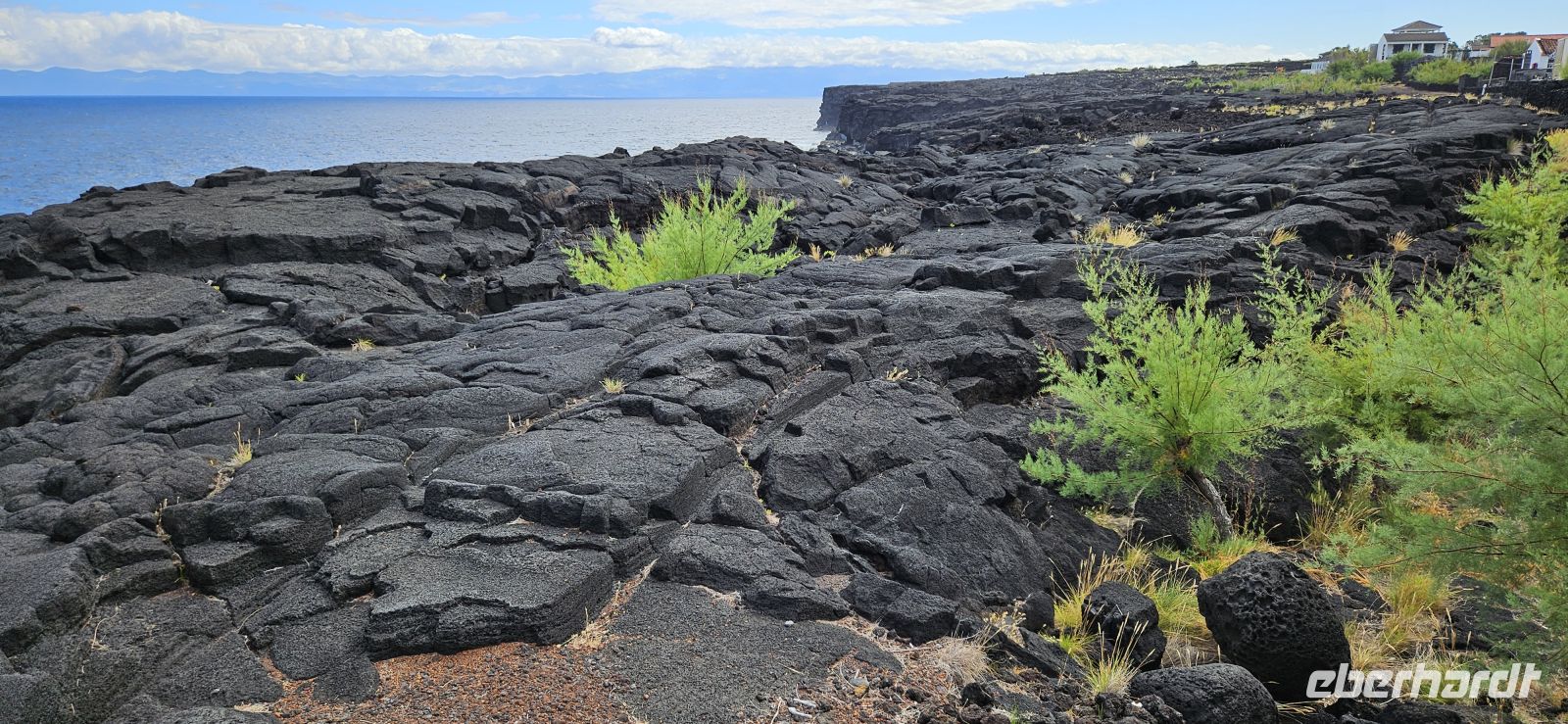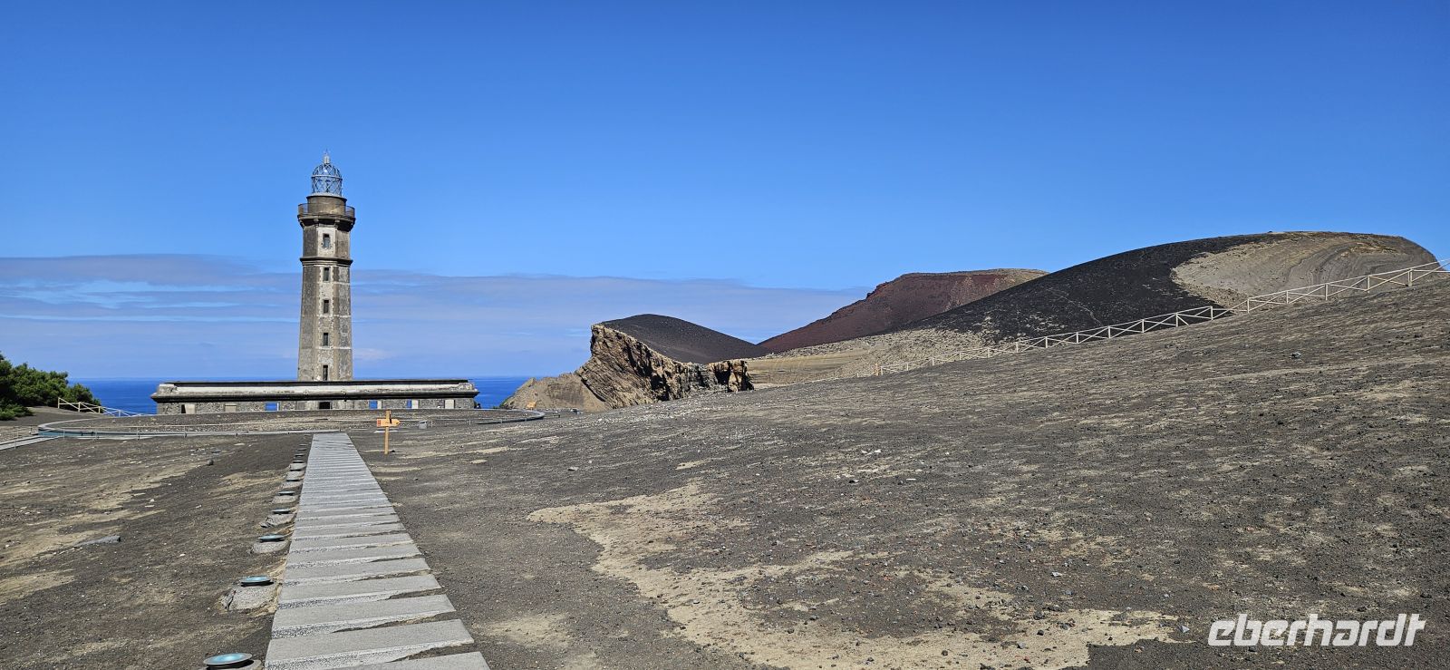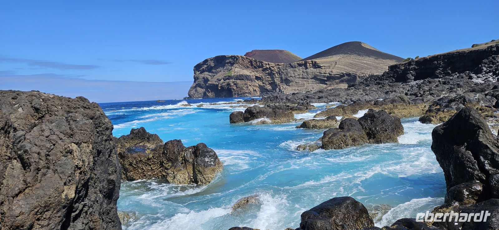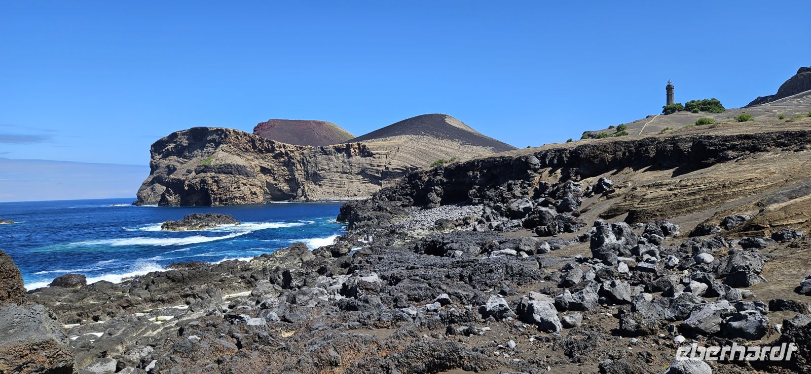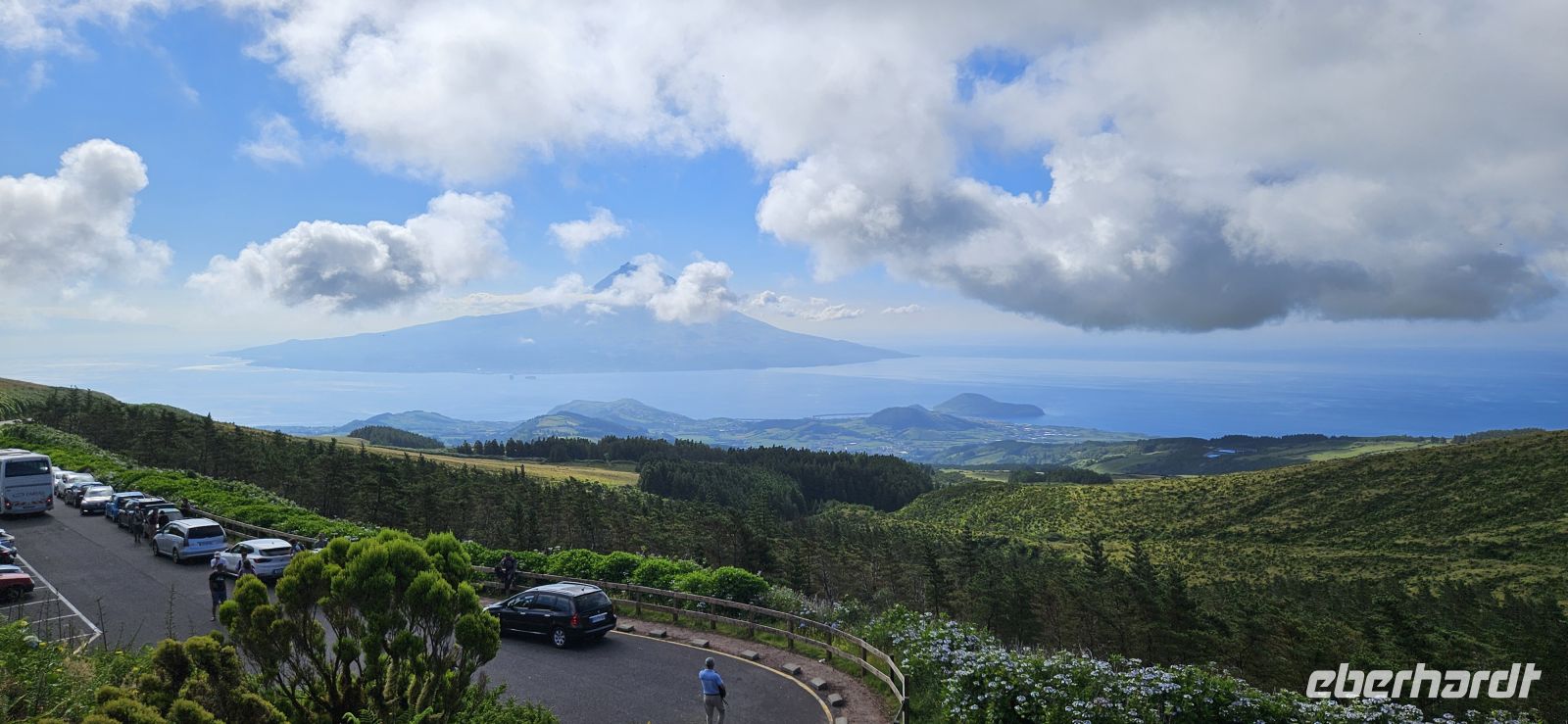 Das Frühstück im Hotel Horta war sehr gut und wenn man zeitig da war, konnte man auf der Terrasse mit Blick zum Pico frühstücken. 9 Uhr starteten wir zur Inselrundfahrt mit Eva. Zunächst fuhren wir hinauf auf einen Aussichtspunkt über der Stadt und genossen die Aussicht auf Horta, hinüber zum Pico, auf die Ostküste von Faial und bis hinauf zur Caldeira. Durch das Flamengos Tal führte die Strasse immer steil bergan bis zum Kraterrand der Caldeira. Der Kraterrand war völlig frei und lag in der Sonne. In der Caldeira hatten sich aber die Wolken gesammelt und so erschien der riesige Krater wie mit Schaum gefüllt. Ab und zu entstand ein kleines Fenster und gab den Blick frei bis zum Kraterboden. Unser nächstes Ziel war Capelinhos, dort wo ein Vulkanausbruch 1957/58 über 13 Monate ein neues Land entstehen ließ. Wir spazierten gemeinsam zum Leuchtturm und später ins Informations Zentrum. Der Vulkanausbruch veränderte das Leben der Menschen gewaltig. Viele verließen die Insel und wanderten nach Amerika aus. Einst war dort ein Hafen für den Walfang und die Walbeobachter waren auch die ersten, die den submarinen Ausbruch entdeckten. Heute ist beim ehemaligen Walfanghafen ein Schwimmbecken, wo man im Meereswasser schwimmen kann.
