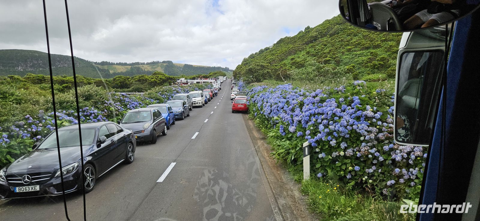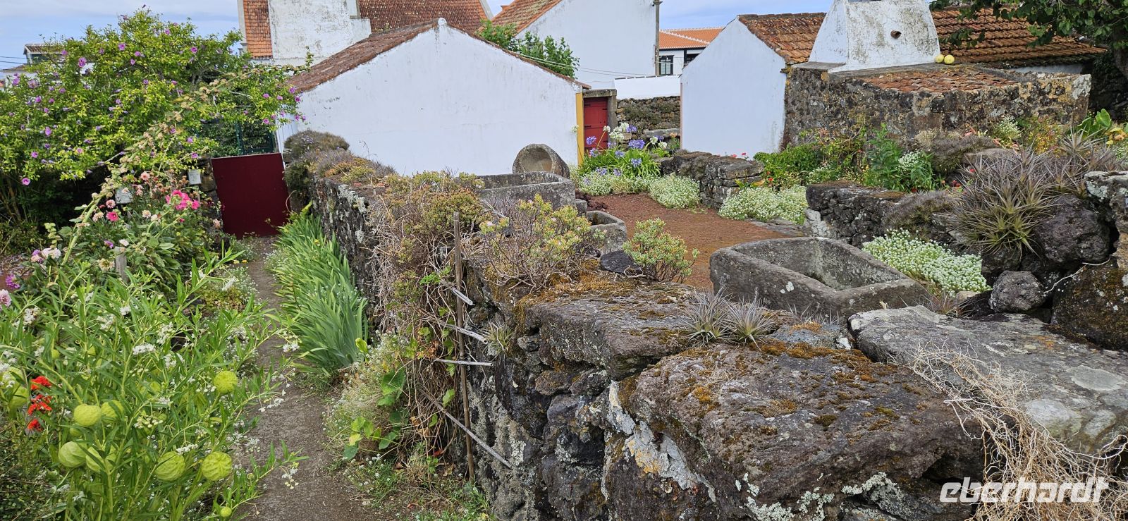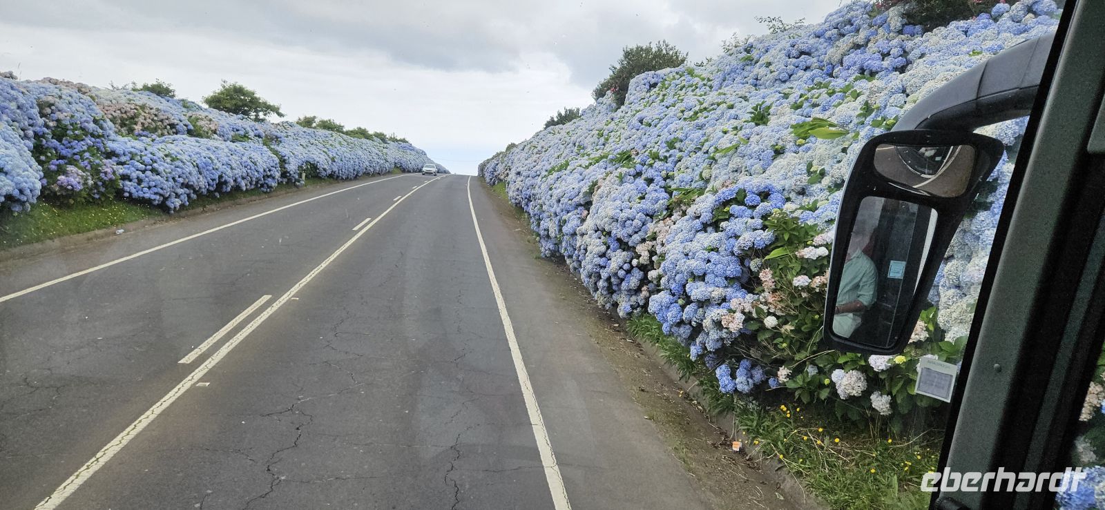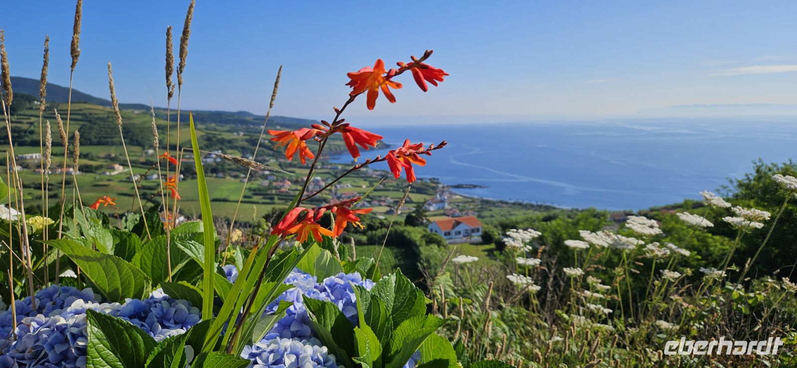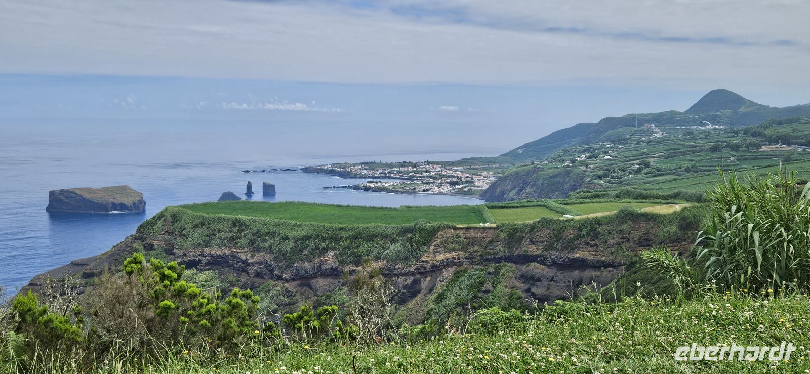 Frederik war wieder zurück und so starteten wir pünktlich zu unserem letzten Ausflug auf der Insel Sao Miguel. Vorbei am Flughafen fuhren wir stetig bergan und hatten bald einen Aussichtspunkt mit guter Sicht auf die Nordküste erreicht. Über mit Hortensien gesäumte Strassen gelangten wir auf den Kraterrand und zum Aussichtspunkt des Königs - Vista do Rei. Von dort oben blickt man in die riesige Caldeira mit dem grünen und blauen See und zur Ortschaft Sete Cidades. Wir hatten wieder Glück und konnten dieses Postkarten Motiv selbst einfangen. Beim Hinunterfahren machten wir noch einen Stopp am Santiago See und auf der Brücke zwischen den beiden Seen. In Sete Cidades am Ufer des blauen Sees legten wir eine Pause ein und probierten den für Portugal bekannten grünen Wein, einen frischen leichten Sommerwein. Dazu gab es verschiedene Knabbereien. Danach war Zeit, den kleinen Ort und die Kirche von Sete Cidades zu erkunden. Auf der Weiterfahrt gab es einen Fotostopp mit Blick auf Mosteiros und die vorgelagerten Felsen im Meer. Dieses Motiv sahen wir dann einen Tag später auf dem Flug von Ponta Delgada nach Horta noch einmal. Nun folgten wir der Strasse um die Nordwest Spitze der Insel Sao Miguel bis nach Capelas zur Mittagspause. Anschließend besuchten wir das Museum in Capelas - eine Sammlung von allem ! Viele erkannten Dinge aus der Kindheit und Frauen webten dort an alten Webstühlen ganz praktische Dinge - wieder eine Gelegenheit zum Einkaufen. Am Stadtrand von Ponta Delgada erreichten wir eine der größeren Ananas Plantagen und dort war man auf Besuchergruppen gut vorbereitet. Frederik konnte uns die einzelnen Schritte der Ananas Vermehrung aus einer Wurzel, die Pflanzung, das Ausräuchern und das Heranwachsen der Früchte gut erklären. Auch waren zwei Gewächshäuser für Besucher geöffnet. Anschließend probierten wir einen Ananas Likör sowie Ananas Marmelade. Es gab aber auch Ananas Eis und vieles mehr zu probieren und zu kaufen. Dann hatten die Gäste die Möglichkeit mit dem Bus zurück ins Hotel zu fahren oder mit Frederik und mir noch den Botanischen Garten kurz zu besuchen und zu Fuss durch die Stadt zurück ins Hotel zu gehen. Das Abendessen nahmen wir noch einmal im Restaurant Momentos ein an einem langen Tisch im Freien.