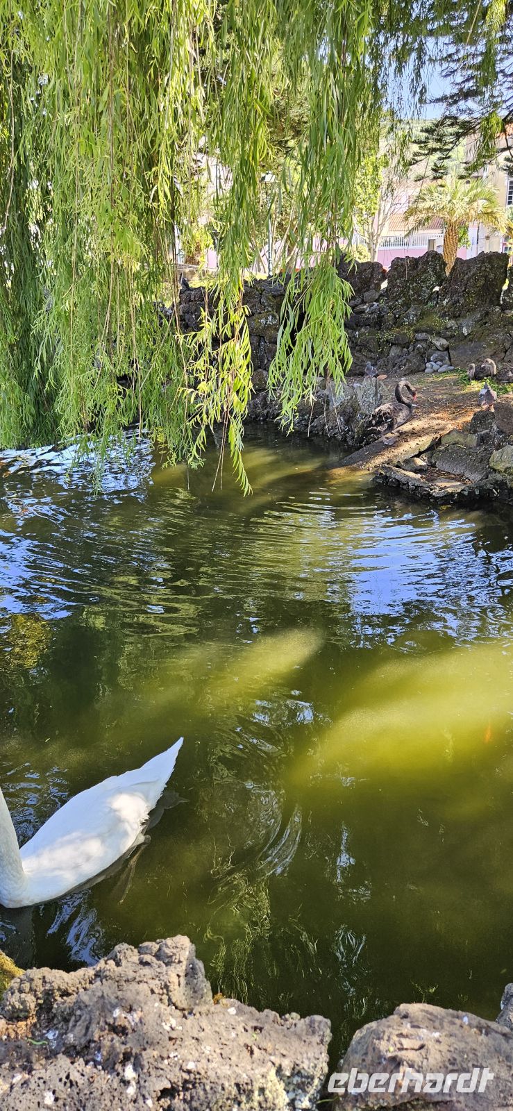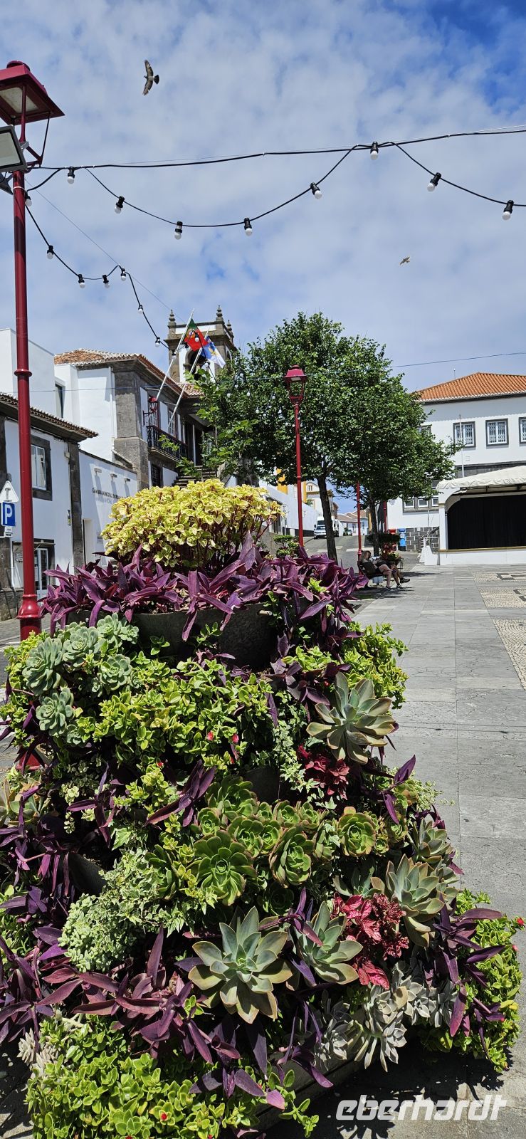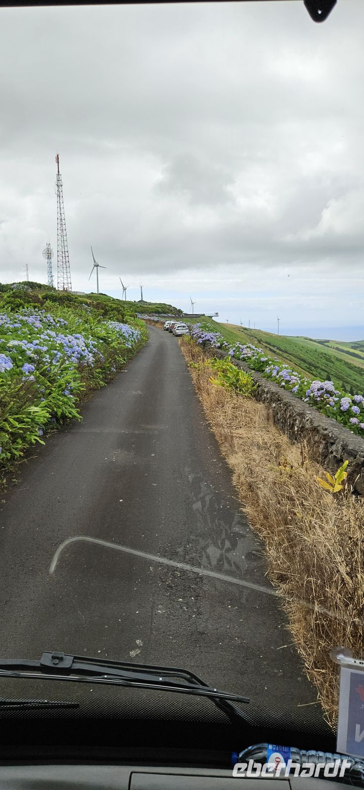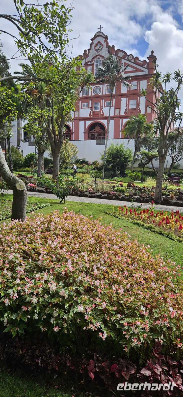 Frederik war wieder zurück und so starteten wir pünktlich zu unserem letzten Ausflug auf der Insel Sao Miguel. Vorbei am Flughafen fuhren wir stetig bergan und hatten bald einen Aussichtspunkt mit guter Sicht auf die Nordküste erreicht. Über mit Hortensien gesäumte Strassen gelangten wir auf den Kraterrand und zum Aussichtspunkt des Königs - Vista do Rei. Von dort oben blickt man in die riesige Caldeira mit dem grünen und blauen See und zur Ortschaft Sete Cidades. Wir hatten wieder Glück und konnten dieses Postkarten Motiv selbst einfangen. Beim Hinunterfahren machten wir noch einen Stopp am Santiago See und auf der Brücke zwischen den beiden Seen. In Sete Cidades am Ufer des blauen Sees legten wir eine Pause ein und probierten den für Portugal bekannten grünen Wein, einen frischen leichten Sommerwein. Dazu gab es verschiedene Knabbereien. Danach war Zeit, den kleinen Ort und die Kirche von Sete Cidades zu erkunden. Auf der Weiterfahrt gab es einen Fotostopp mit Blick auf Mosteiros und die vorgelagerten Felsen im Meer. Dieses Motiv sahen wir dann einen Tag später auf dem Flug von Ponta Delgada nach Horta noch einmal. Nun folgten wir der Strasse um die Nordwest Spitze der Insel Sao Miguel bis nach Capelas zur Mittagspause. Anschließend besuchten wir das Museum in Capelas - eine Sammlung von allem ! Viele erkannten Dinge aus der Kindheit und Frauen webten dort an alten Webstühlen ganz praktische Dinge - wieder eine Gelegenheit zum Einkaufen. Am Stadtrand von Ponta Delgada erreichten wir eine der größeren Ananas Plantagen und dort war man auf Besuchergruppen gut vorbereitet. Frederik konnte uns die einzelnen Schritte der Ananas Vermehrung aus einer Wurzel, die Pflanzung, das Ausräuchern und das Heranwachsen der Früchte gut erklären. Auch waren zwei Gewächshäuser für Besucher geöffnet. Anschließend probierten wir einen Ananas Likör sowie Ananas Marmelade. Es gab aber auch Ananas Eis und vieles mehr zu probieren und zu kaufen. Dann hatten die Gäste die Möglichkeit mit dem Bus zurück ins Hotel zu fahren oder mit Frederik und mir noch den Botanischen Garten kurz zu besuchen und zu Fuss durch die Stadt zurück ins Hotel zu gehen. Das Abendessen nahmen wir noch einmal im Restaurant Momentos ein an einem langen Tisch im Freien.