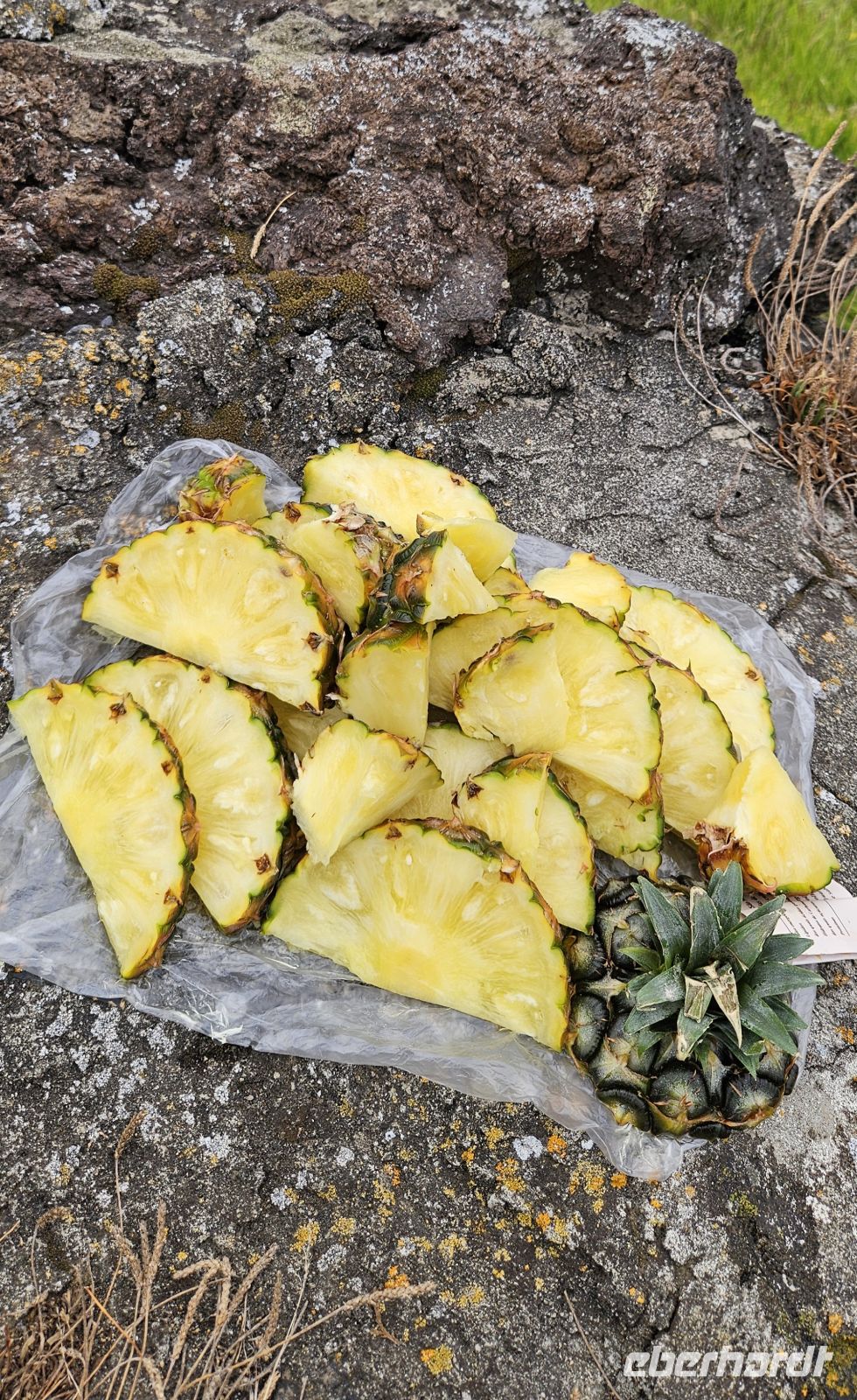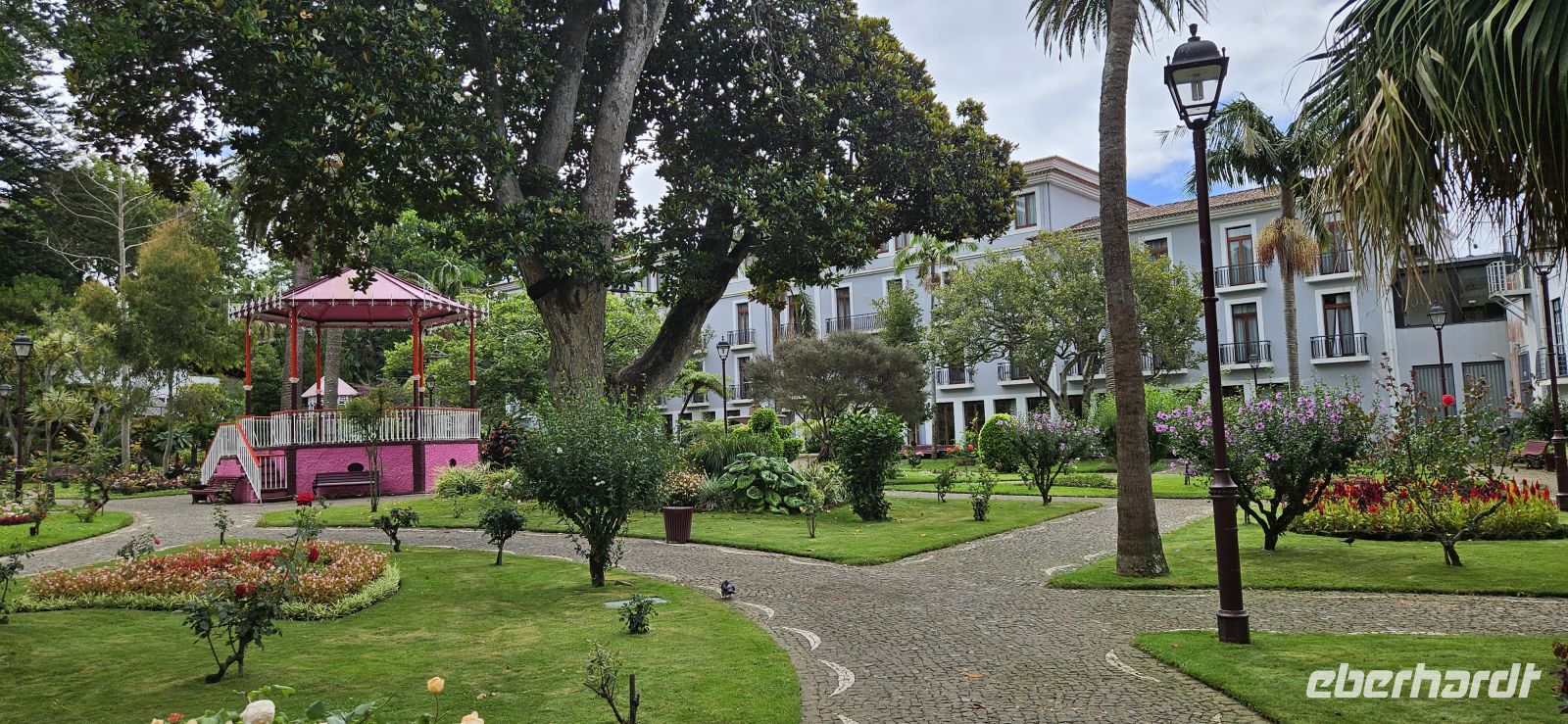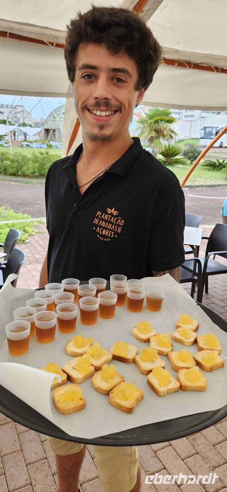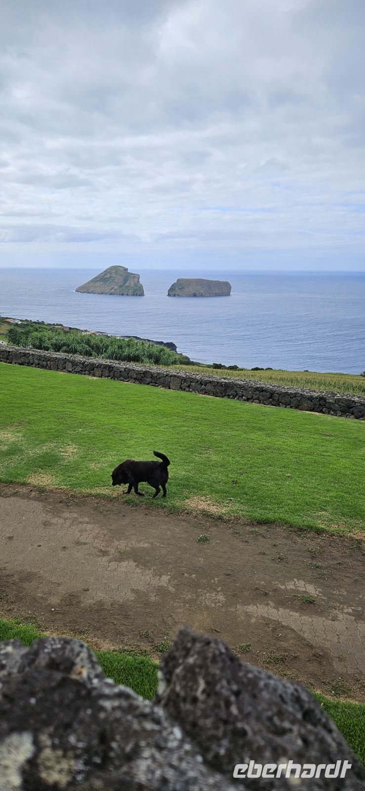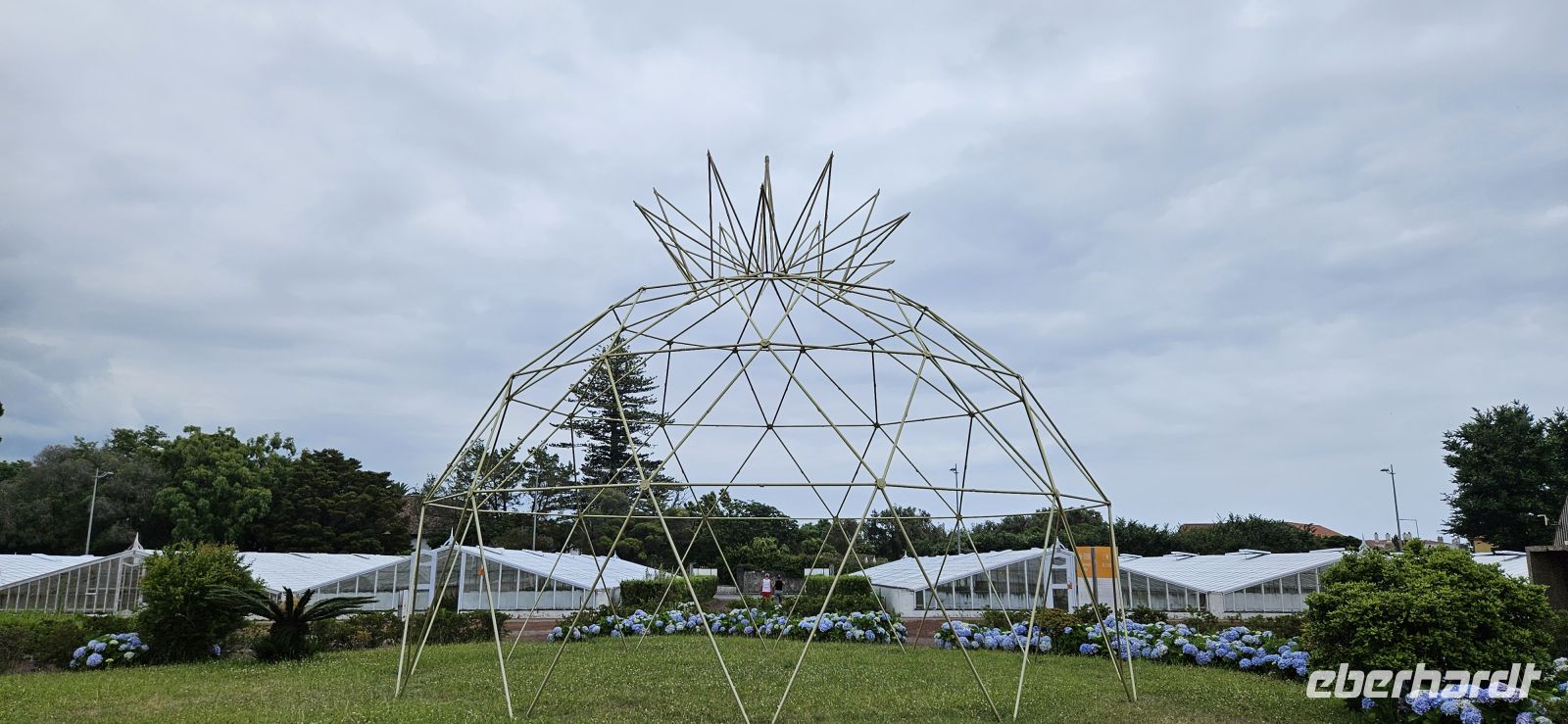 Frederik war wieder zurück und so starteten wir pünktlich zu unserem letzten Ausflug auf der Insel Sao Miguel. Vorbei am Flughafen fuhren wir stetig bergan und hatten bald einen Aussichtspunkt mit guter Sicht auf die Nordküste erreicht. Über mit Hortensien gesäumte Strassen gelangten wir auf den Kraterrand und zum Aussichtspunkt des Königs - Vista do Rei. Von dort oben blickt man in die riesige Caldeira mit dem grünen und blauen See und zur Ortschaft Sete Cidades. Wir hatten wieder Glück und konnten dieses Postkarten Motiv selbst einfangen. Beim Hinunterfahren machten wir noch einen Stopp am Santiago See und auf der Brücke zwischen den beiden Seen. In Sete Cidades am Ufer des blauen Sees legten wir eine Pause ein und probierten den für Portugal bekannten grünen Wein, einen frischen leichten Sommerwein. Dazu gab es verschiedene Knabbereien. Danach war Zeit, den kleinen Ort und die Kirche von Sete Cidades zu erkunden. Auf der Weiterfahrt gab es einen Fotostopp mit Blick auf Mosteiros und die vorgelagerten Felsen im Meer. Dieses Motiv sahen wir dann einen Tag später auf dem Flug von Ponta Delgada nach Horta noch einmal. Nun folgten wir der Strasse um die Nordwest Spitze der Insel Sao Miguel bis nach Capelas zur Mittagspause. Anschließend besuchten wir das Museum in Capelas - eine Sammlung von allem ! Viele erkannten Dinge aus der Kindheit und Frauen webten dort an alten Webstühlen ganz praktische Dinge - wieder eine Gelegenheit zum Einkaufen. Am Stadtrand von Ponta Delgada erreichten wir eine der größeren Ananas Plantagen und dort war man auf Besuchergruppen gut vorbereitet. Frederik konnte uns die einzelnen Schritte der Ananas Vermehrung aus einer Wurzel, die Pflanzung, das Ausräuchern und das Heranwachsen der Früchte gut erklären. Auch waren zwei Gewächshäuser für Besucher geöffnet. Anschließend probierten wir einen Ananas Likör sowie Ananas Marmelade. Es gab aber auch Ananas Eis und vieles mehr zu probieren und zu kaufen. Dann hatten die Gäste die Möglichkeit mit dem Bus zurück ins Hotel zu fahren oder mit Frederik und mir noch den Botanischen Garten kurz zu besuchen und zu Fuss durch die Stadt zurück ins Hotel zu gehen. Das Abendessen nahmen wir noch einmal im Restaurant Momentos ein an einem langen Tisch im Freien.