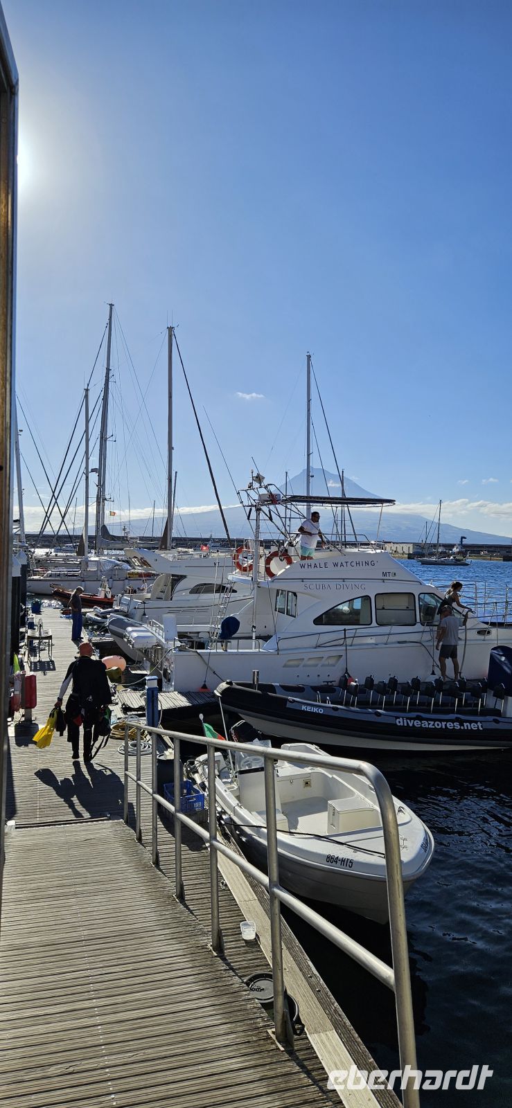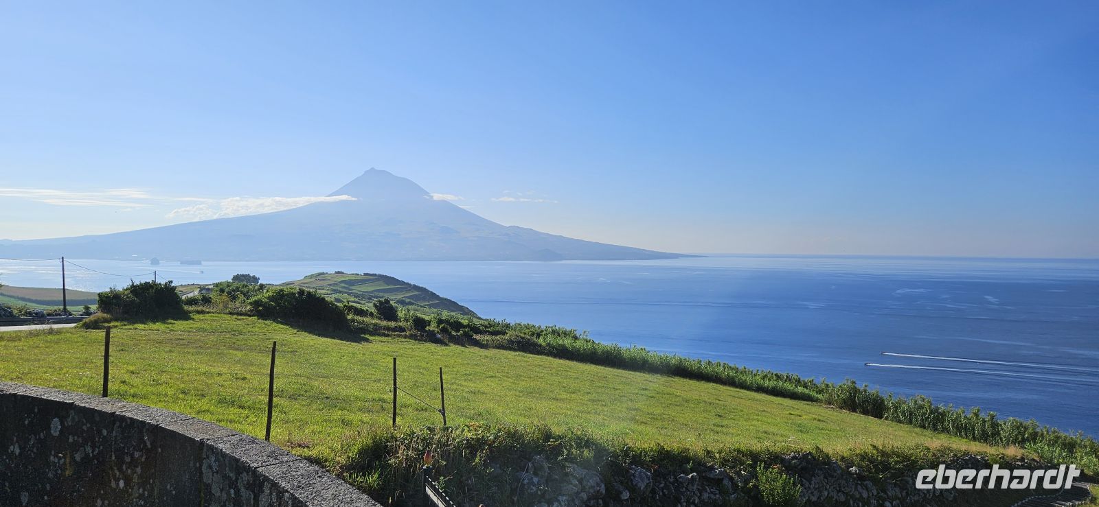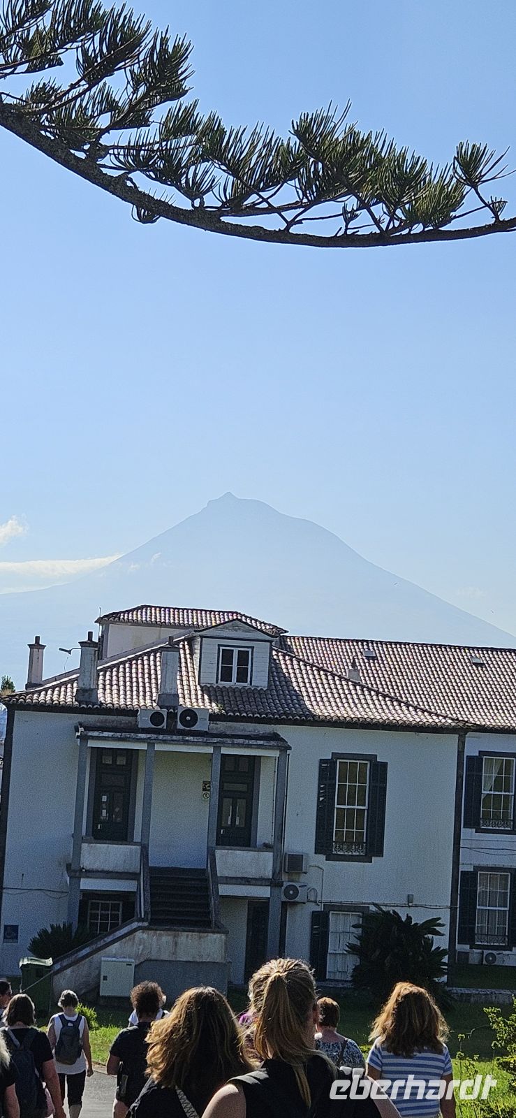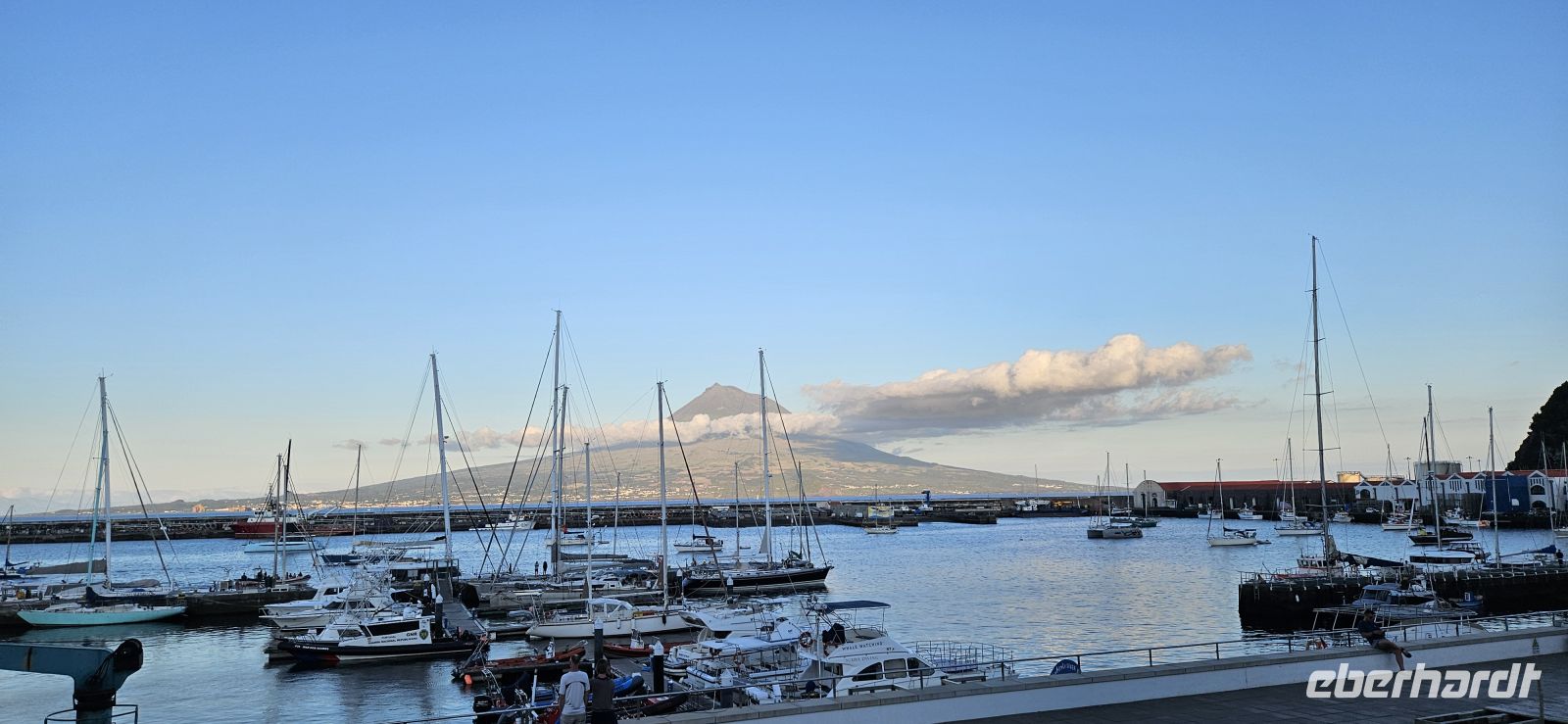 Sehr sehr früh mussten wir Aufstehen und es gab sogar schon Frühstück im Hotel. Mit gepackten Koffern fuhren wir zum Flughafen und verabschiedeten uns dort von Frederik und unserem Fahrer. Ganz pünktlich hob die kleine Propeller Maschine ab und nach dem Start nahmen wir Abschied von Sao Miguel. Unterwegs sahen wir die Inseln Terceira und Sao Jorge und kurz vor der Landung den Pico Berg ganz nahe. Dann überflogen wir Horta und landeten ganz pünktlich. Am Flughafen erwartete uns Eva, die Reiseleiterin für Faial und Pico und mit ihr fuhren wir zum Hotel Horta. Wir gaben unsere Ausweise ab und stellten die Koffer ein. Mit leichtem Gepäck und sommerlicher Kleidung begannen wir unsere Stadtbesichtigung von Horta. Unser Weg führte vorbei am Parlamentsgebäude und durch die deutsche Siedlung bergab. Die großen Kabelgesellschaften unterhielten Ende des 19.Jahrhunderts bis in die 60er Jahre des vorigen Jahrhunderts Wohn- und Gesellschaftsgebäude für ihre Mitarbeiter in Horta. Im Haus mit der Uhr gab es eine Veranda für festliche Empfänge und Gesellschaftsabende. Diese Veranda schmücken wunderschöne Glasfenster, die in Köln hergestellt wurden. Wir besuchten die Veranda mit der kleinen Ausstellung.. Danach spazierten wir weiter bergab vorbei am ehemaligen Franziskaner Kloster, dem Bankgebäude zum großen Komplex der Jesuitenkirche mit Kloster. Heute ist diese Kirche die Hauptkirche von Horta und im Kloster ist das Stadtmuseum untergebracht. Weiter ging´s zum Gebäude der Freimaurer, zur ältesten Heiliggeist Kapelle der Insel und zum Platz der Republik. Ein Teich mit weißen und schwarzen Schwänen, riesige Araukaria Bäume, ein Pavillion und das alte Feuerwehrhaus säumen den Platz. Durch die Markthalle spazierten wir zurück und auf der neu gestalteten Uferpromenade erreichten wir schliesslich den Seglerhafen. Dort bewunderten wir die vielen von den Seglern gemalten Bilder. Schliesslich erreichten wir das legendäre Peter Cafe Sport Restaurant und da gab es einen Gin Tonic von der örtlichen Agentur. Wir blieben gleich dort auf der Terrasse für eine kurze Mittagspause und genossen die Aussicht über den Hafen hinüber zum Pico. Wer danach noch Kraft und Lust hatte, kam mit Eva und mir zum Porto Pim, zur Stadtkirche und durch die ehemalige amerikanische Siedlung, heute das Azoris Faial Hotel, zurück ins Hotel Horta. Unser Gepäck war bereits auf unseren Zimmern und so konnten die Koffer ausgepackt und ein wenig geruht werden. Der Pool im Garten des Hotels lud zum Schwimmen ein und vom Blick hinüber zum Pico konnte man eh nicht genug bekommen. Zum Abendessen gingen wir wieder hinunter in die Stadt und aßen vom heissen Stein.