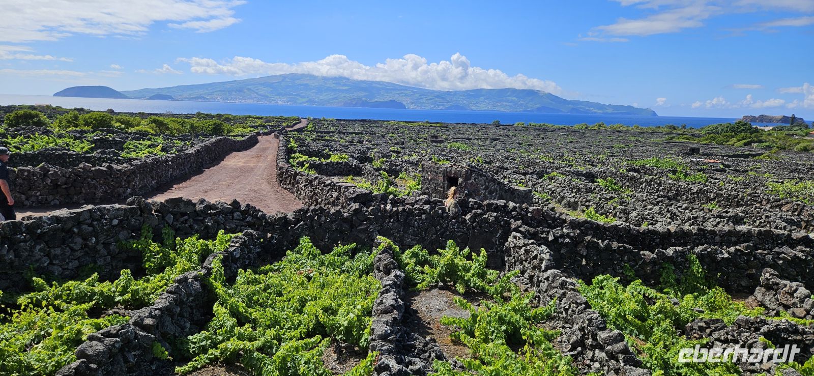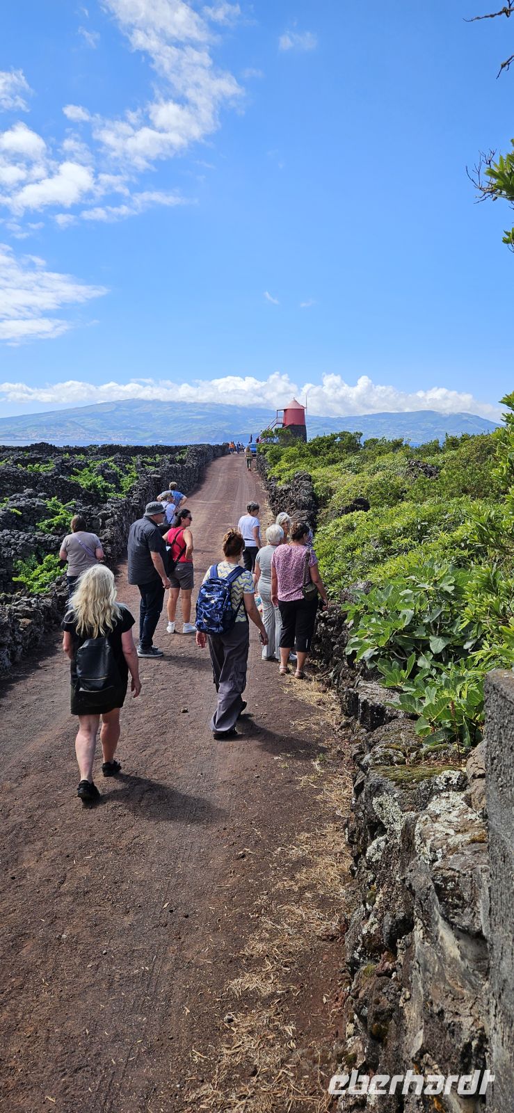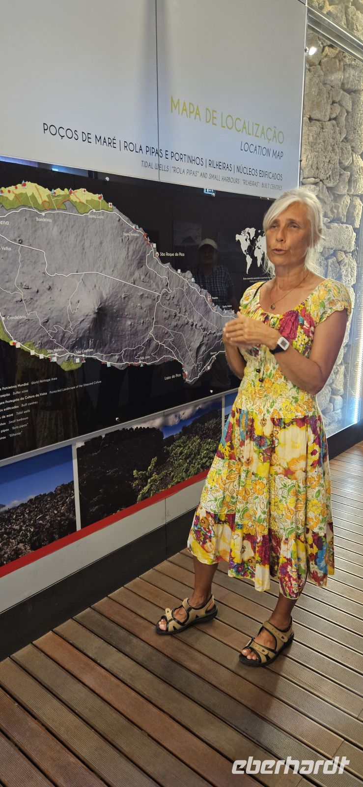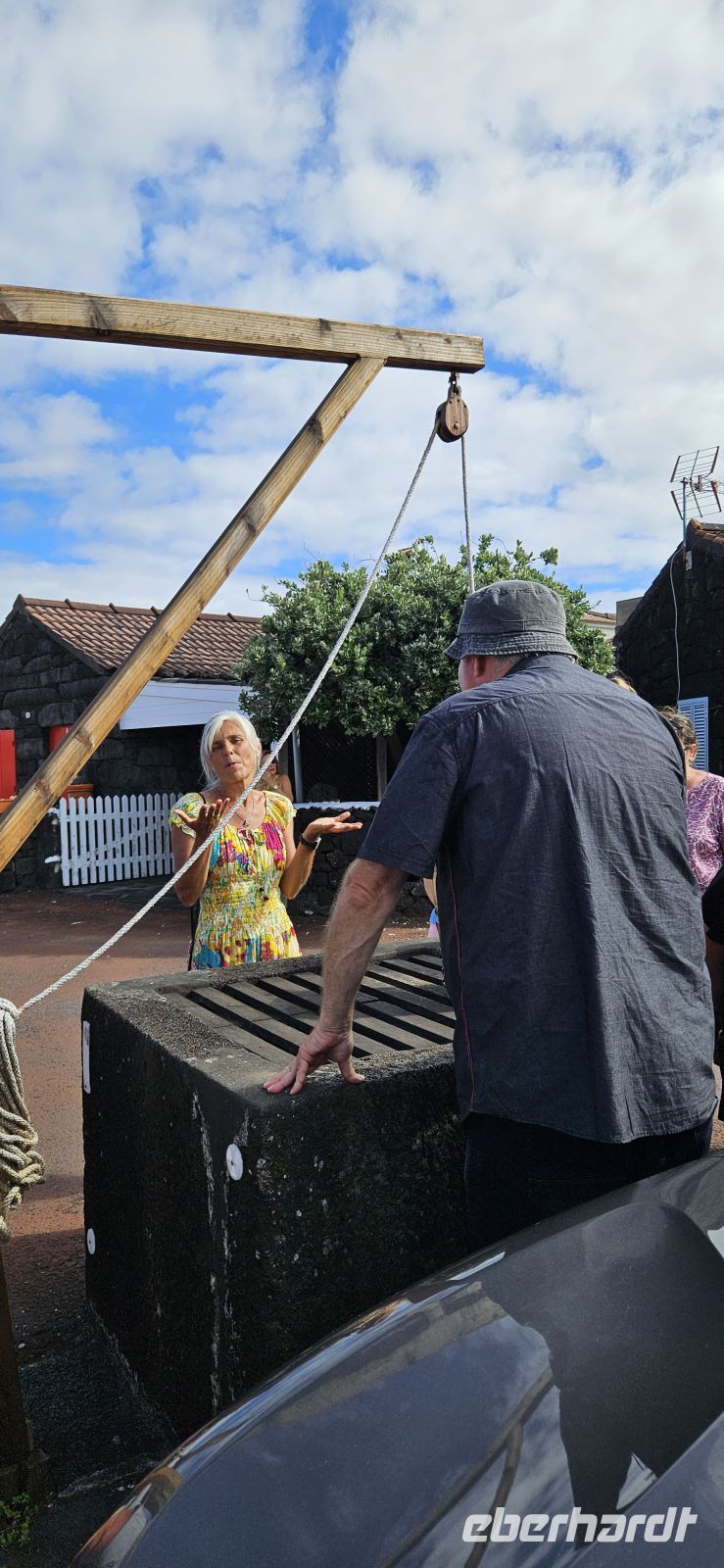 Ein Bus brachte uns das kurze Stück hinunter zum Fährhafen von Horta und mit der Fähre fuhren wir über den Kanal hinüber auf die Insel Pico. In Madalena angekommen wartete schon ein großer und geräumiger Bus auf uns zur Inselrundfahrt. Entlang der Nordküste erreichten wir Cachorro, was kleines Hündchen bedeutet. Und tatsächlich gibt es dort im Lavagestein ein kleines Hündchen zu bewundern. An der zerklüffteten Küste wurden einst die Weinfässer verladen und über Rollo Pipas zur Verladung ans Meer gerollt. Der Weinbau hat auf der Insel Pico eine lange Tradition. Da es aber keinen schiffbaren Hafen gab, mussten die Weinfässer mit kleinen Booten hinüber nach Horta gebracht werden und dort sassen die Händler, die das große Geld mit dem Wein verdienten. Auf Pico bekam man nur ca. 30 Prozent des verdienten Geldes. Unser nächster Stopp war im unweit entfernten LAJIDO. Dort sind viele der alten Häuser der Weinbauern zu Ferienhäuser umgenutzt worden und es gibt ein schönes Museum. Wir besuchten das Interpredationszentrum, einen Gezeitenbrunnen und eine Schnapsbrennerei. Und wir spazierten zur Küste, wo im Lavagestein noch die Wagenspuren der Räder zum Weintransport zu sehen waren. Überall an der Küste wächst Meerfenchel, der sich gut in Salaten verarbeiten lässt oder auch pur genascht werden kann. Vorbei am Flughafen fuhren wir weiter nach Sao Roque und besuchten kurz die Vogelfelsen an einem Natur Schwimmbad. Wagemutige junge Männer kletterten verbotenerweise auf diese Felsen und sprangen von da oben ins Meer. Dann endlich war es Zeit für die Mittagspause in der Adega A Buraca. Uns erwartete eine Weinprobe mit frisch gebackenem Maisweizenmehl Brot, Käse, Blutwurst und Chorizo. Wir probierten 3 Weine und zum Schluss noch einen Schnaps oder Likör. Die Weiterfahrt mit dem Bus ging von der Nordküste durch die Inselmitte zur Südküste nach Lajes. Wir besuchten das Walfangmuseum und sahen einen eindrucksvollen Film über die Waljagd und die Verarbeitung der Wale. Zum Schluss unseres Ausfluges auf der Insel Pico wanderten wir durch das UNESCO Weinanbaugebiet. Hier wird der Wein in kleinen Mulden geschützt von Vulkangesteinsmauern gepflanzt. Die Mauern schützen vor Wind und der Meeresgischt, speichern die Wärme tags und geben sie nachts wieder ab. Eine kleine rekonstruierte Windmühle sahen wir unterwegs und bei den Meerwasserbecken holte uns der Bus wieder ab und brachte uns zurück zum Fährhafen in Madalena. Mit der Fähre fuhren wir zurück nach Horta.