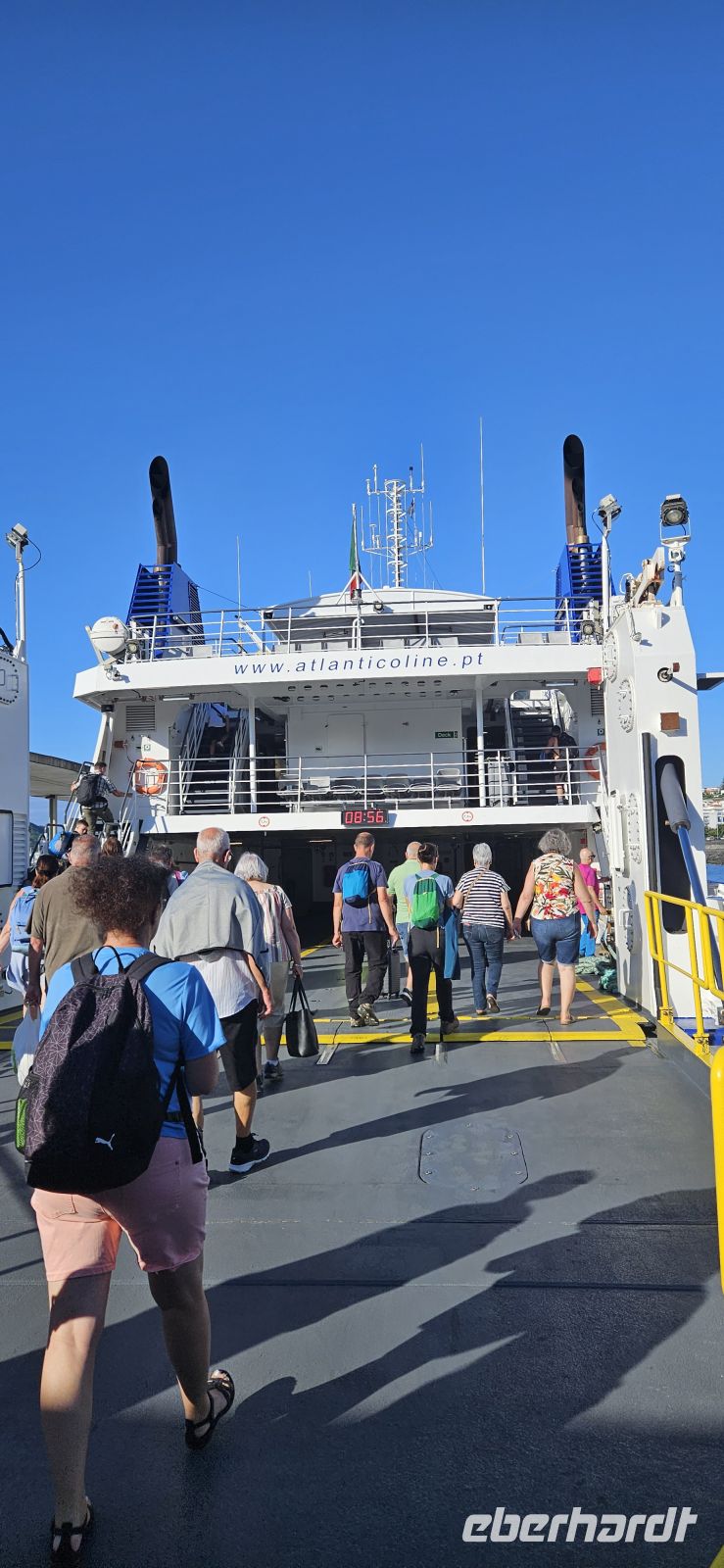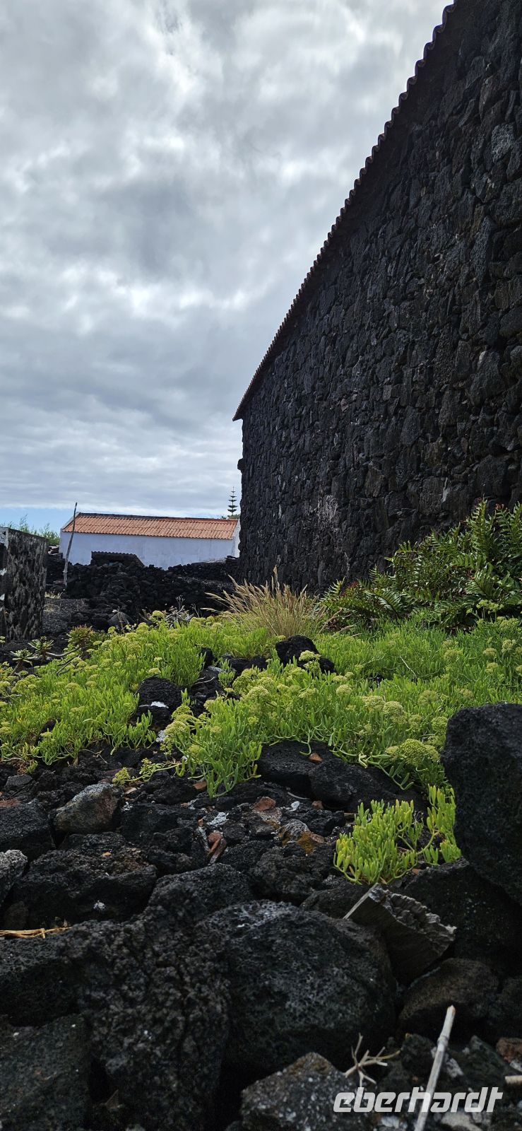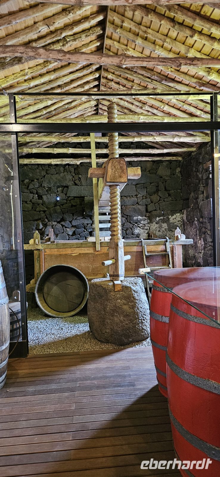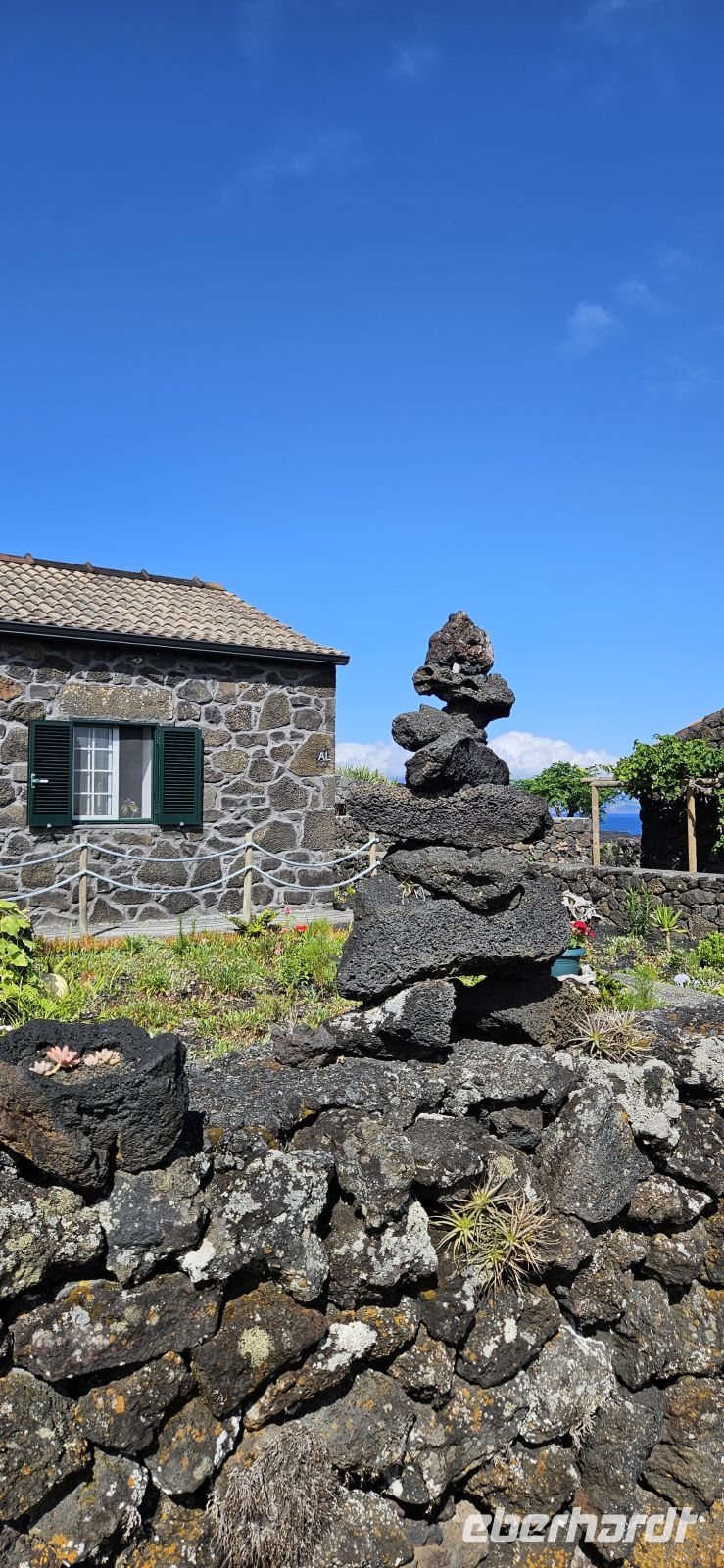 Ein Bus brachte uns das kurze Stück hinunter zum Fährhafen von Horta und mit der Fähre fuhren wir über den Kanal hinüber auf die Insel Pico. In Madalena angekommen wartete schon ein großer und geräumiger Bus auf uns zur Inselrundfahrt. Entlang der Nordküste erreichten wir Cachorro, was kleines Hündchen bedeutet. Und tatsächlich gibt es dort im Lavagestein ein kleines Hündchen zu bewundern. An der zerklüffteten Küste wurden einst die Weinfässer verladen und über Rollo Pipas zur Verladung ans Meer gerollt. Der Weinbau hat auf der Insel Pico eine lange Tradition. Da es aber keinen schiffbaren Hafen gab, mussten die Weinfässer mit kleinen Booten hinüber nach Horta gebracht werden und dort sassen die Händler, die das große Geld mit dem Wein verdienten. Auf Pico bekam man nur ca. 30 Prozent des verdienten Geldes. Unser nächster Stopp war im unweit entfernten LAJIDO. Dort sind viele der alten Häuser der Weinbauern zu Ferienhäuser umgenutzt worden und es gibt ein schönes Museum. Wir besuchten das Interpredationszentrum, einen Gezeitenbrunnen und eine Schnapsbrennerei. Und wir spazierten zur Küste, wo im Lavagestein noch die Wagenspuren der Räder zum Weintransport zu sehen waren. Überall an der Küste wächst Meerfenchel, der sich gut in Salaten verarbeiten lässt oder auch pur genascht werden kann. Vorbei am Flughafen fuhren wir weiter nach Sao Roque und besuchten kurz die Vogelfelsen an einem Natur Schwimmbad. Wagemutige junge Männer kletterten verbotenerweise auf diese Felsen und sprangen von da oben ins Meer. Dann endlich war es Zeit für die Mittagspause in der Adega A Buraca. Uns erwartete eine Weinprobe mit frisch gebackenem Maisweizenmehl Brot, Käse, Blutwurst und Chorizo. Wir probierten 3 Weine und zum Schluss noch einen Schnaps oder Likör. Die Weiterfahrt mit dem Bus ging von der Nordküste durch die Inselmitte zur Südküste nach Lajes. Wir besuchten das Walfangmuseum und sahen einen eindrucksvollen Film über die Waljagd und die Verarbeitung der Wale. Zum Schluss unseres Ausfluges auf der Insel Pico wanderten wir durch das UNESCO Weinanbaugebiet. Hier wird der Wein in kleinen Mulden geschützt von Vulkangesteinsmauern gepflanzt. Die Mauern schützen vor Wind und der Meeresgischt, speichern die Wärme tags und geben sie nachts wieder ab. Eine kleine rekonstruierte Windmühle sahen wir unterwegs und bei den Meerwasserbecken holte uns der Bus wieder ab und brachte uns zurück zum Fährhafen in Madalena. Mit der Fähre fuhren wir zurück nach Horta.