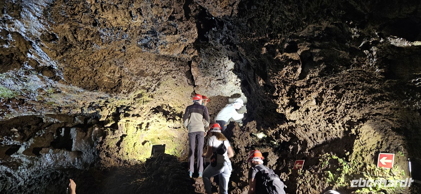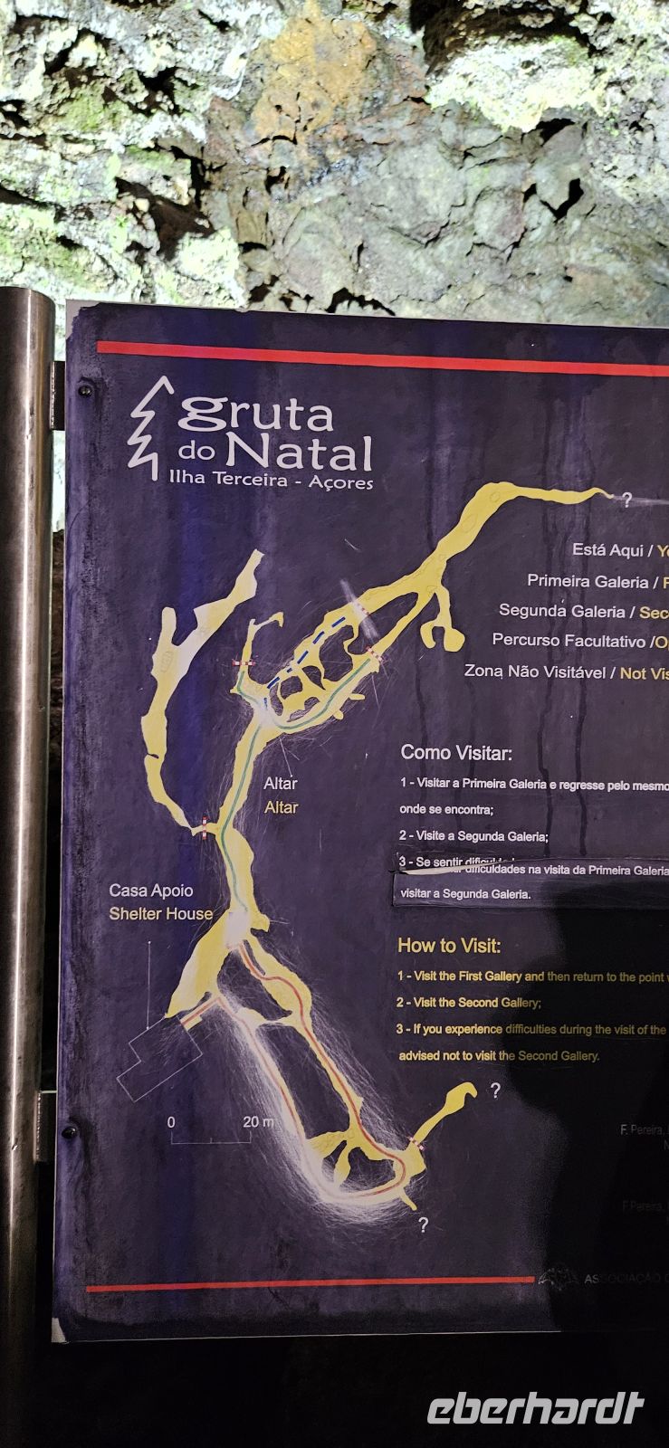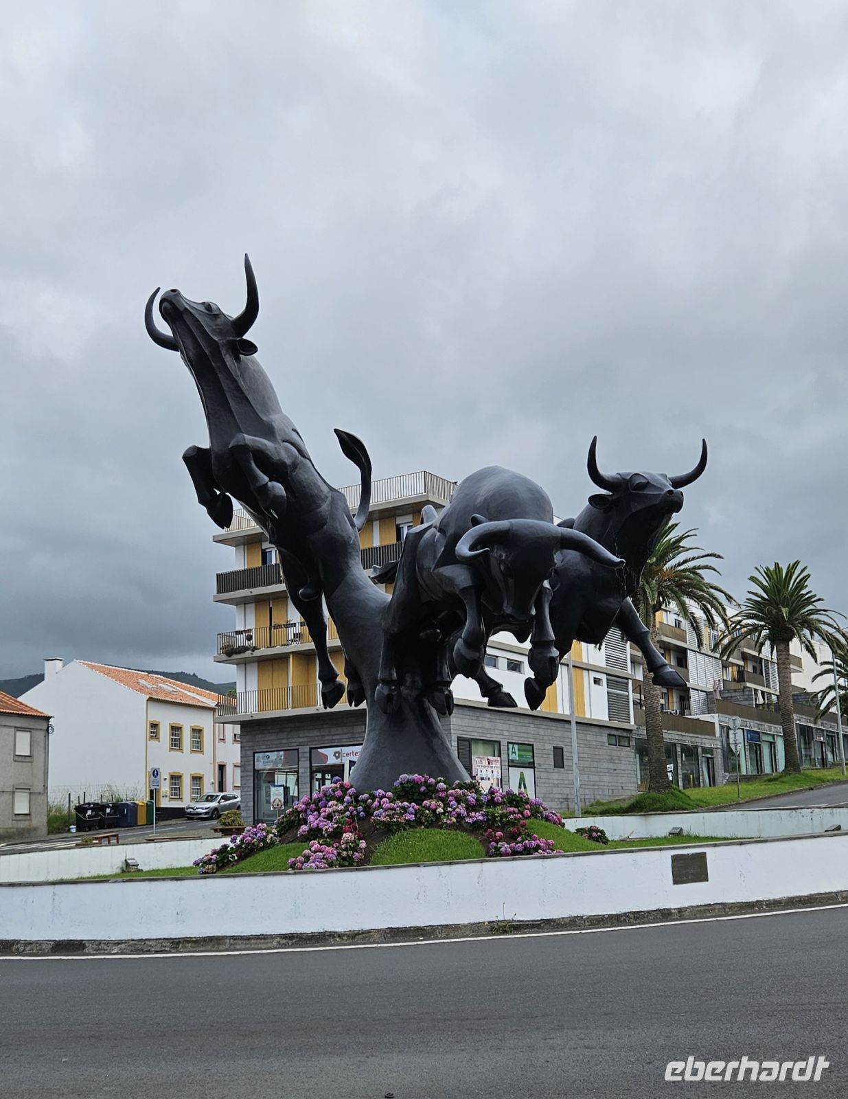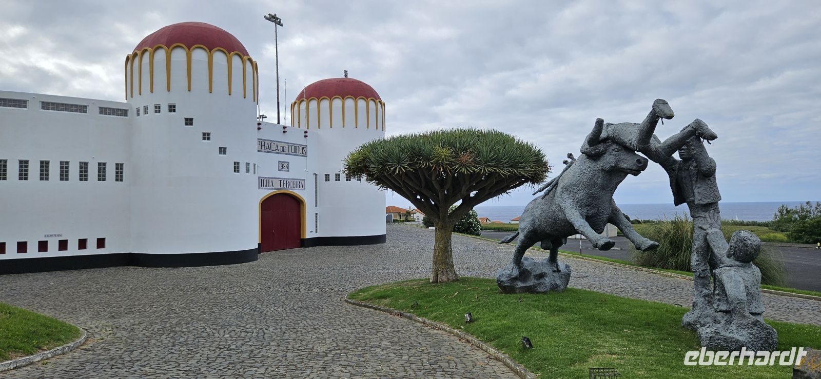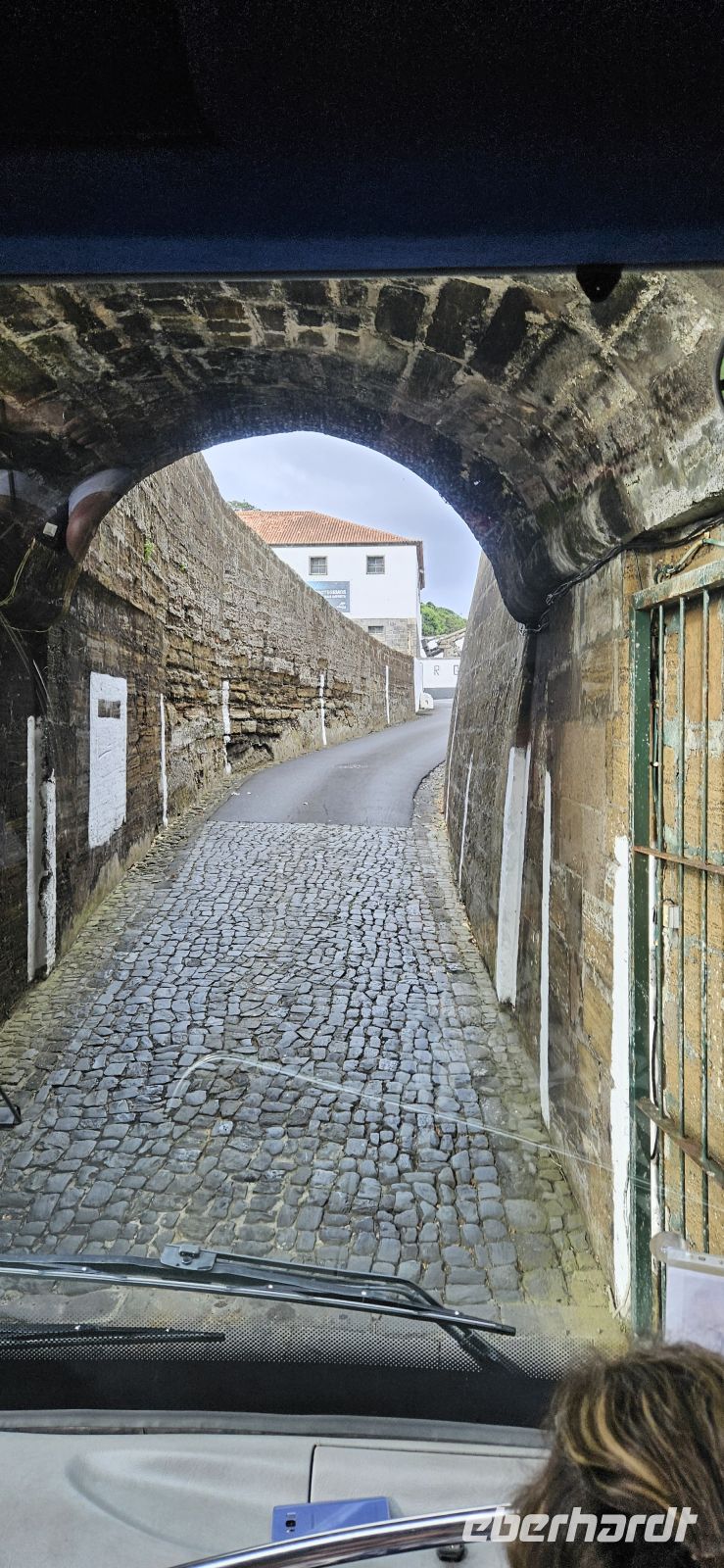 Wer bei offenem Fenster geschlafen hatte, hörte in der Nacht die Schreie der Gelbschnabelsturmtaucher, die an der Küste vorm Hotel brüteten. Das Frühstück im Hotel ließ keine Wünsche offen und so konnten wir gut gestärkt zu unserer Inselrundfahrt 9 Uhr starten. Zunächst fuhren wir mit dem Bus auf den Monte Brasil, den wir schon von unserem Hotel aus bewundert hatten. Die Einfahrt durch das Festungstor war Millimeter Sache, aber unser Busfahrer machte das ja nicht zum ersten Mal. Oben am Aussichtspunkt bei der Säule, die zur 500 Jahrfeier der Besiedlung von Terceira errichtet wurde, hatte man eine wunderbare Aussicht auf die Stadt Angra, den Santa Barbara Krater mit dem höchsten Punkt der Inseln sowie zu den Ziegeninseln und bei klarer Sicht bis zu den Inseln Sao Jorge und Pico. Der Monte Brasil hat 4 Gipfel auf dem Caldeira Rand und kann von Angra aus auch gut bewandert werden. Wir aber fuhren mit unserem Bus wieder hinunter, dann durch die Stadtmitte von Angra und bei der Stierkampfarena gab es wieder einen Fotostopp. Beim Stierkampf auf den Azoren wird der Stier nicht getötet, sondern er "spielt" mit seinen menschlichen Angreifern und verletzt sie zuweilen auch mal schwer. Immer dicht an der Südküste fuhren wir weiter gen Osten und erreichten die Salga Bucht, wo die Spanier mit Hilfe der Stiere der Insel in die Flucht geschlagen wurden. Unser nächster Stopp war in Sao Sebastiano, wo wir die Kirche und eine der schönsten Heiliggeist Kapellen sehen konnten. In der Kirche berichtete Paula zur Tradition der Heiliggeist Feste. Da die Sicht noch sehr gut war, fuhren wir durch den riesigen Flickenteppich der Kuhweiden hinauf auf den Aussichtspunkt auf der Serra da Cume. Es war ein grandioser Ausblick in den größten Krater der Insel Terceira. Unser nächstes Ziel war Praia da Vittoria, die zweitgrößte Stadt der Insel Terceira. Vom Aussichtspunkt über der Stadt verschafften wir uns einen Überblick und unten in der Stadt gab es dann eine längere Mittagspause. Anschliessend fuhren wir durch die Inselmitte, wo die Stiere gezüchtete werden.. Bei einem Stierzüchter wurden die Tiere für den Stierkampf am Strick gerade ausgesucht und das glich einem Volksfest. Im Gebiet des Santa Barbara Kraters hatte man viele Vulkanhöhlen entdeckt und eine wurde für Besucher geöffnet am 25.Dezember 1969. Deshalb wird sie Weihnachtshöhle genannt. Wir mussten lange anstehen, um hineingehen zu dürfen, denn die Höhle ist klein und kann nur mit Helmen besucht werden. Dann war es endlich soweit, wir bekamen unsere roten Helme und gingen über Stufen hinunter. Der Boden der Höhle bestand aus dem natürlichen Vulkangestein , was einige Aufmerksamkeit beim Gehen erforderte. Den späteren Nachmittag verbrachten wir an der Nordküste in Biscoitos. Dort besuchten wir ein Weinmuseum und probierten im Weinkeller einen trockenen Weisswein und einen Dessertwein. Die Naturschwimmbäder in Biscoitos sind inselweit bekannt und auch wir legten dort eine Badepause ein. Es gab verschiedene flache Becken und wir begaben uns in das tiefe Becken, wo die Wellen des Atlantiks ständig frisches Wasser mit großer Wucht hineinspülten. Das Schwimmen war ein gelungener Abschluss unseres Ausflugstages auf Terceira. Danach schmeckte das Abendessen bei Elio besonders gut.
