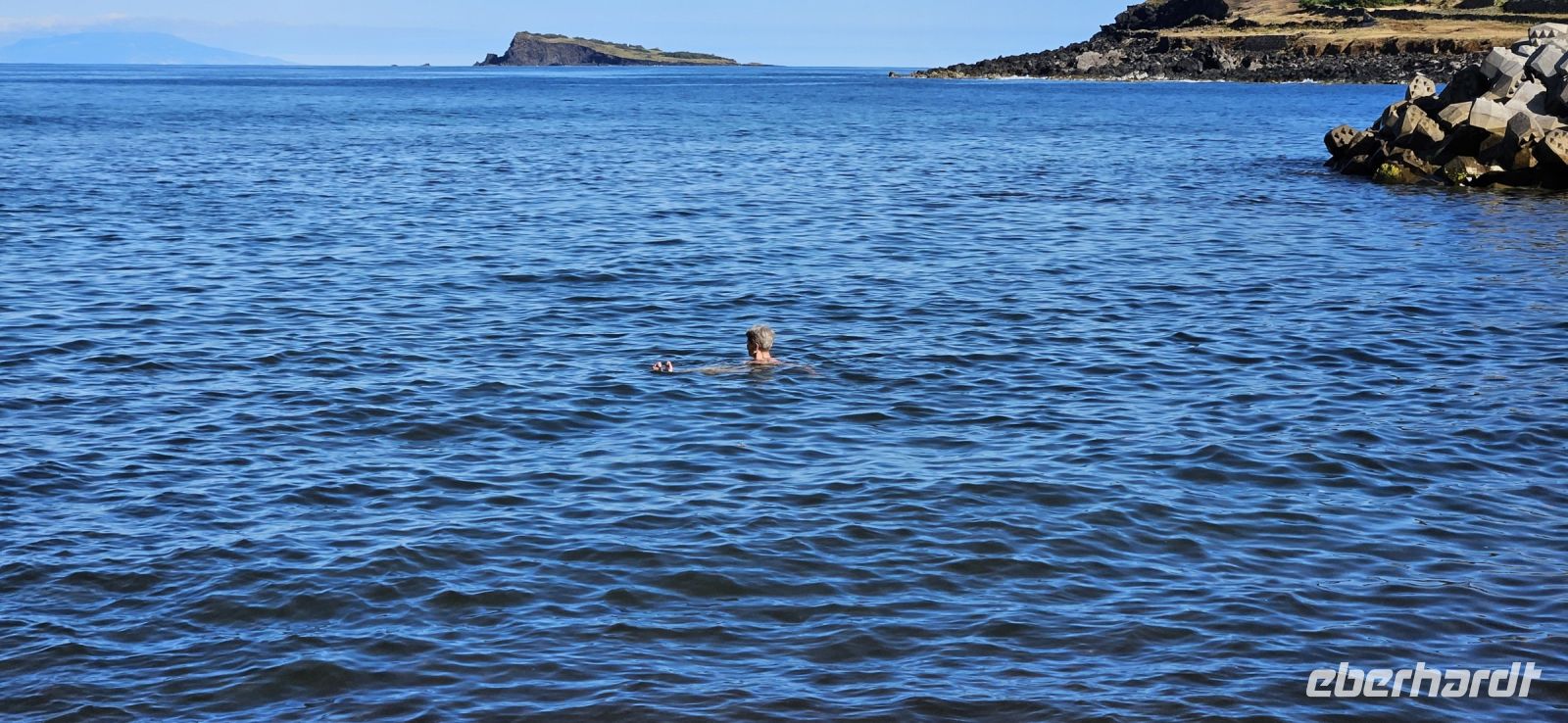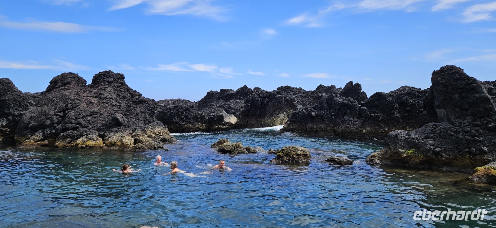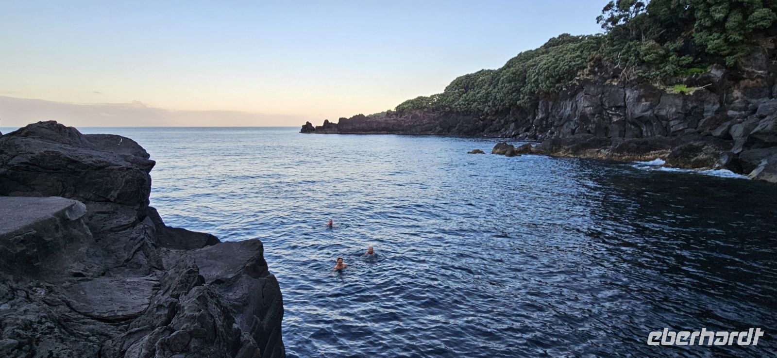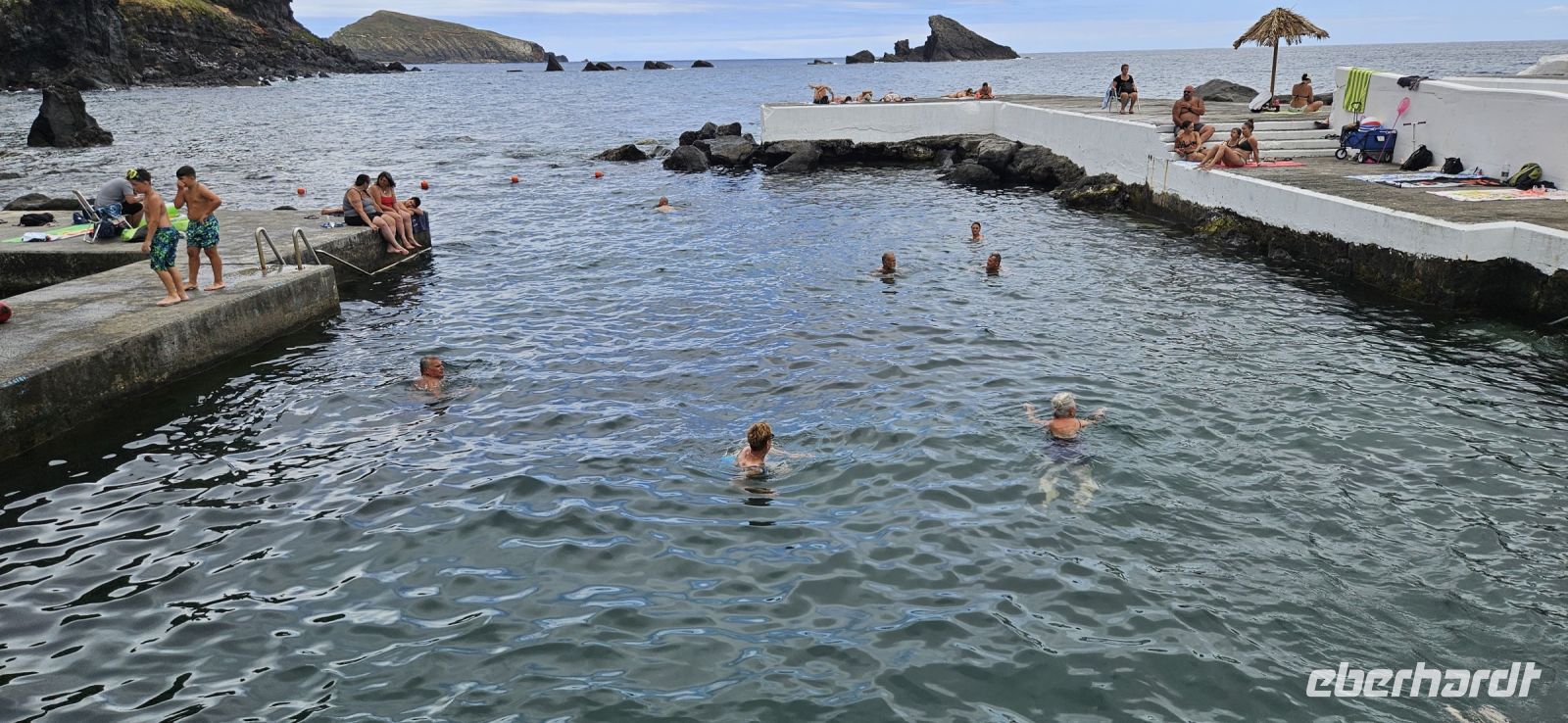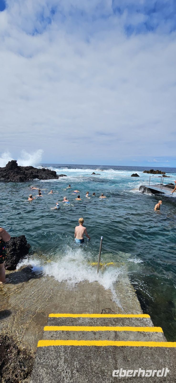 Bereits 7 Uhr traf ich mich mit einigen Gästen, um im Atlantik schwimmen zu gehen. Der Weg zur Badestelle führte über viele Treppen und durch Lavagestein. Das Wasser im Atlantik hatte 22/23 Grad Celsius Temperatur und bot ein erfrischendes Bad in einer geschützten Bucht. Das Frühstück schmeckte danach besonders gut und wir konnten es im Garten oder im Restaurant innen einnehmen. Viele lokale Produkte wurden angeboten und besonders der Sao Jorge Käse, ein Frischkäse, hatte es mir angetan.