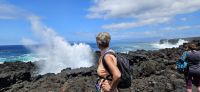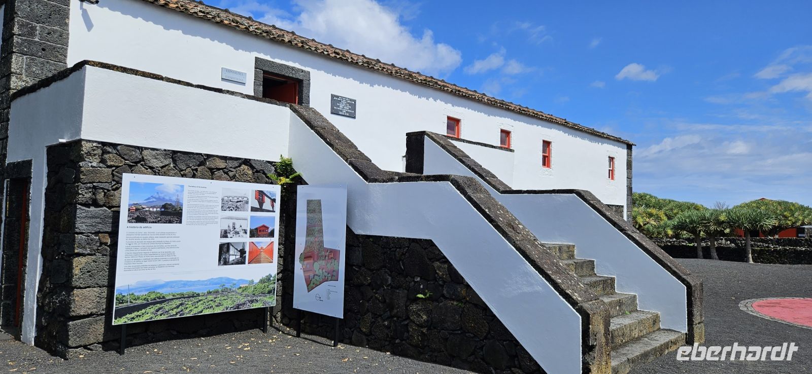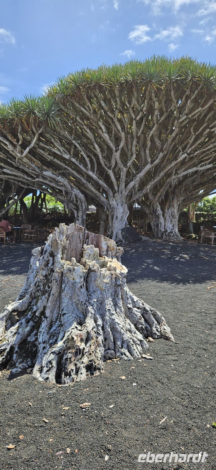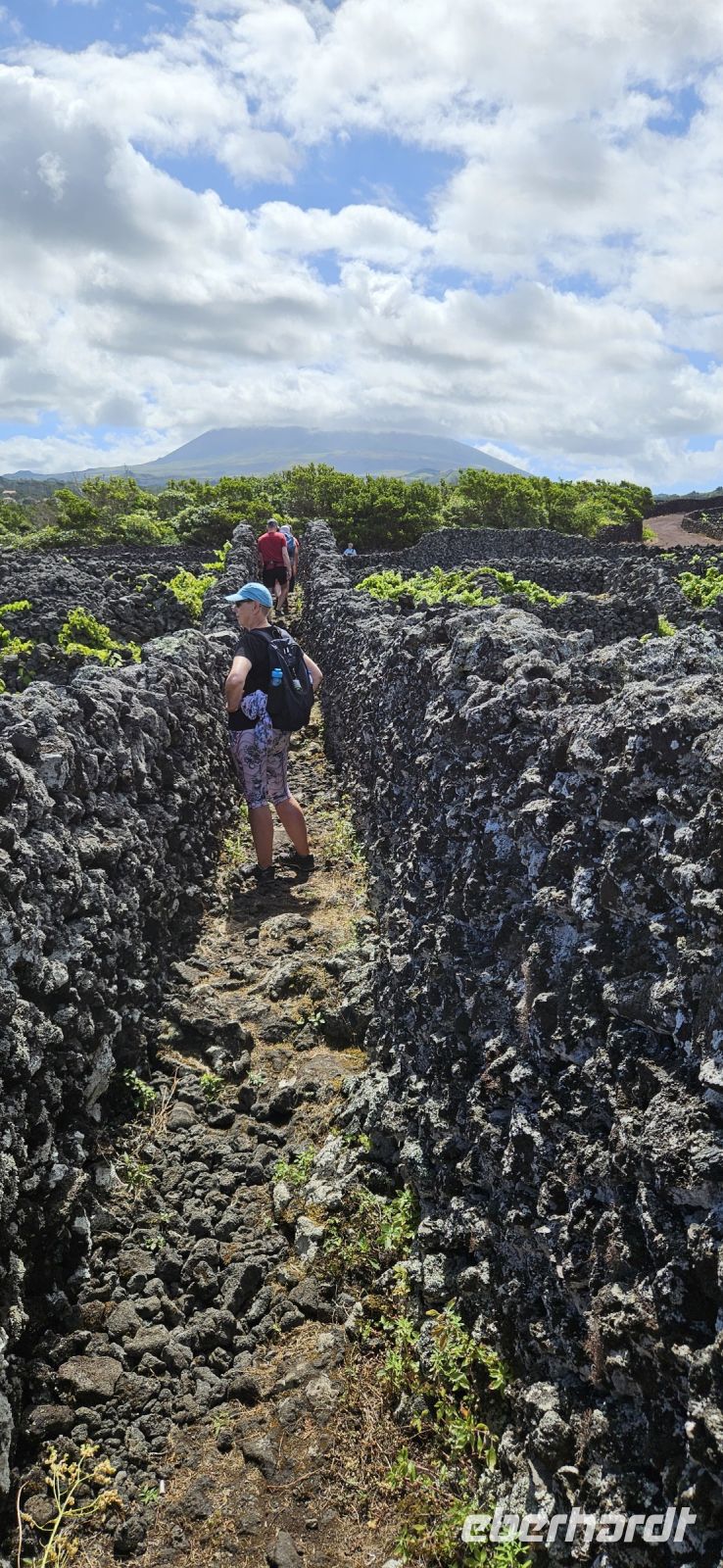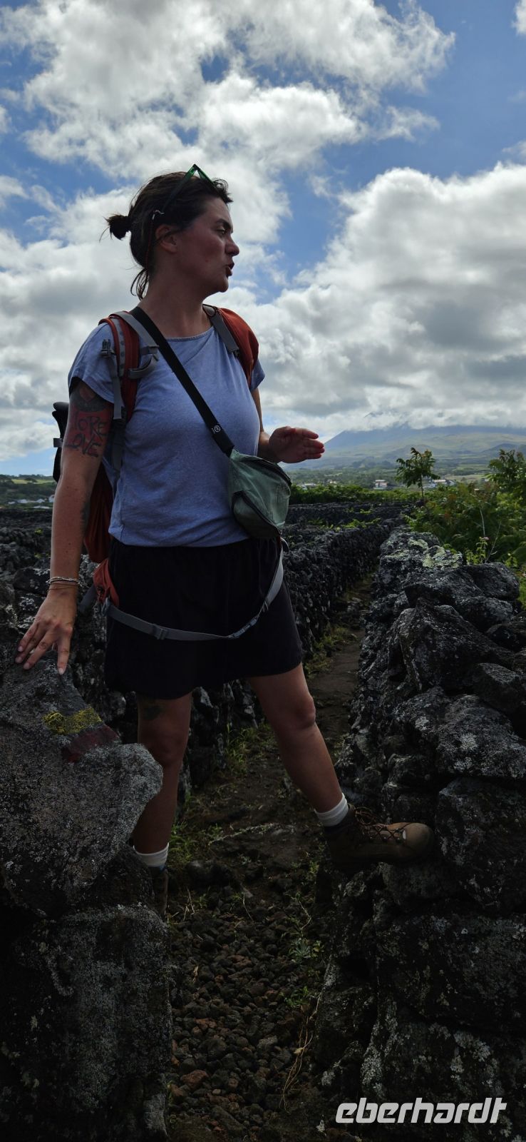Unsere Wanderung im UNESCO Welterbe Weinanbaugebiet von Pico begannen wir an der Lava Küste, wo noch gut die Wagenspuren der mit Eisen beschlagenen Holzräder zu erkennen waren und die runden Lavasteine, über die die Weinfässer auf die kleinen Boote gerollt wurden. Der Blick hinüber zur Insel Faial mit dem Hauptort Horta und die starke Brandung an der Küste waren beeindruckend. Unsere Wanderung durch die Weinfelder, oder besser Weingärten, führte über breite Wege vorbei an einer Windmühle und über schmale und einen sehr schmalen Weg zwischen den Weingärten hindurch. Die Weinreben sind meist in einer Mulde, umgeben von Lavamauern gepflanzt. Die Mauern schützen vor Wind und der Meeresgischt, speichern die Wärme tagsüber und geben sie nachts ab. Eine sehr praktische, allerdings auch arbeitsintensive Weise des Weinanbaus und völlig zurecht bekam das Gebiet 2004 den Welterbetitel von der Unesco. Zwischendrin stehen immer wieder Feigenbäume und die reifen Früchte der Feige sollen die Vögel vom Naschen der reifen Weintrauben abhalten..Nach unserer Wanderung fuhren wir zum Weinbaumuseum am Stadtrand von Madalena. Melinda führte uns durch die Innenräume des Museums und berichtete wie der Wein von Pico für wenig Geld nach Faial auf kleinen Booten gebracht wurde und von dort für viel Geld auf großen Schiffen weiter verkauft wurde bis an den Zarenhof in Russland. Im Gelände des Museums stand einst der größte Drachenbaum der Insel Pico. Leider fiel er dem Hurrikan Lorenzo 2019 zum Opfer. An den vorhandenen Resten des Stammes kann man die einstige Größe erahnen. Inzwischen ist ein beeindruckender Wald an Drachenbäumen heran gewachsen. Eine große Weinpresse konnten wir ebenfalls bestaunen und im Obergeschoss gab es ausführliche Informationen zu den Rebsorten. Vom Museum spazierten wir ins Zentrum von Madalena und genossen ein wunderbares Mittagessen im Restaurant Aruda. Gut gestärkt und beschwingt vom Wein und Likör gingen wir zum Bus und fuhren entlang der Nordküste nach Porto do Cachorro. Die Zeit bis zur Führung im Vulkanmuseum verbrachten wir an der Lava Küste, wo gewaltige Wellen eine hohe Gischtfontäne .entstehen liessen. Im Vulkanmuseum konnten wir den Ausbruch eines Vulkanes virtuell erleben und danach mit einer 3-D-Brille ein nachempfundenes Erdbeben. Das war schon eine gewaltige Erfahrung und Gott sei Dank nicht Wirklichkeit.