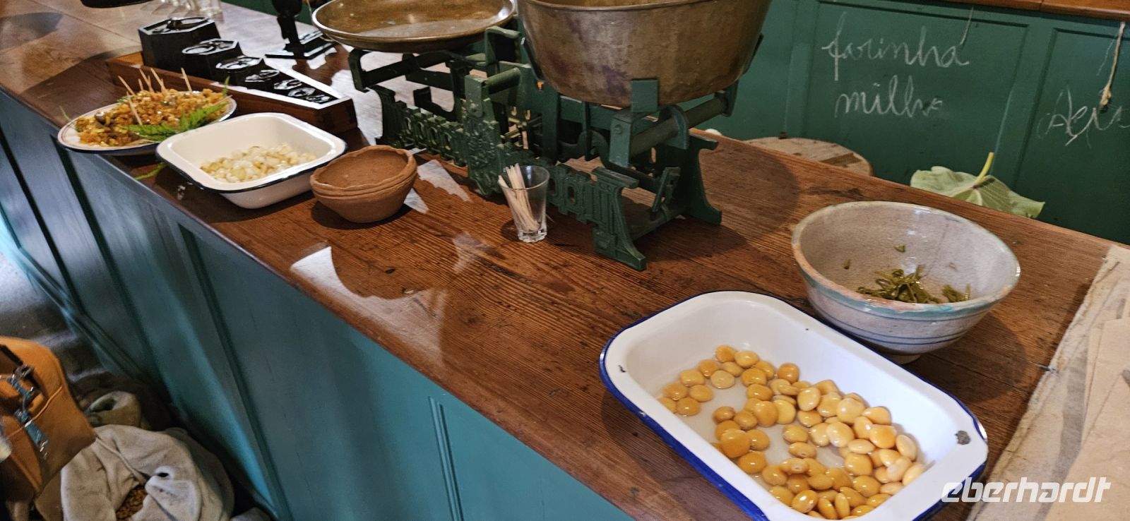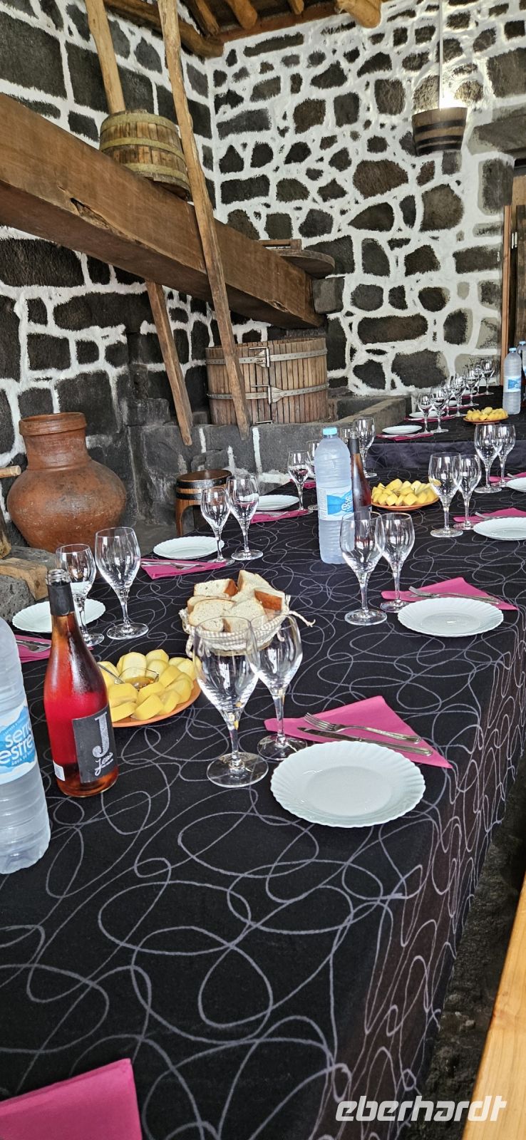 Am Abend fuhren wir mit dem Bus an den Stadtrand von Angra und besuchten die Quinta do Martelo. In dem Areal ist ein Freilichtmuseum eingerichtet und man kann ganz traditionell zu Abend essen. Wir betraten den Laden mit historischer Einrichtung und bekamen dort so wie früher die Vorspeisen "serviert". Eingelegter Meerfenchel, Bohnen u.v.m. konnten wir probieren und dann gingen wir hinauf und nahmen in den Stuben Platz fürs Abendessen. Nach einer Suppe wurde Alcatra serviert mit Rindfleisch und das war auch für Nichtfleischesser ein Hochgenuss. Es folgte noch ein Nachtisch mit Kaffee und zum Schluss zur Verdauung ein Schnaps. Diese Begrüßung auf der Insel Terceira war gelungen !