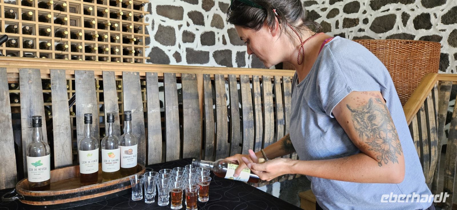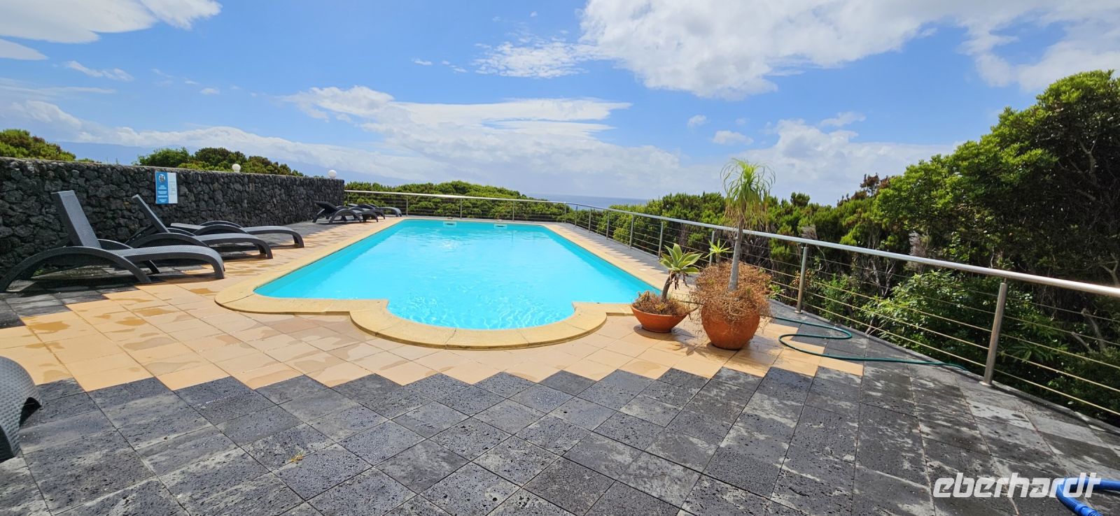 Weiter an der Nordküste fuhren wir zur Adega a Buraca und da durften wir den Pico Wein probieren. Es gab einen Rose- und einen Weisswein, dazu Käse, verschiedene Wurst und 2 Sorten Brot. Zum Abschluss konnte sich jeder noch einen Likör oder Schnaps aussuchen und all diese Produkte wurden auch zum Kauf angeboten. Nun waren wir aber sehr gut gesättigt und auf der Rückfahrt sahen wir die Insel Sao Jorge sehr gut und durch die Inselmitte kamen wir noch einmal am Pico Berg vorbei. In unserer Hotelanlage gingen wir schwimmen und erkundeten auch den wunderschönen Pool mit Aussicht bis nach Lajes. Ein ehemaliger Walausguck Turm befand sich ebenfalls in der Anlage und den konnte man über eine Leiter erklimmen und mit dem Fernglas das Meer nach Walen absuchen.