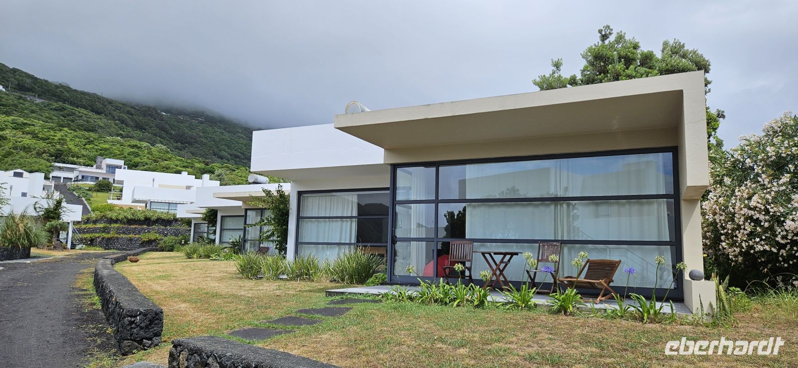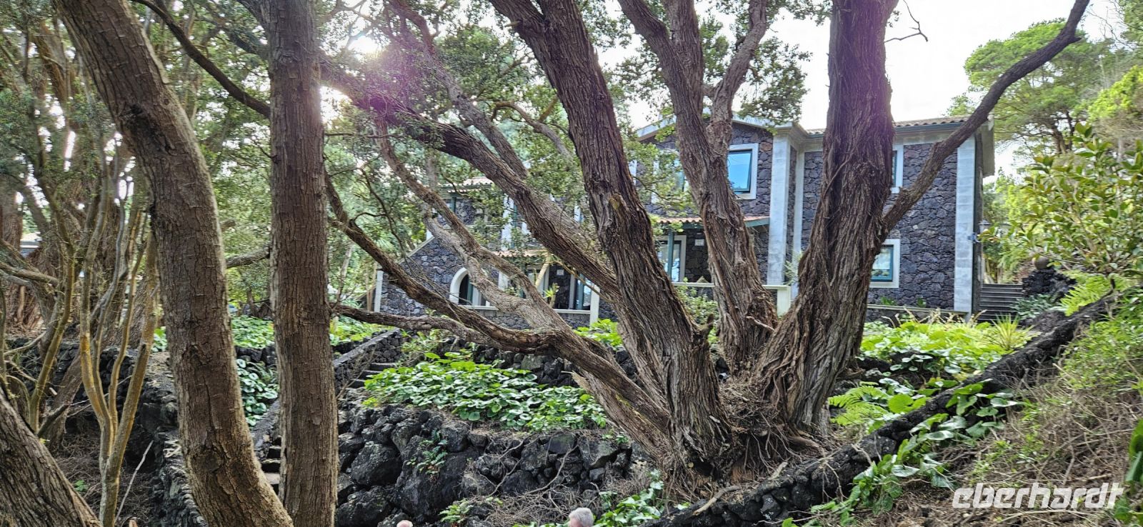 Im Hotel Aldeia da Fonte, 4 km von Lajes entfernt, war schon alles für den checkin vorbereitet. Nur beim Aufsuchen unserer Zimmer in den hübschen kleinen Steinhäusern brauchten wir Hilfe. Die Häuser lagen weit verstreut in der wunderschönen Naturanlage am Atlantik und waren über Treppen und schmale Wege zu erreichen. Bei einem ersten Erkundungsgang entdeckten wir schon mal den Zustieg zur Badestelle im Atlantik und dann trafen wir uns zum ersten Abendessen und unsere Gruppe hatte einen großen Tisch draussen im Garten des Restaurants. Das Essen war sehr reichlich und schmackhaft und so begaben wir uns danach zu einem kleinen Rundgang und da spendierte ich zur Begrüßung einen hochprozentigen Bergfeuer Schnaps. Wir stiessen auf unsere bevorstehende Reise an und dann endlich gings ins Bett.