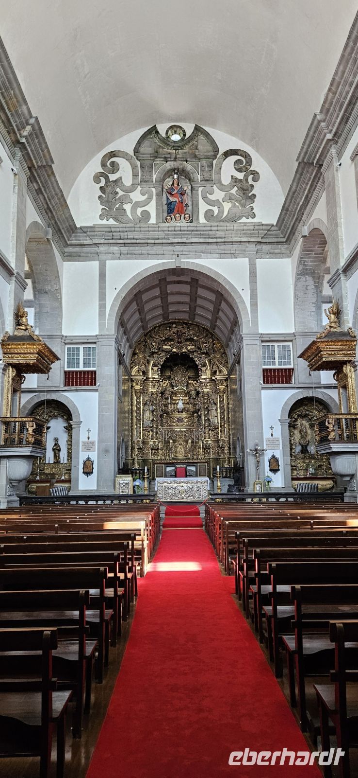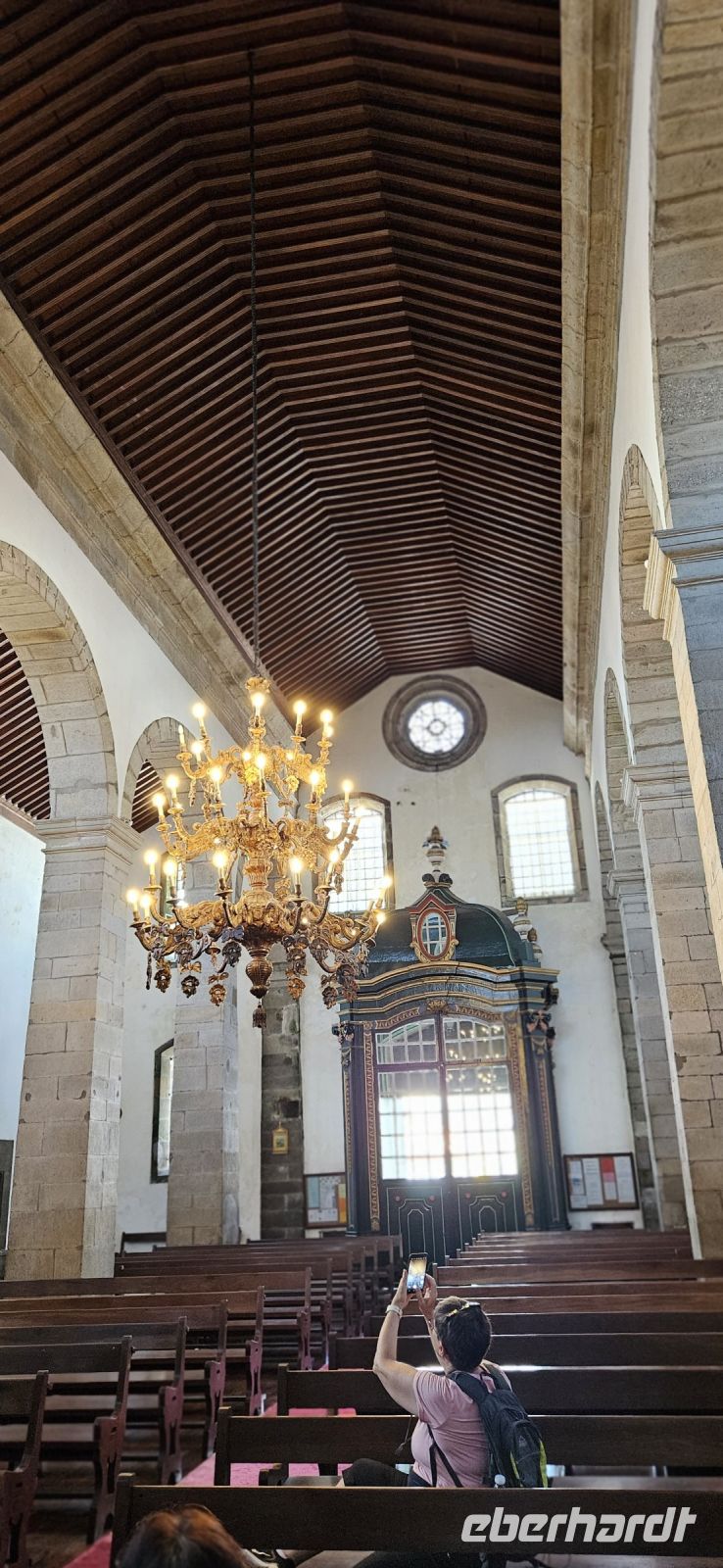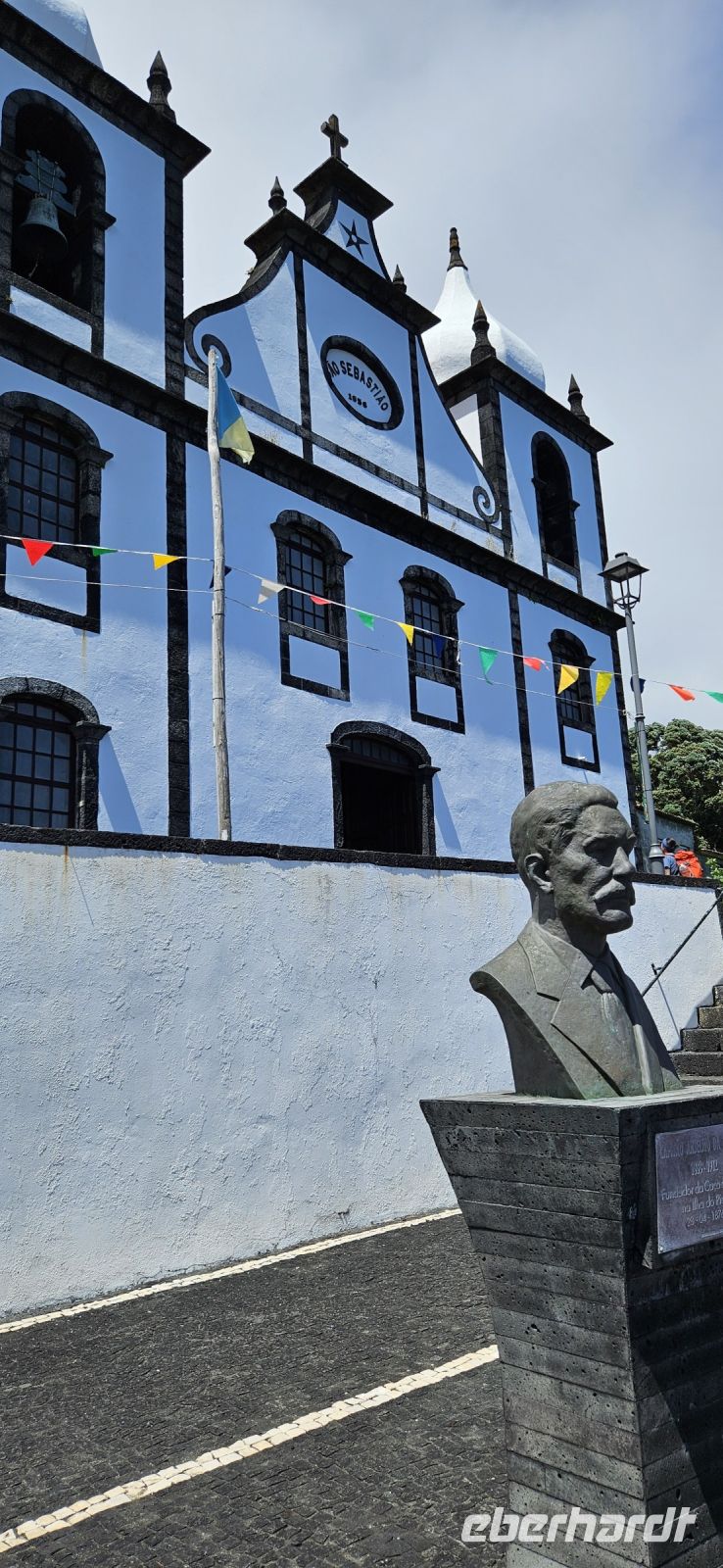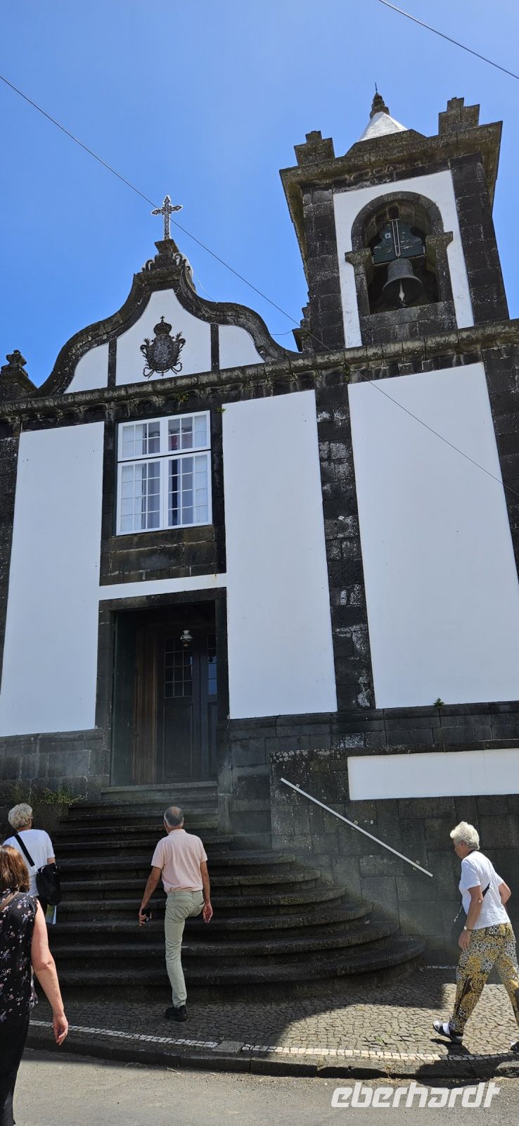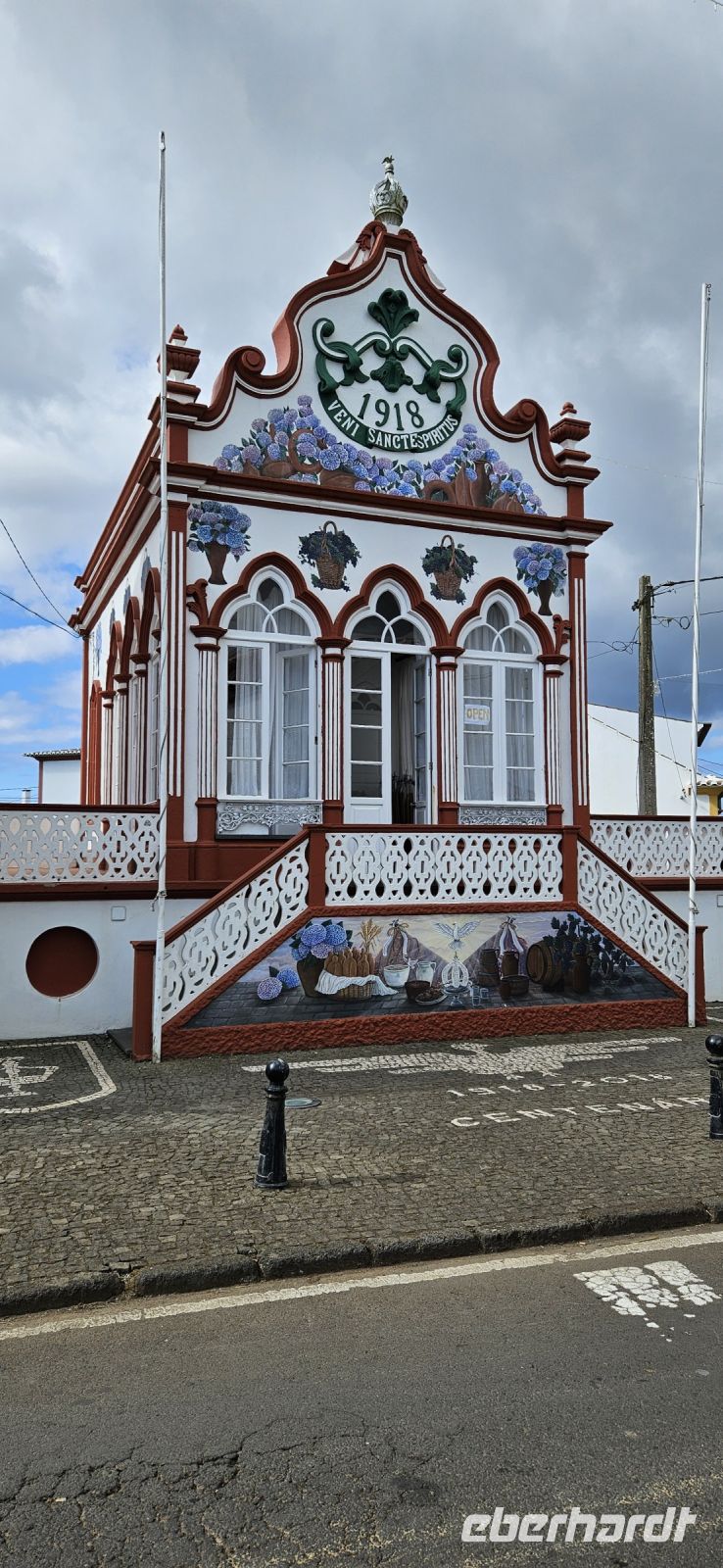 Heute stand die Rundfahrt auf der Azoreninsel Terceira auf dem Programm. Marisa holte uns am Hotel ab und mit dem Bus fuhren wir zunächst auf den Monte Brazil. Am Fusse des Vulkanes steht eine gewaltige Festung und die 4 km lange Festungsmauer umgibt den ganzen Berg. Aber zunächst musste unser Fahrer den großen Bus durch das schmale Eingangstor der Festung manövrieren und das war Milimetersache. Vom Parkplatz auf dem Pico das Cruzinhas hatten wir eine wunderbare Aussicht auf Angra und die Südküste Richtung Sao Mateus. Die anderen Gipfel des Monte Brazil sind nur zu Fuss zu erreichen und einige hatten wir am Vortag auch bewandert. Wir verliessen die Stadt Angra am Stier Kreisverkehr und machten dort eine weitere Fotopause. Dann führte unsere Fahrtroute immer an der Südostküste entlang, vorbei an den beiden Ziegeninseln nach Sao Sebastiao. Diese kleine Stadt ist bekannt für ihre alte Kirche mit Fresken aus dem 15. Jahrhundert, die seit Jahren restauriert werden. Das Hauptportal repräsentiert noch die Atlantische Gotik und die wuchtige Fensterrosette darüber ist etwas ganz Besonderes. Gegenüber ist eine der schönsten Heiliggeist Kapellen zu sehen und wir konnten sie sogar innen besichtigen.