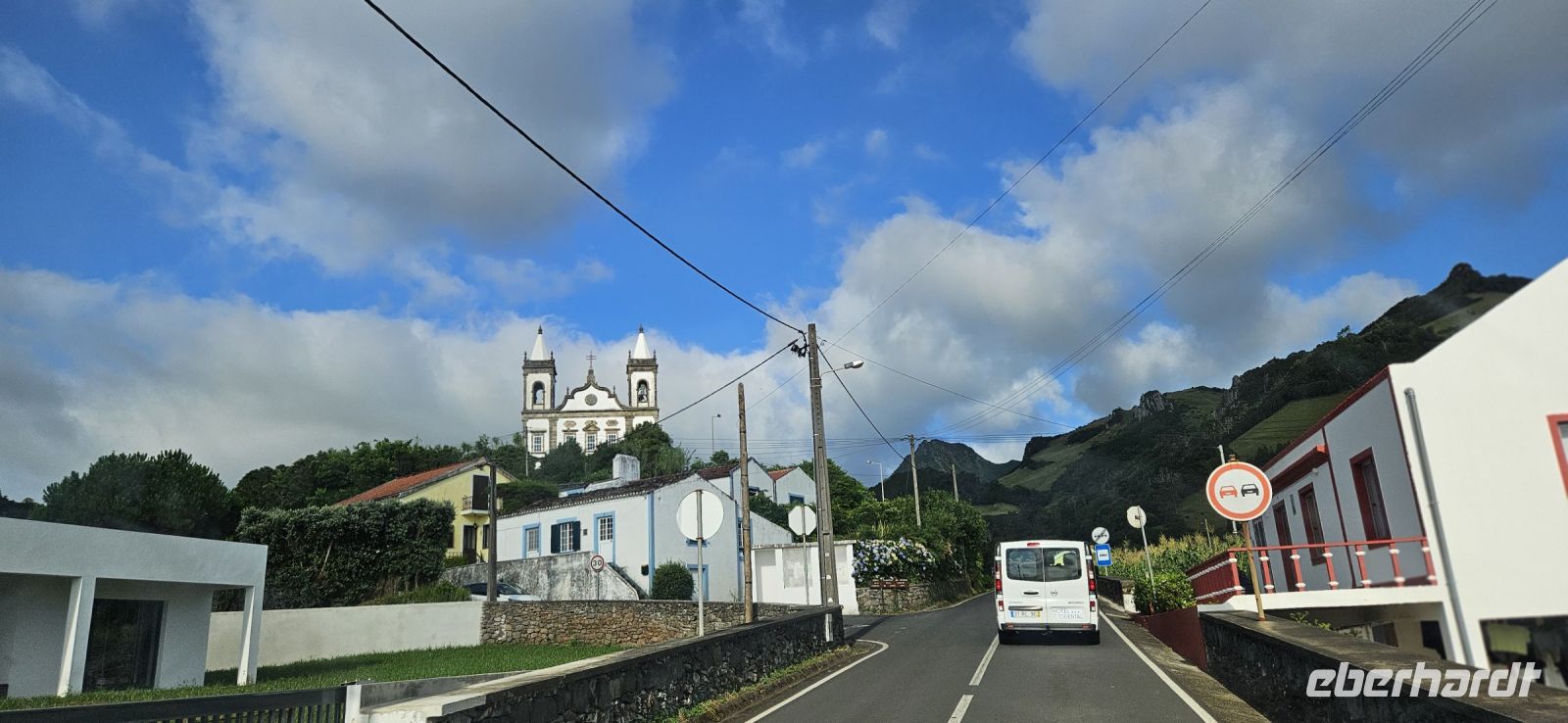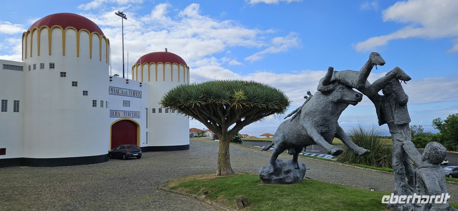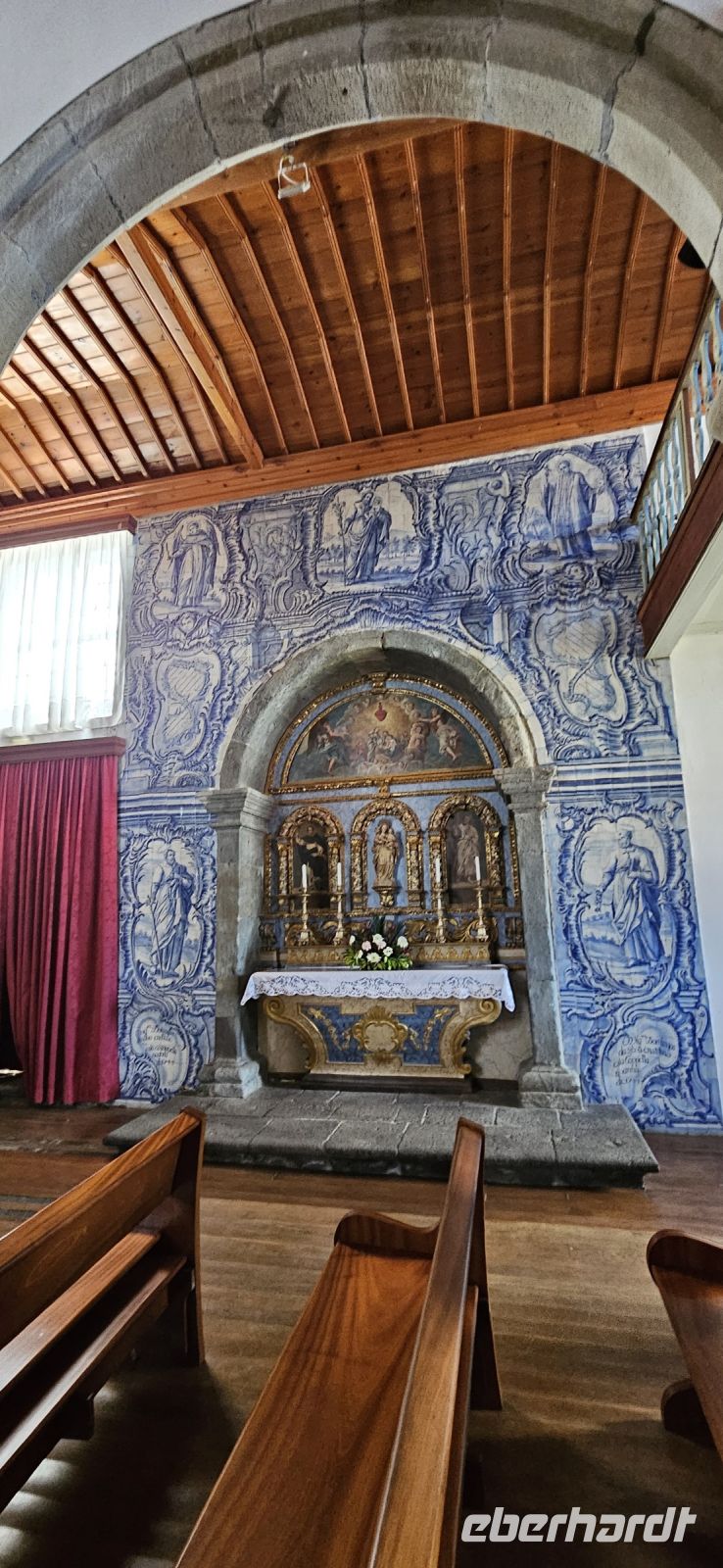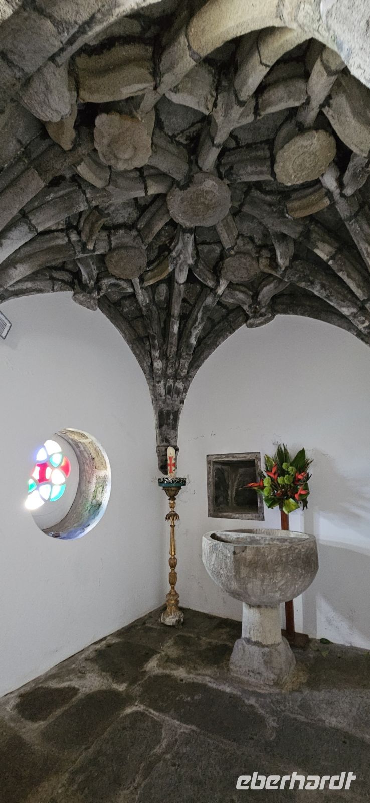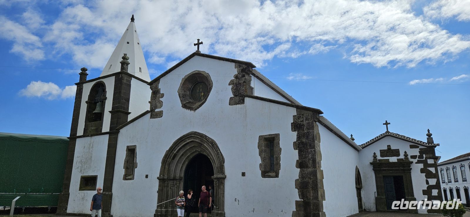 Heute stand die Rundfahrt auf der Azoreninsel Terceira auf dem Programm. Marisa holte uns am Hotel ab und mit dem Bus fuhren wir zunächst auf den Monte Brazil. Am Fusse des Vulkanes steht eine gewaltige Festung und die 4 km lange Festungsmauer umgibt den ganzen Berg. Aber zunächst musste unser Fahrer den großen Bus durch das schmale Eingangstor der Festung manövrieren und das war Milimetersache. Vom Parkplatz auf dem Pico das Cruzinhas hatten wir eine wunderbare Aussicht auf Angra und die Südküste Richtung Sao Mateus. Die anderen Gipfel des Monte Brazil sind nur zu Fuss zu erreichen und einige hatten wir am Vortag auch bewandert. Wir verliessen die Stadt Angra am Stier Kreisverkehr und machten dort eine weitere Fotopause. Dann führte unsere Fahrtroute immer an der Südostküste entlang, vorbei an den beiden Ziegeninseln nach Sao Sebastiao. Diese kleine Stadt ist bekannt für ihre alte Kirche mit Fresken aus dem 15. Jahrhundert, die seit Jahren restauriert werden. Das Hauptportal repräsentiert noch die Atlantische Gotik und die wuchtige Fensterrosette darüber ist etwas ganz Besonderes. Gegenüber ist eine der schönsten Heiliggeist Kapellen zu sehen und wir konnten sie sogar innen besichtigen.