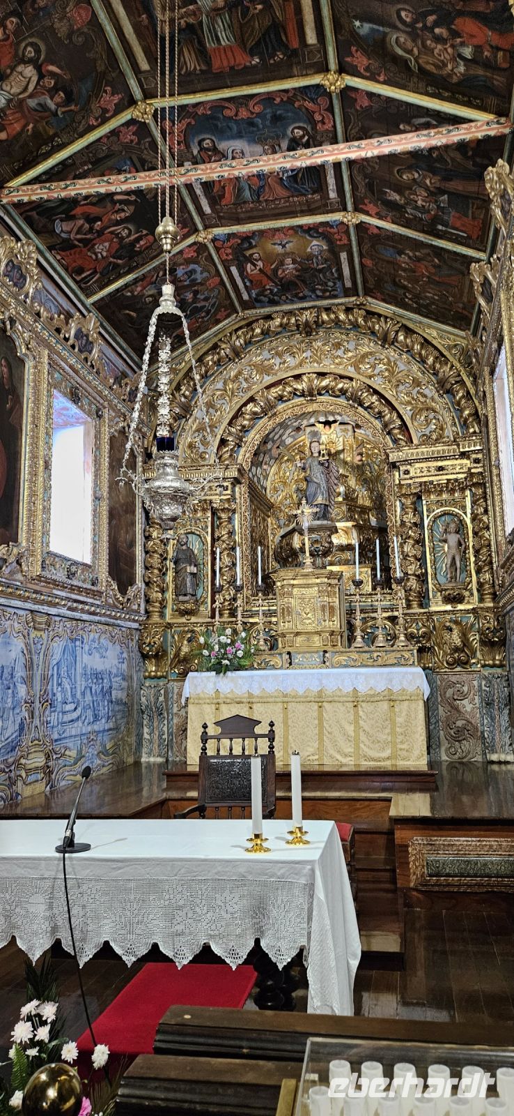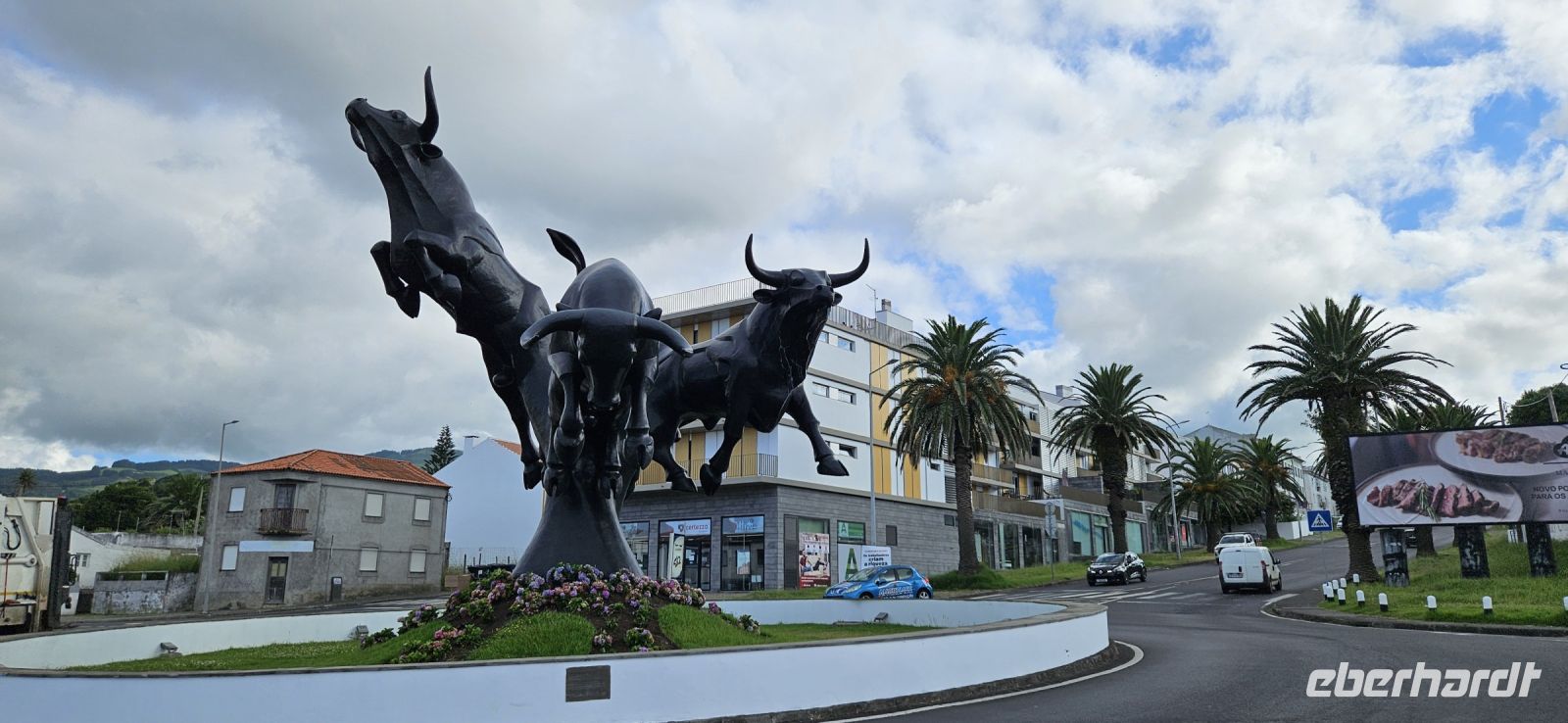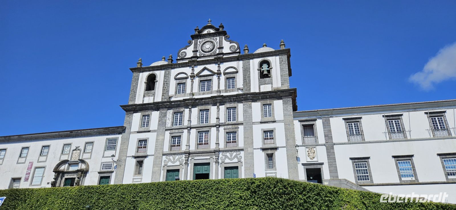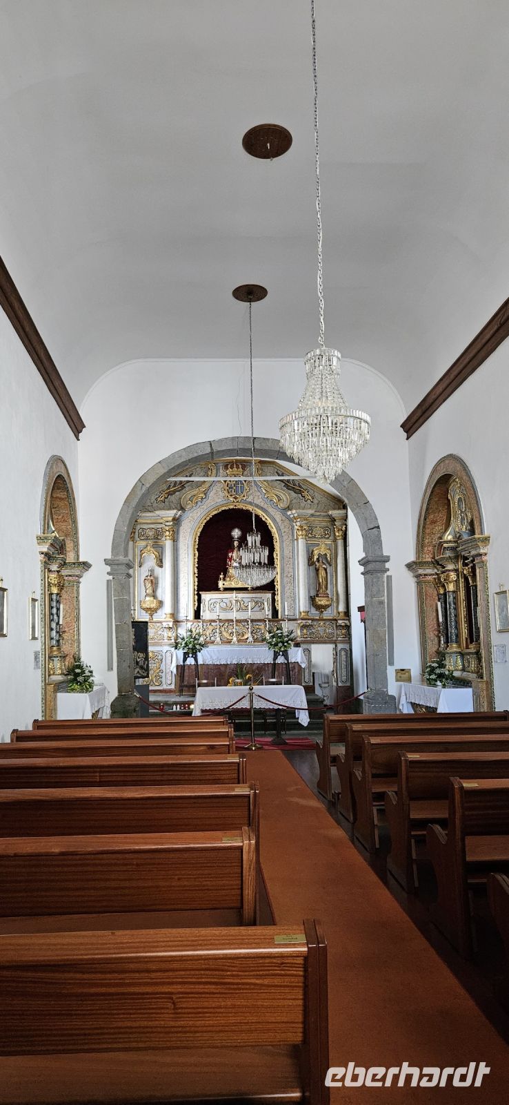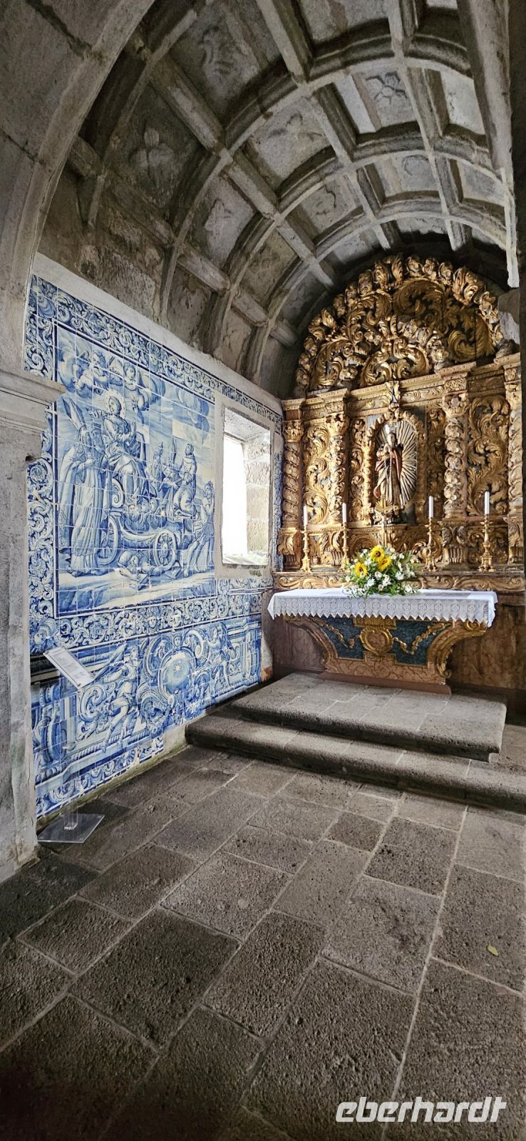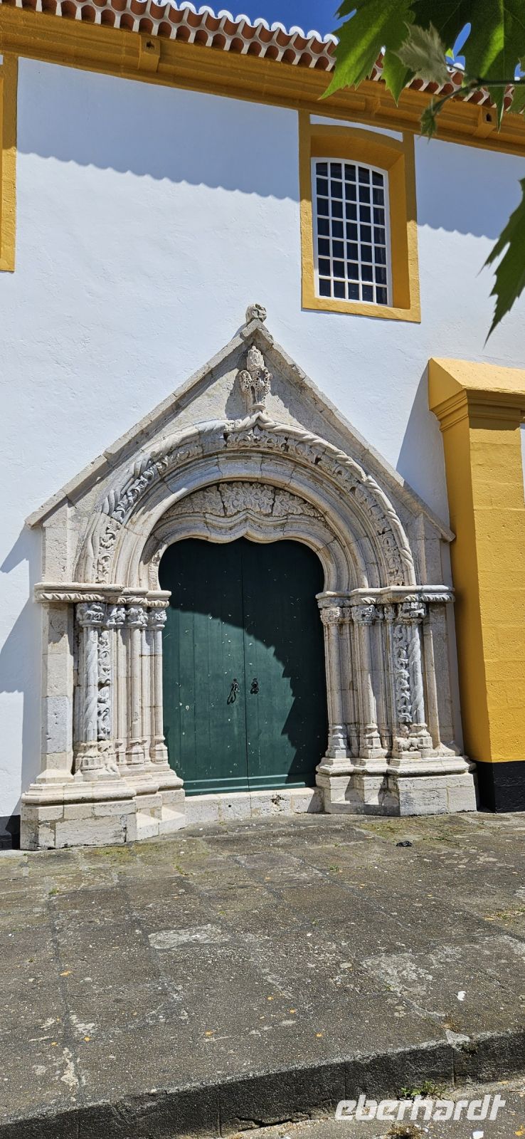 Heute stand die Rundfahrt auf der Azoreninsel Terceira auf dem Programm. Marisa holte uns am Hotel ab und mit dem Bus fuhren wir zunächst auf den Monte Brazil. Am Fusse des Vulkanes steht eine gewaltige Festung und die 4 km lange Festungsmauer umgibt den ganzen Berg. Aber zunächst musste unser Fahrer den großen Bus durch das schmale Eingangstor der Festung manövrieren und das war Milimetersache. Vom Parkplatz auf dem Pico das Cruzinhas hatten wir eine wunderbare Aussicht auf Angra und die Südküste Richtung Sao Mateus. Die anderen Gipfel des Monte Brazil sind nur zu Fuss zu erreichen und einige hatten wir am Vortag auch bewandert. Wir verliessen die Stadt Angra am Stier Kreisverkehr und machten dort eine weitere Fotopause. Dann führte unsere Fahrtroute immer an der Südostküste entlang, vorbei an den beiden Ziegeninseln nach Sao Sebastiao. Diese kleine Stadt ist bekannt für ihre alte Kirche mit Fresken aus dem 15. Jahrhundert, die seit Jahren restauriert werden. Das Hauptportal repräsentiert noch die Atlantische Gotik und die wuchtige Fensterrosette darüber ist etwas ganz Besonderes. Gegenüber ist eine der schönsten Heiliggeist Kapellen zu sehen und wir konnten sie sogar innen besichtigen.