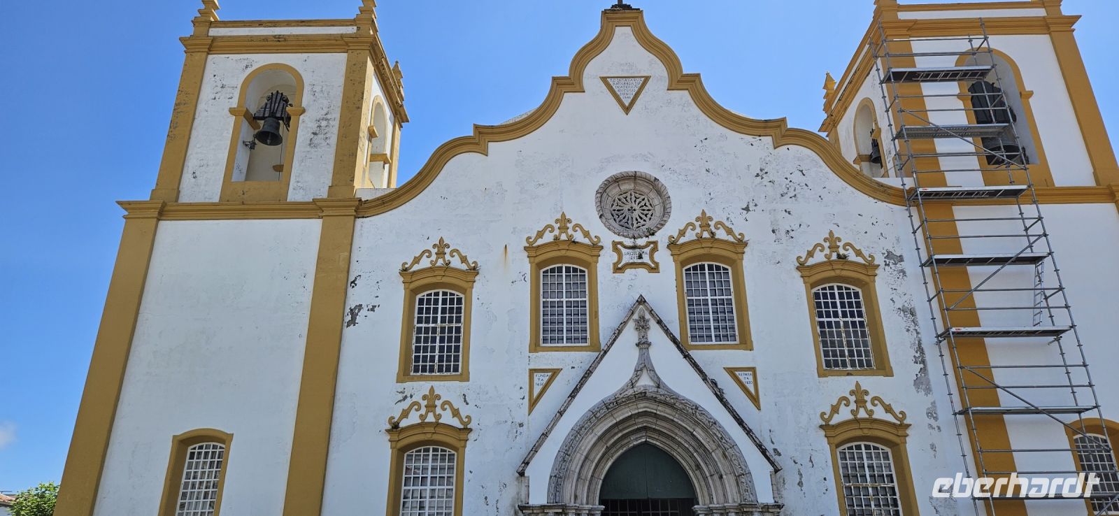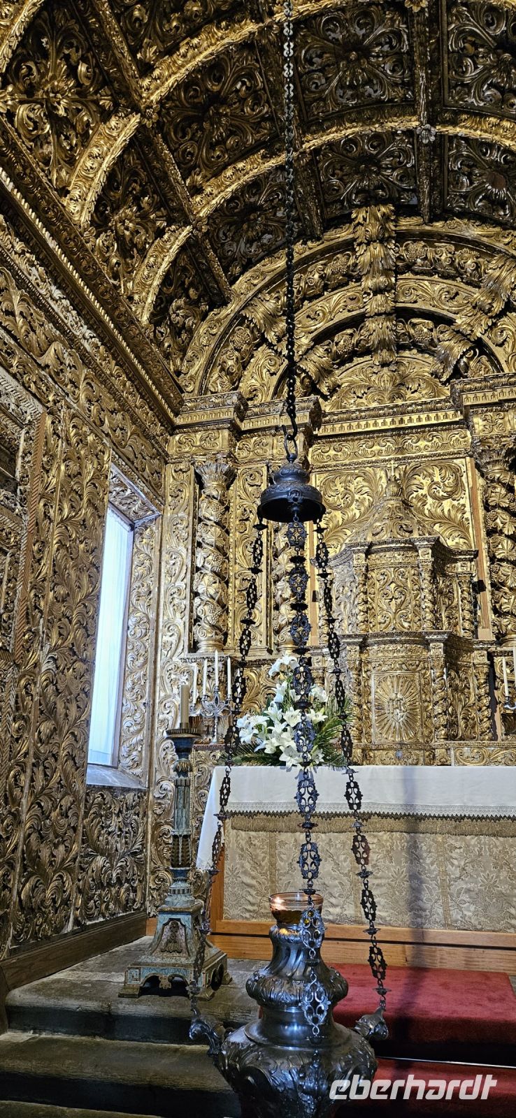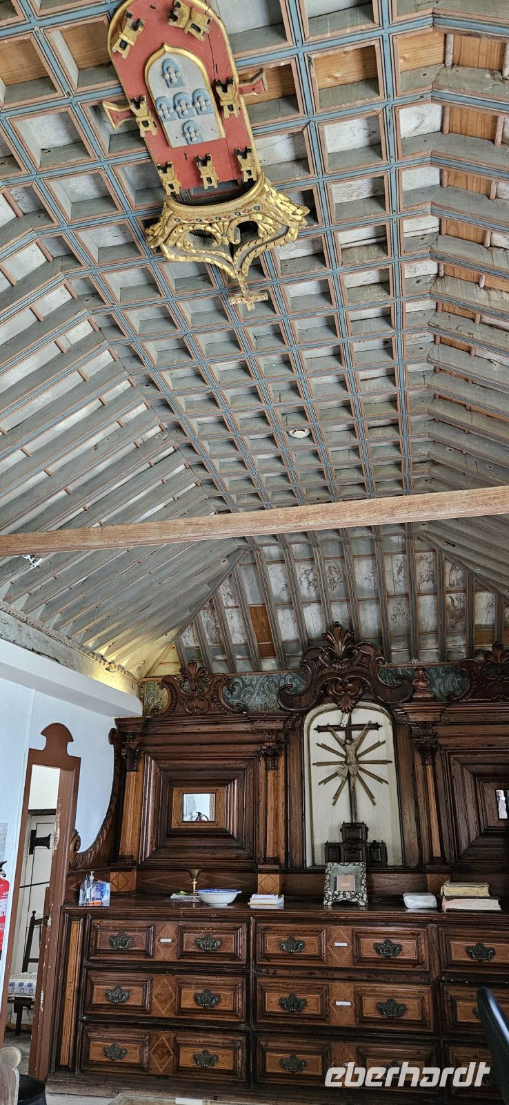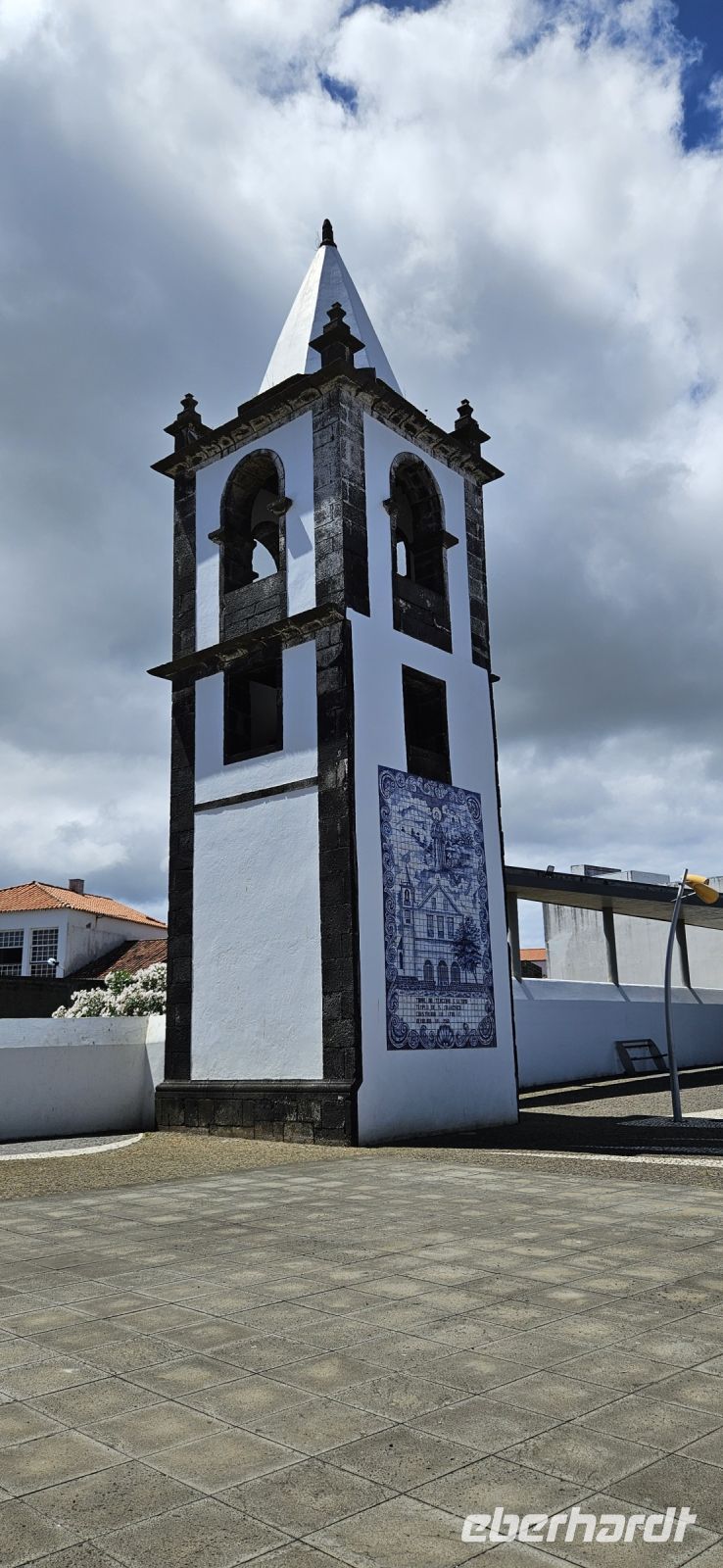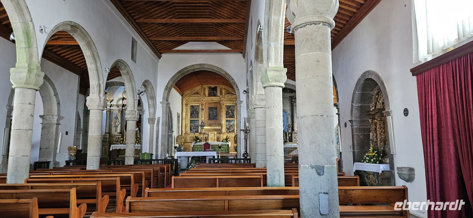 Heute stand die Rundfahrt auf der Azoreninsel Terceira auf dem Programm. Marisa holte uns am Hotel ab und mit dem Bus fuhren wir zunächst auf den Monte Brazil. Am Fusse des Vulkanes steht eine gewaltige Festung und die 4 km lange Festungsmauer umgibt den ganzen Berg. Aber zunächst musste unser Fahrer den großen Bus durch das schmale Eingangstor der Festung manövrieren und das war Milimetersache. Vom Parkplatz auf dem Pico das Cruzinhas hatten wir eine wunderbare Aussicht auf Angra und die Südküste Richtung Sao Mateus. Die anderen Gipfel des Monte Brazil sind nur zu Fuss zu erreichen und einige hatten wir am Vortag auch bewandert. Wir verliessen die Stadt Angra am Stier Kreisverkehr und machten dort eine weitere Fotopause. Dann führte unsere Fahrtroute immer an der Südostküste entlang, vorbei an den beiden Ziegeninseln nach Sao Sebastiao. Diese kleine Stadt ist bekannt für ihre alte Kirche mit Fresken aus dem 15. Jahrhundert, die seit Jahren restauriert werden. Das Hauptportal repräsentiert noch die Atlantische Gotik und die wuchtige Fensterrosette darüber ist etwas ganz Besonderes. Gegenüber ist eine der schönsten Heiliggeist Kapellen zu sehen und wir konnten sie sogar innen besichtigen.