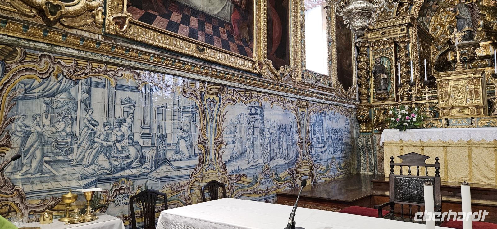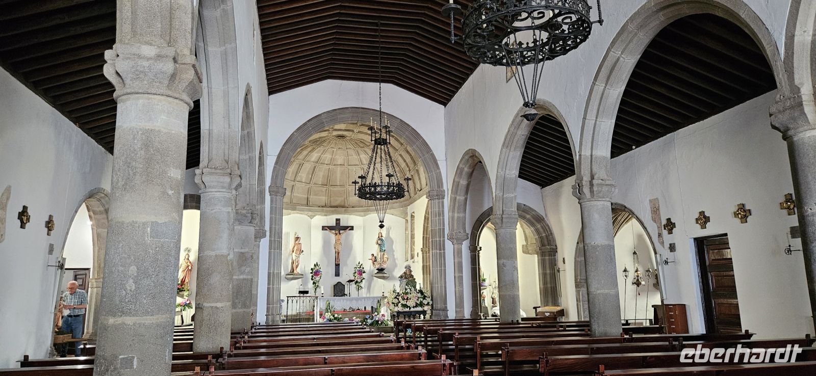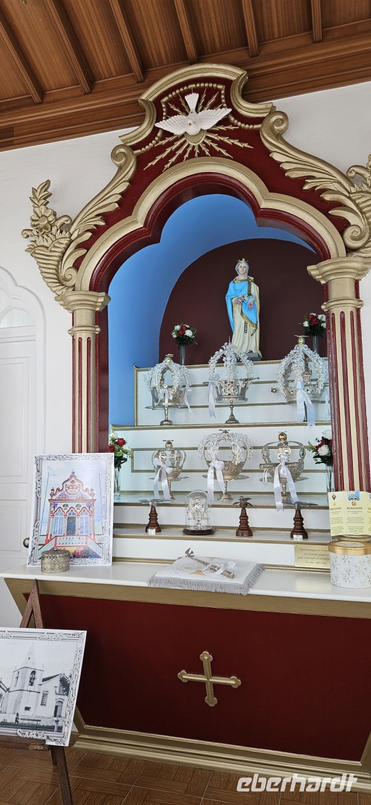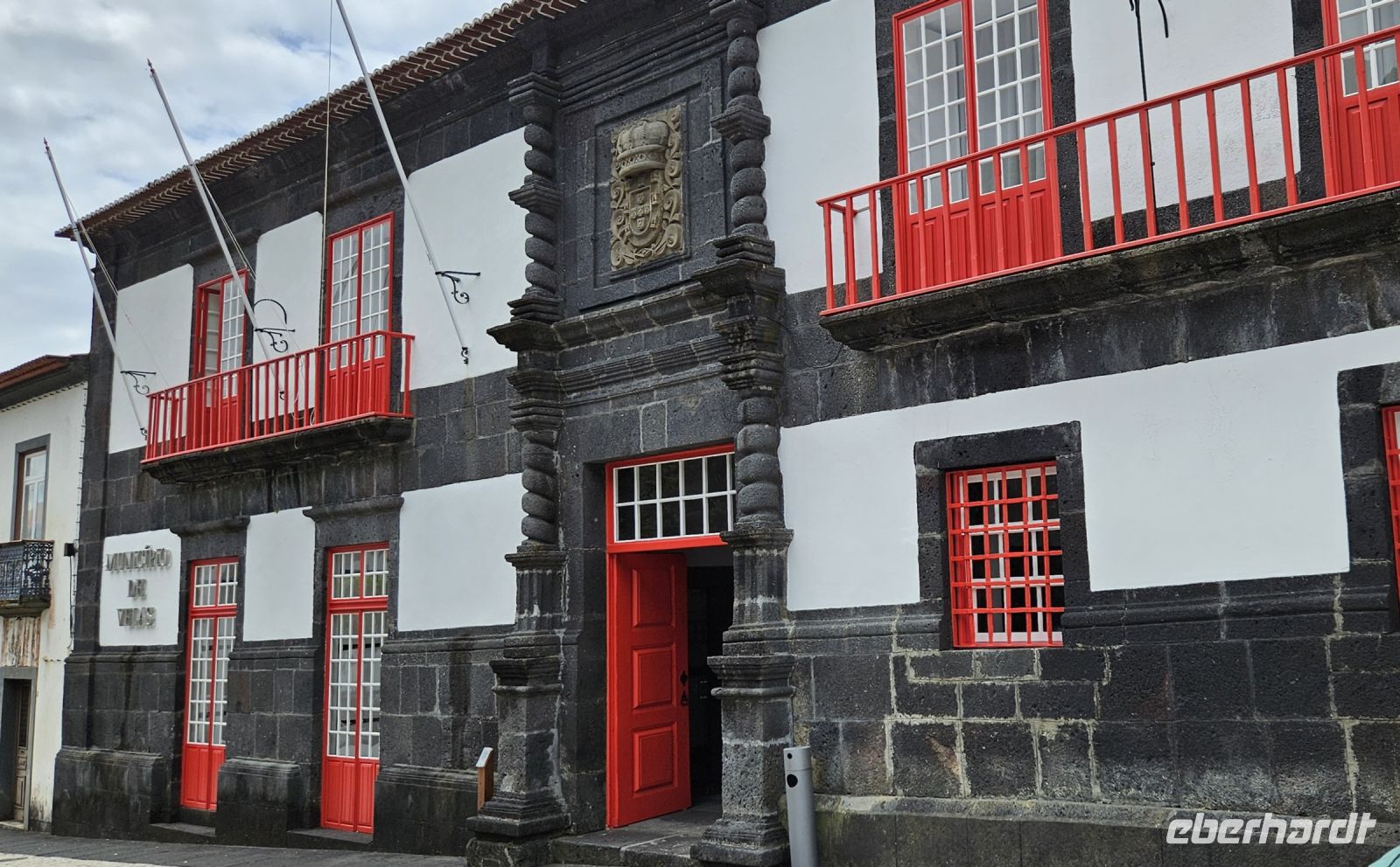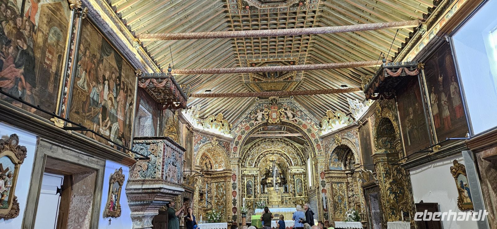Heute stand die Rundfahrt auf der Azoreninsel Terceira auf dem Programm. Marisa holte uns am Hotel ab und mit dem Bus fuhren wir zunächst auf den Monte Brazil. Am Fusse des Vulkanes steht eine gewaltige Festung und die 4 km lange Festungsmauer umgibt den ganzen Berg. Aber zunächst musste unser Fahrer den großen Bus durch das schmale Eingangstor der Festung manövrieren und das war Milimetersache. Vom Parkplatz auf dem Pico das Cruzinhas hatten wir eine wunderbare Aussicht auf Angra und die Südküste Richtung Sao Mateus. Die anderen Gipfel des Monte Brazil sind nur zu Fuss zu erreichen und einige hatten wir am Vortag auch bewandert. Wir verliessen die Stadt Angra am Stier Kreisverkehr und machten dort eine weitere Fotopause. Dann führte unsere Fahrtroute immer an der Südostküste entlang, vorbei an den beiden Ziegeninseln nach Sao Sebastiao. Diese kleine Stadt ist bekannt für ihre alte Kirche mit Fresken aus dem 15. Jahrhundert, die seit Jahren restauriert werden. Das Hauptportal repräsentiert noch die Atlantische Gotik und die wuchtige Fensterrosette darüber ist etwas ganz Besonderes. Gegenüber ist eine der schönsten Heiliggeist Kapellen zu sehen und wir konnten sie sogar innen besichtigen.