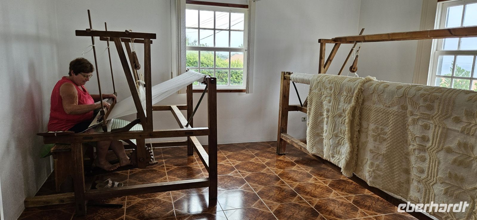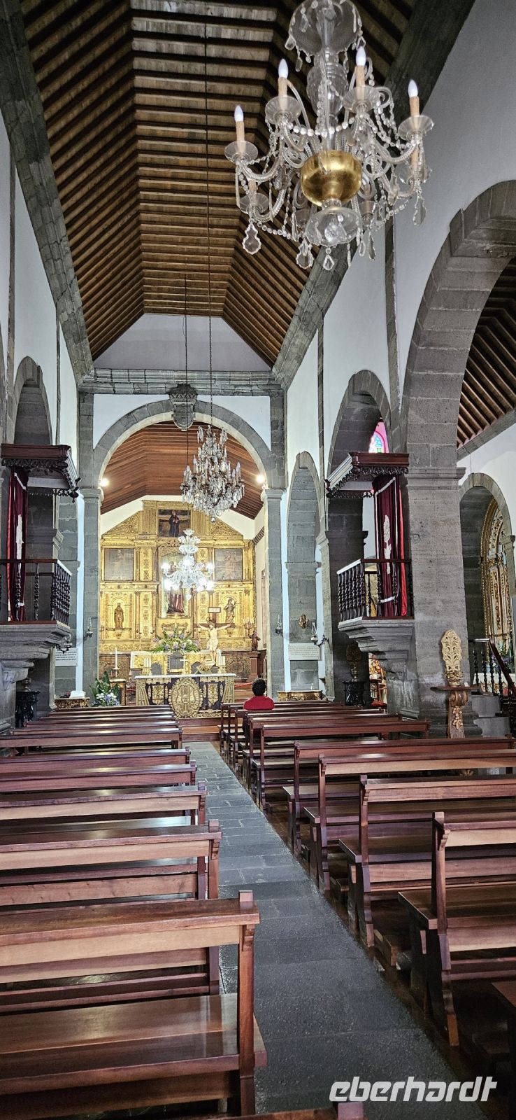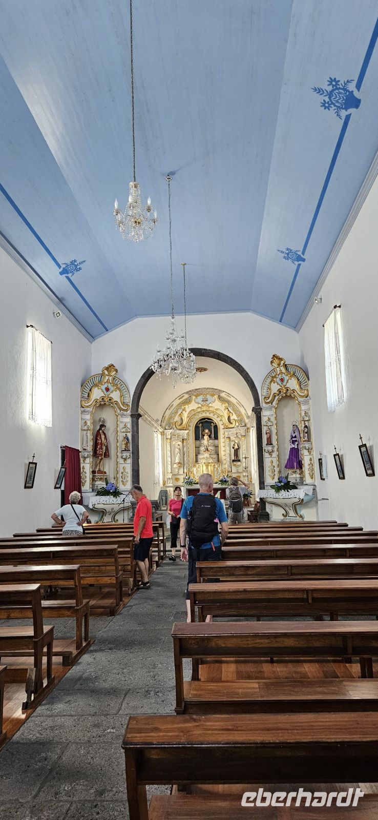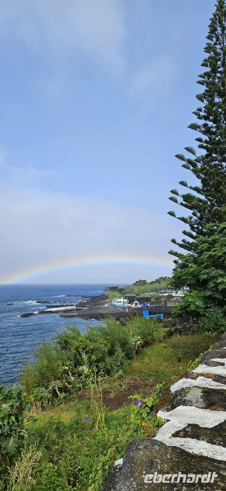 Die Insel Sao Jorge empfing uns beim Frühstück mit leichtem Regen und tief hängenden Wolken. So wurde unser Tagesprogramm "gedreht" und wir begannen mit der Besichtigung des alten Kirchturmes in Urzulina. Einst wurde bei einem Erdbeben der Ort verschüttet und zerstört, nur der Kirchturm blieb erhalten. Danach fuhren wir weiter an der Südküste nach Manadas zur Santa Barbara Kirche. Sie ist eine der schönsten und wertvollsten Kirchen der Azoren und ihr heutiges Aussehen stammt aus dem 18. Jahrhundert. Das Taufbecken aus Basalt ist älter und stammt aus einer Vorgängerkirche aus dem 16. Jahrhundert. Das Innere der Kirche ist im portugiesischen Barock aus einheimischen Wacholderholz, vergoldet oder bemalt und auf den Azulejos ist die Geschichte der Hl.Barbara dargestellt. Wir bekamen eine ausführliche Erklärung in der Kirche, die von Melinda übersetzt wurde. Wieder draussen begrüßte uns ein Regenbogen über dem Hafenbecken von Manadas. Wir fuhren noch weiter an der Südküste und dann steil bergab in Serpentinen zur Faja dos Vimes. Dort besuchten wir die Familie Nunes, die eine Kaffeeplantage mit einem Cafe betreibt. Natürlich probierten wir den Kaffee der Insel Sao Jorge und waren begeistert vom Geschmack. Danach führte uns der Sohn durch die Kaffeeplantage mit 1000 Kaffeepflanzen und erläuterte alles zur Ernte und weiteren Verarbeitung. Angefangen hatte man aber mit der Herstellung von gewebten Produkten und die Schwester von Frau Nunes konnten wir auch am Webstuhl arbeiten sehen. Das Wetter hatte sich gebessert und so fuhren wir hinauf auf die Serra do Topo, wo unsere Wanderung starten sollte. Leider waren wir da oben aber wieder in den Wolken und so gab es wieder eine Planänderug. Mit dem Bus fuhren wir hinunter zur Faja dos Cubres an der Nordküste und begannen unsere Wanderung bis zur Faja da Caldeira de Santo Cristo. Dort hätten wir bei der ausgeschriebenen Wanderung nach 680 Höhenmetern bergab die Küste erreicht. Wir wanderten den Weg zwischen den beiden Fajas hin und zurück und das war die perfekte Alternative. Unten an der Küste gab es ein Gemisch aus Sonne und Wolken und wir hatten eine prima Sicht. Für unterwegs bekamen wir ein Picknick, welches die Busfirma für uns hergerichtete hatte. Und in den Tüten war alles drin ,was wir für den Tag brauchten. In der Caldeira de Santo Cristo kehrten wir ein und besuchten die Kirche und wieder zurück in der Faja dos Cubres wanderten wir noch am See zu einem Aussichtspunkt. Sogar die Insel Terceira war zu sehen am Nachmittag. Auf der Rückfahrt musste der Bus gewechselt werden und wieder in der Cantinha das Buganvilias war das Restaurant zum Abendessen geöffnet. 20 Uhr standen unsere Frühstücksboxen bereit und dann mussten ja noch die Koffer gepackt werden.