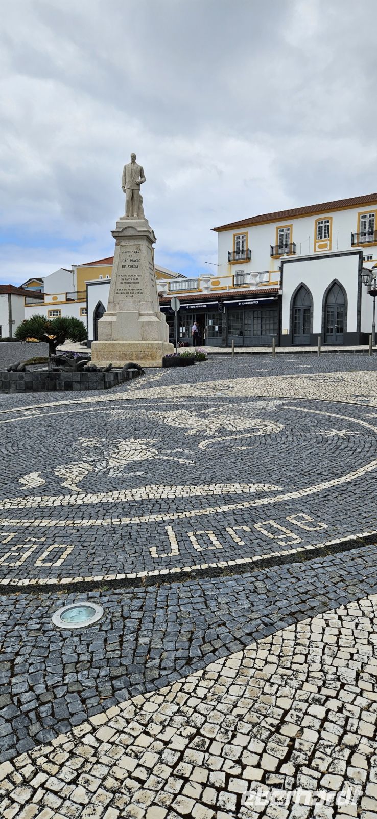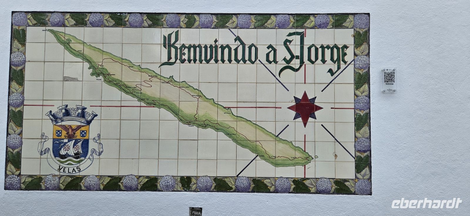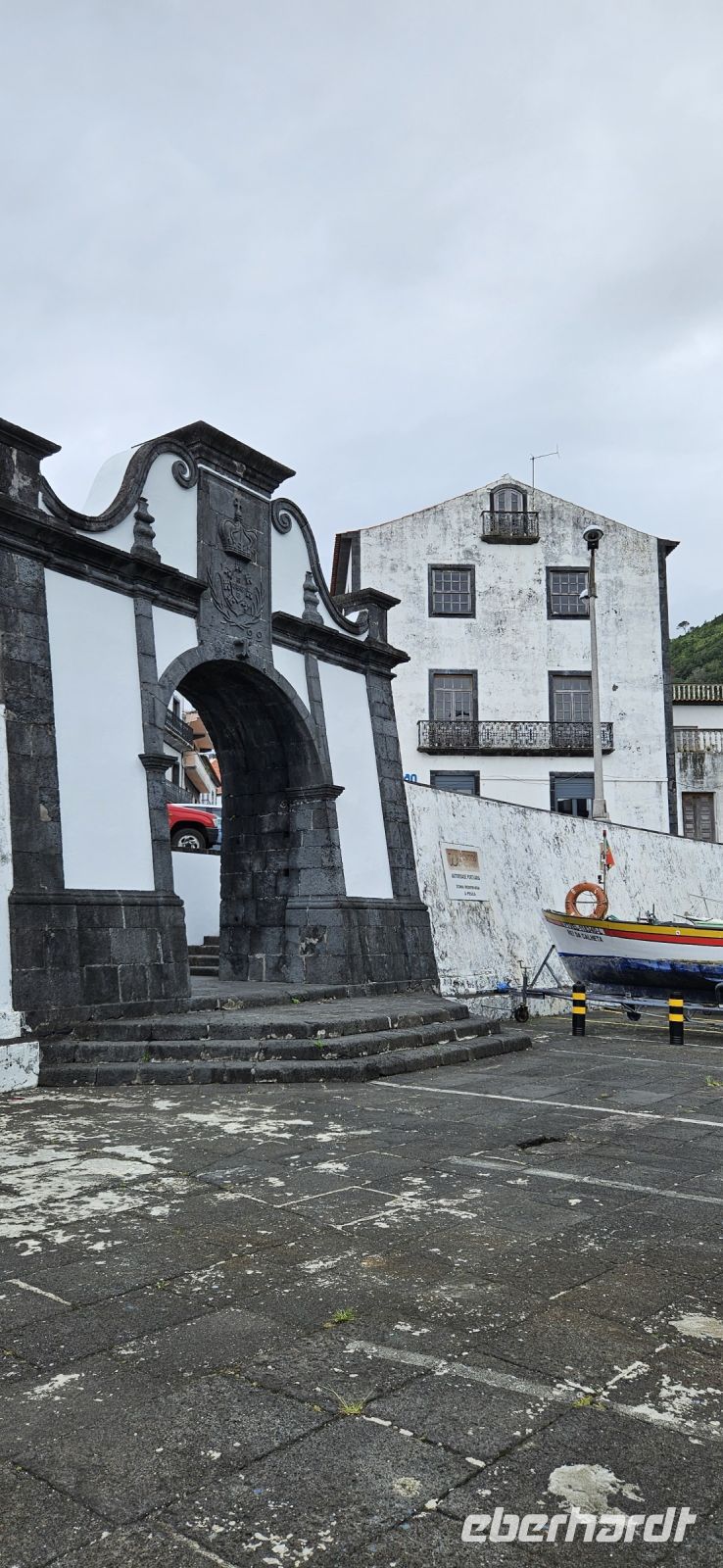 Heute nahmen wir Abschied von der Insel Pico und wechselten rüber nach Sao Jorge. Unser Bus brachte uns von der Südküste zur Nordküste zum Fährhafen Sao Roque. Unterwegs gab es ein kleines Hindernis mit einem Bagger, der ganz gemütlich die Strasse querte und uns dann vorbei ließ. Wir verabschiedeten uns von Fahrer Paolo und gingen auf die Fähre. Die Überfahrt bei schönem Wetter dauerte eine knappe Stunde und kurz vor Velas sahen wir schon unser nächstes Hotel oberhalb des Meeres liegen. In Velas auf Sao Jorge packten wir alles Gepäck in einen Bus und begaben uns zu Fuss durch das mittelalterliche Hafentor hinein in die Stadt. Am Hauptplatz mit der Kirche steht der Hl.Georg - Namensgeber für die Insel - als Denkmal auf einem Sockel und vor ihm ein Drachen, der aus einem Brunnen schaut. Wir suchten ein Lokal für unser Mittagessen und reservierten für 13 Uhr. Bis dahin spazierten wir durch die Fussgängerzone zum Stadtpark mit Rathaus gegenüber und weiter zu einem Supermarkt. Da unser nächstes Hotel recht abgelegen war, deckten wir uns mit Getränken und Kleinigkeiten für abends sicherheitshalber ein. Dann folgte unser Mittagsmenue für 10 Euro mit einem Getränk, einer Schüssel Suppe, Hauptgericht Fisch oder Fleisch und einem Kaffee. Das war reichlich und schmeckte gut und der Preis dafür unschlagbar ! 14.30 Uhr fuhren wir mit dem Bus hinauf zu unserem Hotel und checkten bei Nieselregen ein. Jede Person oder Familie bewohnte einen eigenen, großen Bungalow mit Wohn-, Schlafbereich, Küche und Bad. Manch einer wird zu Hause nicht so eine große Wohnung haben. Zur Anlage Cantinhas das Bunganvilias gehörte auch ein wunderschöner Pool und ein Restaurant, welches leider nicht geöffnet hatte. Nachdem sich jeder eingerichtet hatte und im Pool geschwommen war, erkundeten wir die kleine Bar im Ortszentrum. Dort gab es Kleinigkeiten zu essen und Bier, Wein usw. zu sensationell günstigen Preisen. So nach und nach hatte sich unsere Gruppe bei der Bar versammelt und unter einer großen Platane liessen wir den Tag ausklingen. Später wieder in unserer Anlage trafen wir uns in meinem Bungalow und jeder brachte etwas zu essen und zu trinken mit. Das war sehr gemütlich und eine gute Alternative zum geschlossenen Restaurant.