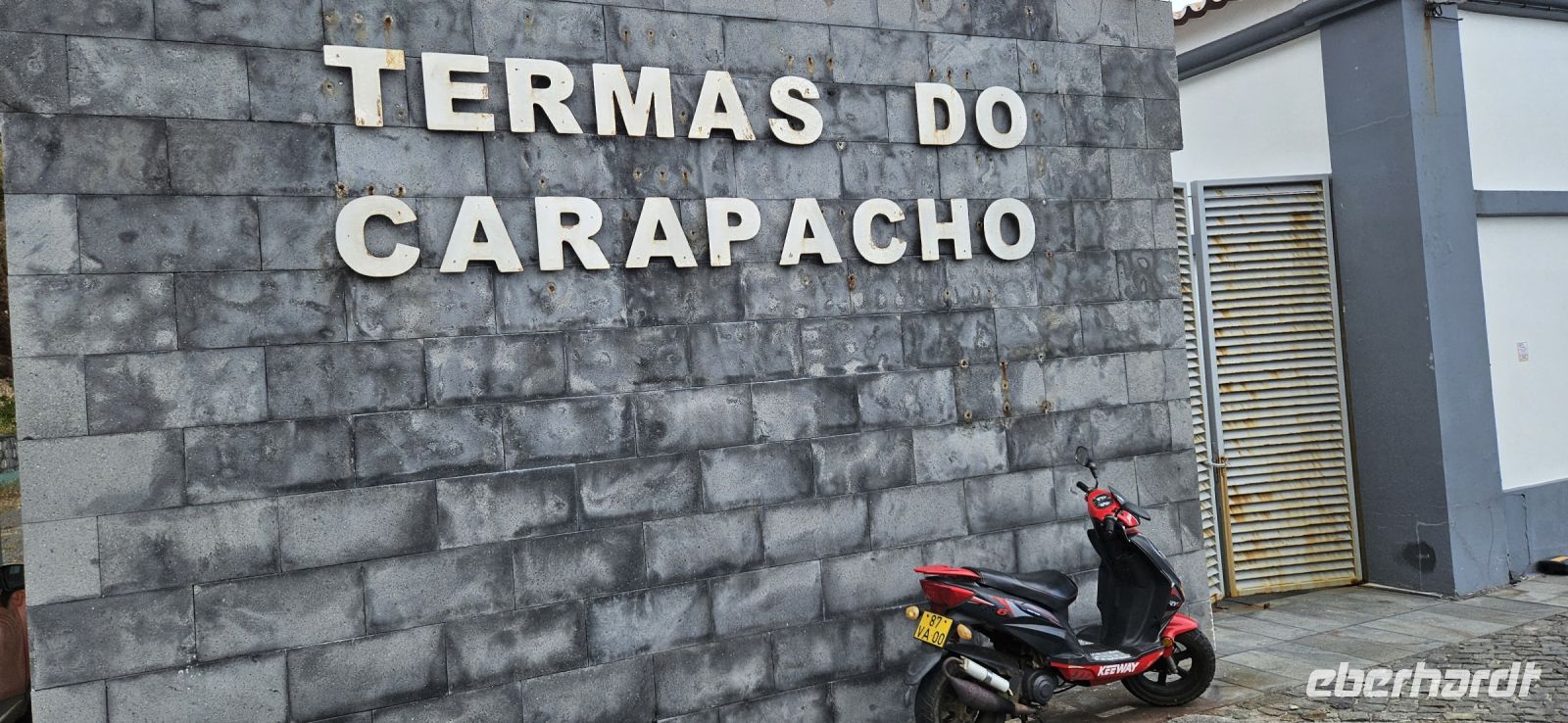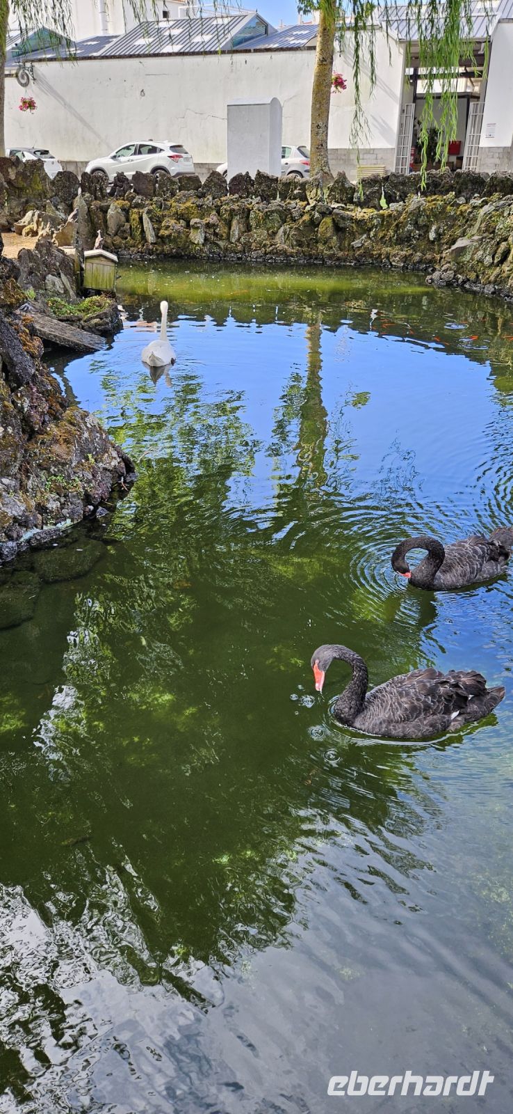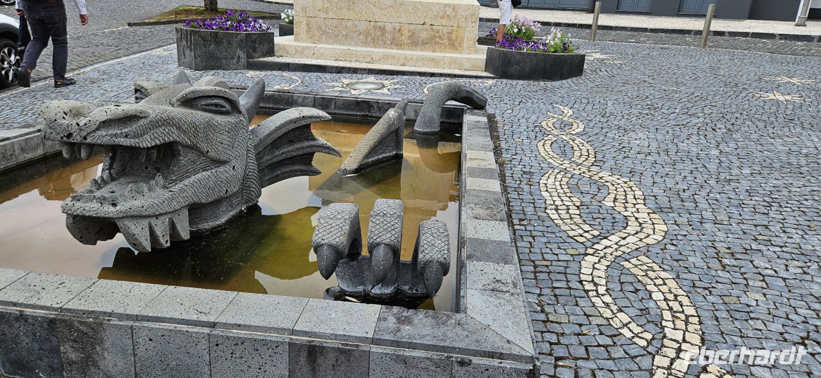 Heute nahmen wir Abschied von der Insel Pico und wechselten rüber nach Sao Jorge. Unser Bus brachte uns von der Südküste zur Nordküste zum Fährhafen Sao Roque. Unterwegs gab es ein kleines Hindernis mit einem Bagger, der ganz gemütlich die Strasse querte und uns dann vorbei ließ. Wir verabschiedeten uns von Fahrer Paolo und gingen auf die Fähre. Die Überfahrt bei schönem Wetter dauerte eine knappe Stunde und kurz vor Velas sahen wir schon unser nächstes Hotel oberhalb des Meeres liegen. In Velas auf Sao Jorge packten wir alles Gepäck in einen Bus und begaben uns zu Fuss durch das mittelalterliche Hafentor hinein in die Stadt. Am Hauptplatz mit der Kirche steht der Hl.Georg - Namensgeber für die Insel - als Denkmal auf einem Sockel und vor ihm ein Drachen, der aus einem Brunnen schaut. Wir suchten ein Lokal für unser Mittagessen und reservierten für 13 Uhr. Bis dahin spazierten wir durch die Fussgängerzone zum Stadtpark mit Rathaus gegenüber und weiter zu einem Supermarkt. Da unser nächstes Hotel recht abgelegen war, deckten wir uns mit Getränken und Kleinigkeiten für abends sicherheitshalber ein. Dann folgte unser Mittagsmenue für 10 Euro mit einem Getränk, einer Schüssel Suppe, Hauptgericht Fisch oder Fleisch und einem Kaffee. Das war reichlich und schmeckte gut und der Preis dafür unschlagbar ! 14.30 Uhr fuhren wir mit dem Bus hinauf zu unserem Hotel und checkten bei Nieselregen ein. Jede Person oder Familie bewohnte einen eigenen, großen Bungalow mit Wohn-, Schlafbereich, Küche und Bad. Manch einer wird zu Hause nicht so eine große Wohnung haben. Zur Anlage Cantinhas das Bunganvilias gehörte auch ein wunderschöner Pool und ein Restaurant, welches leider nicht geöffnet hatte. Nachdem sich jeder eingerichtet hatte und im Pool geschwommen war, erkundeten wir die kleine Bar im Ortszentrum. Dort gab es Kleinigkeiten zu essen und Bier, Wein usw. zu sensationell günstigen Preisen. So nach und nach hatte sich unsere Gruppe bei der Bar versammelt und unter einer großen Platane liessen wir den Tag ausklingen. Später wieder in unserer Anlage trafen wir uns in meinem Bungalow und jeder brachte etwas zu essen und zu trinken mit. Das war sehr gemütlich und eine gute Alternative zum geschlossenen Restaurant.
