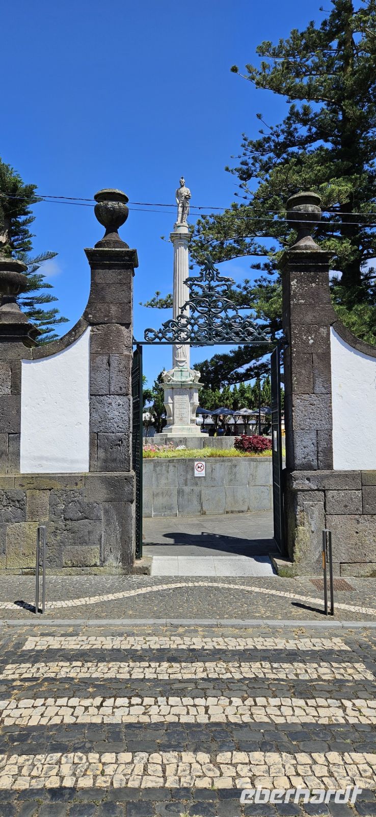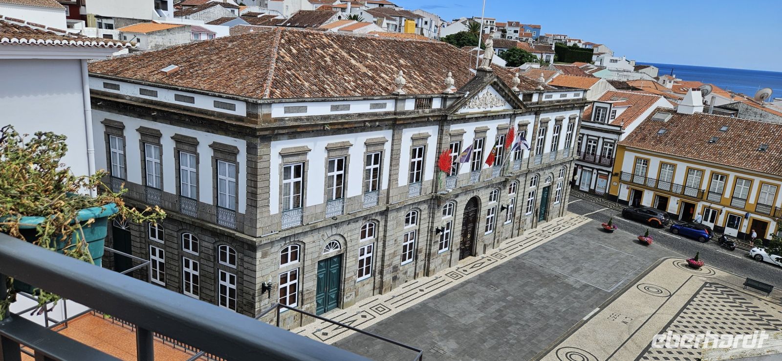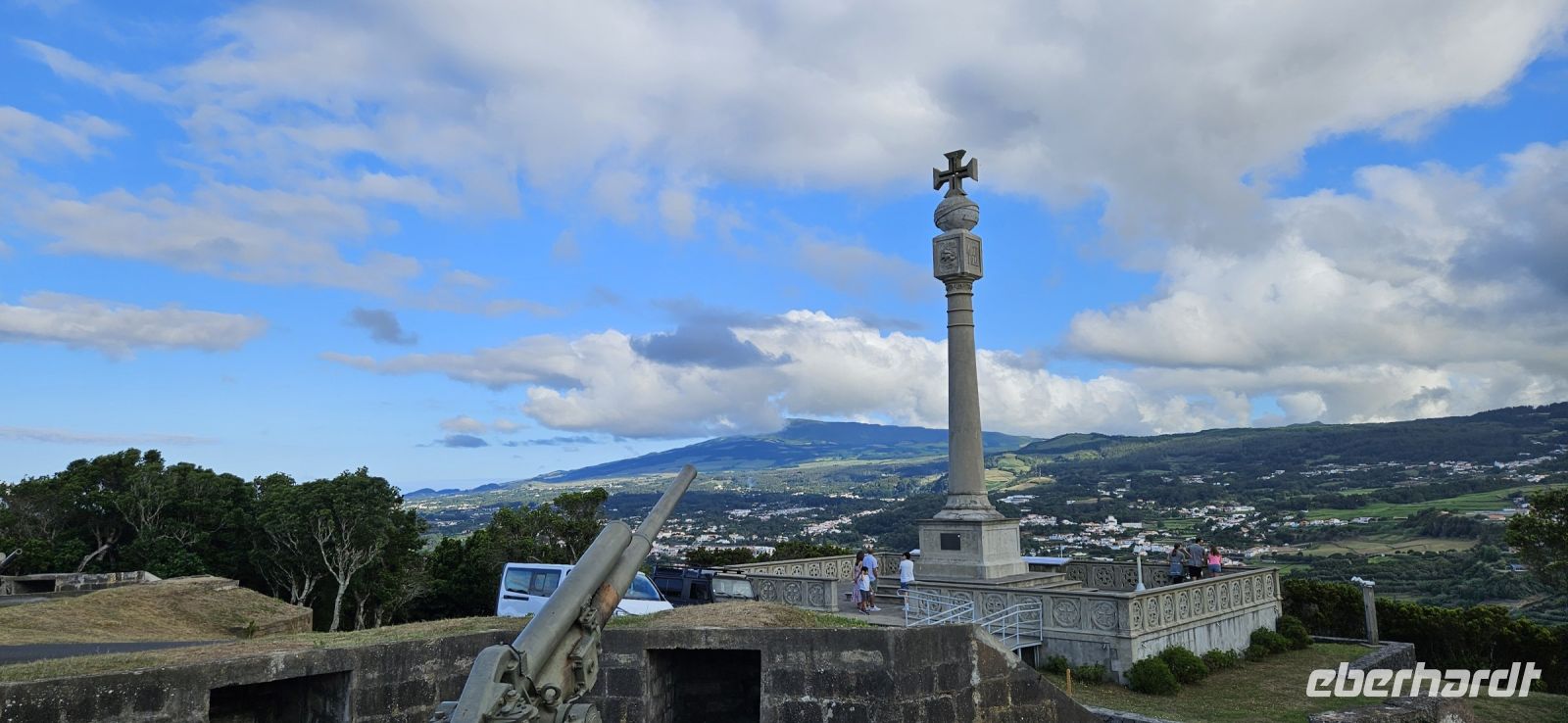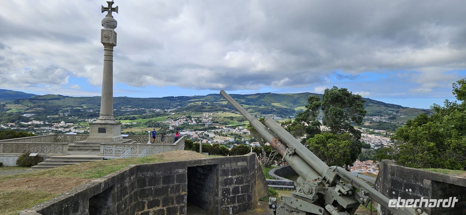Nach dem Frühstück brachten uns die Kleinbusse zum Flughafen um die Ecke auf der Insel Flores und dort verabschiedeten wir uns von den Fahrern und ich meldete mich schon mal an für die nächste Tour in 4 Wochen. Der Flug von Flores nach Terceira dauerte eine Stunde und bot nach dem Start eine gute Sicht auf das Hochland von Flores mit den Seen. In Terceira verabschiedeten wir uns von Melinda, die gleich nach Graciosa weiter flog, und wir wurden von unserer Reiseleiterin Marisa empfangen und sie brachte uns vom Norden der Insel in den Süden nach Angra. Wir stellten unsere Koffer ab im Hotel Azoris Angra Garden mitten in der Stadt. Danach war Freizeit und ein Großteil der Gruppe spazierte mit mir durch den wunderschönen Park hinter dem Hotel bis hinauf zum Obelisken. Der Obelisk steht auf den Grundmauern der ersten Festung und man hat einen wunderbaren Blick über die Stadt Angra bis hin zum Monte Brazil. Durch den Park gingen wir dann bergab und verliessen ihn bei der ehemaligen Jesuitenkirche. Dort gibt es unter einer riesigen Araukarie ein kleines Restaurant mit vielen Tischen unter Sonnenschirmen. Wir fanden gleich Platz und machten eine ausgiebige Mittagspause. Junge Leute bedienten uns in ihren Ferien und waren sehr aufmerksam. Nach dem Essen gönnten wir uns ein Eis und spazierten hinunter zum Hafen. 15 Uhr waren wir zurück im Hotel und checkten ein. Das Hotel Azoris Angra Garden hat einen sehr guten Ruf mit seiner zentralen Lage in der UNESCO Weltkulturerbe Stadt Angra. Nur für uns war es deutlich zu laut, weil wir bis dahin in sehr ruhigen und abgelegenen Hotels gewohnt hatten. Ich versuchte die Zimmer zur Strasse zu tauschen in Zimmer zum Park. Aber es gelang nur für ein Zimmer weil das Hotel völlig ausgebucht war.