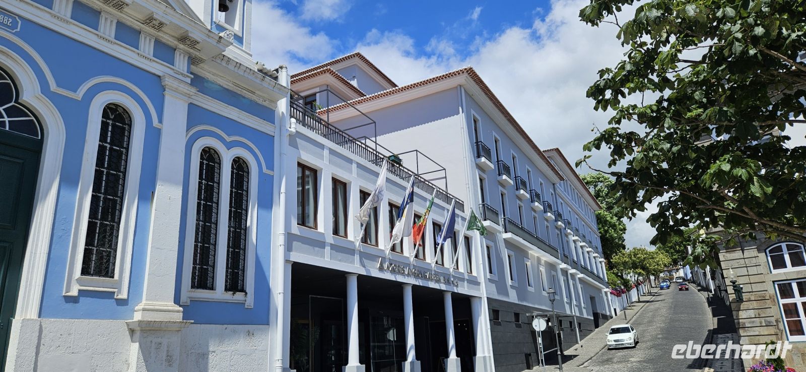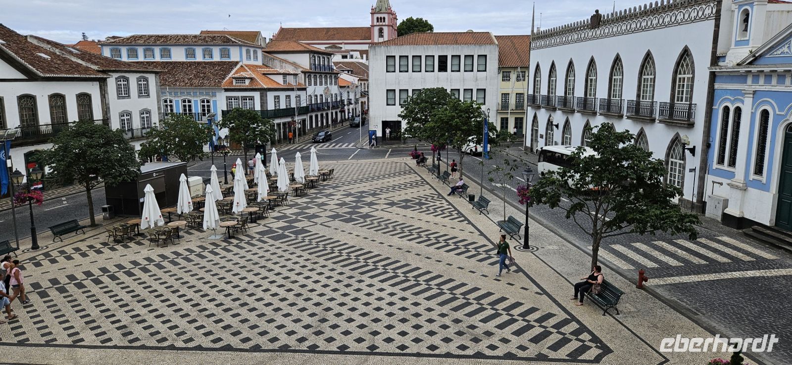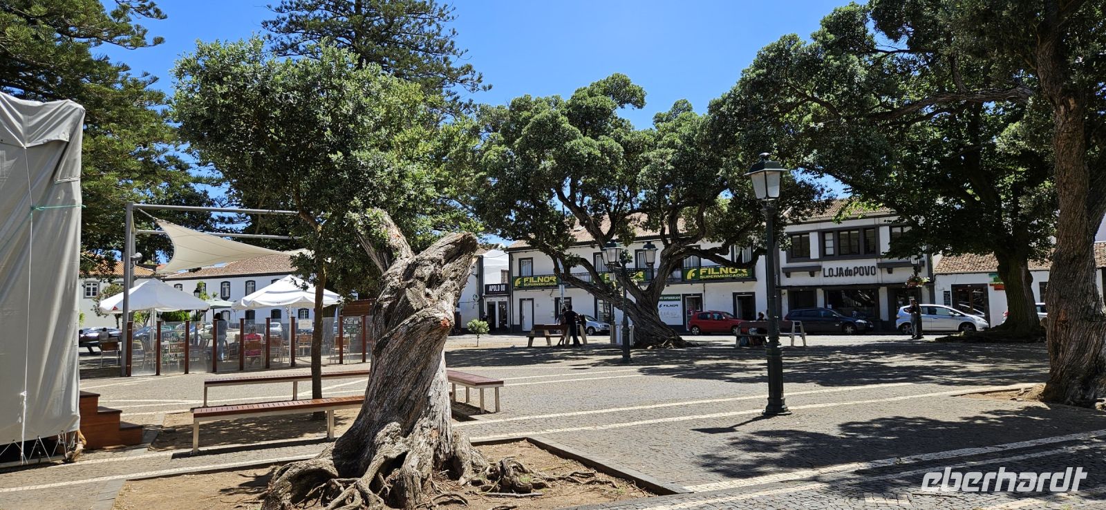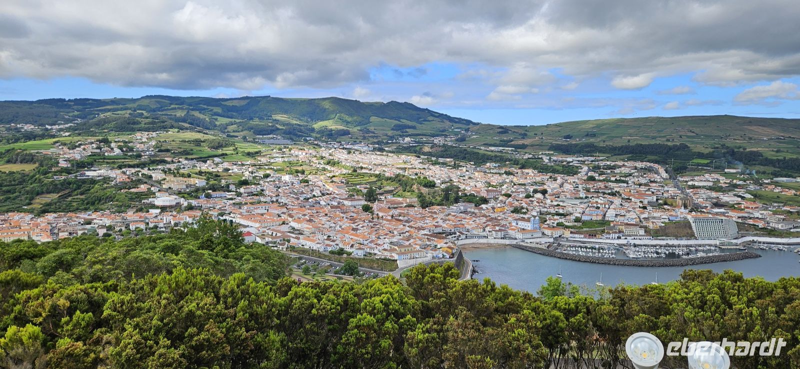 Nach dem Frühstück brachten uns die Kleinbusse zum Flughafen um die Ecke auf der Insel Flores und dort verabschiedeten wir uns von den Fahrern und ich meldete mich schon mal an für die nächste Tour in 4 Wochen. Der Flug von Flores nach Terceira dauerte eine Stunde und bot nach dem Start eine gute Sicht auf das Hochland von Flores mit den Seen. In Terceira verabschiedeten wir uns von Melinda, die gleich nach Graciosa weiter flog, und wir wurden von unserer Reiseleiterin Marisa empfangen und sie brachte uns vom Norden der Insel in den Süden nach Angra. Wir stellten unsere Koffer ab im Hotel Azoris Angra Garden mitten in der Stadt. Danach war Freizeit und ein Großteil der Gruppe spazierte mit mir durch den wunderschönen Park hinter dem Hotel bis hinauf zum Obelisken. Der Obelisk steht auf den Grundmauern der ersten Festung und man hat einen wunderbaren Blick über die Stadt Angra bis hin zum Monte Brazil. Durch den Park gingen wir dann bergab und verliessen ihn bei der ehemaligen Jesuitenkirche. Dort gibt es unter einer riesigen Araukarie ein kleines Restaurant mit vielen Tischen unter Sonnenschirmen. Wir fanden gleich Platz und machten eine ausgiebige Mittagspause. Junge Leute bedienten uns in ihren Ferien und waren sehr aufmerksam. Nach dem Essen gönnten wir uns ein Eis und spazierten hinunter zum Hafen. 15 Uhr waren wir zurück im Hotel und checkten ein. Das Hotel Azoris Angra Garden hat einen sehr guten Ruf mit seiner zentralen Lage in der UNESCO Weltkulturerbe Stadt Angra. Nur für uns war es deutlich zu laut, weil wir bis dahin in sehr ruhigen und abgelegenen Hotels gewohnt hatten. Ich versuchte die Zimmer zur Strasse zu tauschen in Zimmer zum Park. Aber es gelang nur für ein Zimmer weil das Hotel völlig ausgebucht war.