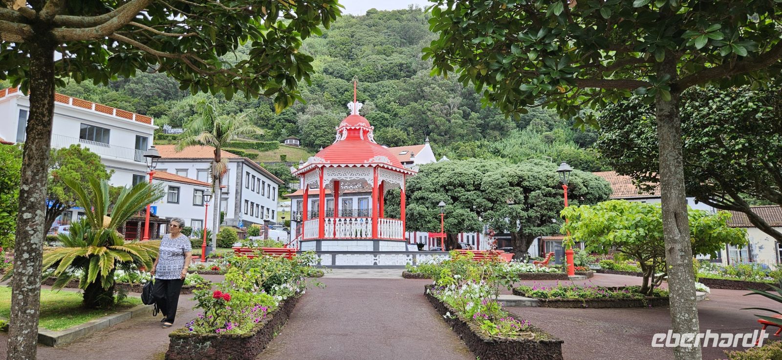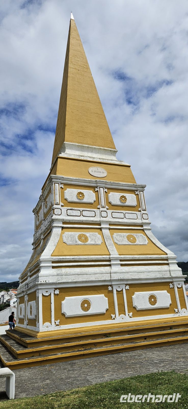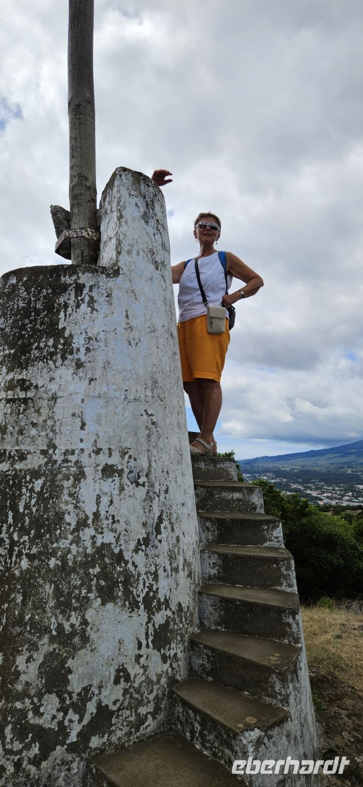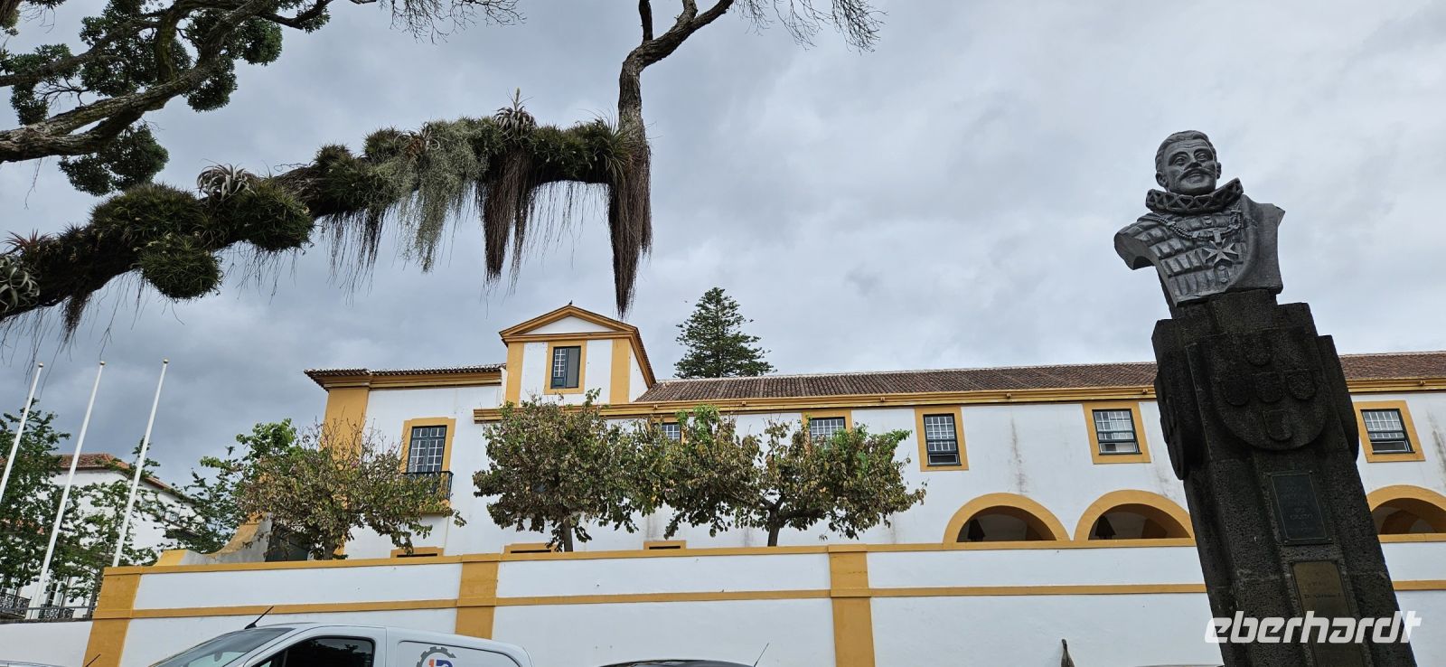 Nach dem Frühstück brachten uns die Kleinbusse zum Flughafen um die Ecke auf der Insel Flores und dort verabschiedeten wir uns von den Fahrern und ich meldete mich schon mal an für die nächste Tour in 4 Wochen. Der Flug von Flores nach Terceira dauerte eine Stunde und bot nach dem Start eine gute Sicht auf das Hochland von Flores mit den Seen. In Terceira verabschiedeten wir uns von Melinda, die gleich nach Graciosa weiter flog, und wir wurden von unserer Reiseleiterin Marisa empfangen und sie brachte uns vom Norden der Insel in den Süden nach Angra. Wir stellten unsere Koffer ab im Hotel Azoris Angra Garden mitten in der Stadt. Danach war Freizeit und ein Großteil der Gruppe spazierte mit mir durch den wunderschönen Park hinter dem Hotel bis hinauf zum Obelisken. Der Obelisk steht auf den Grundmauern der ersten Festung und man hat einen wunderbaren Blick über die Stadt Angra bis hin zum Monte Brazil. Durch den Park gingen wir dann bergab und verliessen ihn bei der ehemaligen Jesuitenkirche. Dort gibt es unter einer riesigen Araukarie ein kleines Restaurant mit vielen Tischen unter Sonnenschirmen. Wir fanden gleich Platz und machten eine ausgiebige Mittagspause. Junge Leute bedienten uns in ihren Ferien und waren sehr aufmerksam. Nach dem Essen gönnten wir uns ein Eis und spazierten hinunter zum Hafen. 15 Uhr waren wir zurück im Hotel und checkten ein. Das Hotel Azoris Angra Garden hat einen sehr guten Ruf mit seiner zentralen Lage in der UNESCO Weltkulturerbe Stadt Angra. Nur für uns war es deutlich zu laut, weil wir bis dahin in sehr ruhigen und abgelegenen Hotels gewohnt hatten. Ich versuchte die Zimmer zur Strasse zu tauschen in Zimmer zum Park. Aber es gelang nur für ein Zimmer weil das Hotel völlig ausgebucht war.