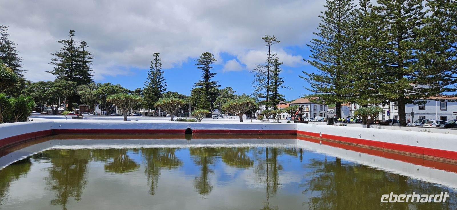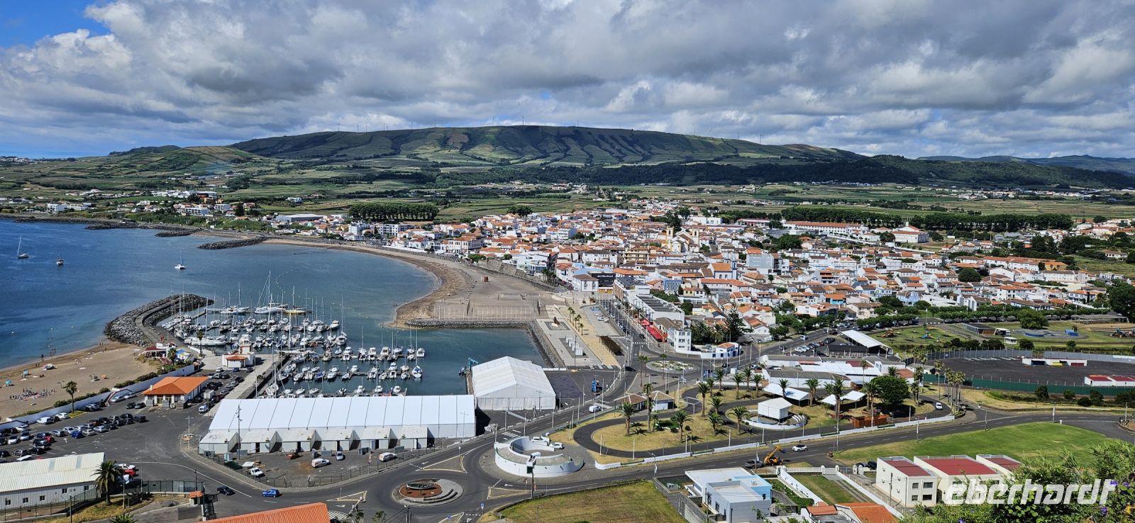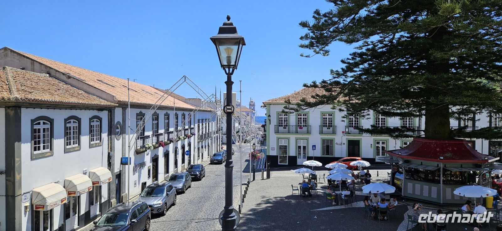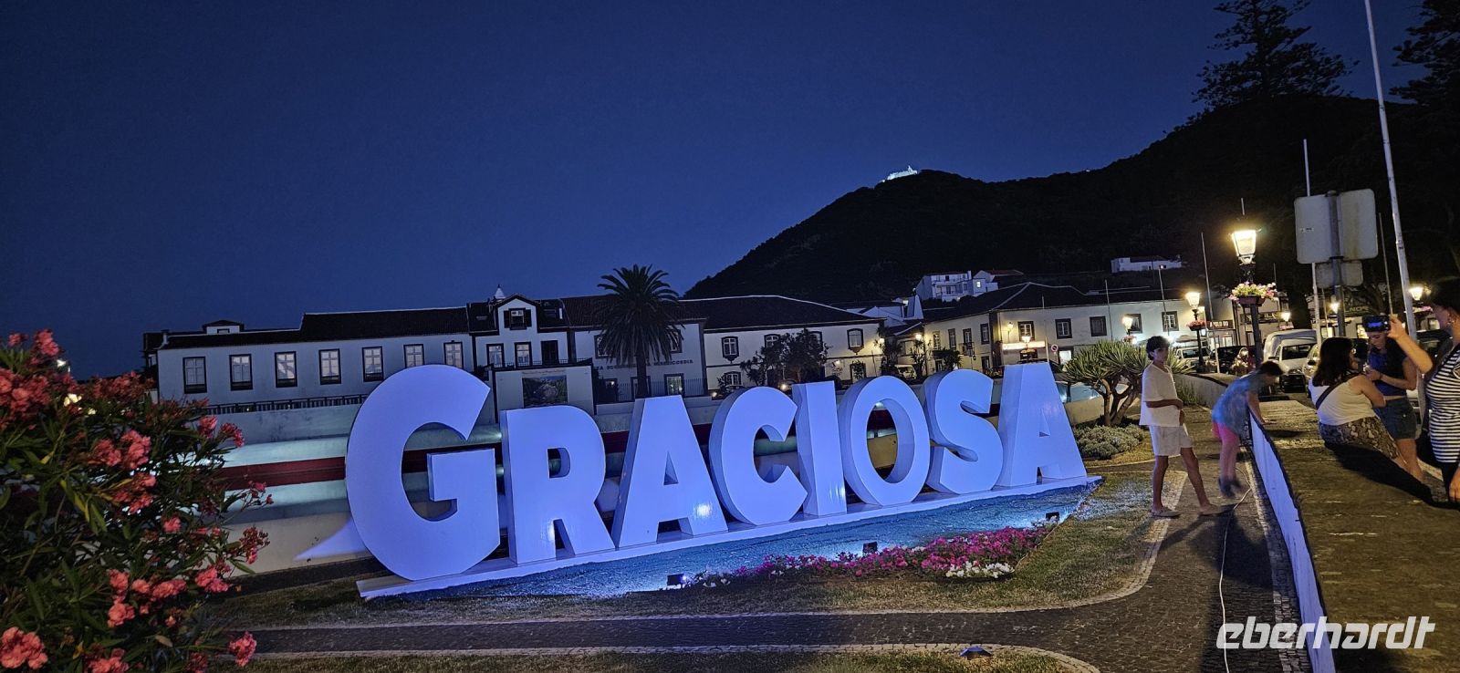 Nach dem Frühstück brachten uns die Kleinbusse zum Flughafen um die Ecke auf der Insel Flores und dort verabschiedeten wir uns von den Fahrern und ich meldete mich schon mal an für die nächste Tour in 4 Wochen. Der Flug von Flores nach Terceira dauerte eine Stunde und bot nach dem Start eine gute Sicht auf das Hochland von Flores mit den Seen. In Terceira verabschiedeten wir uns von Melinda, die gleich nach Graciosa weiter flog, und wir wurden von unserer Reiseleiterin Marisa empfangen und sie brachte uns vom Norden der Insel in den Süden nach Angra. Wir stellten unsere Koffer ab im Hotel Azoris Angra Garden mitten in der Stadt. Danach war Freizeit und ein Großteil der Gruppe spazierte mit mir durch den wunderschönen Park hinter dem Hotel bis hinauf zum Obelisken. Der Obelisk steht auf den Grundmauern der ersten Festung und man hat einen wunderbaren Blick über die Stadt Angra bis hin zum Monte Brazil. Durch den Park gingen wir dann bergab und verliessen ihn bei der ehemaligen Jesuitenkirche. Dort gibt es unter einer riesigen Araukarie ein kleines Restaurant mit vielen Tischen unter Sonnenschirmen. Wir fanden gleich Platz und machten eine ausgiebige Mittagspause. Junge Leute bedienten uns in ihren Ferien und waren sehr aufmerksam. Nach dem Essen gönnten wir uns ein Eis und spazierten hinunter zum Hafen. 15 Uhr waren wir zurück im Hotel und checkten ein. Das Hotel Azoris Angra Garden hat einen sehr guten Ruf mit seiner zentralen Lage in der UNESCO Weltkulturerbe Stadt Angra. Nur für uns war es deutlich zu laut, weil wir bis dahin in sehr ruhigen und abgelegenen Hotels gewohnt hatten. Ich versuchte die Zimmer zur Strasse zu tauschen in Zimmer zum Park. Aber es gelang nur für ein Zimmer weil das Hotel völlig ausgebucht war.