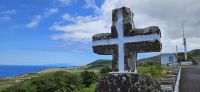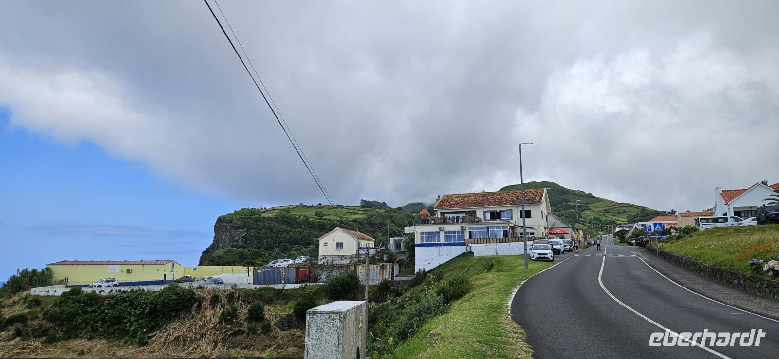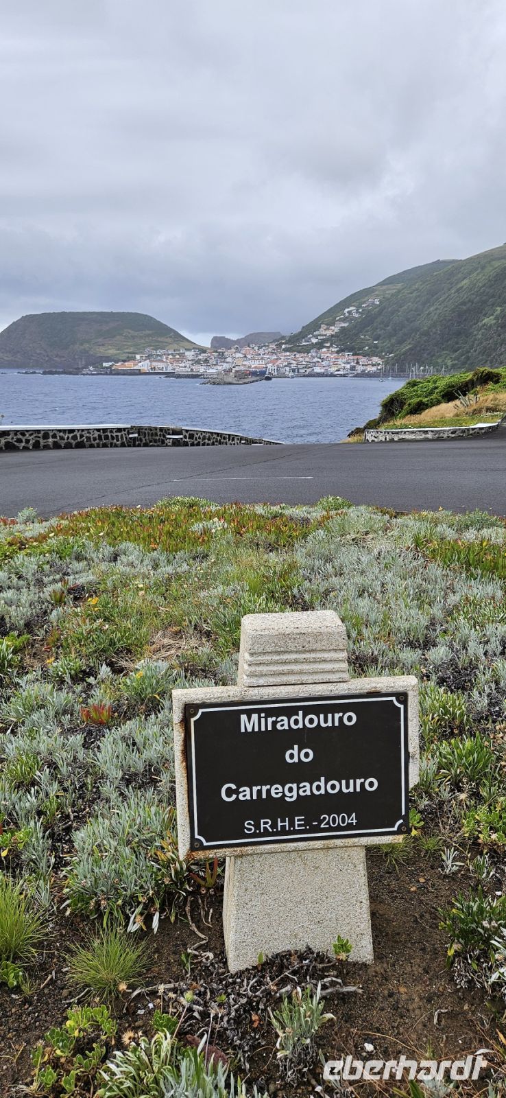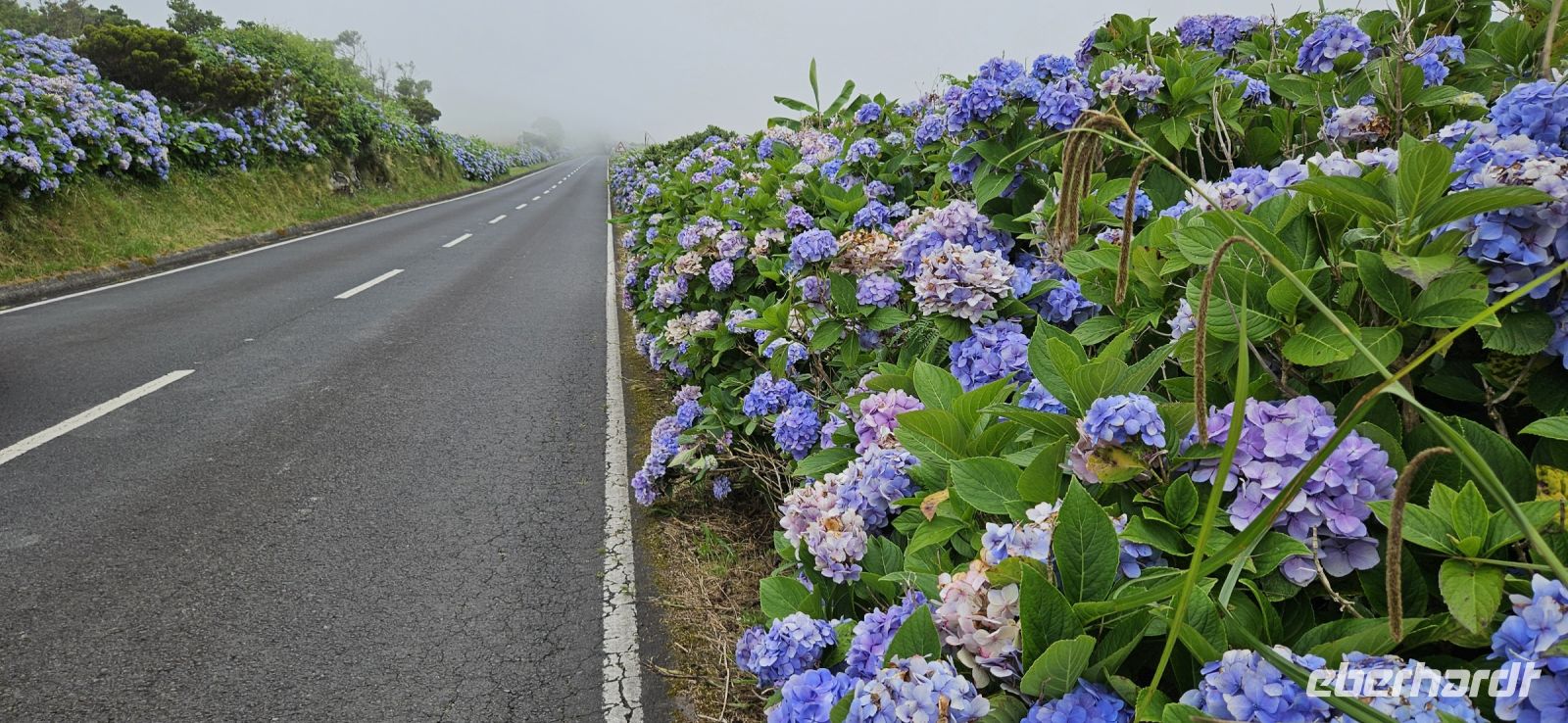 Nach dem Frühstück standen 2 Kleinbusse und ein Taxi bereit zur Inselrundfahrt Flores. Unsere Route führte zunächst immer küstennah an der Ostküste der Insel nach Norden. Wir machten mehrere Fotostopps und sahen unser Inatel auf einem Felsplateau liegen. Auch die Insel Corvo und die zerklüfftete Steilküste boten immer wieder tolle Fotomotive. Oberhalb von Ponta Delgada gab es eine Kirche und ein Kreuz am Aussichtspunkt und eine wackelige Holzbank, die nicht einmal unsere leichtgewichtige Reiseleiterin Melinda tragen konnte und einbrach. Danach standen die Seen im Hochland auf dem Programm, aber in dieser Höhenlage waren wir in den Wolken und konnten die Seen weit unten nur erahnen. Lediglich ein Blick in die Caldeira Seca war möglich. An den Aussichtspunkten gab es Schautafeln, auf denen Fotos der Seen und die topografische Lage gezeigt wurden. Wir verliessen das Hochland und fuhren ganz in den Süden nach Lajes das Flores. Dort befindet sich der Hafen der Insel und wir machten unsere Mittagspause in einem Lokal, welches auch von Einheimischen gut besucht war. Aus einem reichhaltigen Buffet konnte sich jeder seinen Mittagsteller zusammenstellen und alle Gerichte waren sehr schmackhaft. Auf der Weiterfahrt war ein Halt beim Basaltfelsen Rocha dos Bordoes geplant, aber auch der hüllte sich leider in Wolken. So hielten wir an einer mit Hortensien gesäumten Strasse und machten dort unsere Fotos. Nun ging die Fahrt an der Westküste weiter gen Norden in die Faja Grande zu den Wasserfällen. Zuerst spazierten wir zu dem nahe der Strasse gelegenen Wasserfall Poco do Bacalhau und anschliessend wanderten wir steil bergan zu den Wasserfällen Ribeira do Ferreiro. Letztere waren sehr beeindruckend in einer üppig grünen Landschaft mit einem See davor. Auf der Rückfahrt gab es noch einen letzten Fotostopp und wir bedankten uns bei den 3 Fahrern des Tages.