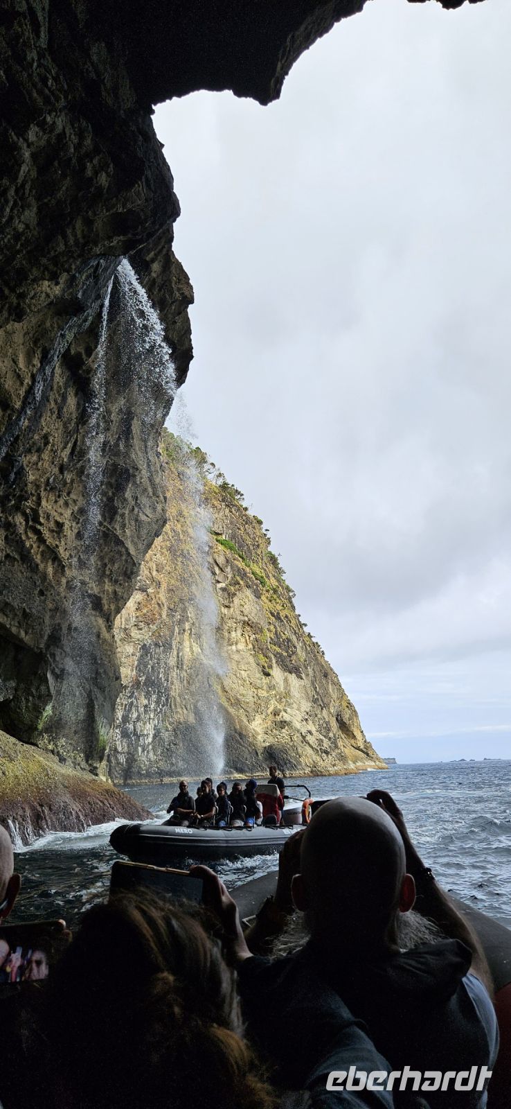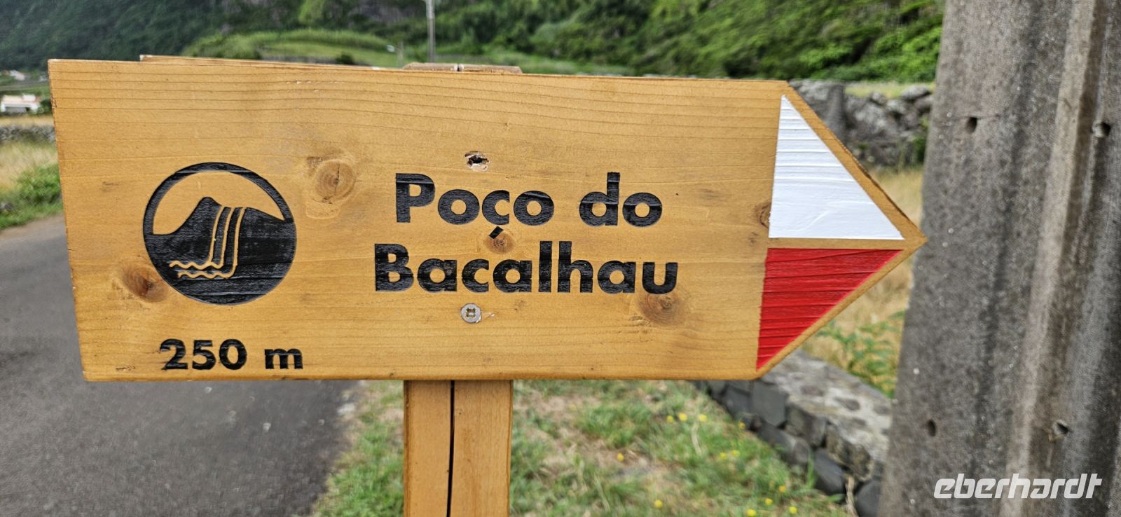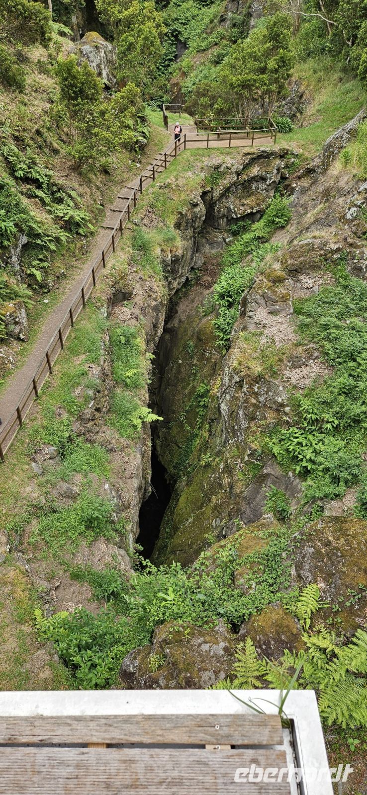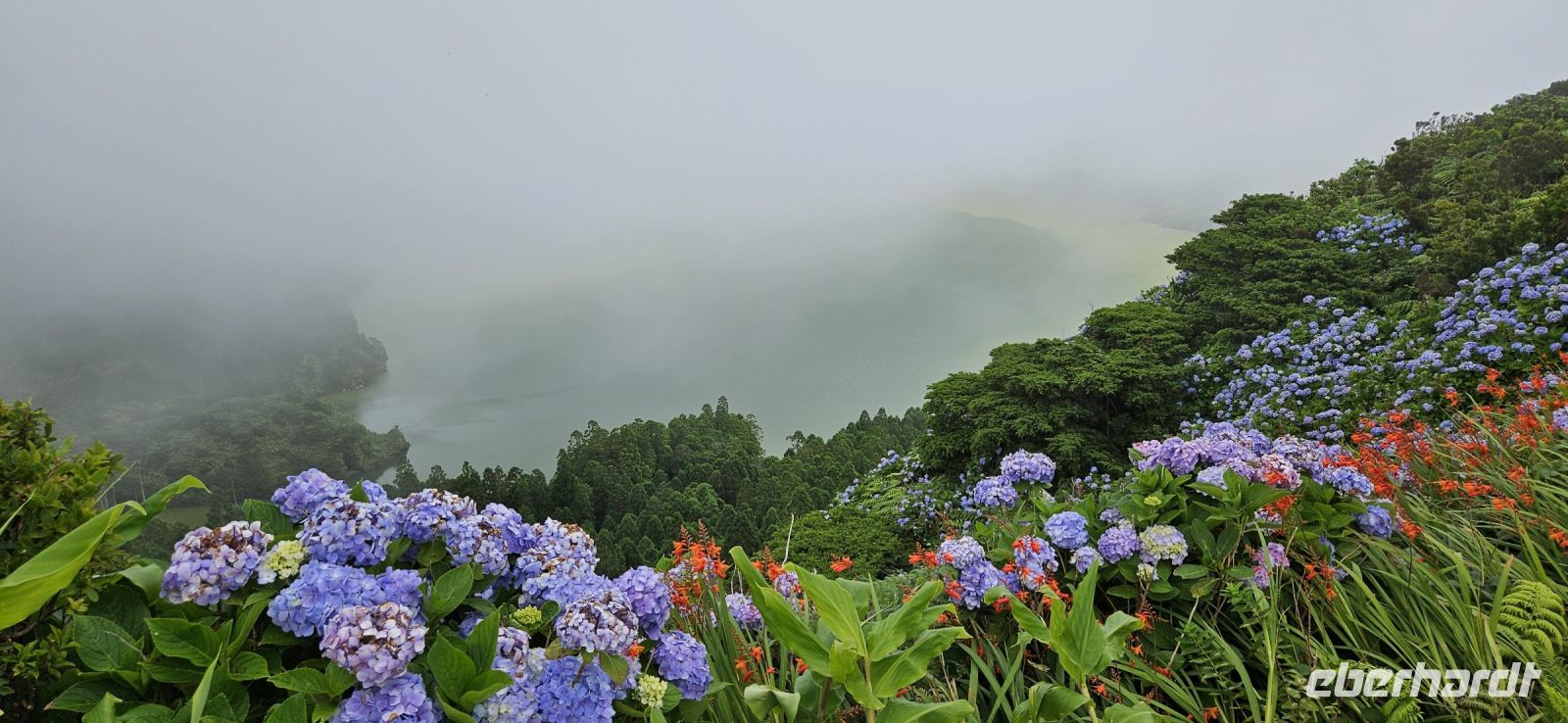 Nach dem Frühstück standen 2 Kleinbusse und ein Taxi bereit zur Inselrundfahrt Flores. Unsere Route führte zunächst immer küstennah an der Ostküste der Insel nach Norden. Wir machten mehrere Fotostopps und sahen unser Inatel auf einem Felsplateau liegen. Auch die Insel Corvo und die zerklüfftete Steilküste boten immer wieder tolle Fotomotive. Oberhalb von Ponta Delgada gab es eine Kirche und ein Kreuz am Aussichtspunkt und eine wackelige Holzbank, die nicht einmal unsere leichtgewichtige Reiseleiterin Melinda tragen konnte und einbrach. Danach standen die Seen im Hochland auf dem Programm, aber in dieser Höhenlage waren wir in den Wolken und konnten die Seen weit unten nur erahnen. Lediglich ein Blick in die Caldeira Seca war möglich. An den Aussichtspunkten gab es Schautafeln, auf denen Fotos der Seen und die topografische Lage gezeigt wurden. Wir verliessen das Hochland und fuhren ganz in den Süden nach Lajes das Flores. Dort befindet sich der Hafen der Insel und wir machten unsere Mittagspause in einem Lokal, welches auch von Einheimischen gut besucht war. Aus einem reichhaltigen Buffet konnte sich jeder seinen Mittagsteller zusammenstellen und alle Gerichte waren sehr schmackhaft. Auf der Weiterfahrt war ein Halt beim Basaltfelsen Rocha dos Bordoes geplant, aber auch der hüllte sich leider in Wolken. So hielten wir an einer mit Hortensien gesäumten Strasse und machten dort unsere Fotos. Nun ging die Fahrt an der Westküste weiter gen Norden in die Faja Grande zu den Wasserfällen. Zuerst spazierten wir zu dem nahe der Strasse gelegenen Wasserfall Poco do Bacalhau und anschliessend wanderten wir steil bergan zu den Wasserfällen Ribeira do Ferreiro. Letztere waren sehr beeindruckend in einer üppig grünen Landschaft mit einem See davor. Auf der Rückfahrt gab es noch einen letzten Fotostopp und wir bedankten uns bei den 3 Fahrern des Tages.