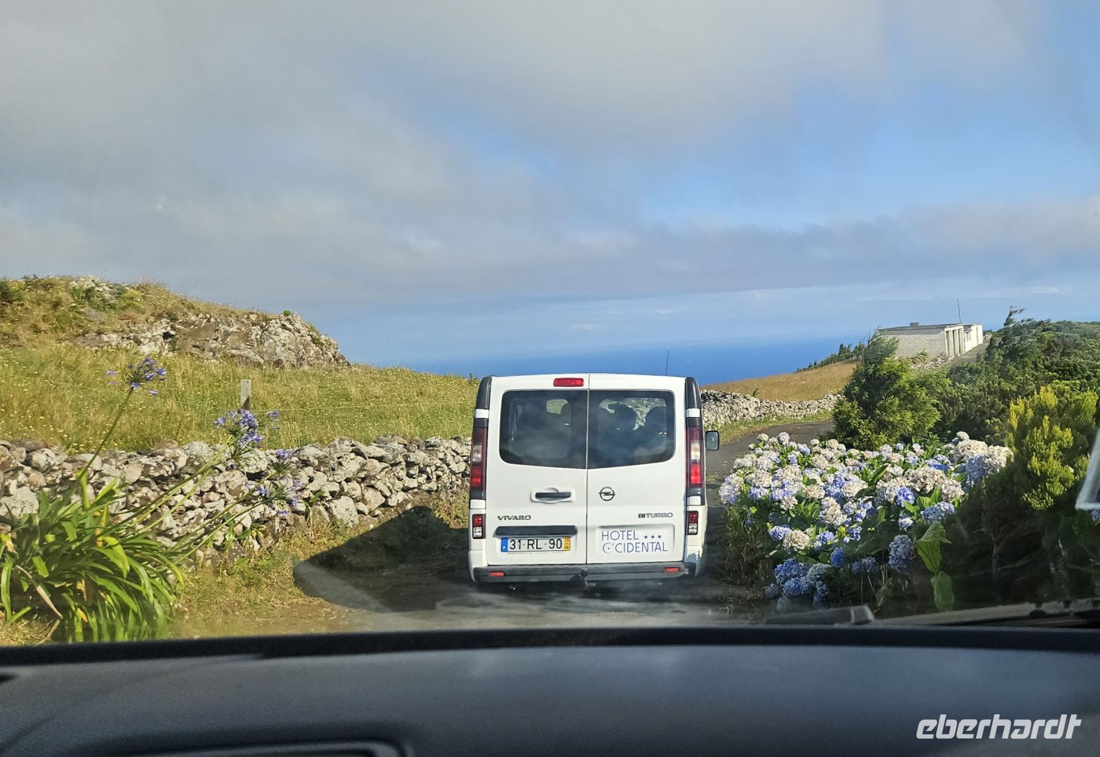 Nach dem Frühstück im Hotel bekamen wir unser Picknick für den Tag und fuhren zum Hafen. Das Speedboot kannten wir schon von der Walbeobachtung und mit Bootsführer Carlos fuhren wir los Richtung Insel Corvo. Zunächst zeigte uns Carlos die Felsformationen an der Küste von Flores mit Höhlen und Wasserfällen. Danach ging es direkt nach Corvo, auf die kleinste Insel der Azoren. Vom Hafen wurden wir mit Pkws abgeholt und hinauf zum Kraterrand auf reichlich 500 m Höhe gebracht. Da oben war wunderbares Wetter und wir konnten in den Boden der Caldeira mit den Seen hineinschauen. So stand der Wanderung hinein in die Caldeira nichts im Wege und wir begannen sogleich mit dem Abstieg. In der Caldeira grasten Kühe mit ihren Kälbern und die steilen Hänge waren mit blau blühenden Hortensien gesäumt. Unten in der Caldeira gab es zwei Seen, die auf einem markierten Wanderweg umrundet werden konnten. Jeder wanderte soweit wie er/sie wollte und stieg dann wieder auf und ein Teil der Gruppe ging mit Melinda und mir die gesamte Runde um die Seen. Melinda betonte immer wieder, welches Glück wir mit dem Wetter hatten und wie oft sie den Caldeira Boden überhaupt nicht sah. Als wir alle wieder oben am Caldeira Rand standen, konnten wir sogar über die Caldeira bis zum Meer sehen. Die beiden Fahrer, aus Brasilien und Lissabon stammend, brachten uns wieder zurück nach Vila do Corvo und zeigten uns bei einem Halt am Strassenrand stolz ihr neues Zuhause. Für 420 Einwohner gibt es einen Hafen, Flughafen, Kindergarten, eine Schule mit 45 Schüler, wo man bis zum Abitur von 22 Lehrern unterrichtet wird, ein Altenheim, Hotel, Polizeistation mit einer Zelle für Bösewichte, Post, 3 Windmühlen und eine Bar u.v.m.