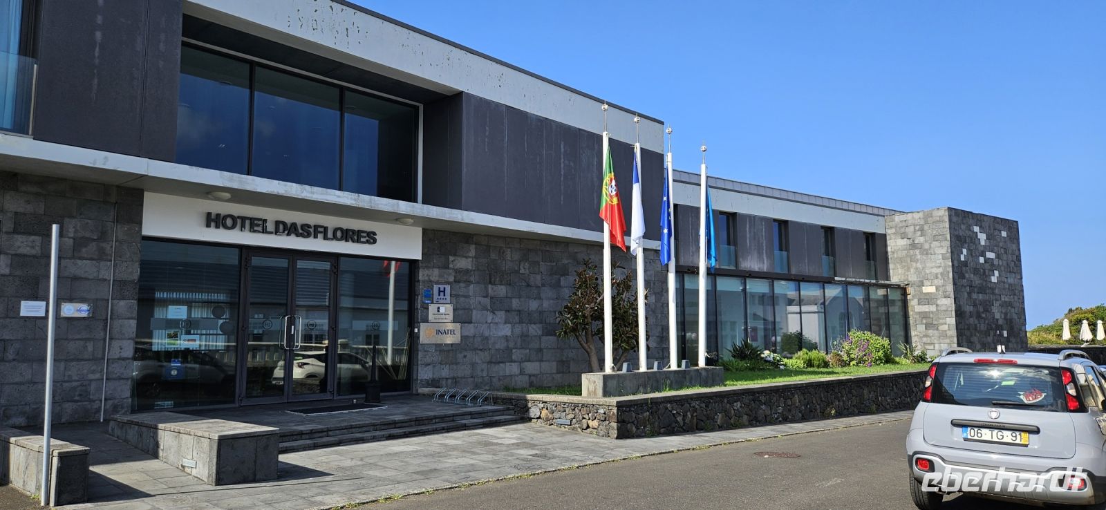 Bereits kurz nach 6 Uhr holte uns der Bus ab und brachte uns runter nach Velas zum Fährhafen. Da stand Melinda mit unseren Fährtickets. Wir gaben unsere Koffer ab und gingen auf die Fähre. Die Überfahrt ging zunächst zur Insel Pico und dann weiter auf die Insel Faial. In Horta auf Faial stand wieder ein Bus bereit und wir packten alles hinein, was wir nicht brauchten für den Stadtrundgang. Zu Fuss begaben wir uns dann durch Horta mit Besuch der Markthalle und der Hauptkirche zur Marina. An den Hafenmauern hinterlassen die Segler, die Station in Horta machen, ein gemaltes Bild und für diese "Galerie" brauchte man einen Tag, um alle Bilder zu betrachten. Wir gingen an der Hafenmauer entlang, vorbei an der alten Festung zum legendären Peter Cafe Sport und gönnten uns einen Gin Tonic mit Blick hinüber zum Pico. Auch unser Mittagessen nahmen wir bei Peter ein auf der neuen Terrasse am Hafen. Die Suppe und das Knoblauchbrot waren die Renner unserer Gruppe. Und der eine und andere Gin Tonic wurde auch noch getrunken. Am Hotel Do Canal erwartete uns der Bus wieder und brachte uns zum Flughafen von Horta. Wir konnten gleich einchecken und das Gepäck abgeben und dann die Wartezeit entspannt auf der Terrasse des Flughafens mit Blick zum Pico und auf die Start- und Landebahn verbringen. Nach einer knappen Stunde Flugzeit erreichten wir die Insel Flores. Der Weg zu unserem Hotel war nicht weit, dennoch fuhr ein Transferfahrzeug erst einmal zum falschen Hotel. Der Fehler wurde schnell bemerkt und so trafen wir uns alle im Inatel wieder. Wir bekamen alle wunderschöne Zimmer mit Balkon und Blick über das Meer zur Insel Corvo.