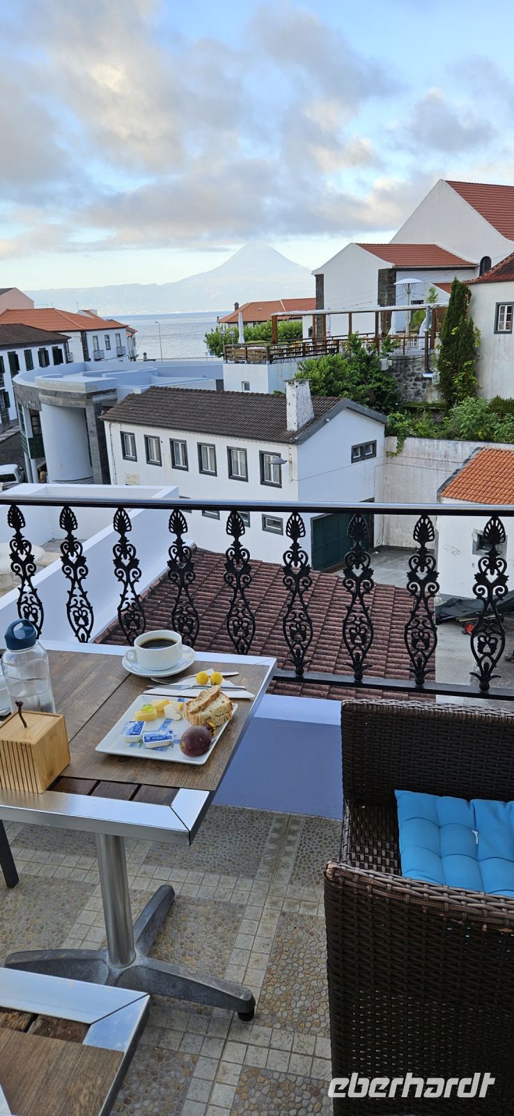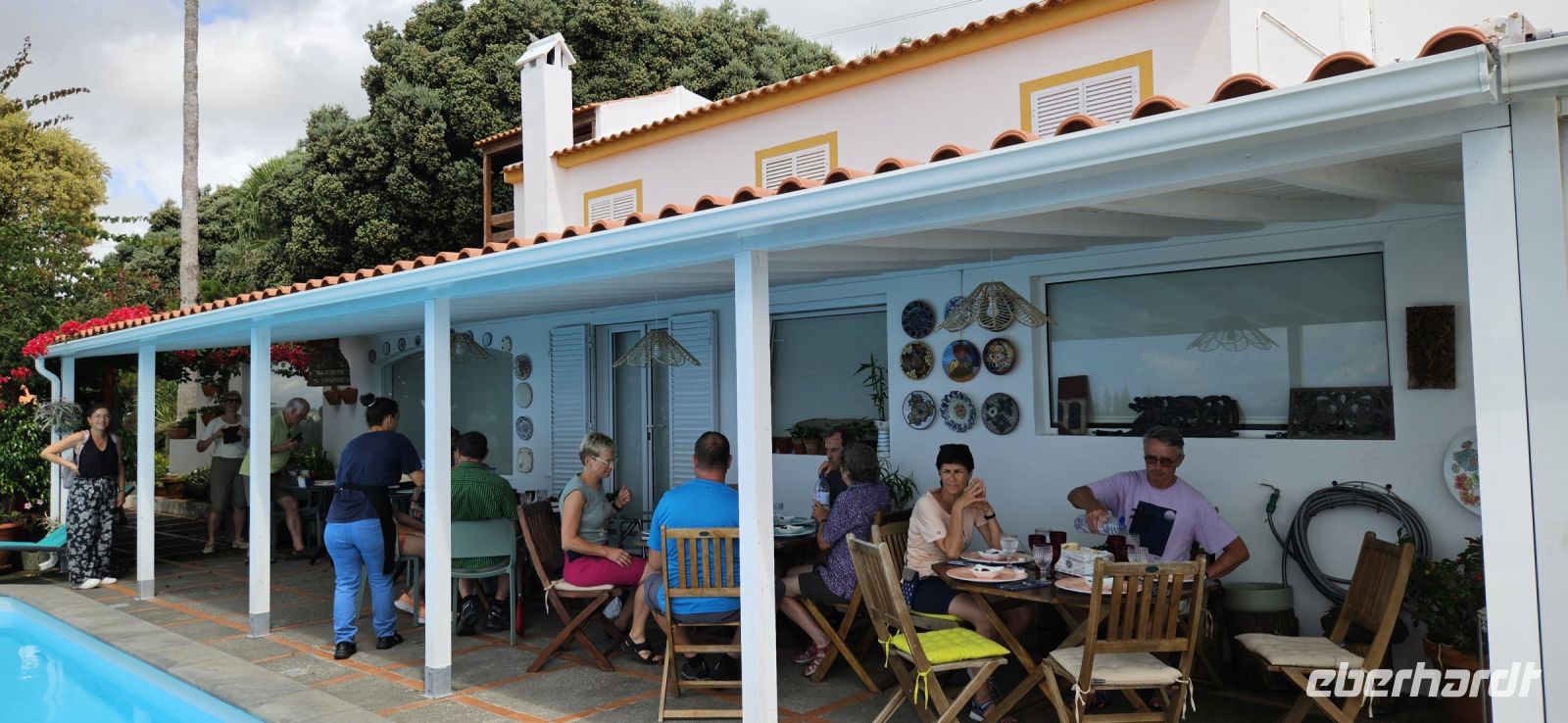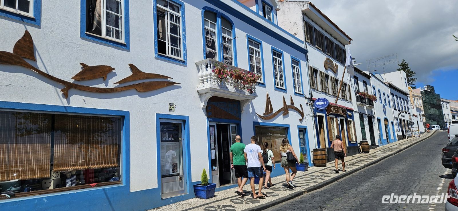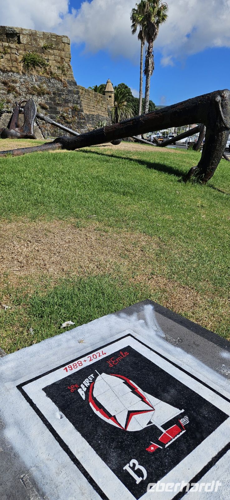 Oh wie schade. Heute ging es sehr früh los und so konnten wir das fantastische Frühstück nicht noch einmal in der Quinta dos Misterios erleben, sondern bekamen es in einer Tüte mit, um es auf der Fähre zu verzehren. Kurz nach 7 Uhr legte die Fähre im Hafen von Velas ab und zunächst steuerten wir den Hafen von Madalena auf der Insel Pico an. Von dort ging es dann direkt über den "Kanal" nach Horta auf der Insel Faial. Am Fährterminal stand wieder ein Bus für uns bereit. Wir verstauten alles Gepäck und begaben uns auf einen Stadtrundgang durch Horta zu Fuss. Es war Feiertag, die Markthalle deshalb geschlossen und deutlich weniger Fahrzeuge auf den Strassen unterwegs. Für das Mittagessen hatten wir bei "Peter" im Peter Cafe Sport Plätze reserviert und unsere Tische waren diesmal direkt im Traditionslokal vorbereitet und da gab es zunächst viel zu entdecken an den Wänden, an der Decke und überall. Viele Segler, die hier auf den Azoren Halt machen, malen nicht nur ein Bild an der Hafenmauer, sondern bringen oft auch ein Andenken für den Gastraum mit. Wir begannen unser "Menue" mit einem Gin Tonic, der für das Peter Cafe Sport legendär ist und auf die Engländer zurück zu führen ist, die hier im 2.Weltkrieg stationiert waren. Das Essen bei Peter schmeckte ausgezeichnet und die Preise waren sehr moderat und so reisten wir gut gestärkt weiter zum Flughafen von Horta. Wir gaben das Gepäck ab, bekamen unsere Bordkarten und verbrachten die Zeit bis zum Abflug auf der Terrasse des Flughafens. Der 40 minütige Flug von Faial nach Flores war sehr entspannt und das kurze Stück vom Flughafen zu unserem Inatel in Santa Cruz das Flores brachte uns ein Kleinbus. Am Abend gingen wir gemeinsam auf eine kleine Erkundungstour zu den Meerwasserpools, zur Strandbar und mit Eva unternahm ich anschliessend eine Tour, um Restaurants zu finden, die auch für unsere (grosse) Gruppe Platz boten. Dabei kamen wir auch zur Heiliggeist Kapelle und erfuhren, dass ab dem Folgetag das Heiliggeist Fest beginnt und wir gern gesehene Gäste wären. So war der nächste Abend gesichert.