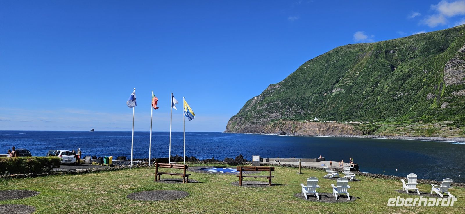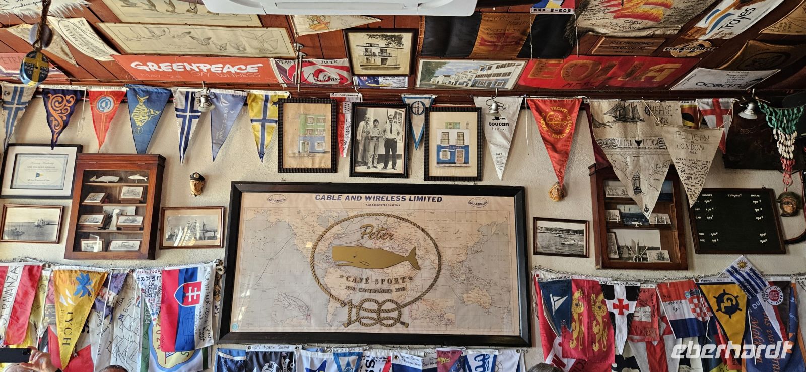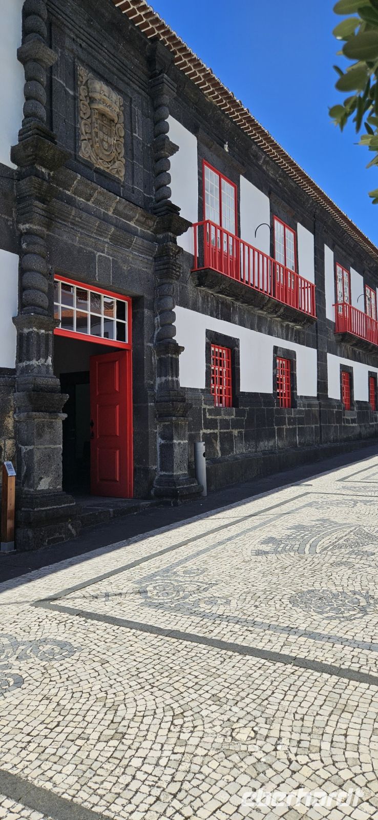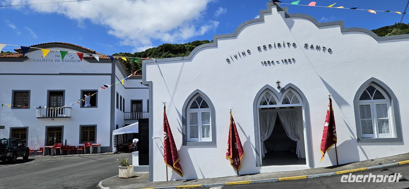 Oh wie schade. Heute ging es sehr früh los und so konnten wir das fantastische Frühstück nicht noch einmal in der Quinta dos Misterios erleben, sondern bekamen es in einer Tüte mit, um es auf der Fähre zu verzehren. Kurz nach 7 Uhr legte die Fähre im Hafen von Velas ab und zunächst steuerten wir den Hafen von Madalena auf der Insel Pico an. Von dort ging es dann direkt über den "Kanal" nach Horta auf der Insel Faial. Am Fährterminal stand wieder ein Bus für uns bereit. Wir verstauten alles Gepäck und begaben uns auf einen Stadtrundgang durch Horta zu Fuss. Es war Feiertag, die Markthalle deshalb geschlossen und deutlich weniger Fahrzeuge auf den Strassen unterwegs. Für das Mittagessen hatten wir bei "Peter" im Peter Cafe Sport Plätze reserviert und unsere Tische waren diesmal direkt im Traditionslokal vorbereitet und da gab es zunächst viel zu entdecken an den Wänden, an der Decke und überall. Viele Segler, die hier auf den Azoren Halt machen, malen nicht nur ein Bild an der Hafenmauer, sondern bringen oft auch ein Andenken für den Gastraum mit. Wir begannen unser "Menue" mit einem Gin Tonic, der für das Peter Cafe Sport legendär ist und auf die Engländer zurück zu führen ist, die hier im 2.Weltkrieg stationiert waren. Das Essen bei Peter schmeckte ausgezeichnet und die Preise waren sehr moderat und so reisten wir gut gestärkt weiter zum Flughafen von Horta. Wir gaben das Gepäck ab, bekamen unsere Bordkarten und verbrachten die Zeit bis zum Abflug auf der Terrasse des Flughafens. Der 40 minütige Flug von Faial nach Flores war sehr entspannt und das kurze Stück vom Flughafen zu unserem Inatel in Santa Cruz das Flores brachte uns ein Kleinbus. Am Abend gingen wir gemeinsam auf eine kleine Erkundungstour zu den Meerwasserpools, zur Strandbar und mit Eva unternahm ich anschliessend eine Tour, um Restaurants zu finden, die auch für unsere (grosse) Gruppe Platz boten. Dabei kamen wir auch zur Heiliggeist Kapelle und erfuhren, dass ab dem Folgetag das Heiliggeist Fest beginnt und wir gern gesehene Gäste wären. So war der nächste Abend gesichert.