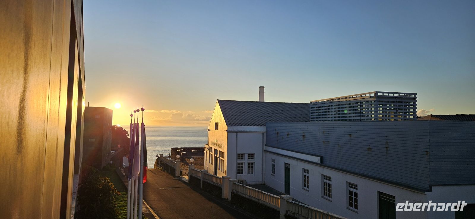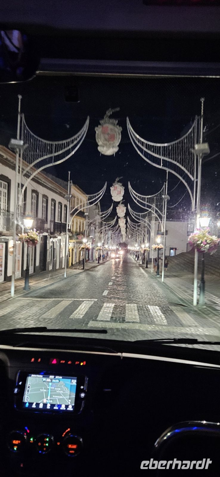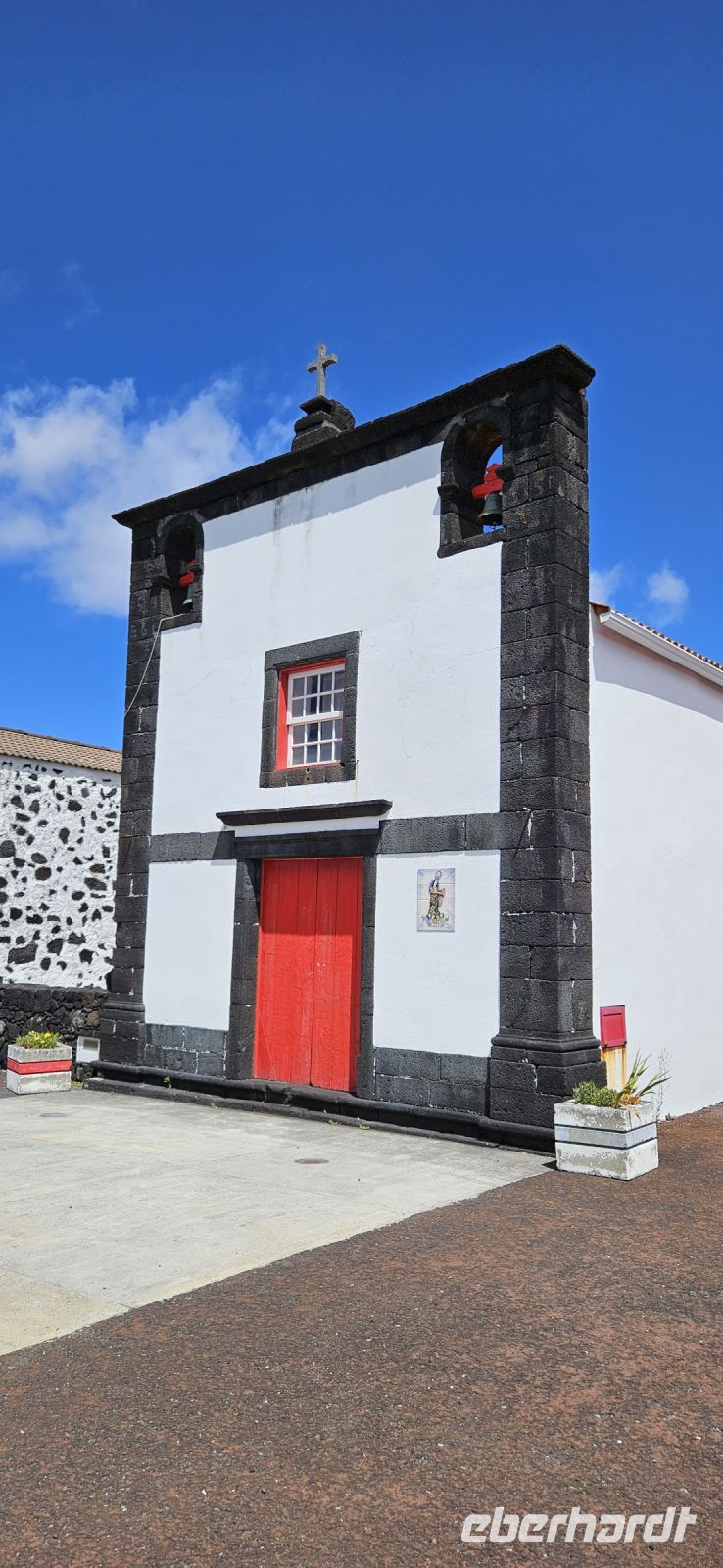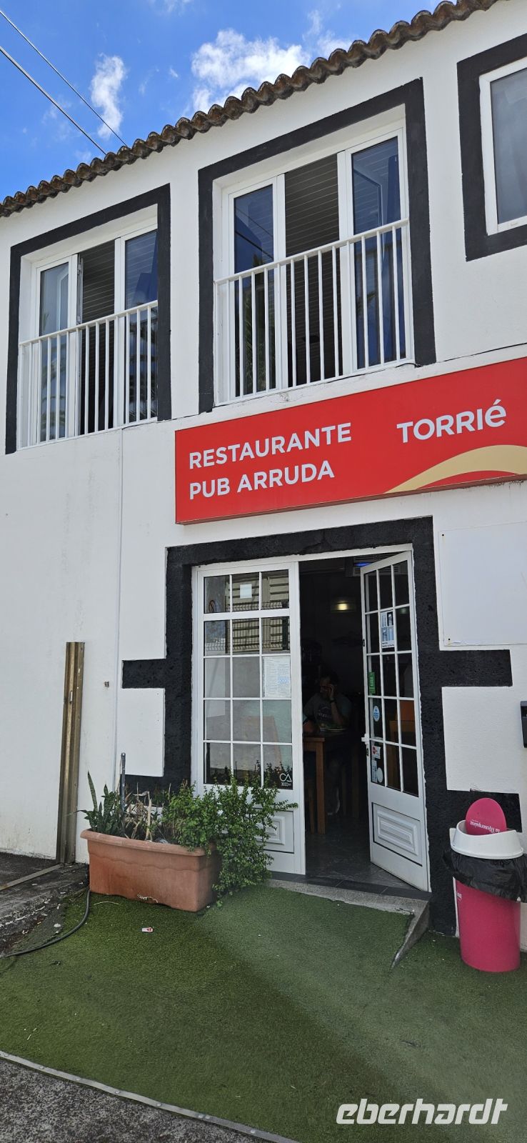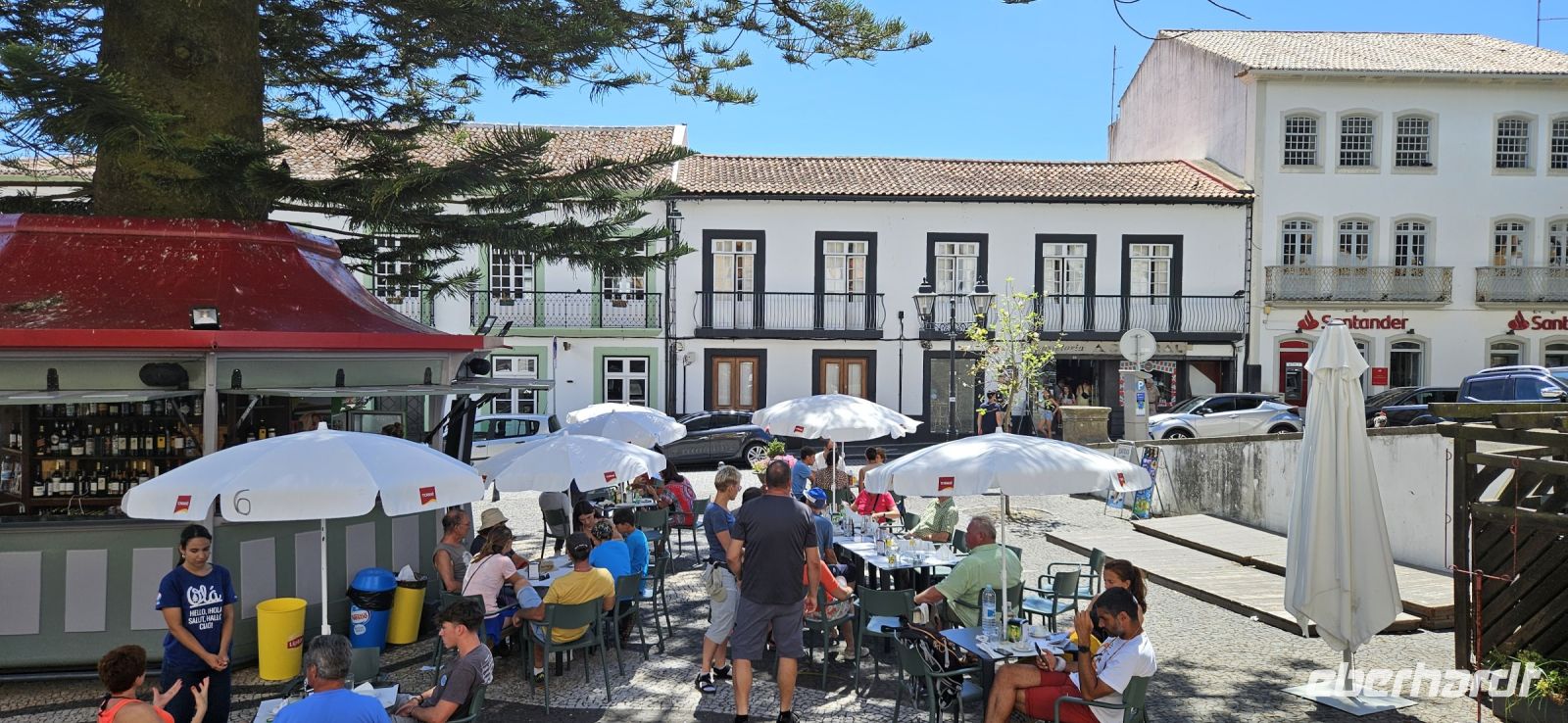 Oh wie schade. Heute ging es sehr früh los und so konnten wir das fantastische Frühstück nicht noch einmal in der Quinta dos Misterios erleben, sondern bekamen es in einer Tüte mit, um es auf der Fähre zu verzehren. Kurz nach 7 Uhr legte die Fähre im Hafen von Velas ab und zunächst steuerten wir den Hafen von Madalena auf der Insel Pico an. Von dort ging es dann direkt über den "Kanal" nach Horta auf der Insel Faial. Am Fährterminal stand wieder ein Bus für uns bereit. Wir verstauten alles Gepäck und begaben uns auf einen Stadtrundgang durch Horta zu Fuss. Es war Feiertag, die Markthalle deshalb geschlossen und deutlich weniger Fahrzeuge auf den Strassen unterwegs. Für das Mittagessen hatten wir bei "Peter" im Peter Cafe Sport Plätze reserviert und unsere Tische waren diesmal direkt im Traditionslokal vorbereitet und da gab es zunächst viel zu entdecken an den Wänden, an der Decke und überall. Viele Segler, die hier auf den Azoren Halt machen, malen nicht nur ein Bild an der Hafenmauer, sondern bringen oft auch ein Andenken für den Gastraum mit. Wir begannen unser "Menue" mit einem Gin Tonic, der für das Peter Cafe Sport legendär ist und auf die Engländer zurück zu führen ist, die hier im 2.Weltkrieg stationiert waren. Das Essen bei Peter schmeckte ausgezeichnet und die Preise waren sehr moderat und so reisten wir gut gestärkt weiter zum Flughafen von Horta. Wir gaben das Gepäck ab, bekamen unsere Bordkarten und verbrachten die Zeit bis zum Abflug auf der Terrasse des Flughafens. Der 40 minütige Flug von Faial nach Flores war sehr entspannt und das kurze Stück vom Flughafen zu unserem Inatel in Santa Cruz das Flores brachte uns ein Kleinbus. Am Abend gingen wir gemeinsam auf eine kleine Erkundungstour zu den Meerwasserpools, zur Strandbar und mit Eva unternahm ich anschliessend eine Tour, um Restaurants zu finden, die auch für unsere (grosse) Gruppe Platz boten. Dabei kamen wir auch zur Heiliggeist Kapelle und erfuhren, dass ab dem Folgetag das Heiliggeist Fest beginnt und wir gern gesehene Gäste wären. So war der nächste Abend gesichert.