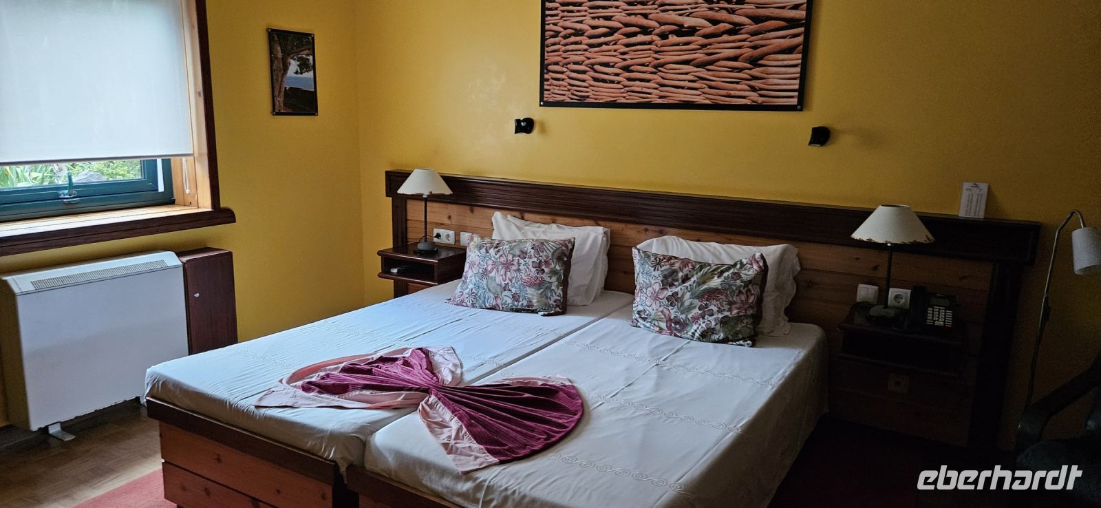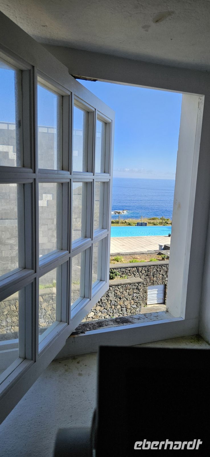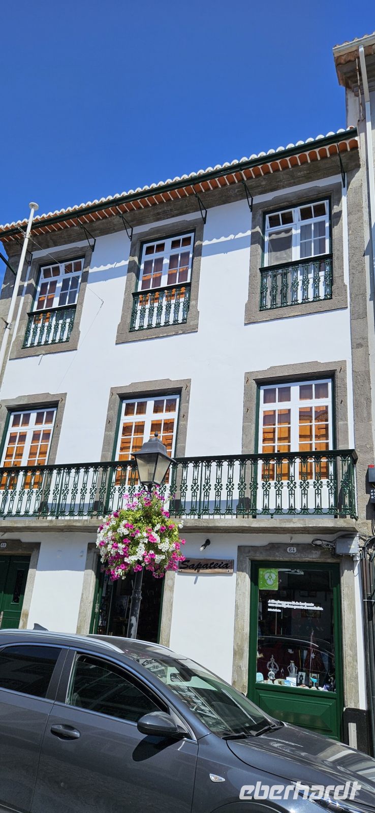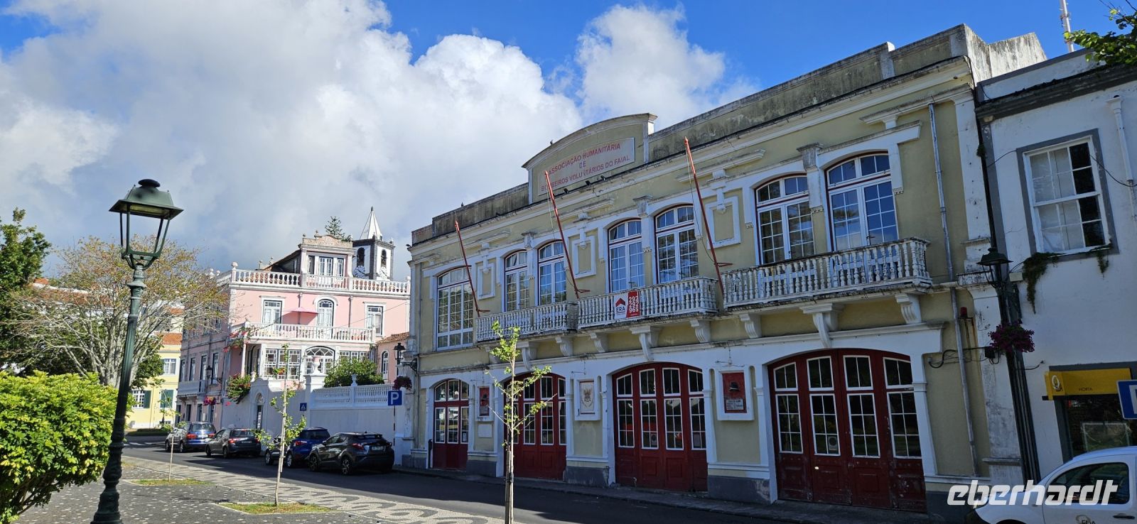 Oh wie schade. Heute ging es sehr früh los und so konnten wir das fantastische Frühstück nicht noch einmal in der Quinta dos Misterios erleben, sondern bekamen es in einer Tüte mit, um es auf der Fähre zu verzehren. Kurz nach 7 Uhr legte die Fähre im Hafen von Velas ab und zunächst steuerten wir den Hafen von Madalena auf der Insel Pico an. Von dort ging es dann direkt über den "Kanal" nach Horta auf der Insel Faial. Am Fährterminal stand wieder ein Bus für uns bereit. Wir verstauten alles Gepäck und begaben uns auf einen Stadtrundgang durch Horta zu Fuss. Es war Feiertag, die Markthalle deshalb geschlossen und deutlich weniger Fahrzeuge auf den Strassen unterwegs. Für das Mittagessen hatten wir bei "Peter" im Peter Cafe Sport Plätze reserviert und unsere Tische waren diesmal direkt im Traditionslokal vorbereitet und da gab es zunächst viel zu entdecken an den Wänden, an der Decke und überall. Viele Segler, die hier auf den Azoren Halt machen, malen nicht nur ein Bild an der Hafenmauer, sondern bringen oft auch ein Andenken für den Gastraum mit. Wir begannen unser "Menue" mit einem Gin Tonic, der für das Peter Cafe Sport legendär ist und auf die Engländer zurück zu führen ist, die hier im 2.Weltkrieg stationiert waren. Das Essen bei Peter schmeckte ausgezeichnet und die Preise waren sehr moderat und so reisten wir gut gestärkt weiter zum Flughafen von Horta. Wir gaben das Gepäck ab, bekamen unsere Bordkarten und verbrachten die Zeit bis zum Abflug auf der Terrasse des Flughafens. Der 40 minütige Flug von Faial nach Flores war sehr entspannt und das kurze Stück vom Flughafen zu unserem Inatel in Santa Cruz das Flores brachte uns ein Kleinbus. Am Abend gingen wir gemeinsam auf eine kleine Erkundungstour zu den Meerwasserpools, zur Strandbar und mit Eva unternahm ich anschliessend eine Tour, um Restaurants zu finden, die auch für unsere (grosse) Gruppe Platz boten. Dabei kamen wir auch zur Heiliggeist Kapelle und erfuhren, dass ab dem Folgetag das Heiliggeist Fest beginnt und wir gern gesehene Gäste wären. So war der nächste Abend gesichert.