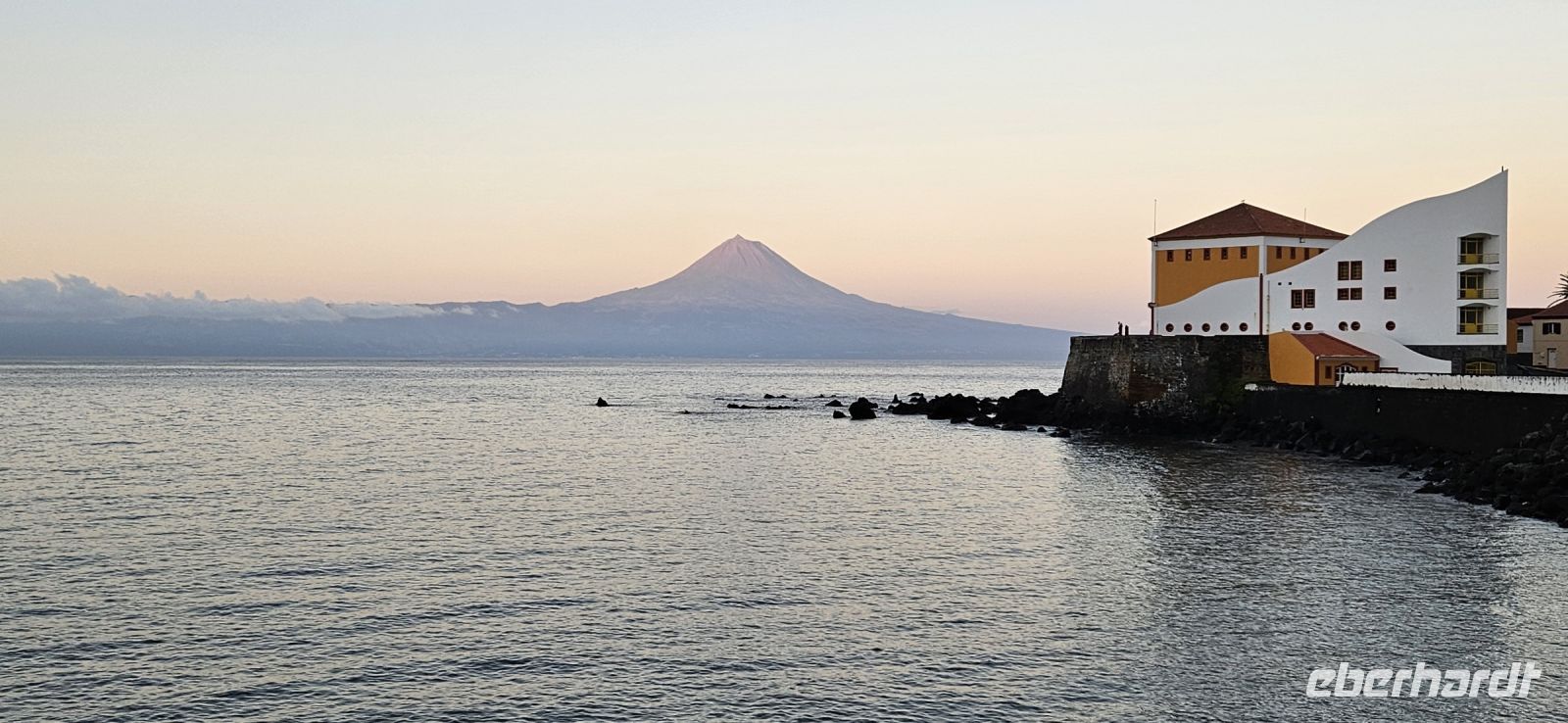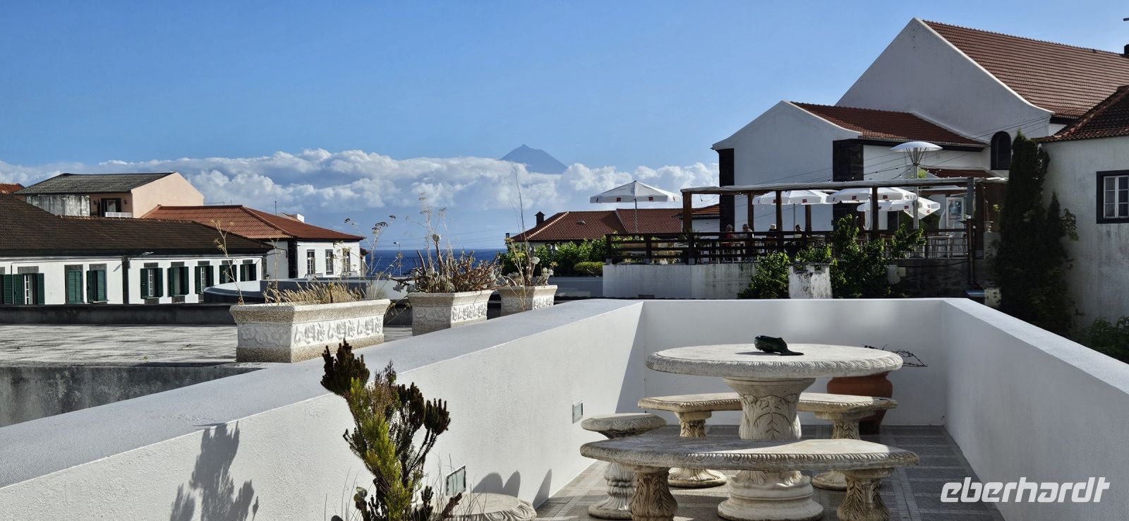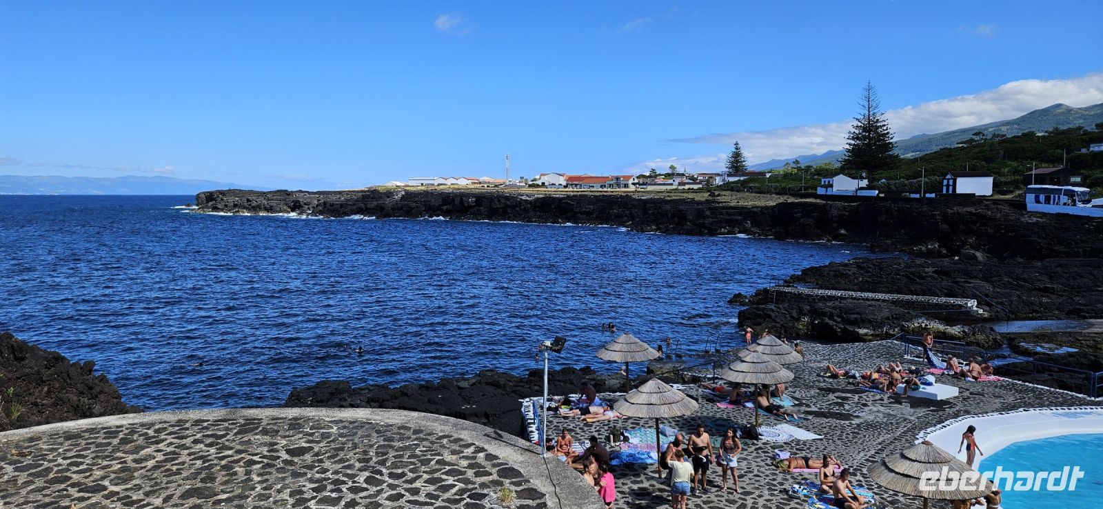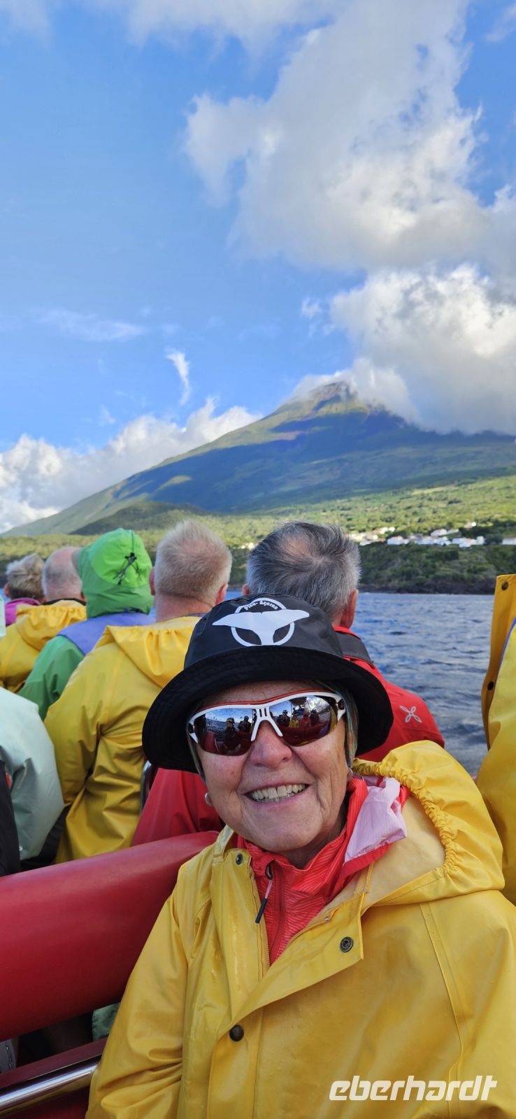 Gut ausgeruht trafen wir uns zum Frühstück, das wir draußen im Garten oder drin im kleinen Restaurant einnehmen konnten. Bereits 8 Uhr holten uns die Kleinbusse der Walbeobachtungsfirma Bela Vista ab und brachten uns nach Lajes. Dort gab es zunächst eine ausführliche Einweisung zur Wal- und Delfinbeobachtung und vor allem über das Verhalten der Wale. Dann ging es auch schon los. Unsere Eberhardt Gruppe hatte ein eigenes Schlauchboot mit einem erfahrenen Kapitän und mit Dana eine erfahrene Walbeobachterin. Unser Ausflug war von Erfolg gekrönt: wir sahen 2 verschiedene Delfinarten, einen Bride Wal mehrmals und zur großen Überraschung eine Meeresschildkröte caretta caretta. Das Meer war ruhig, die Sonne schien und der Pico zeigte sich ohne Wolken. Wieder zurück an Land gab es die Auswertung und eine kleine Stärkung im Büro der Walbeobachtung. Danach begaben wir uns zu Fuss durch Lajes zum Mittagessen. Es folgte der Besuch des Walmuseums mit dem Anschauen eines sehr eindrücklichen Filmes über den einstigen Walfang auf den Azoren. Am Nachmittag erkundeten wir den Südosten der Insel Pico und fuhren mit dem Bus nach Calheta Nesquim. Von dem Ort starteten einst die Walfangboote und heute kann man im Hafenbecken schwimmen gehen. Im Ort war gerade das Heiliggeistfest zu Ende gegangen. Es wurde aufgeräumt und wir konnten uns die geschmückte Heiliggeist Kapelle anschauen. Ein kleiner Spaziergang führte zu den Meerwasserpools und da gab es für alle Badelustigen eine Abkühlung im Atlantik. Auf der Rückfahrt schauten wir uns den Walausguck Vigia da Queimada an. Er diente und dient auch heute noch zum Aufspüren von Walen, nur werden die Tiere heute mit den Kameras gejagt. In Lajes besuchten wir noch kurz den Supermarkt und dann brachte der Bus uns zurück zum Hotel.