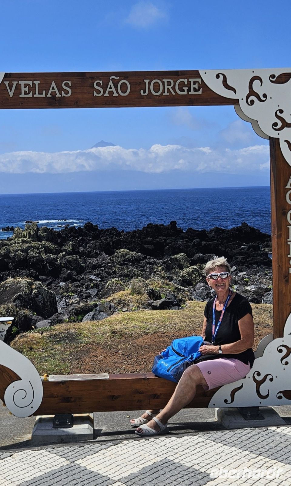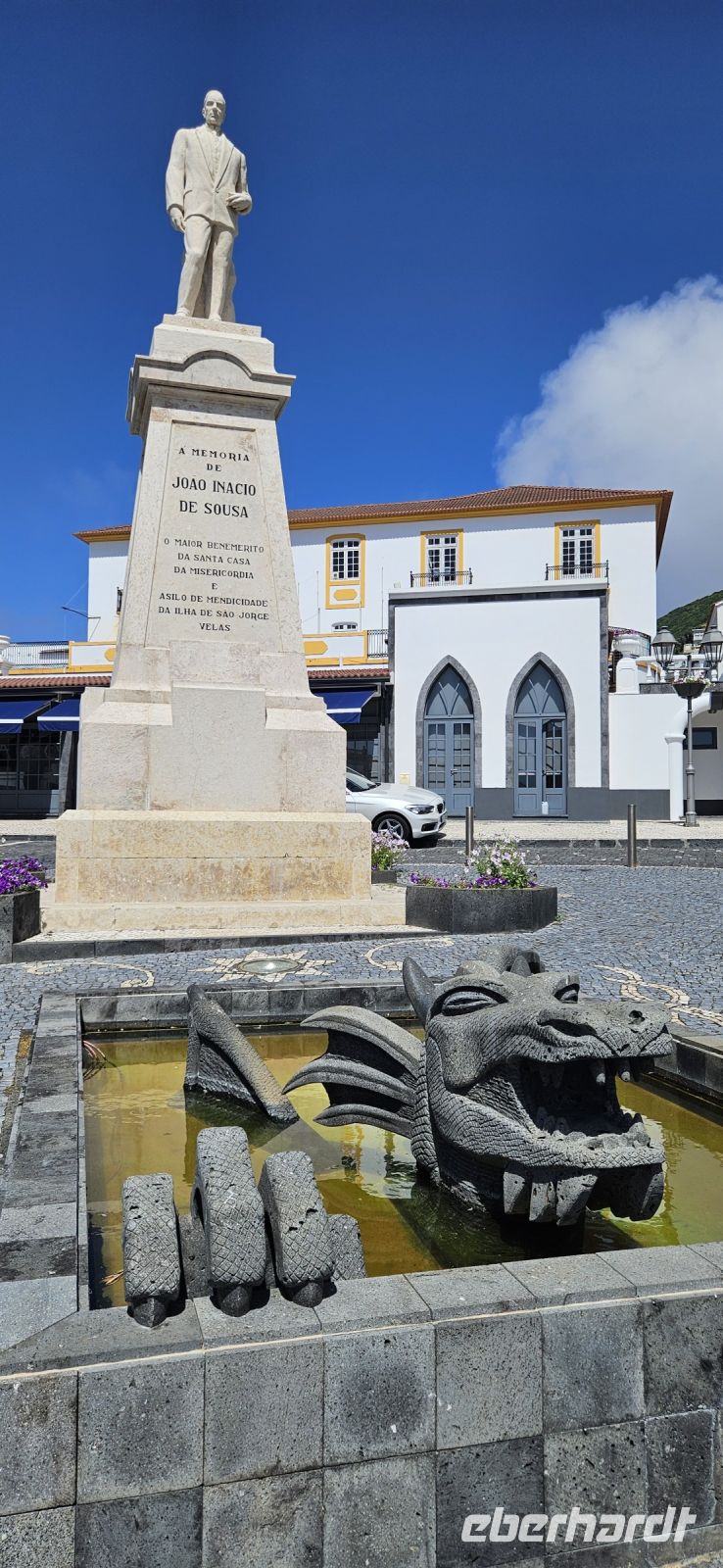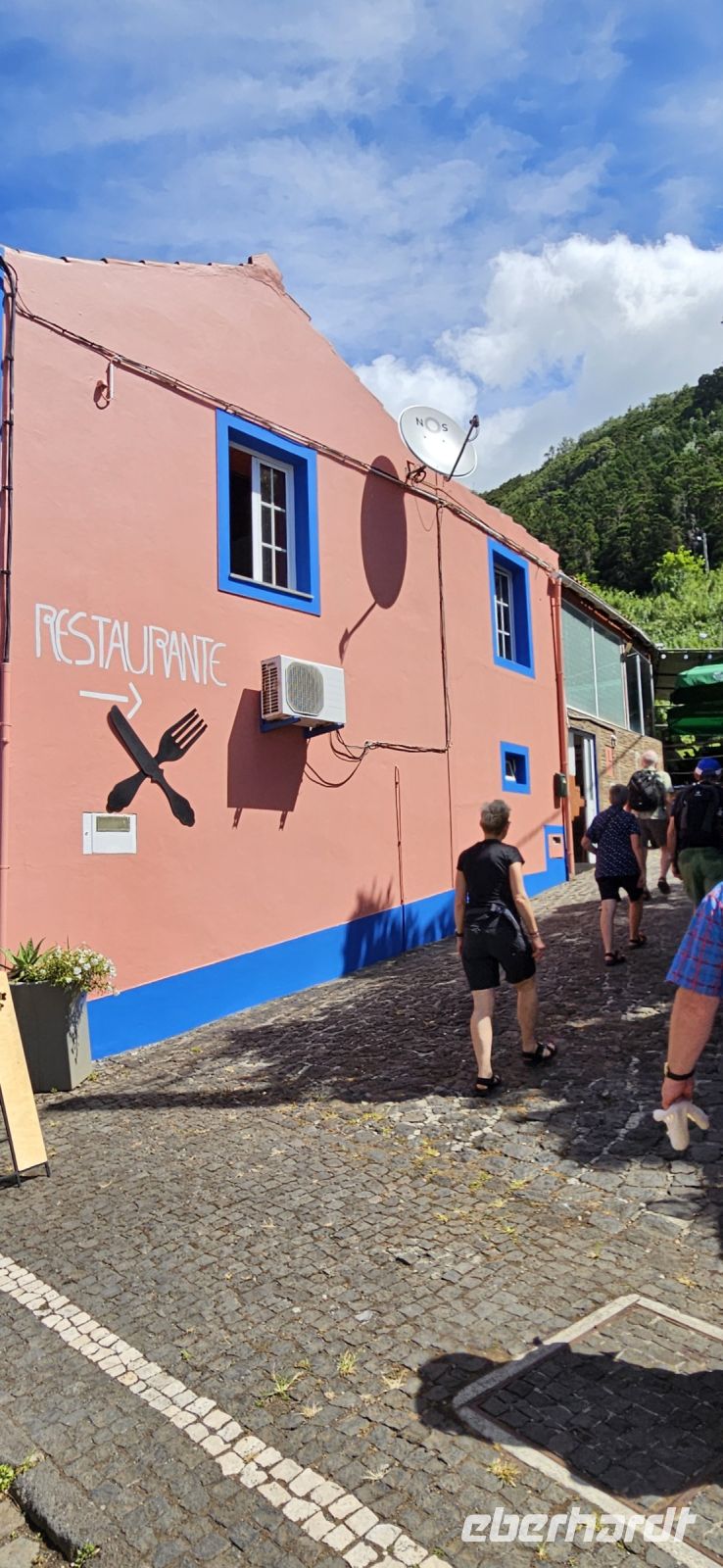 Ein letztes Mal genossen wir das Frühstück im Garten unserer Hotelanlage und dann brachte uns der Bus mit unserem Gepäck zur Fähre in Sao Roque. Auf der kurzen Überfahrt hatten wir Pico mit dem höchsten Berg Portugals immer im Blick und nach 45 Minuten Überfahrt erreichten wir Velas auf der Insel Sao Jorge. Wir verstauten unser Gepäck im Bus und begaben uns zu Fuss in die kleine, übersichtliche Stadt Velas. Heute leben 2000 Menschen im größten Ort der Insel Sao Jorge. Wir betraten die Stadt durch das alte Hafentor, einst Bestandteil der Stadtmauer und Ende des 18. Jahrhunderts errichtet. Gleich dahinter befindet sich ein Kachelbild der Insel und daran erläuterte uns Eva, was wir uns auf Sao Jorge alles anschauen werden. Auf dem Hauptplatz wurde einst Obst und Gemüse verkauft und heute ziert ein Bodenmosaik mit dem Heiligen Georg den Platz. Dahinter ist der Brunnen, aus dem der Drache schaut und auf dem Sockel steht Joao Inacio de Sousa. Die Kirche war leider schon geschlossen und so begaben wir uns zur Promenade am Meer. Dort gab es wieder schöne Meerwasserpools, einen Natursteinbogen und einen "Rahmen" für Fotos zu bewundern. Im Restaurant Acor machten wir unsere Mittagspause mit einem für die Mittagszeit typischen Menue. Einige nahmen dann ein kühlendes Bad im Atlantik und mit unserem Bus fuhren wir zum Supermarkt, um uns mit dem Nötigsten einzudecken, denn das nächste Hotel war sehr abgelegen. Die Quinta dos Misterios in der Nähe des kleinen Flughafens von Sao Jorge ist ein altes Herrenhaus, welches aufwendig renoviert wurde und mit Möbeln aus noch 2 weiteren Herrenhäusern der Besitzerin ausgestattet wurde. Wir erlebten einen sehr herzlichen Empfang durch Katarina und sie führte uns erst einmal durch das gesamte Anwesen. Man fühlte sich wie in einem Museum, welches zum Leben erweckt wurde und nun Gäste aufnehmen durfte. Alle Räumlichkeiten standen unseren Gästen offen, auch an einen großen Kühlschrank hatte man gedacht. Im Garten gab es einen wunderschönen Pool mit Aussicht bis hinüber zum Pico auf der Nachbarinsel. Beim Streifen durch die historischen Räume duftete es plötzlich nach frischem Kuchen und den hatte die Hausherrin selbst für unsere Gäste für das Frühstück gebacken. Dann wurden die Zimmer verteilt und alle waren ganz unterschiedlich möbliert, hatten aber alle ein eigenes Badezimmer. Es war ein absolutes Erlebnis, nur reichten die Zimmer für Eva und mich nicht aus und so wurden wir beide hinunter nach Velas in ein nettes B&B gebracht. Zum Abendessen waren wir wieder mit unseren Gästen zusammen und gingen gleich in das Restaurant neben der Quinta dos Misterios.